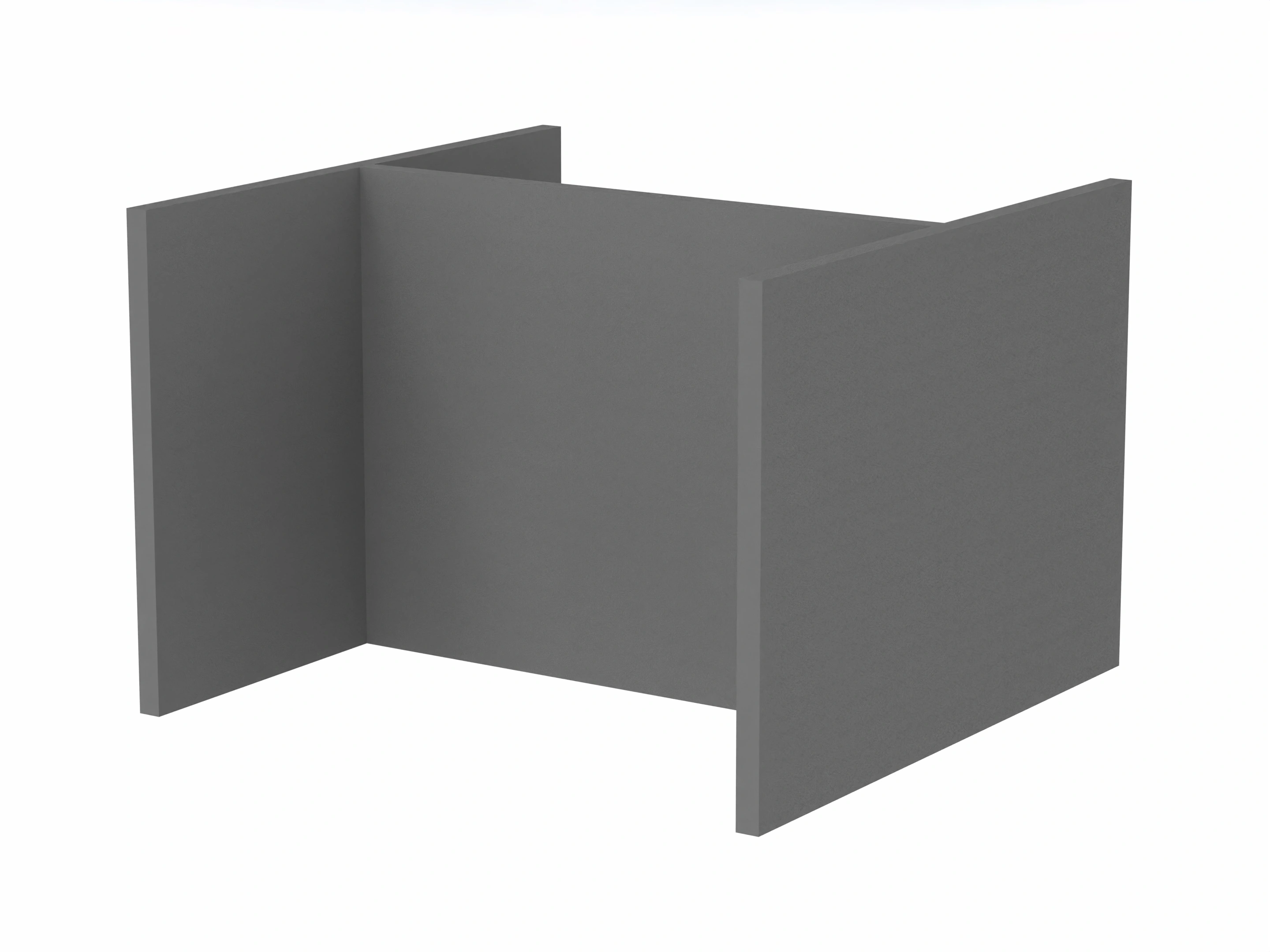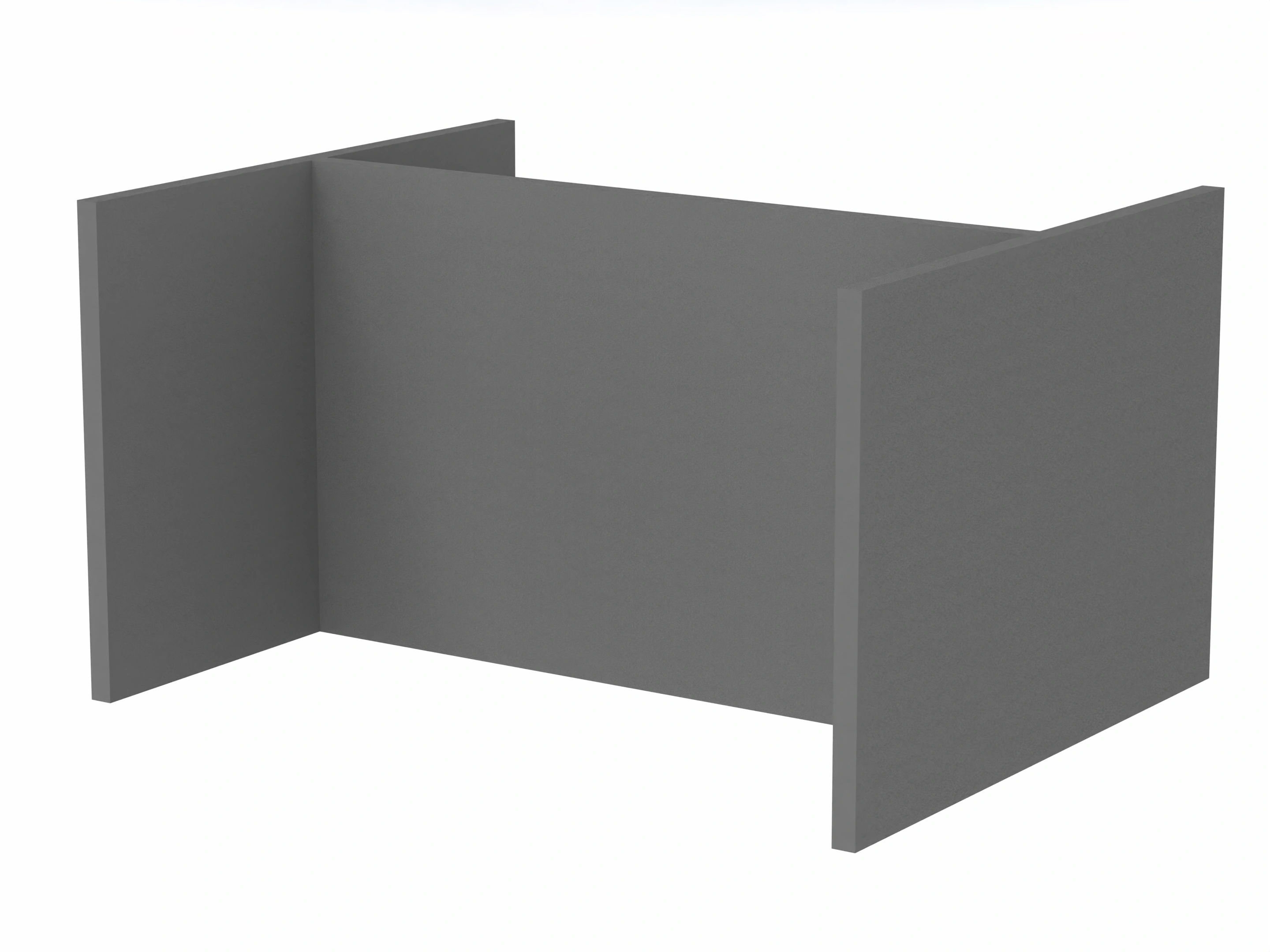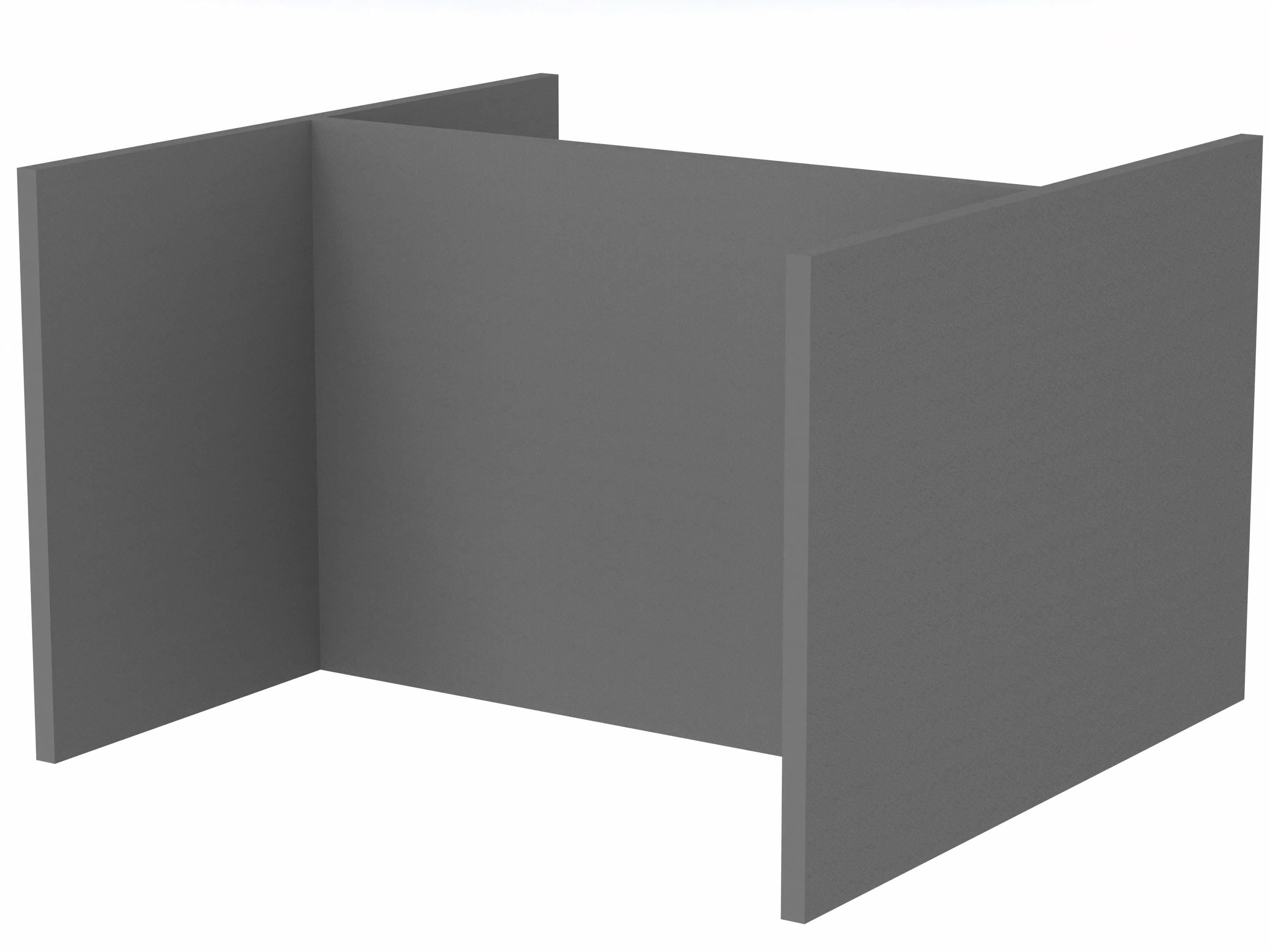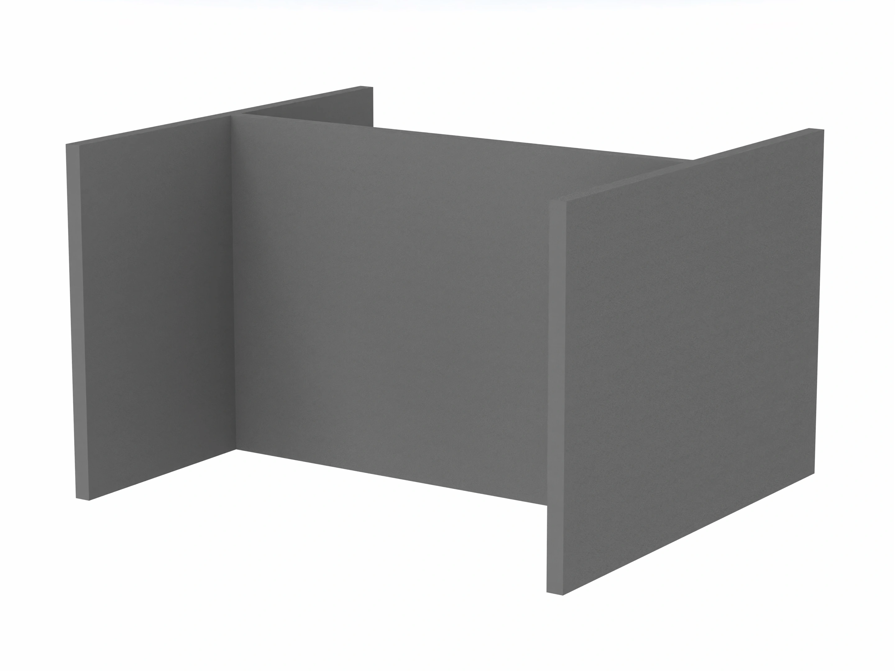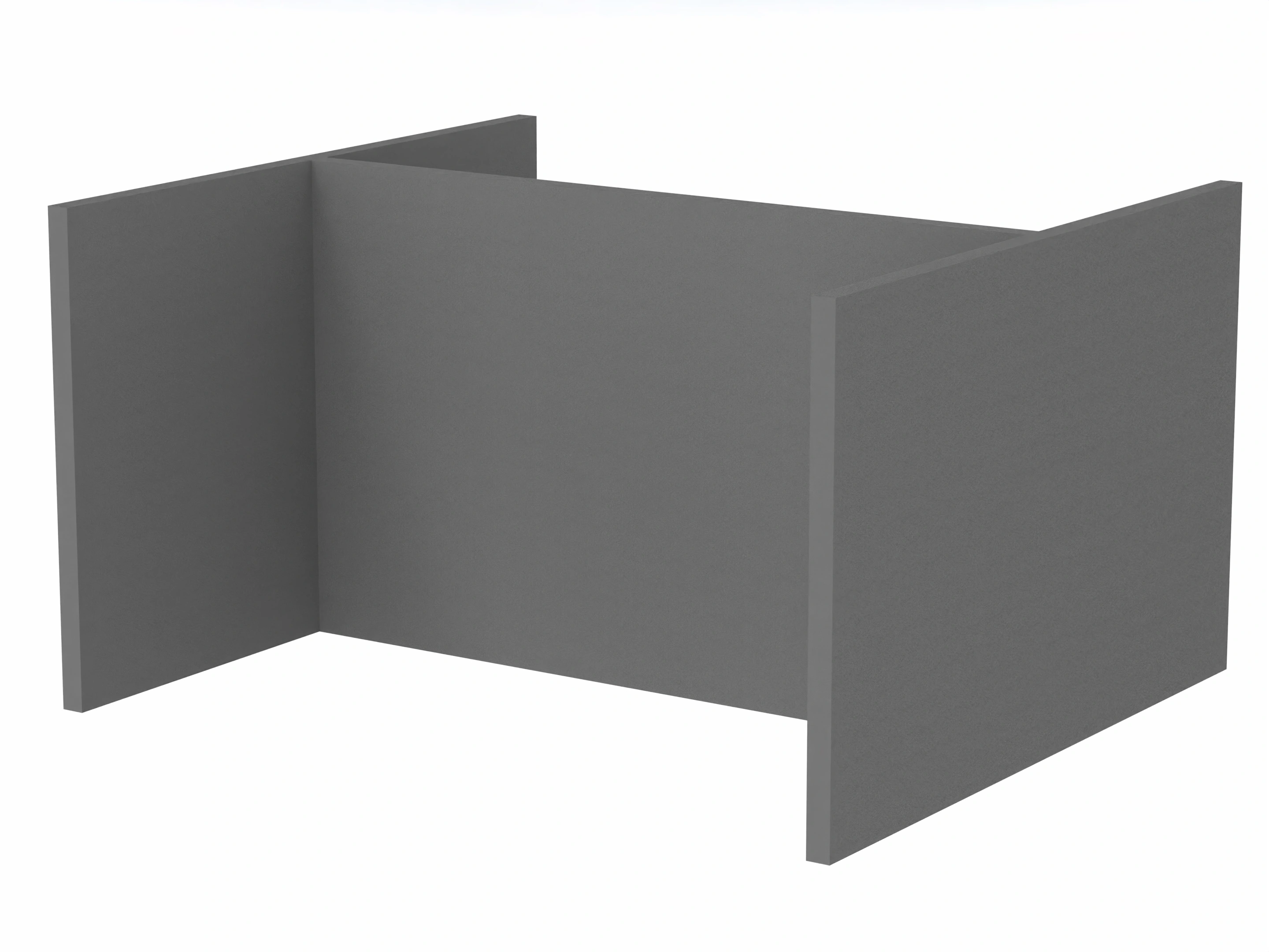 Bestaande uit 1 staand frontpaneel tussen 2 staande zijpanelen. Panelen zijn opgebouwd uit een 40mm berken multiplex frame, gevuld met gerecycled katoen, absorbtieklasse A/NRC waarde 0,95. Gegeven maatvoering zijn bureaumaten