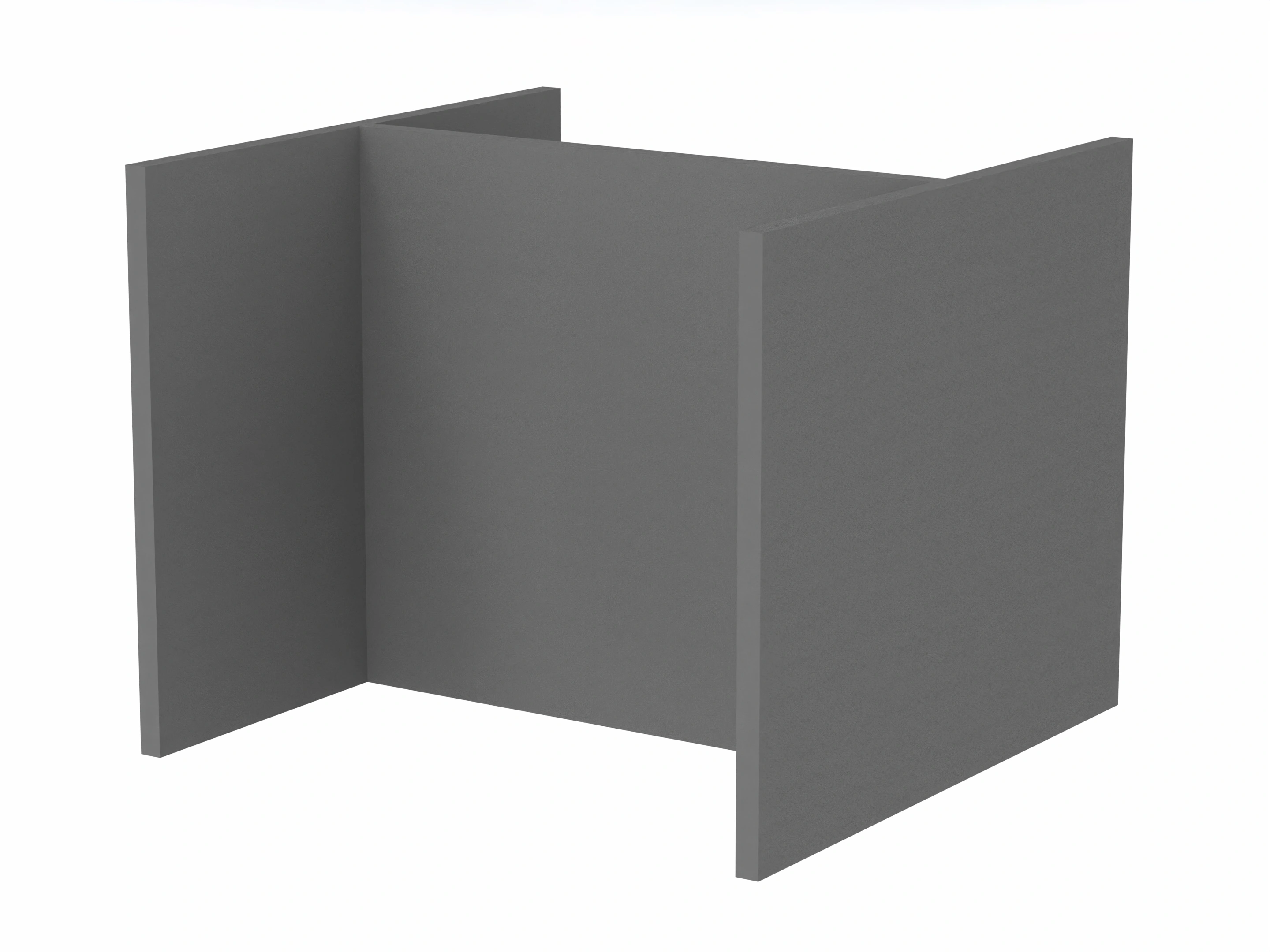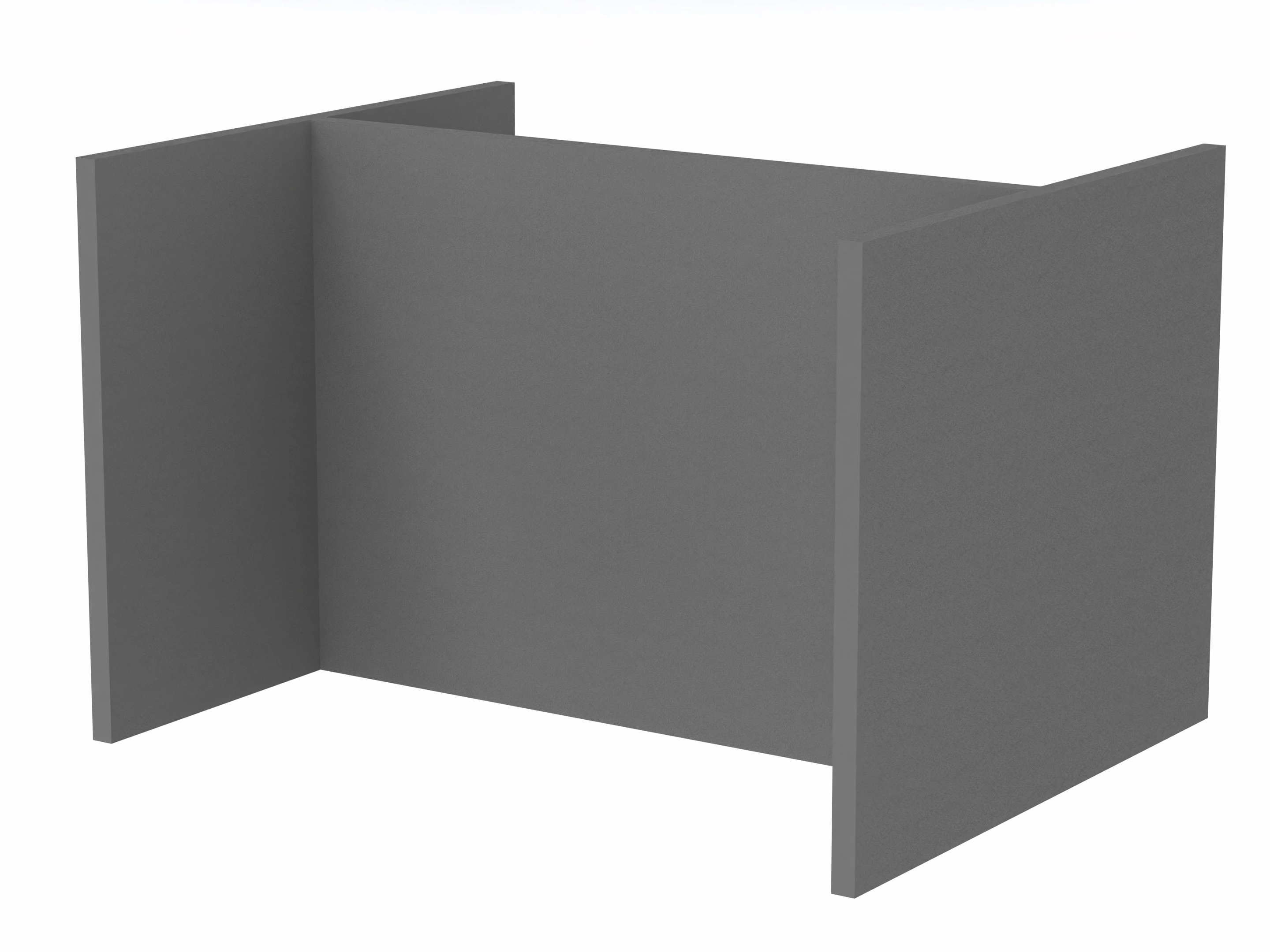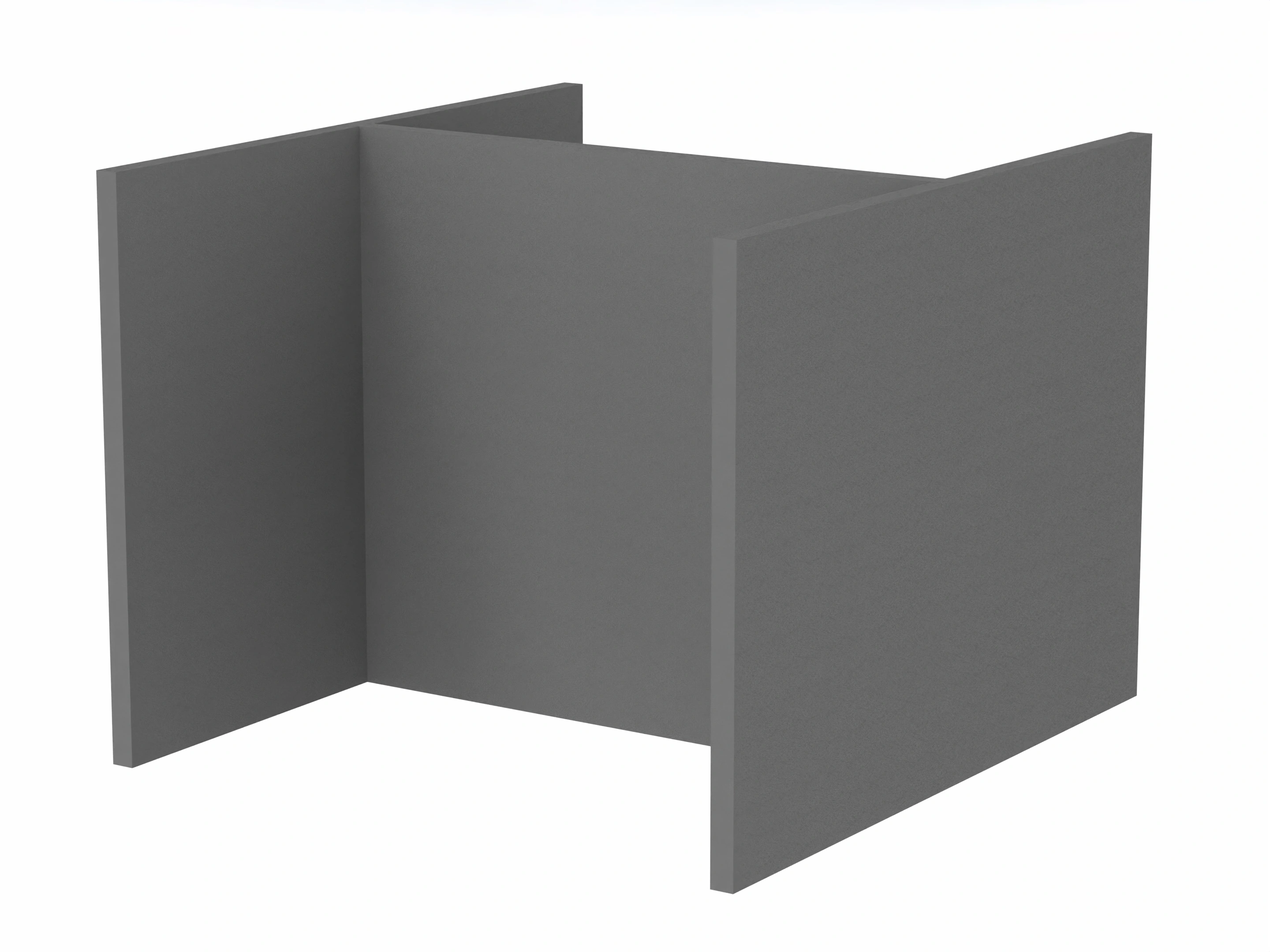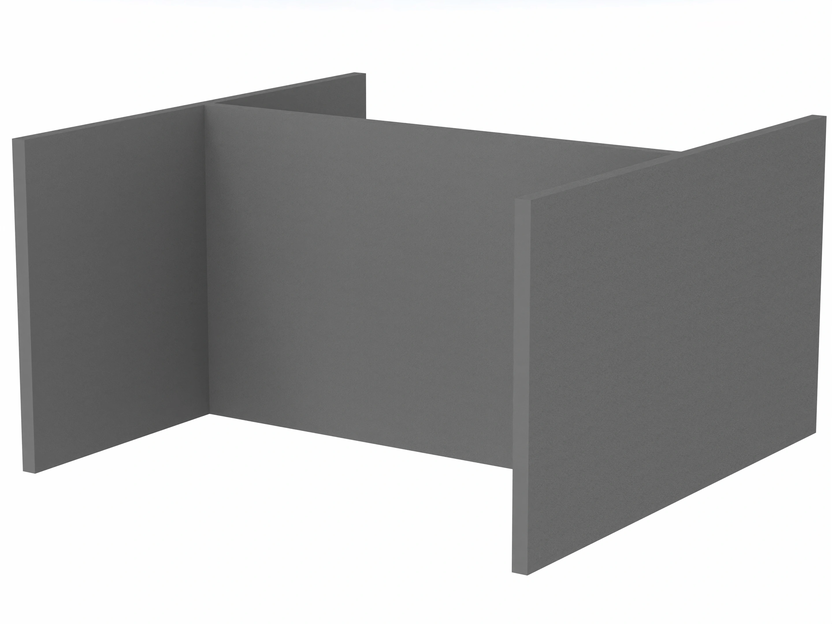 Bestaande uit 1 staand frontpaneel tussen 2 staande zijpanelen. Panelen zijn opgebouwd uit een 40mm berken multiplex frame, gevuld met gerecycled katoen, absorbtieklasse A/NRC waarde 0,95. Gegeven maatvoering zijn bureaumaten