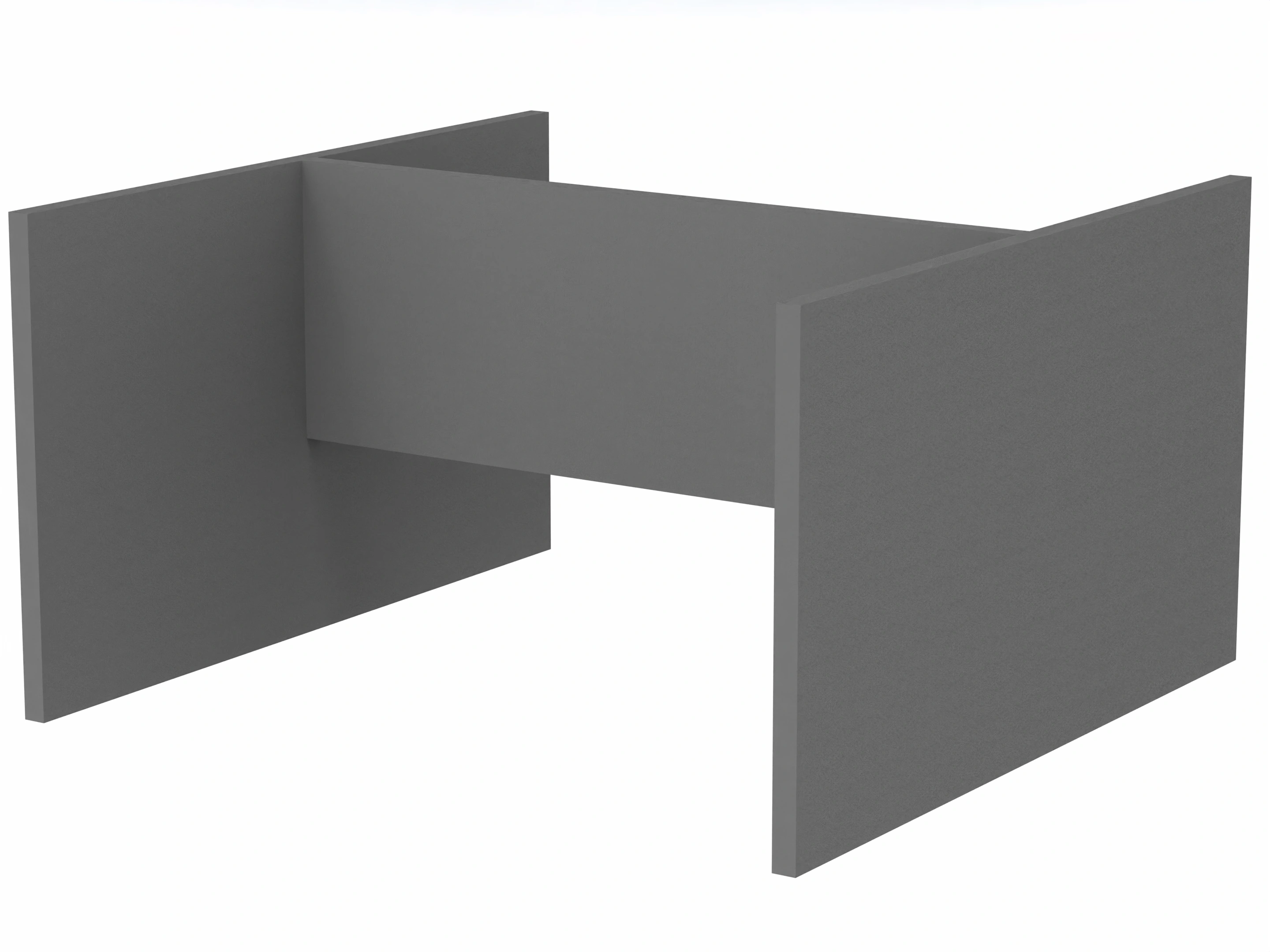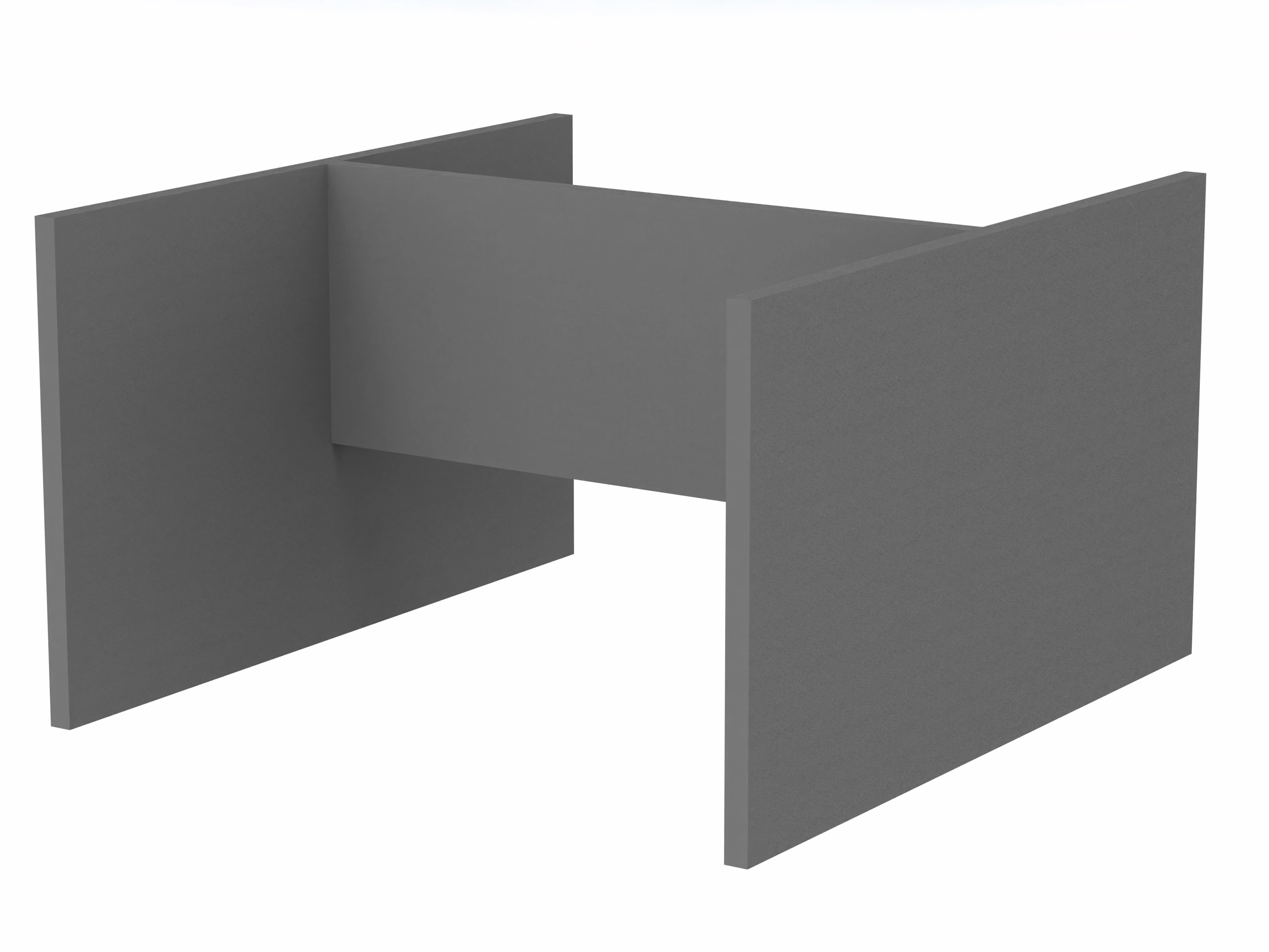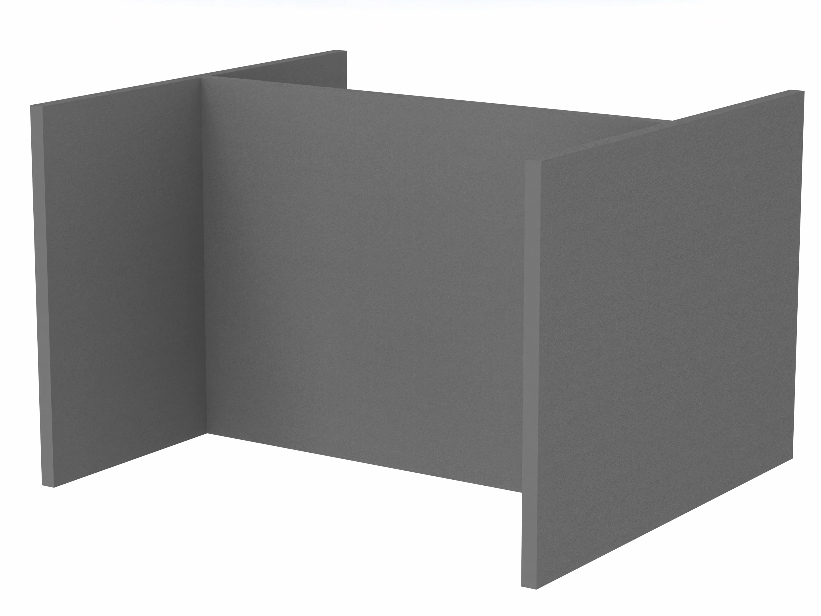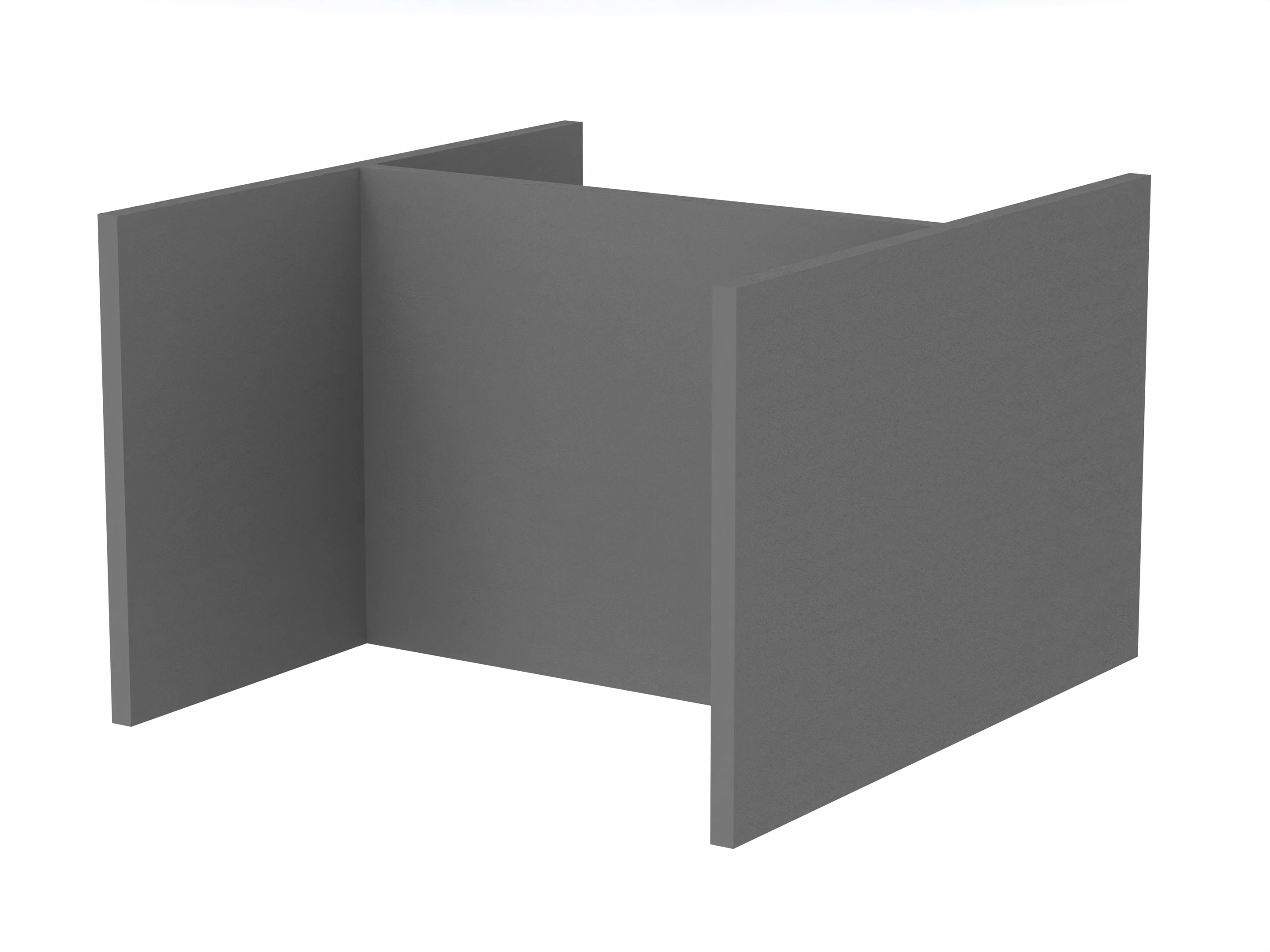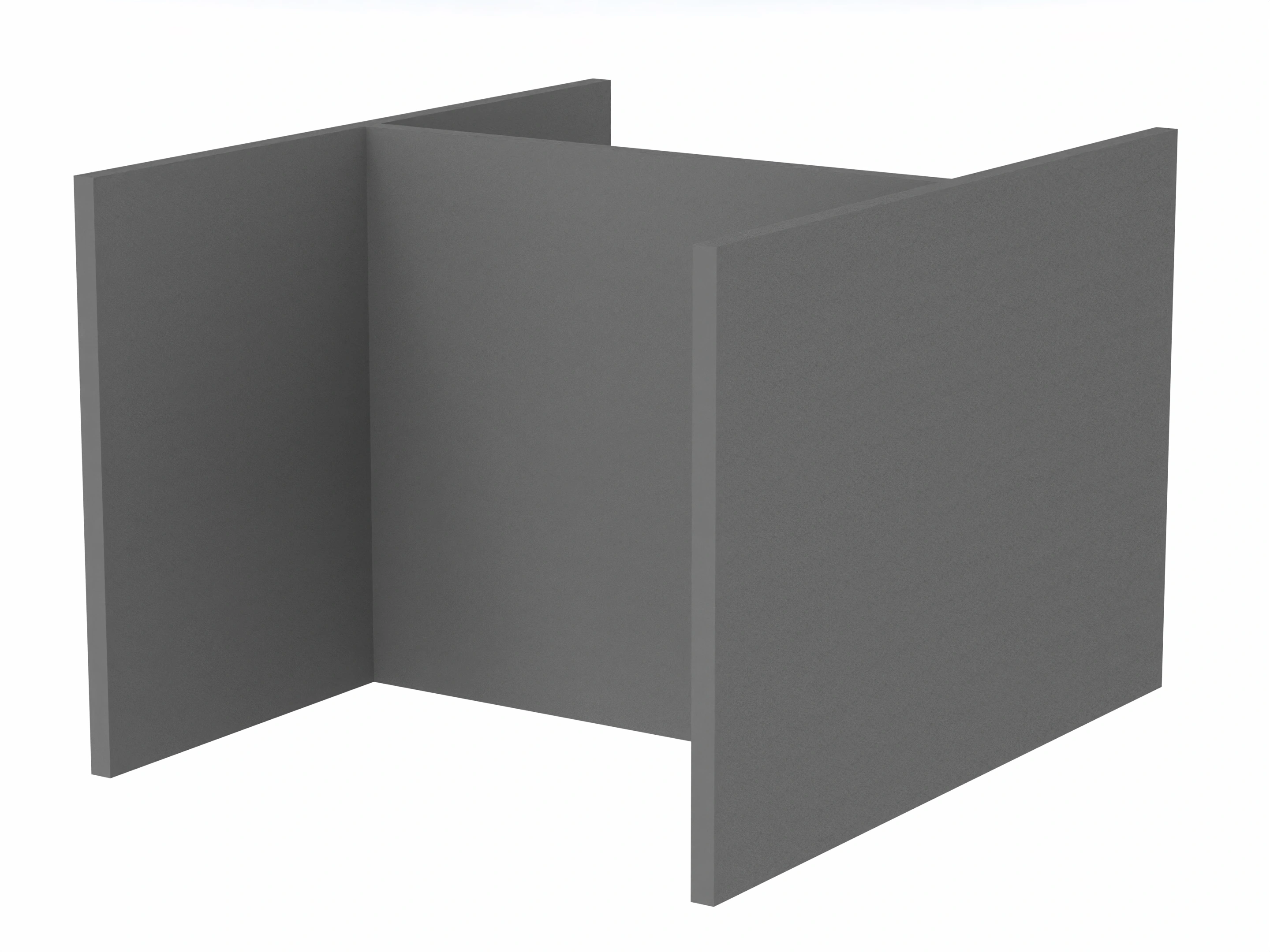 Bestaande uit 1 staand frontpaneel tussen 2 staande zijpanelen. Panelen zijn opgebouwd uit een 40mm berken multiplex frame, gevuld met gerecycled katoen, absorbtieklasse A/NRC waarde 0,95. Gegeven maatvoering zijn bureaumaten