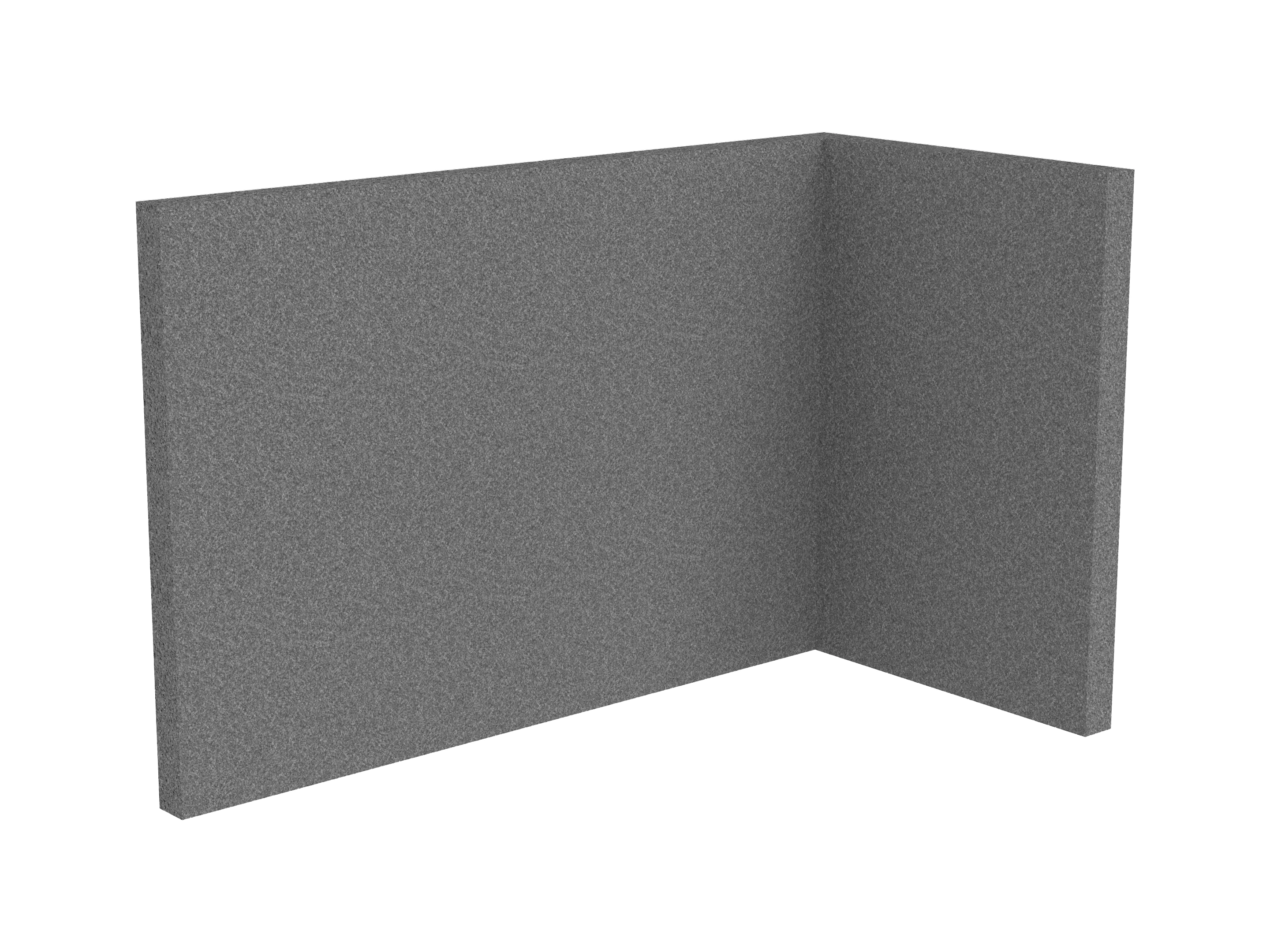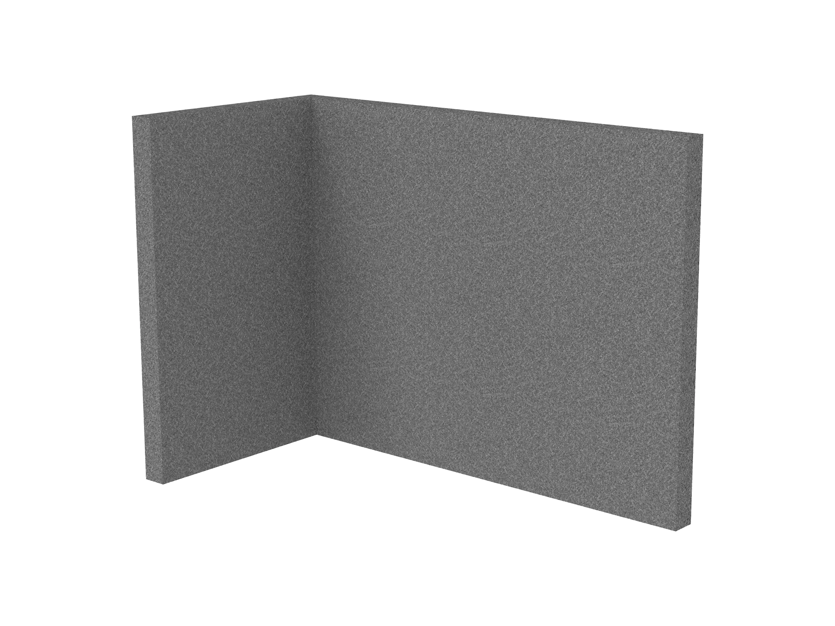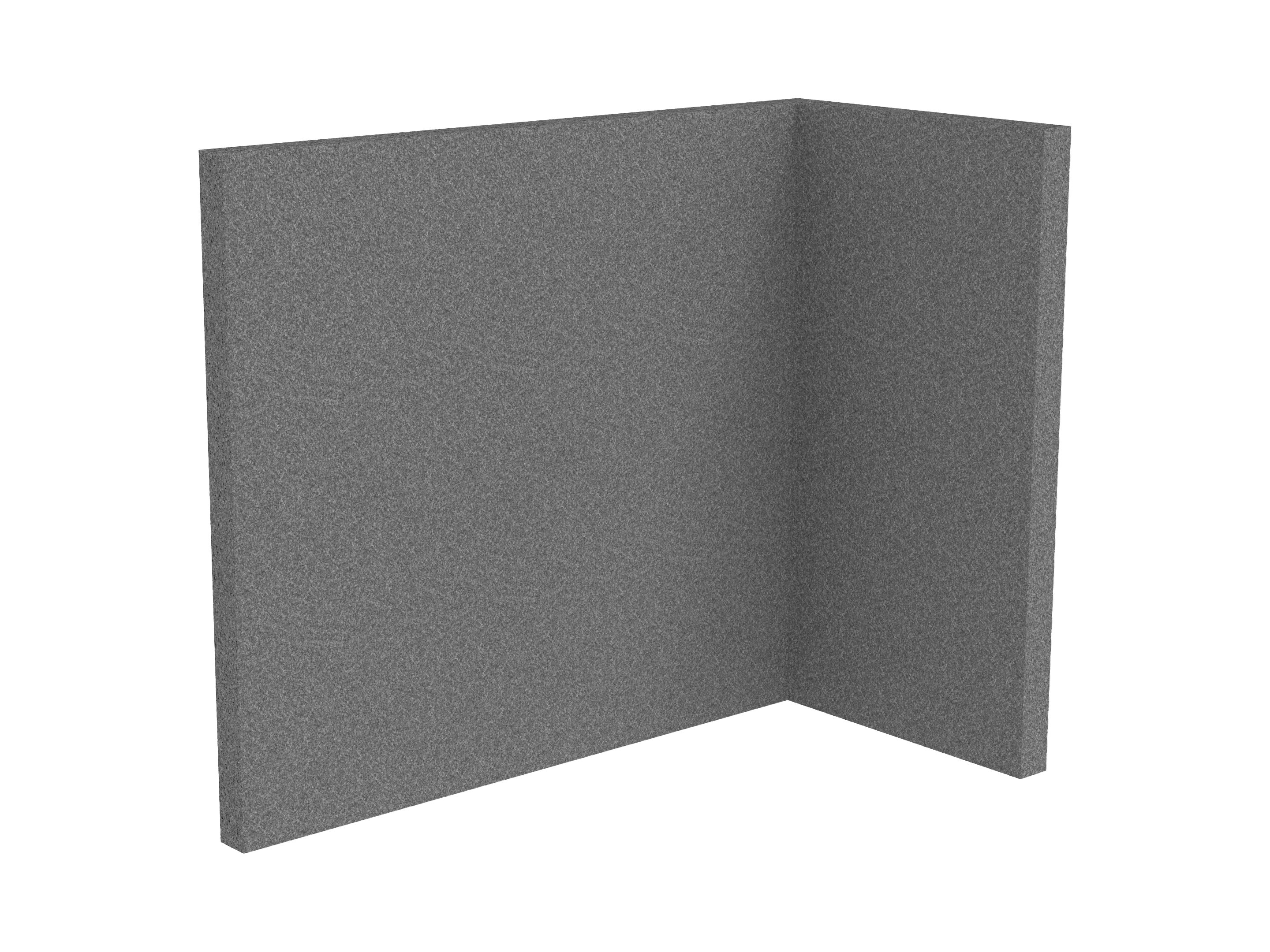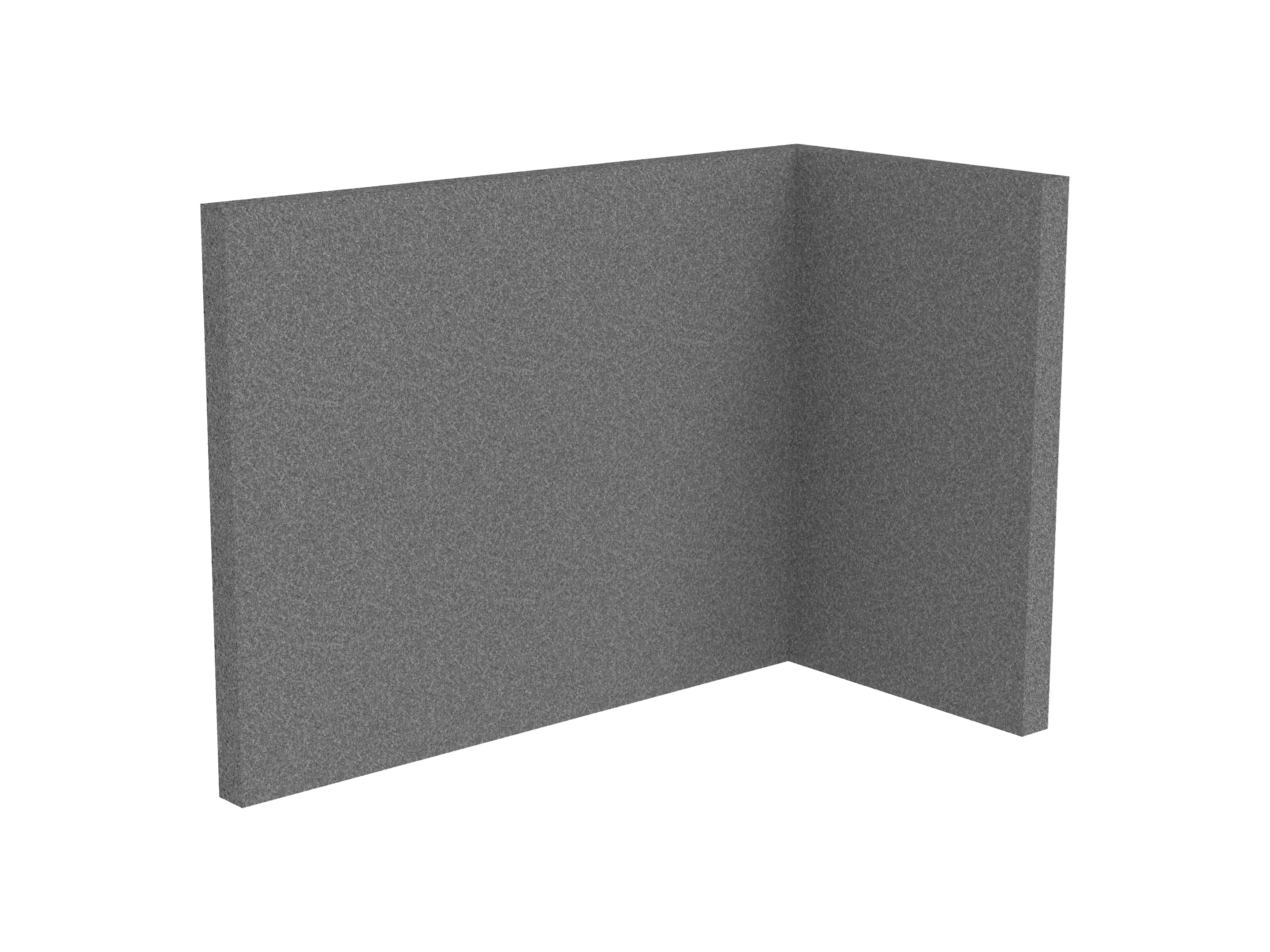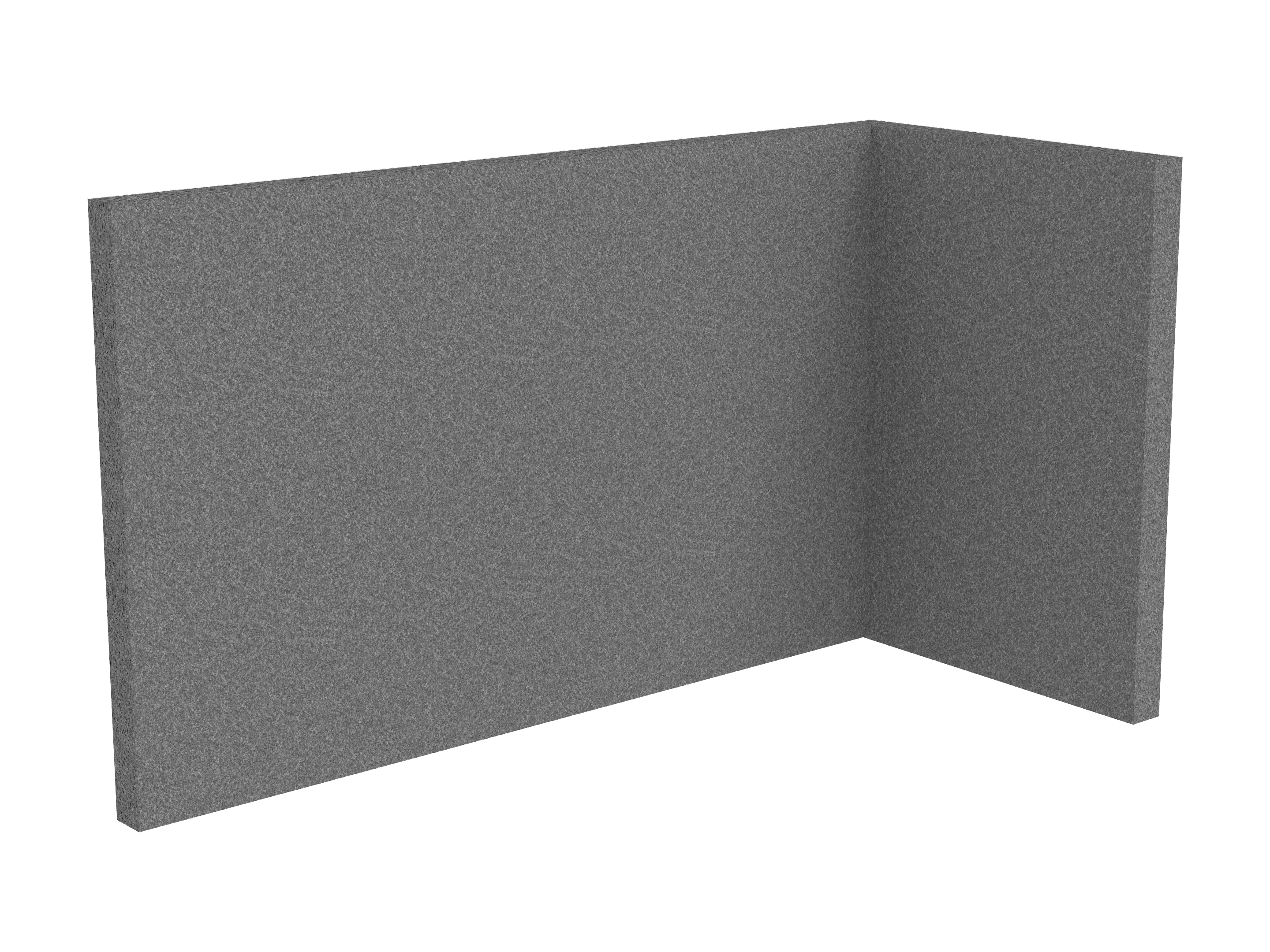 Bestaande uit 1 staand frontpaneel en 1 staand zijpaneel aan de rechterzijde. Panelen zijn opgebouwd uit een 40mm berken multiplex frame, gevuld met gerecycled katoen, absorbtieklasse A/NRC waarde 0,95. Gegeven maatvoering zijn de bureaumaten