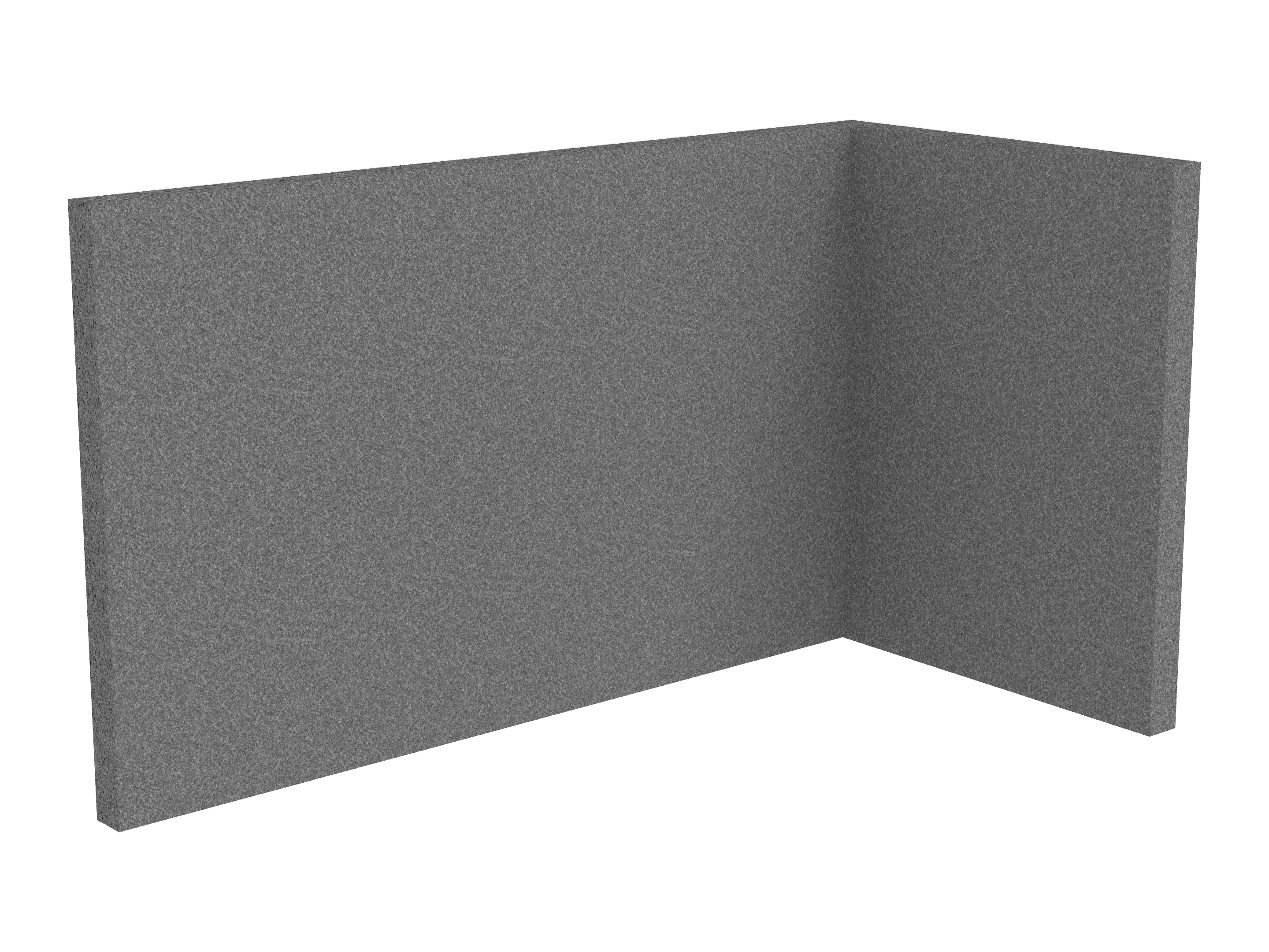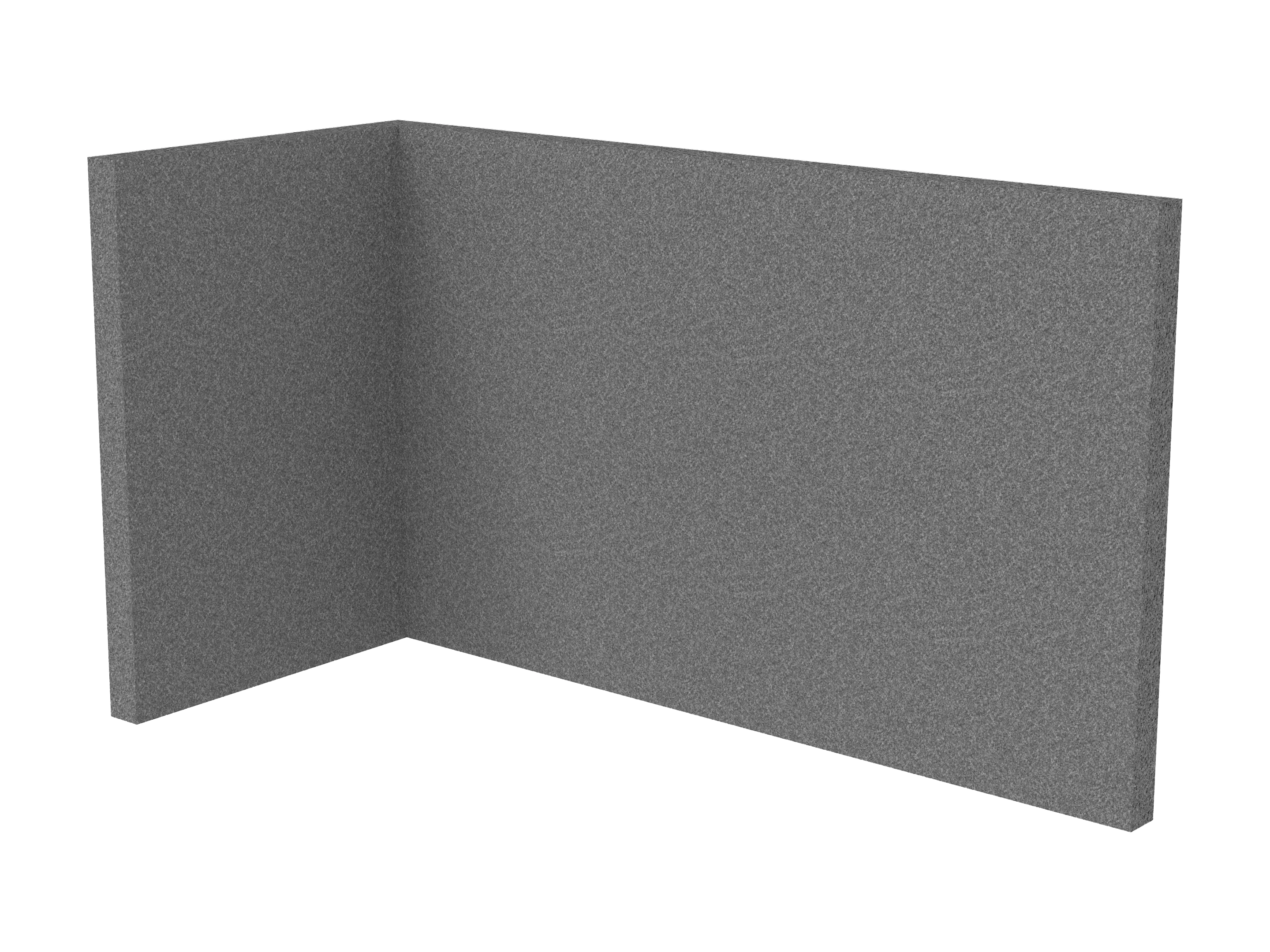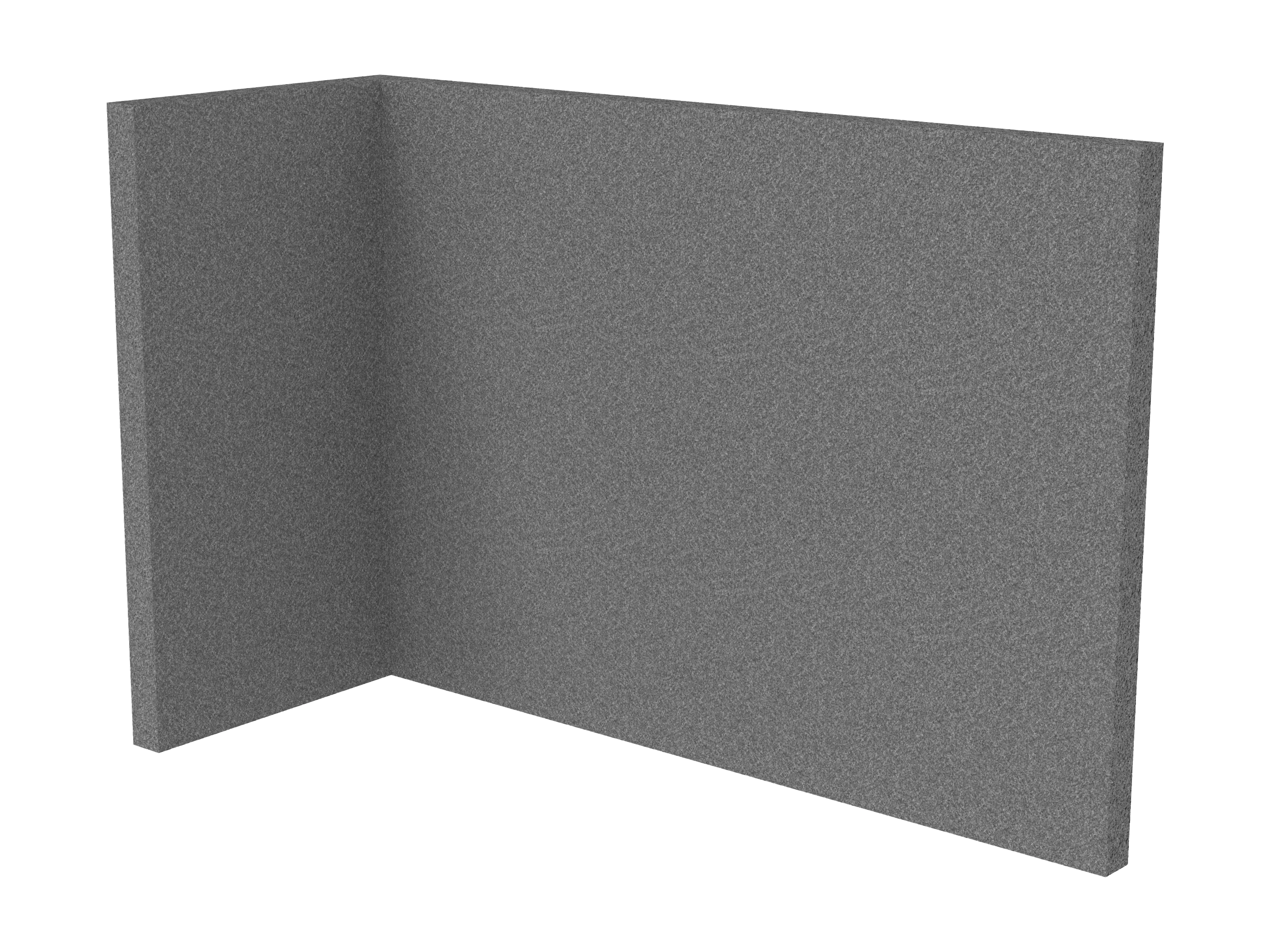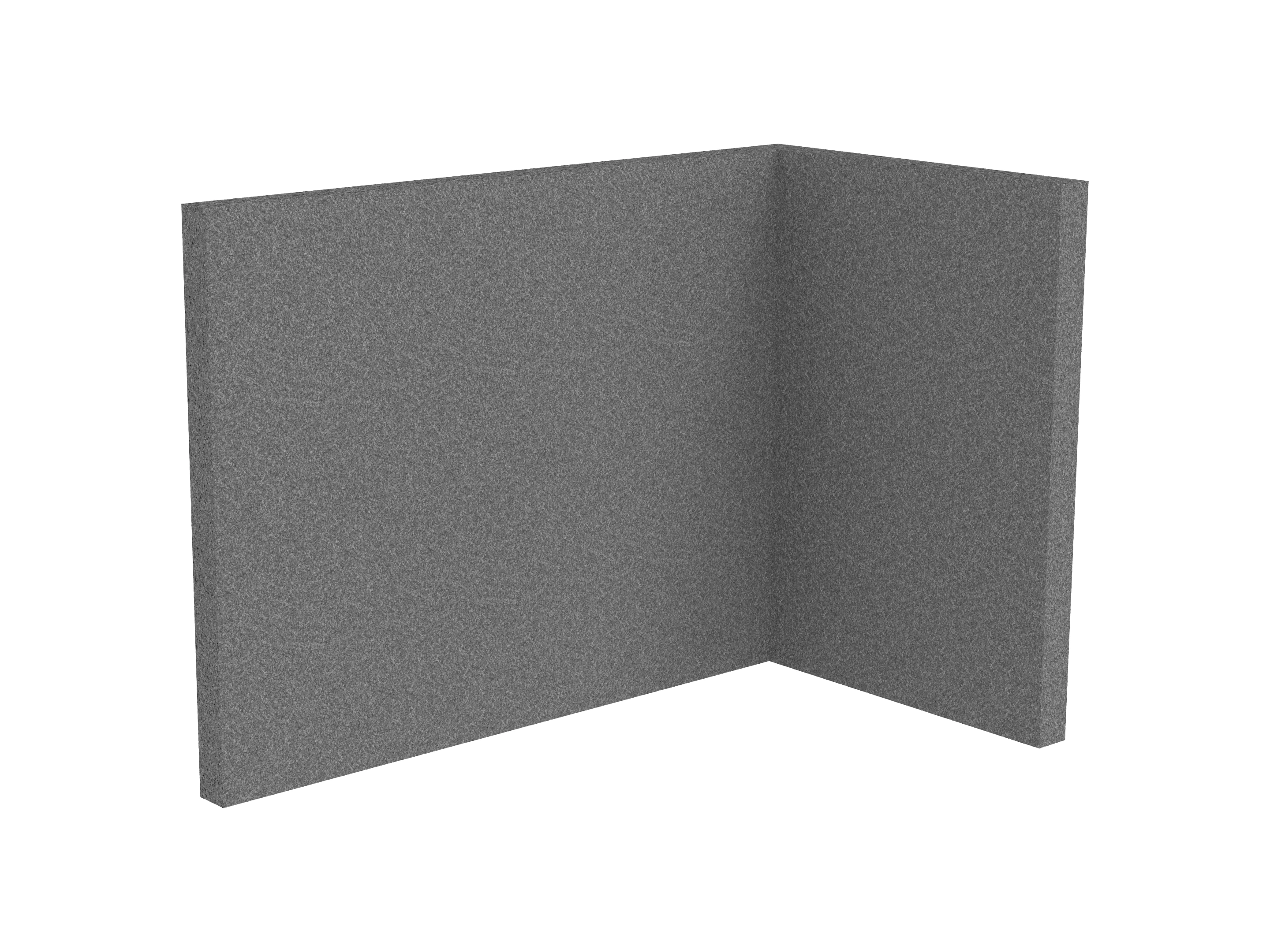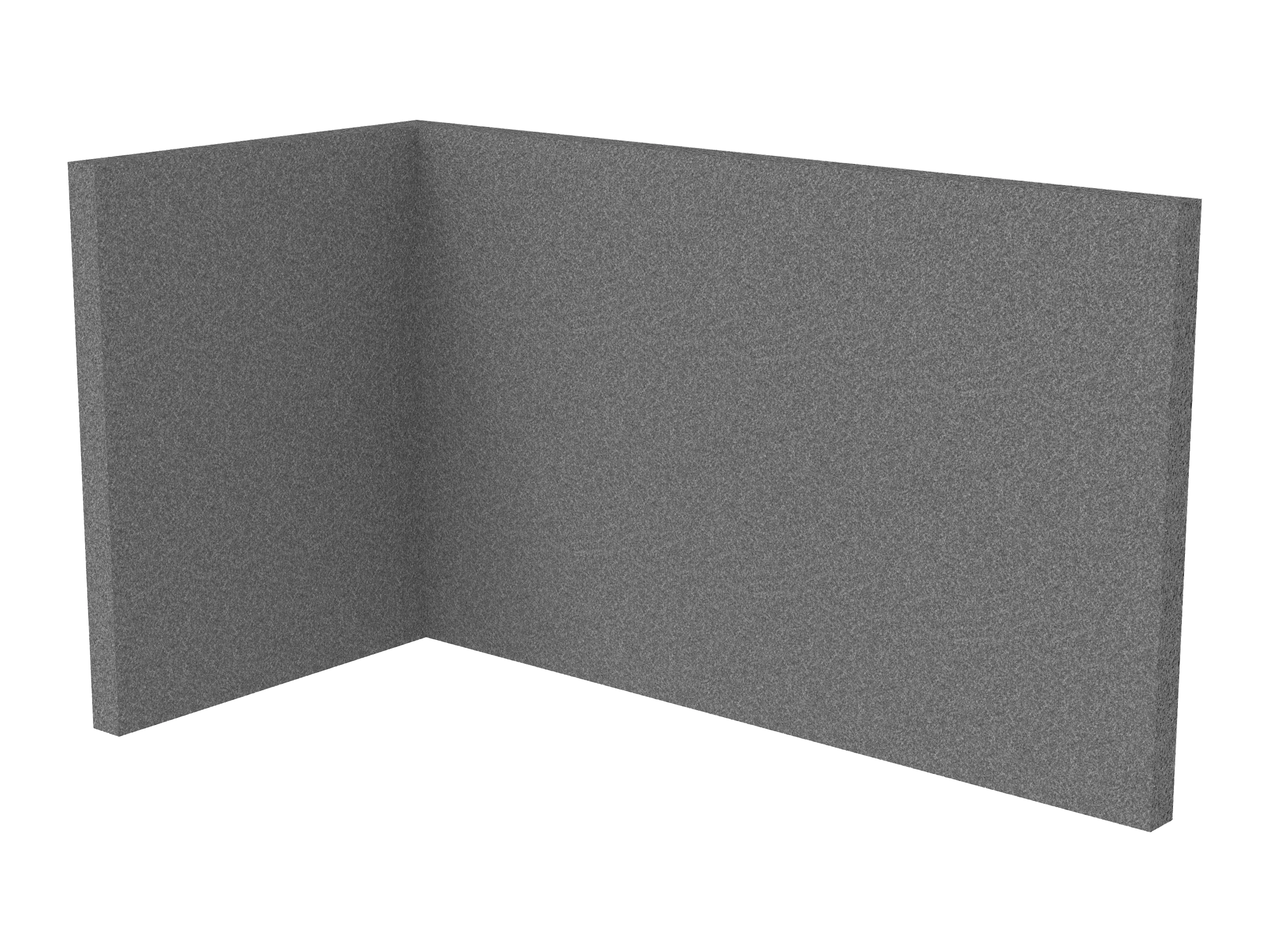 Bestaande uit 1 staand frontpaneel en 1 staand zijpaneel aan de rechterzijde. Panelen zijn opgebouwd uit een 40mm berken multiplex frame, gevuld met gerecycled katoen, absorbtieklasse A/NRC waarde 0,95. Gegeven maatvoering zijn de bureaumaten