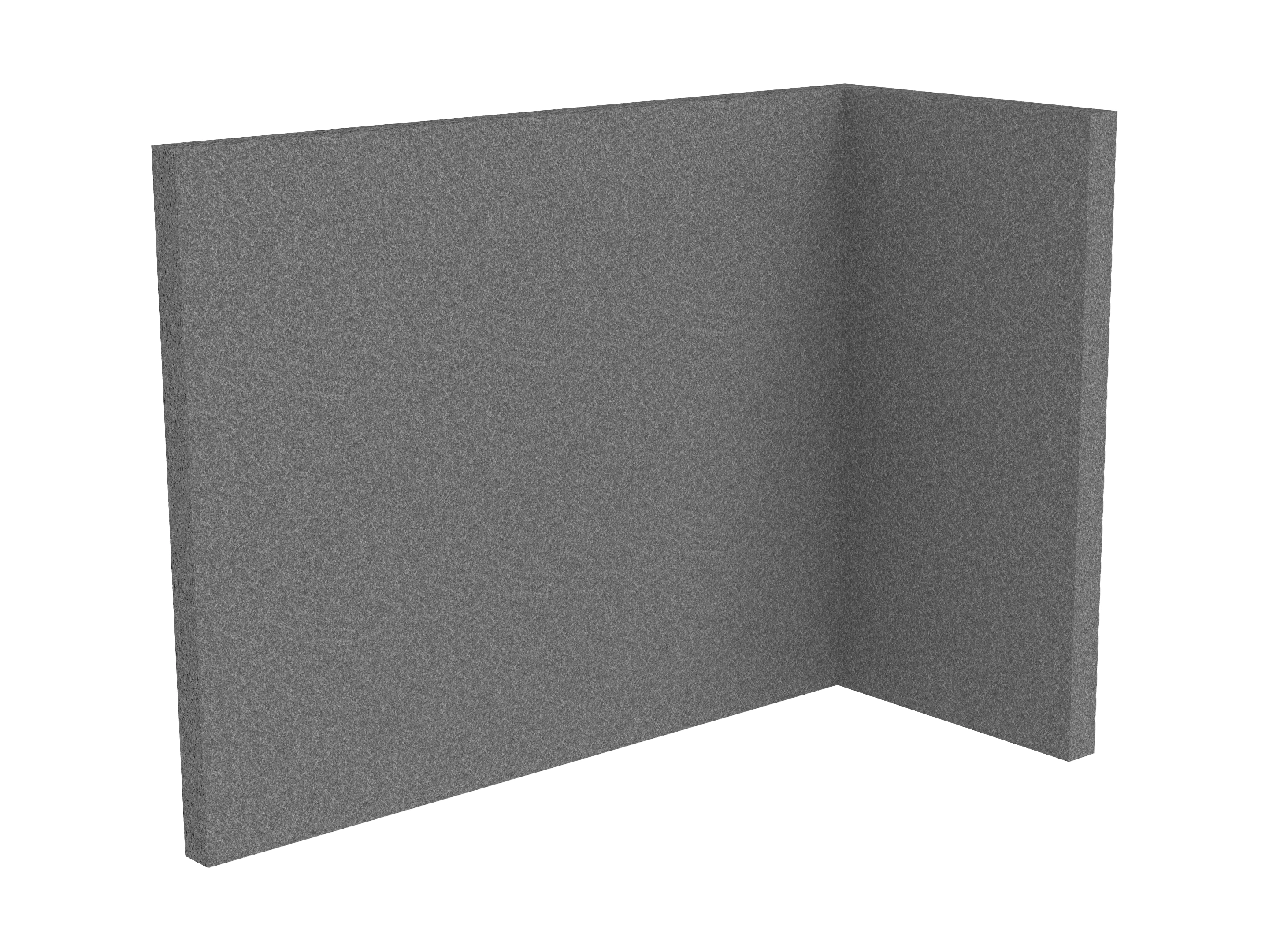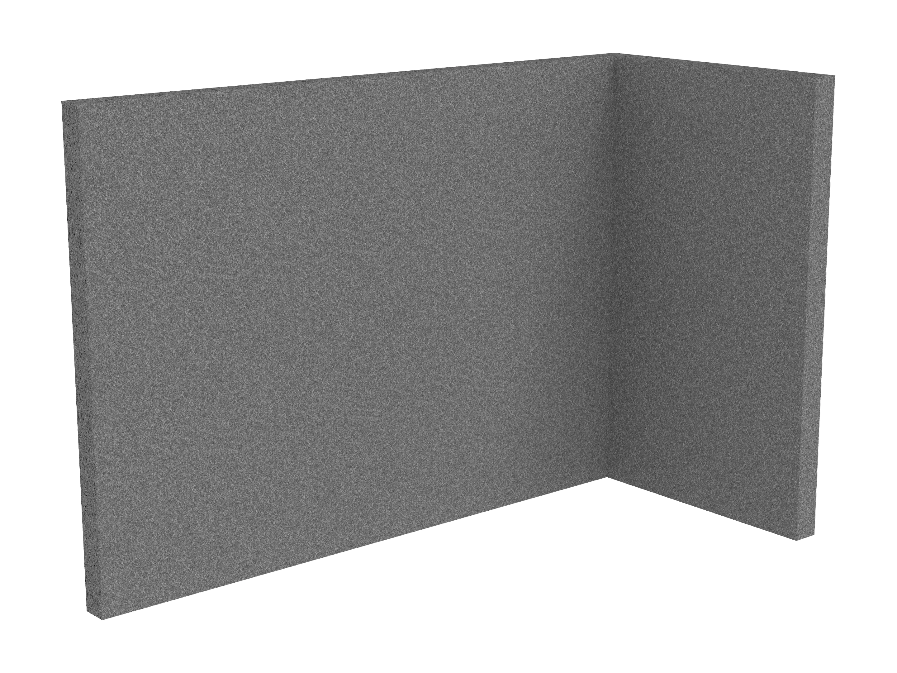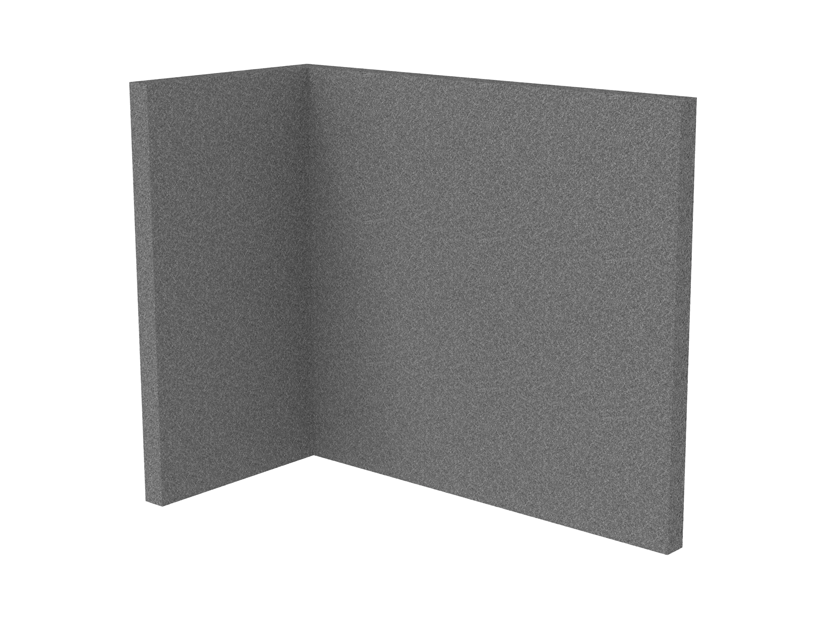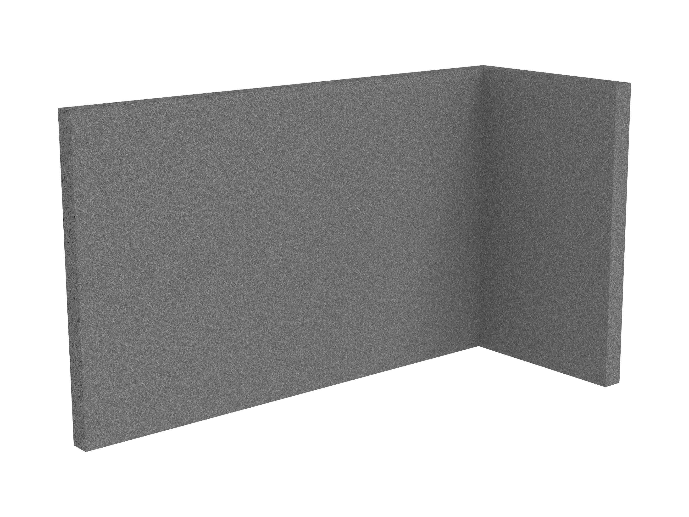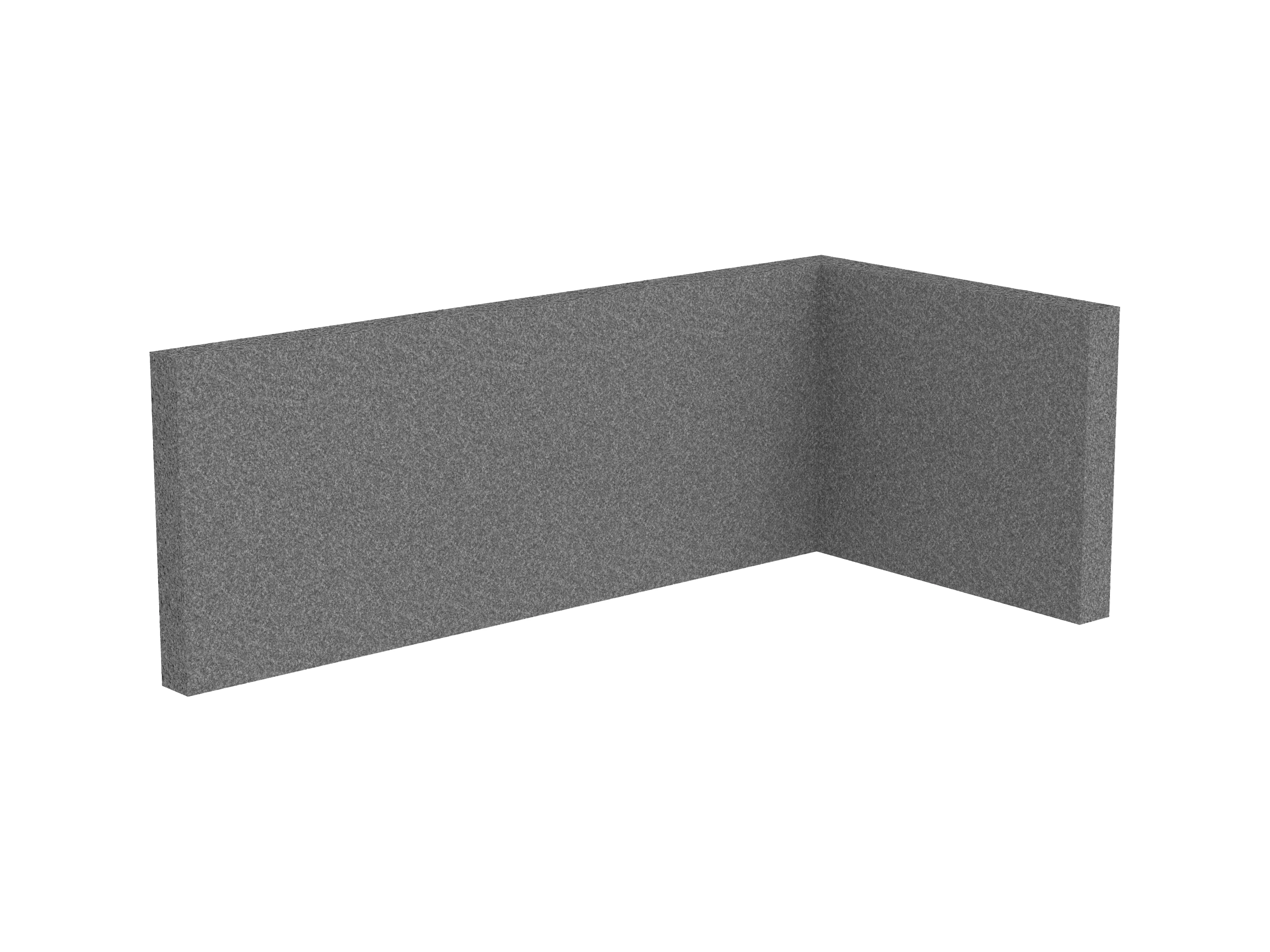 Bestaande uit 1 staand frontpaneel en 1 staand zijpaneel aan de rechterzijde. Panelen zijn opgebouwd uit een 40mm berken multiplex frame, gevuld met gerecycled katoen, absorbtieklasse A/NRC waarde 0,95. Gegeven maatvoering zijn de bureaumaten
