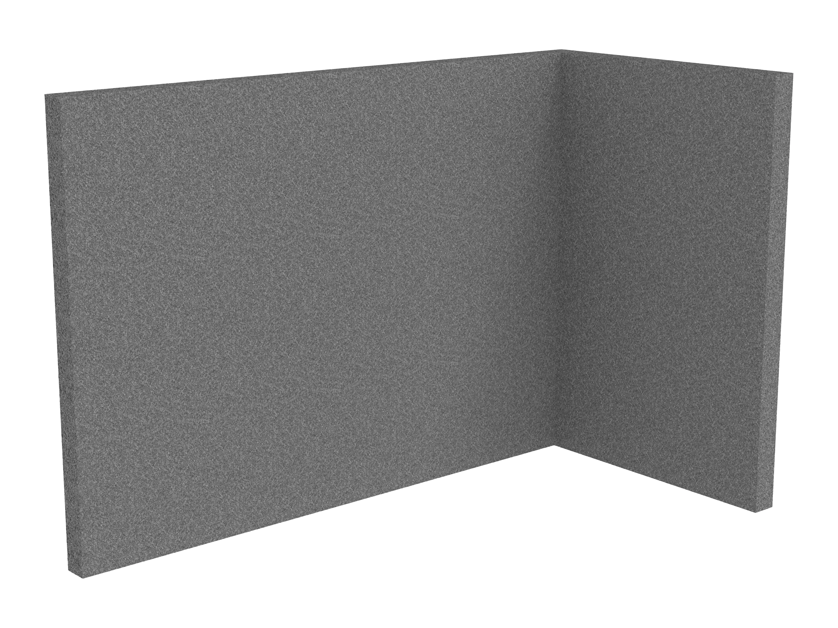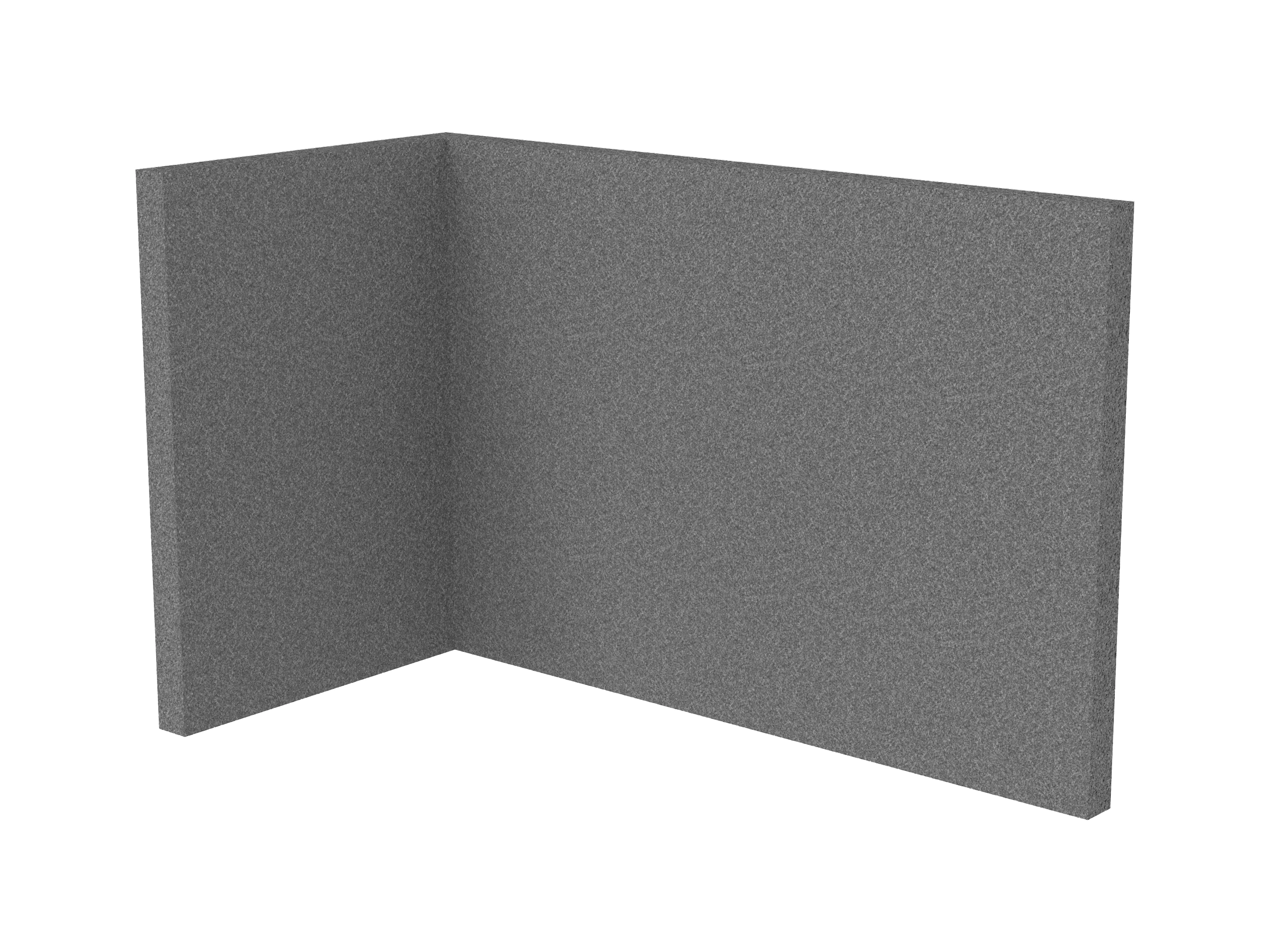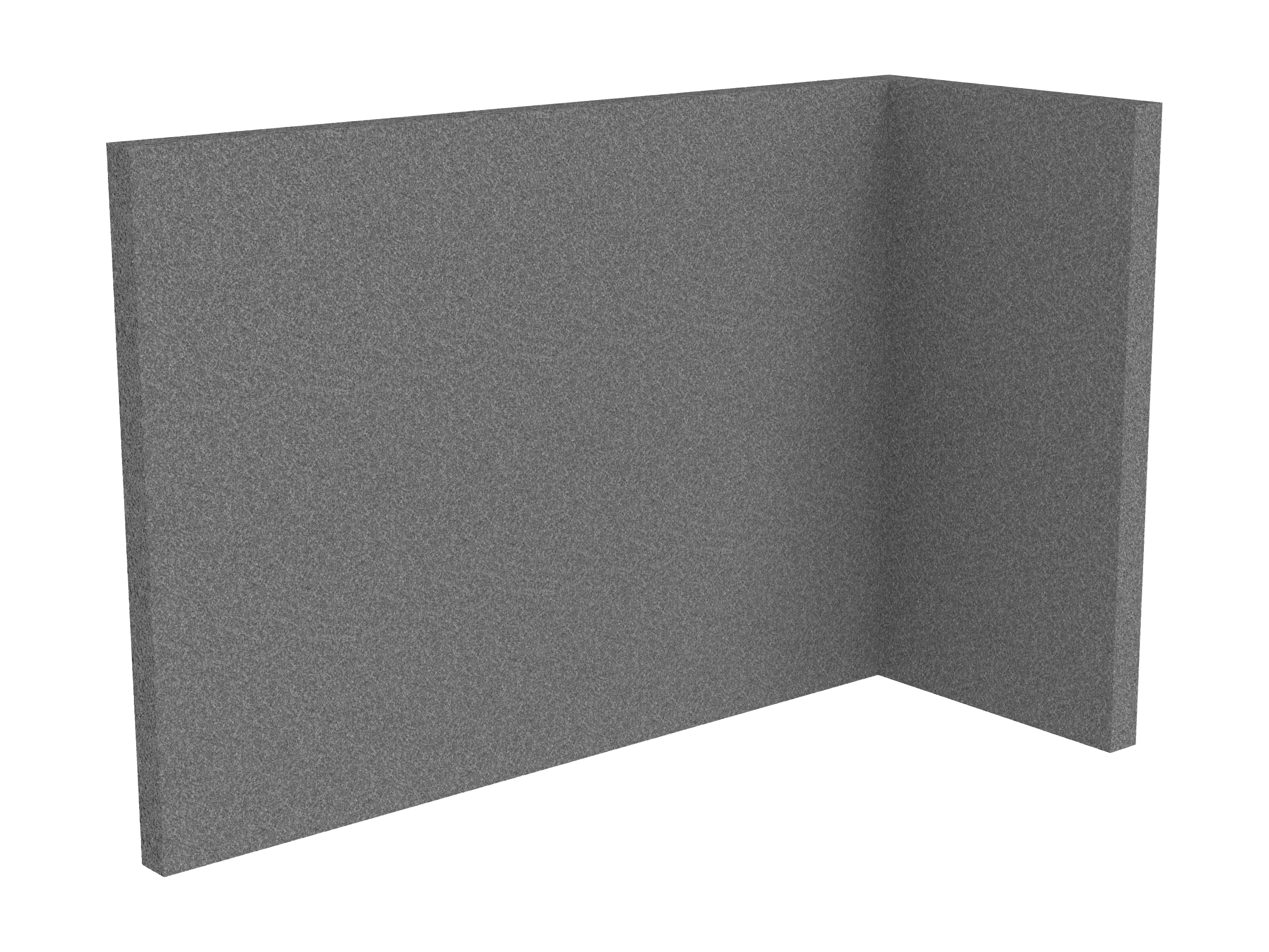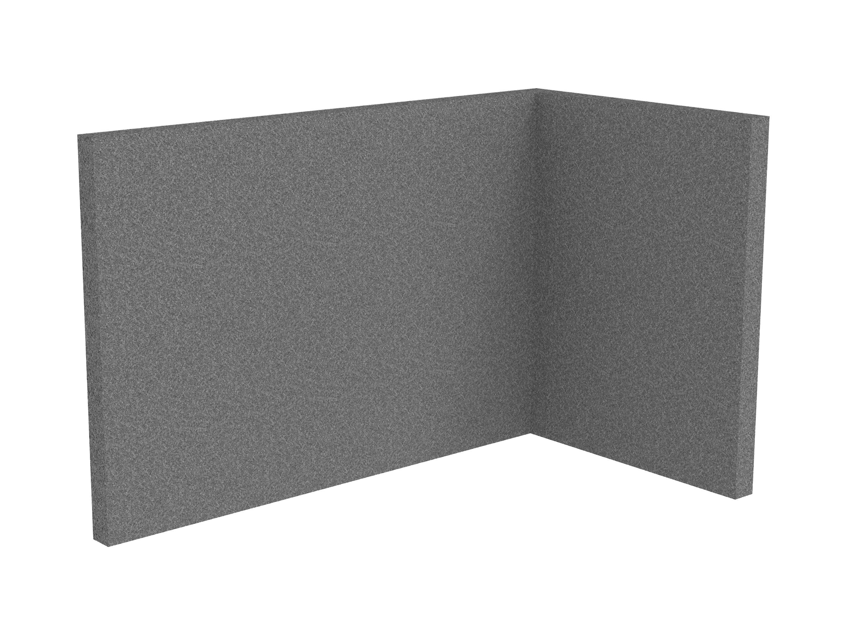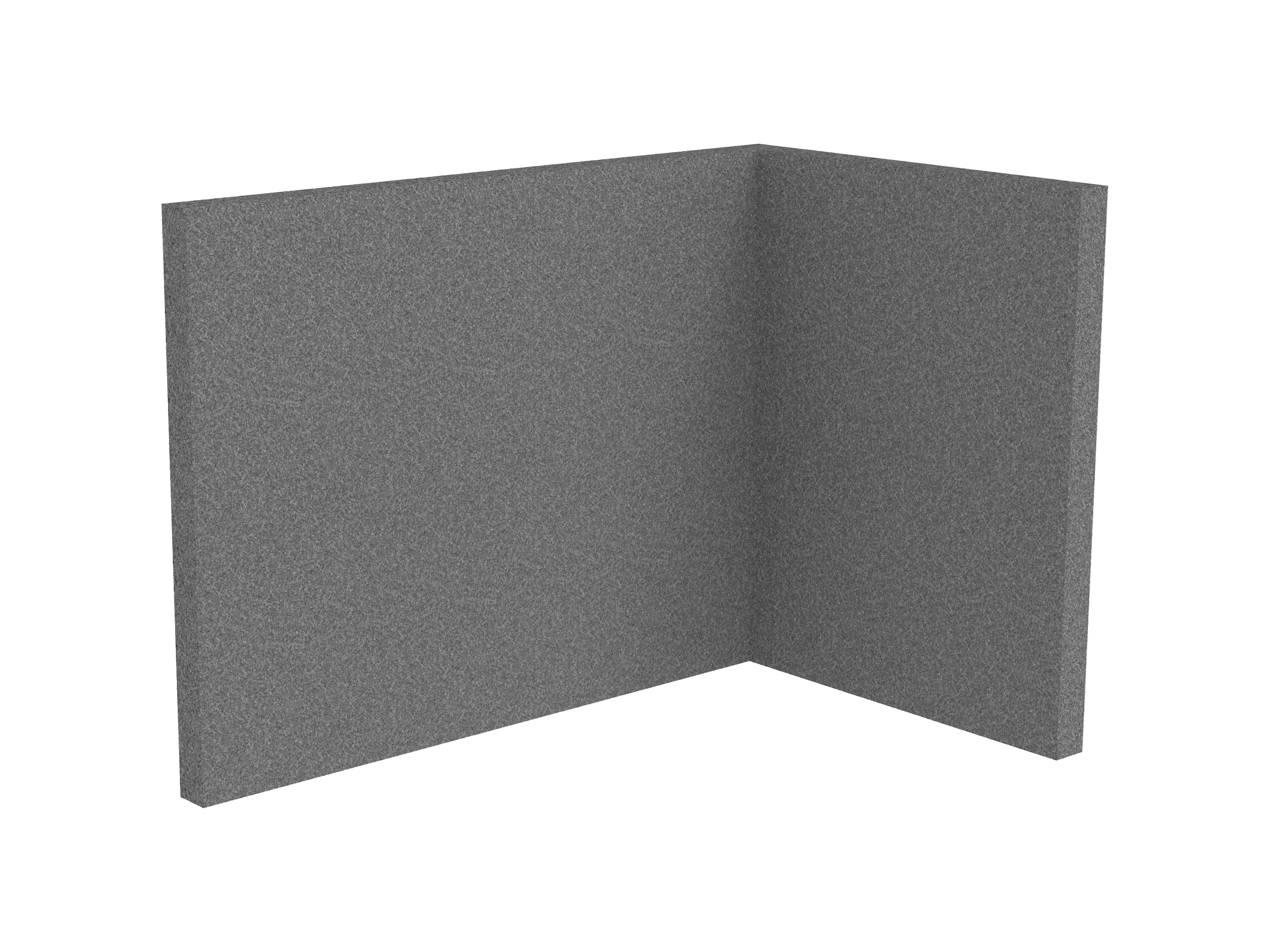 Bestaande uit 1 staand frontpaneel en 1 staand zijpaneel aan de rechterzijde. Panelen zijn opgebouwd uit een 40mm berken multiplex frame, gevuld met gerecycled katoen, absorbtieklasse A/NRC waarde 0,95. Gegeven maatvoering zijn de bureaumaten