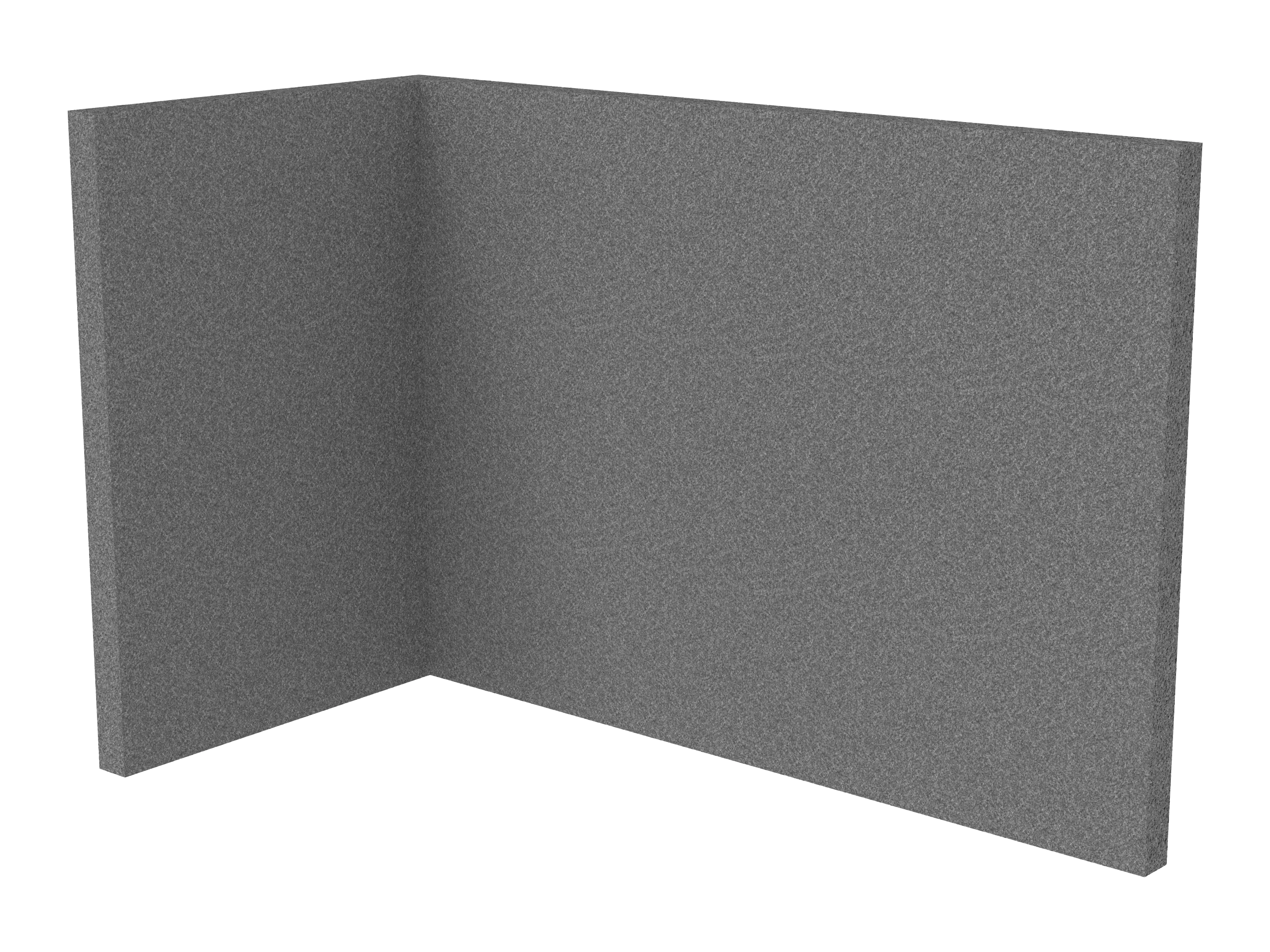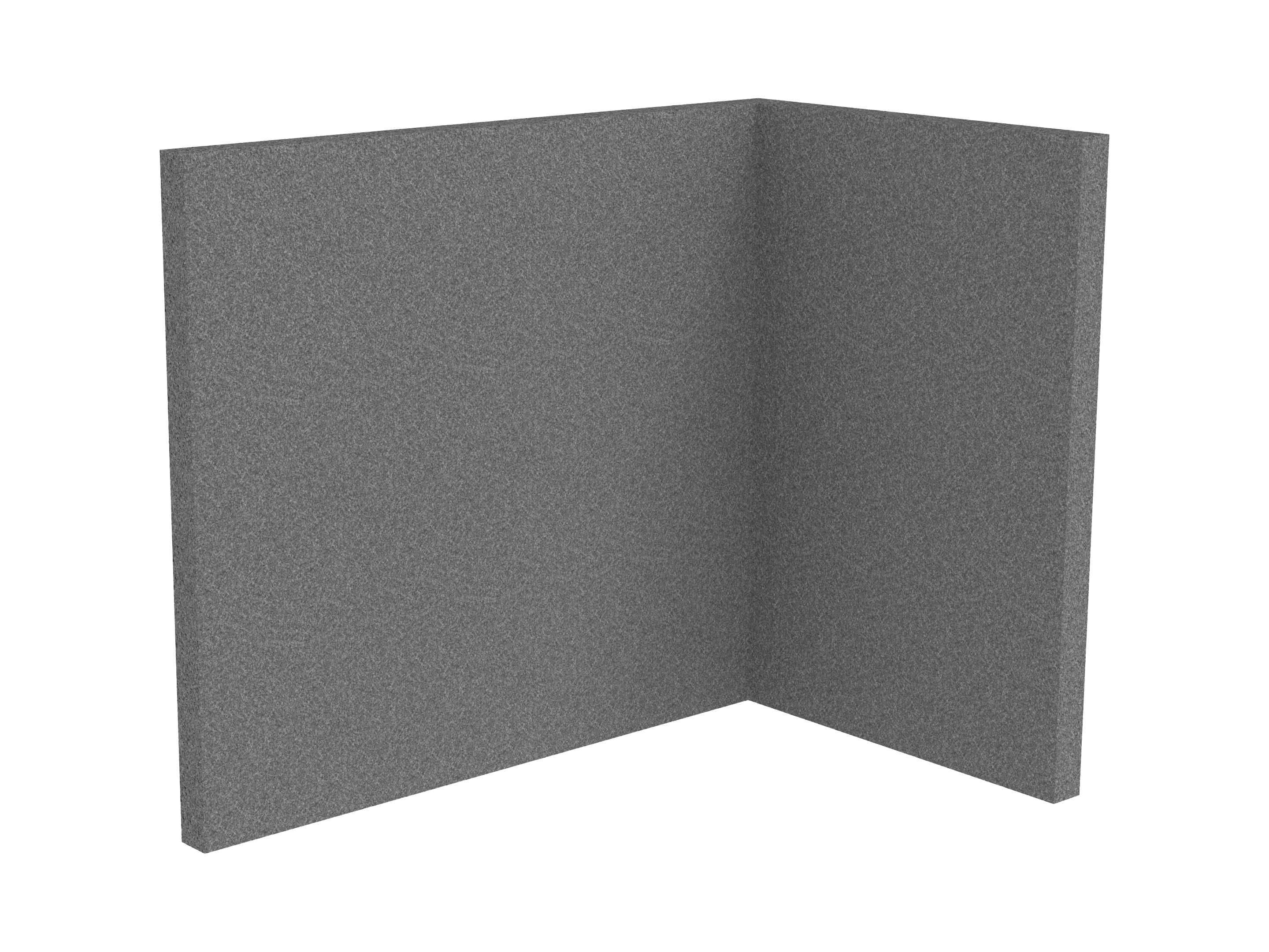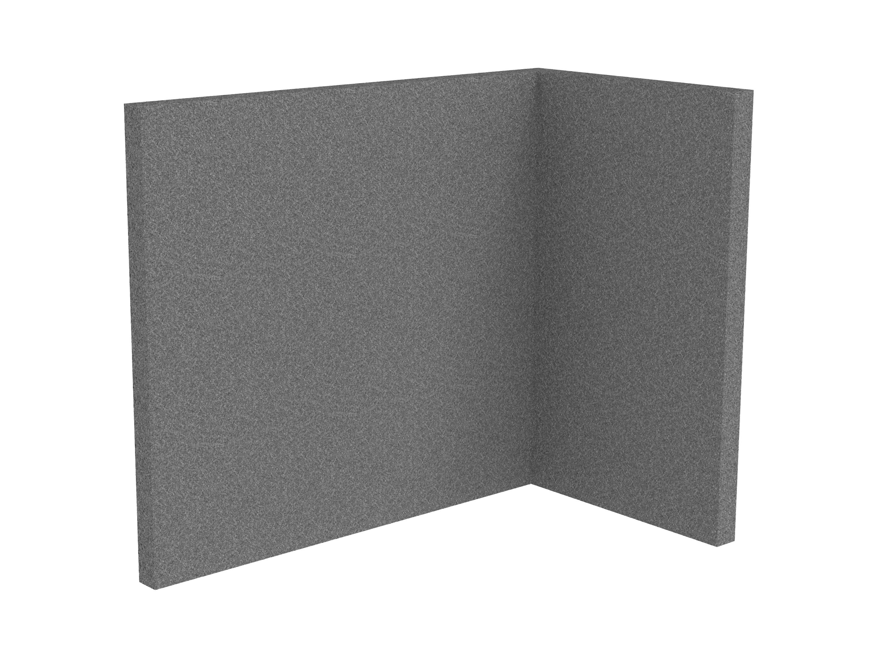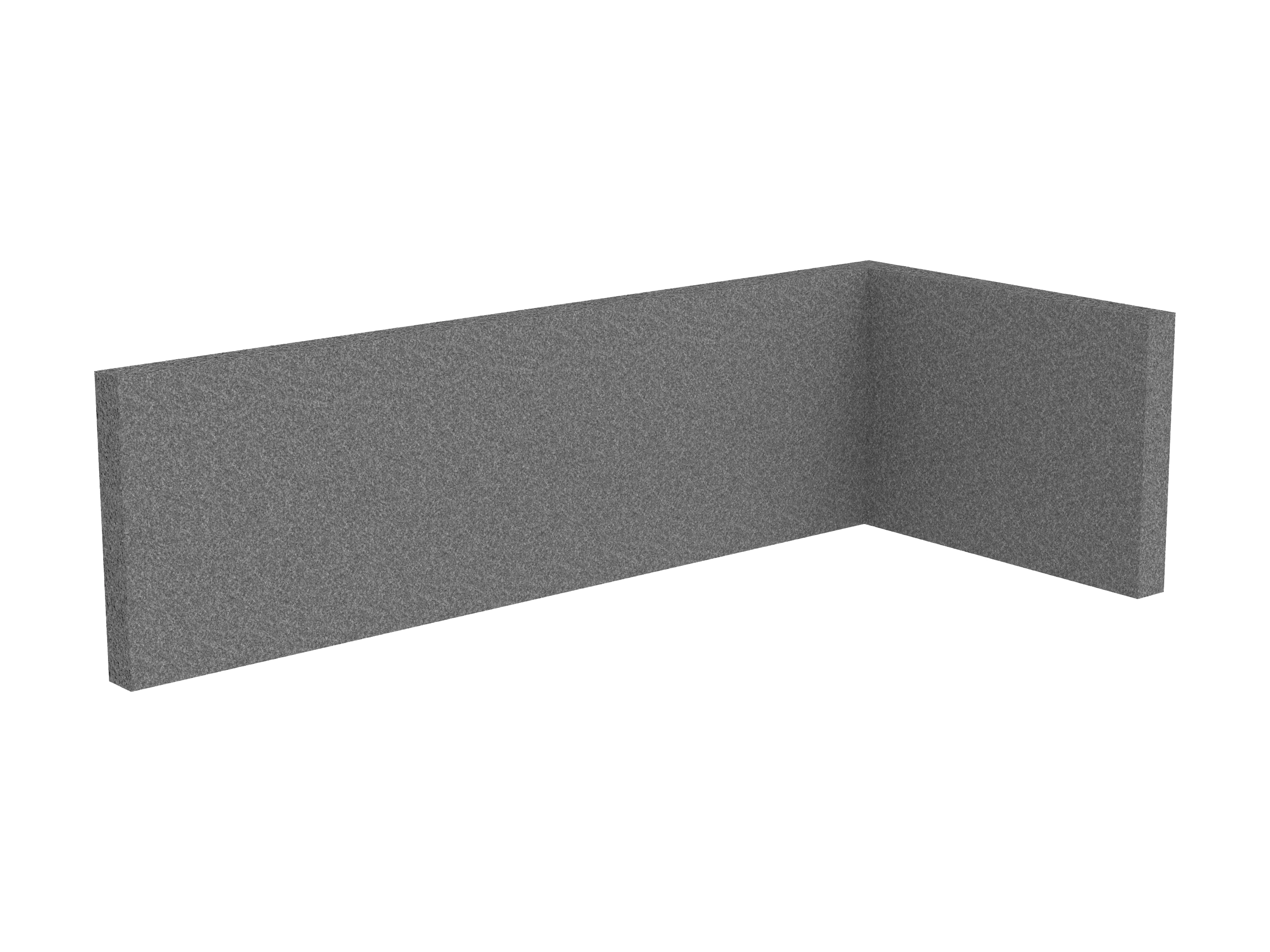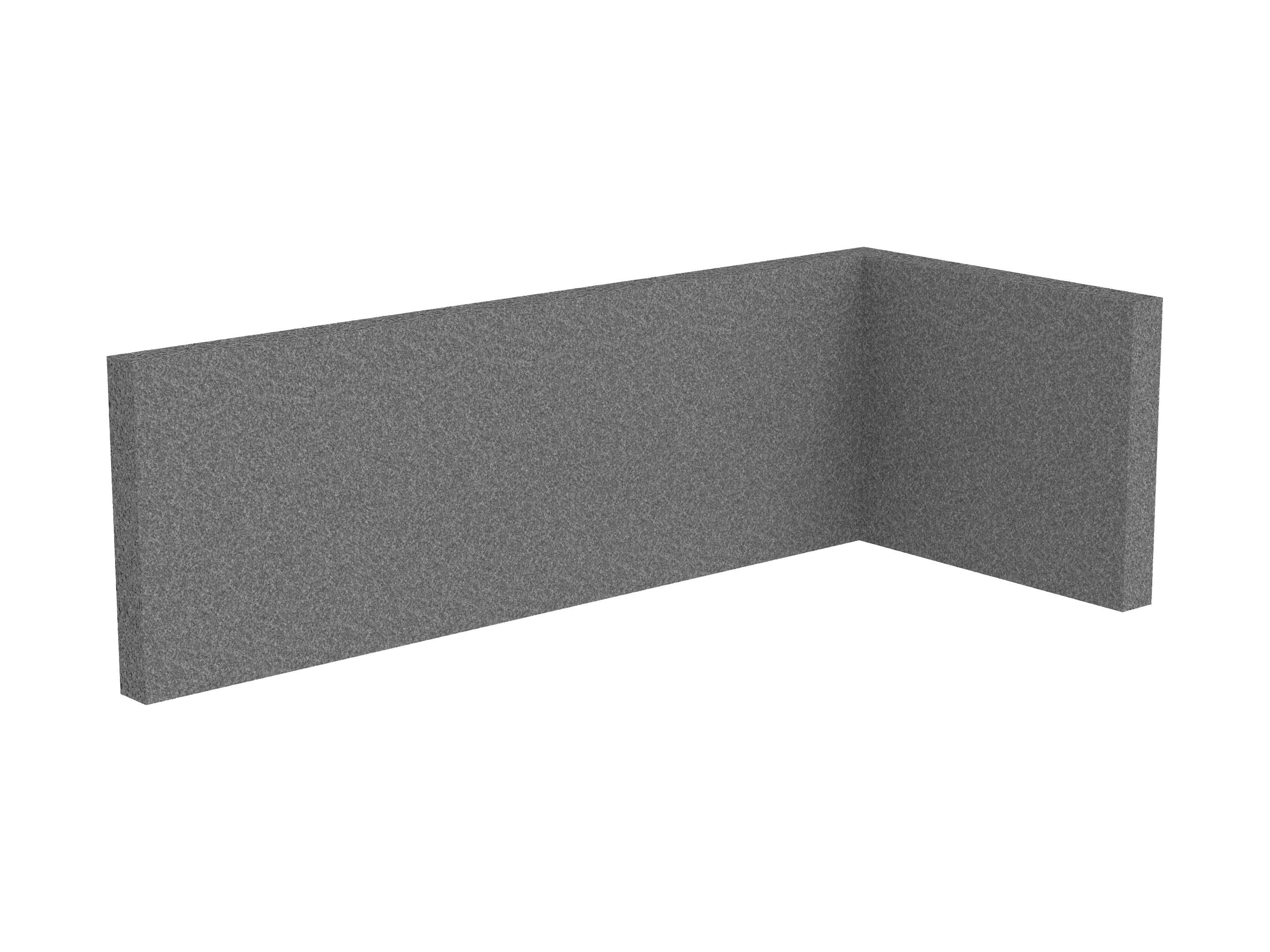 Bestaande uit 1 staand frontpaneel en 1 staand zijpaneel aan de rechterzijde. Panelen zijn opgebouwd uit een 40mm berken multiplex frame, gevuld met gerecycled katoen, absorbtieklasse A/NRC waarde 0,95. Gegeven maatvoering zijn de bureaumaten