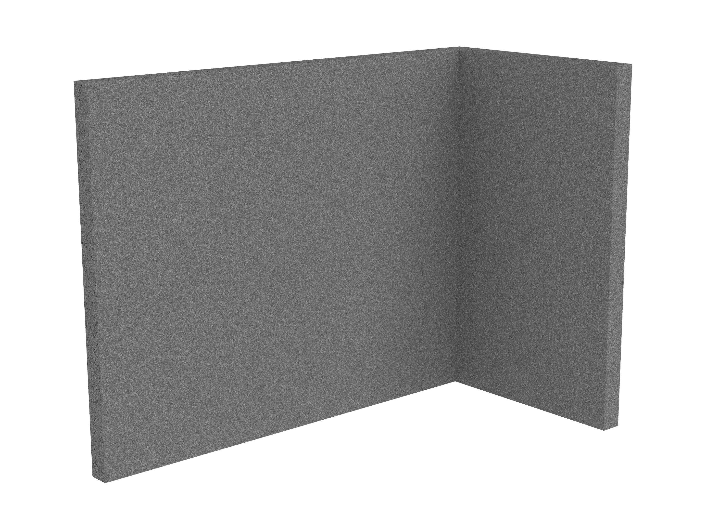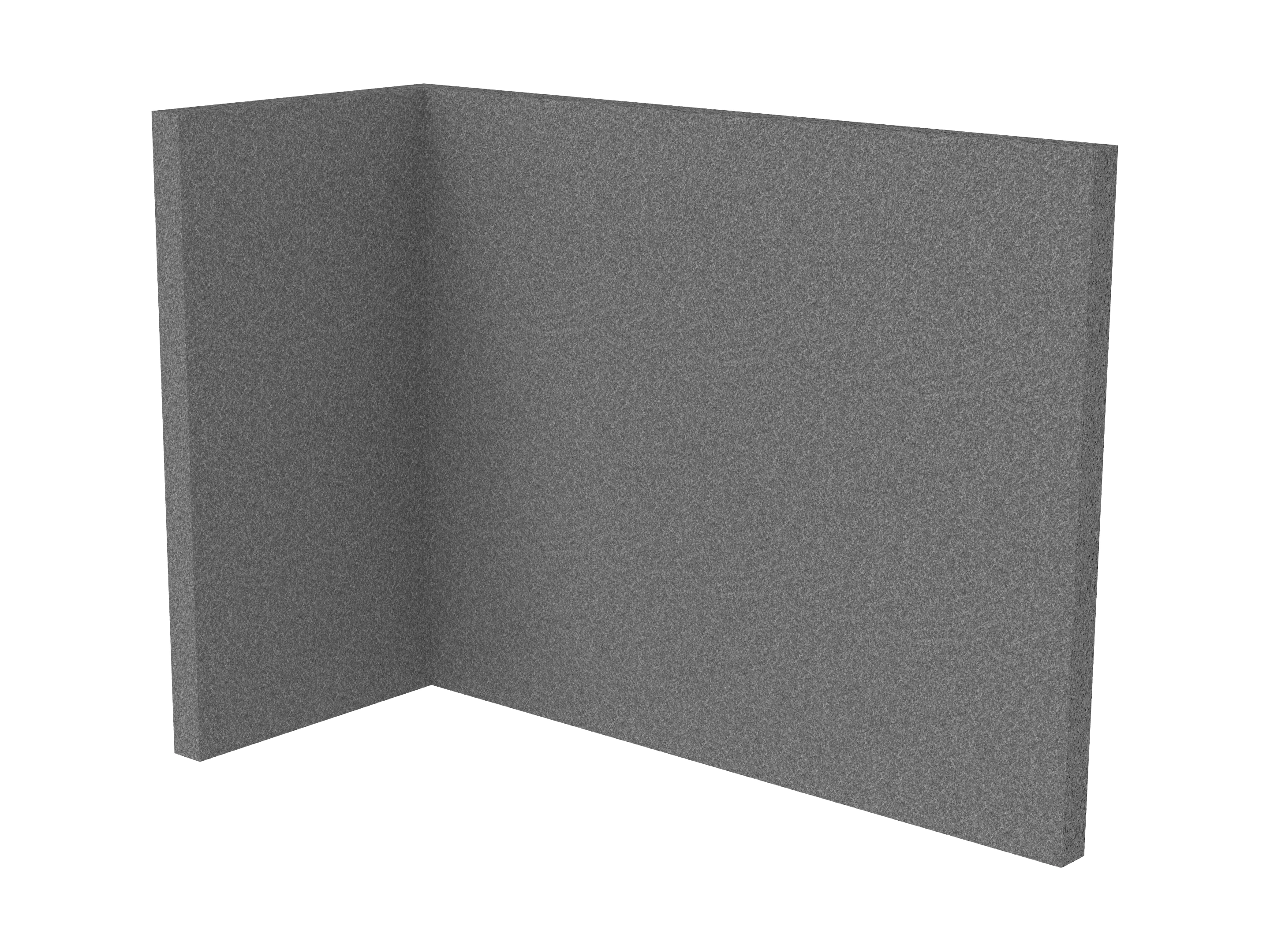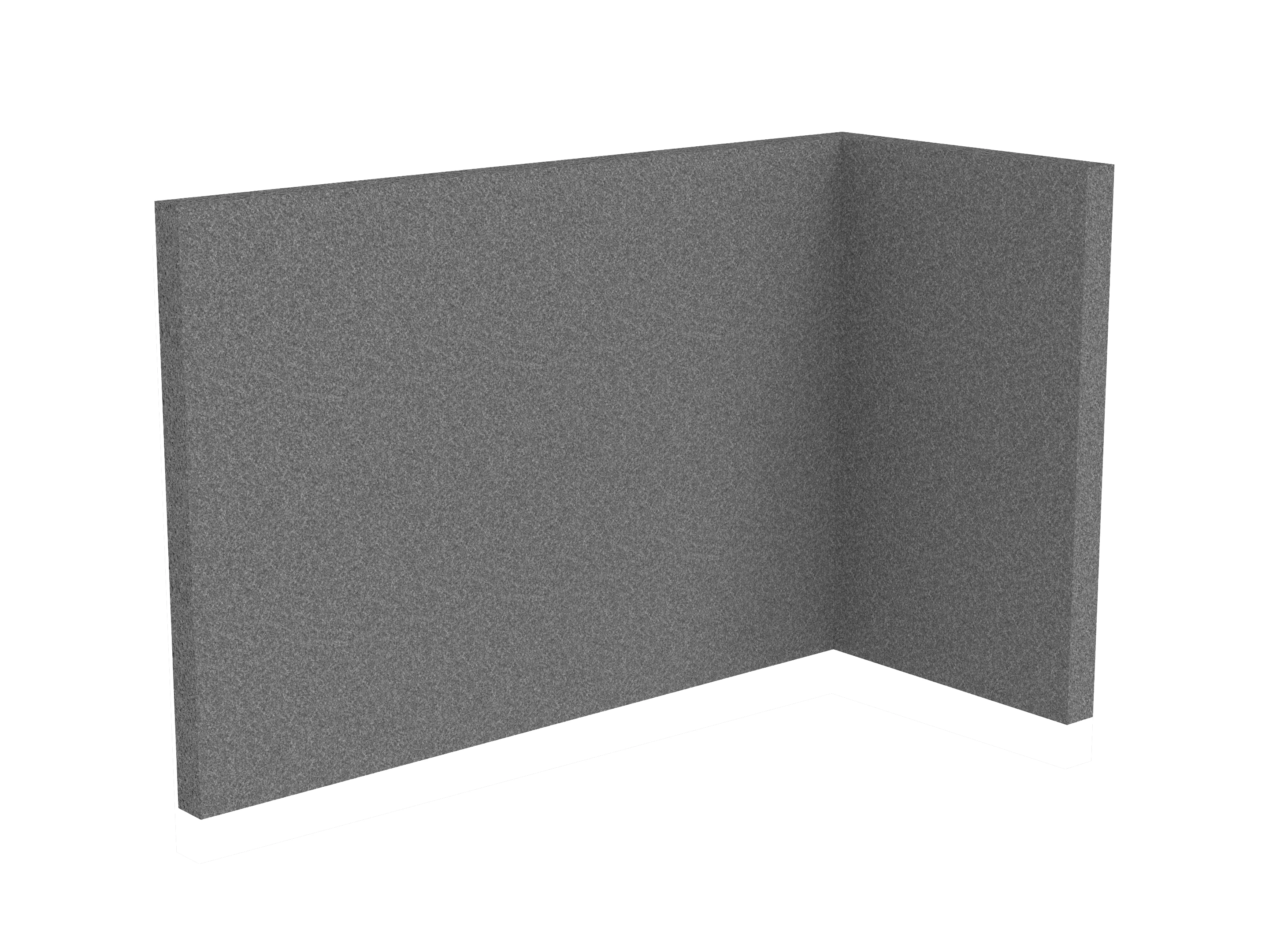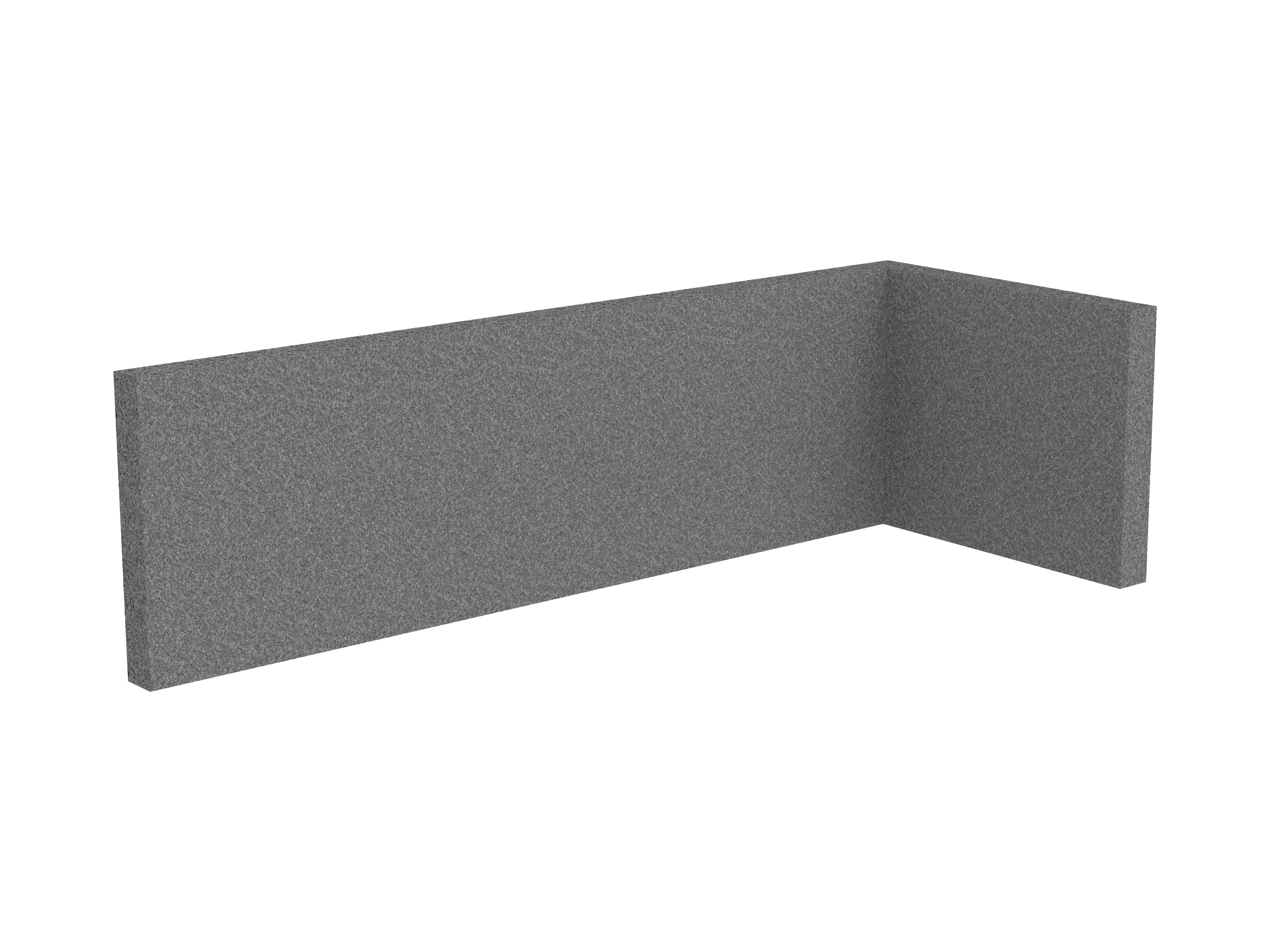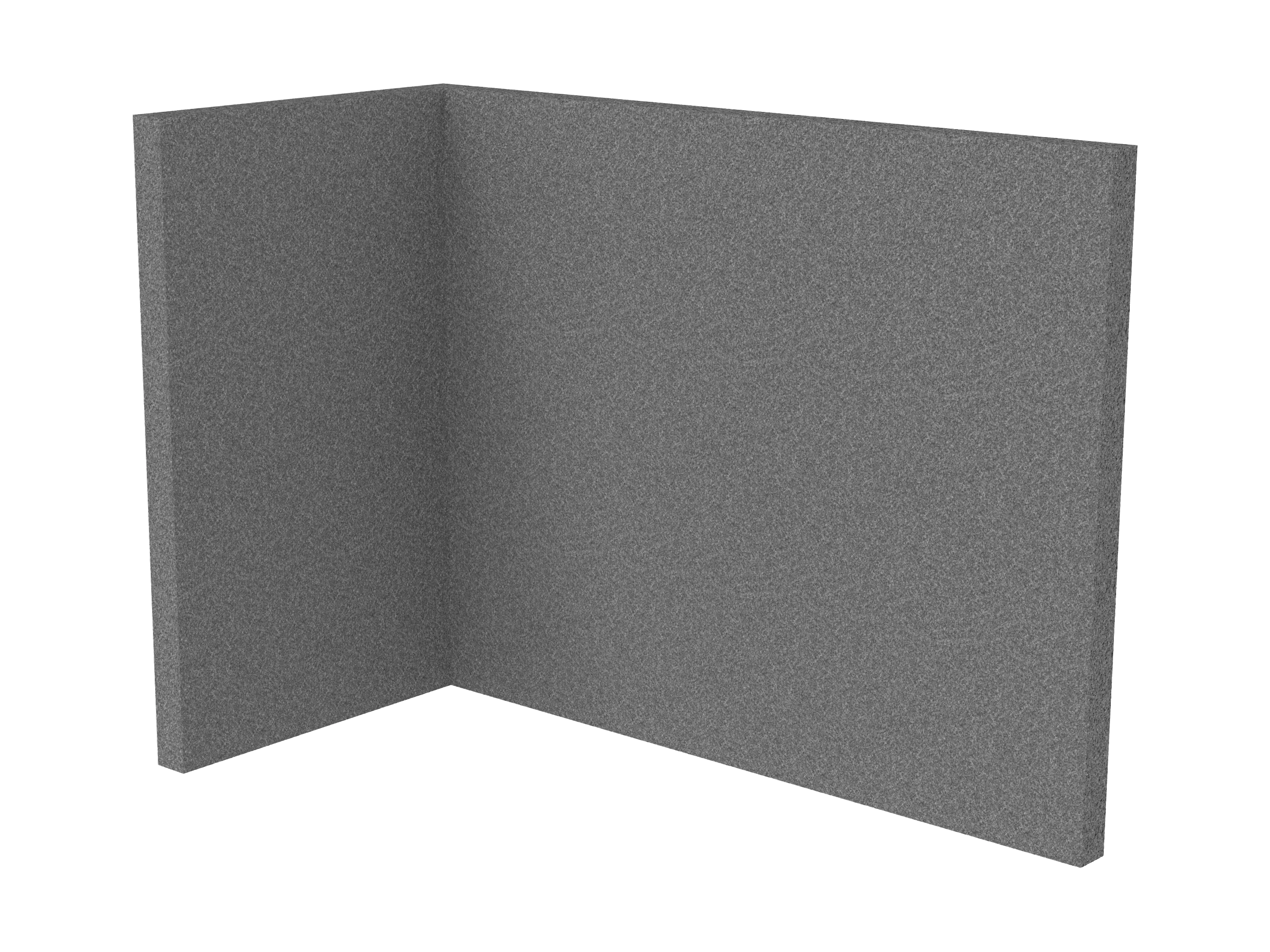 Bestaande uit 1 staand frontpaneel en 1 staand zijpaneel aan de rechterzijde. Panelen zijn opgebouwd uit een 40mm berken multiplex frame, gevuld met gerecycled katoen, absorbtieklasse A/NRC waarde 0,95. Gegeven maatvoering zijn de bureaumaten