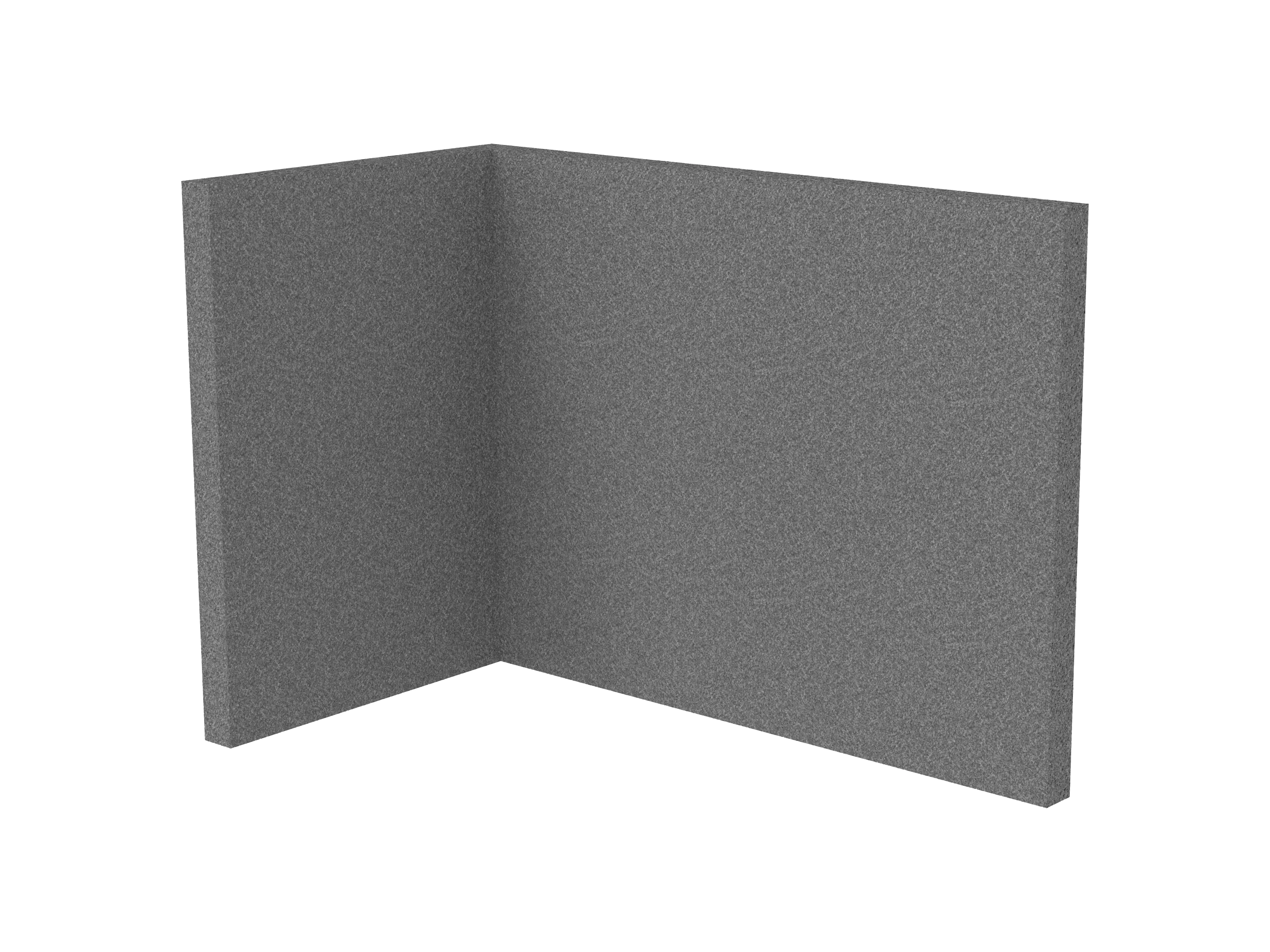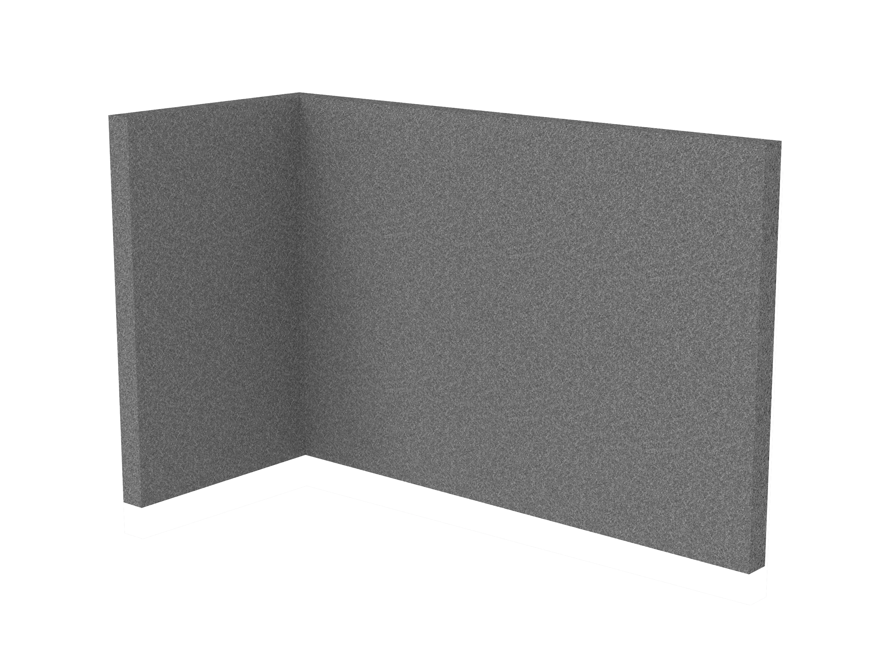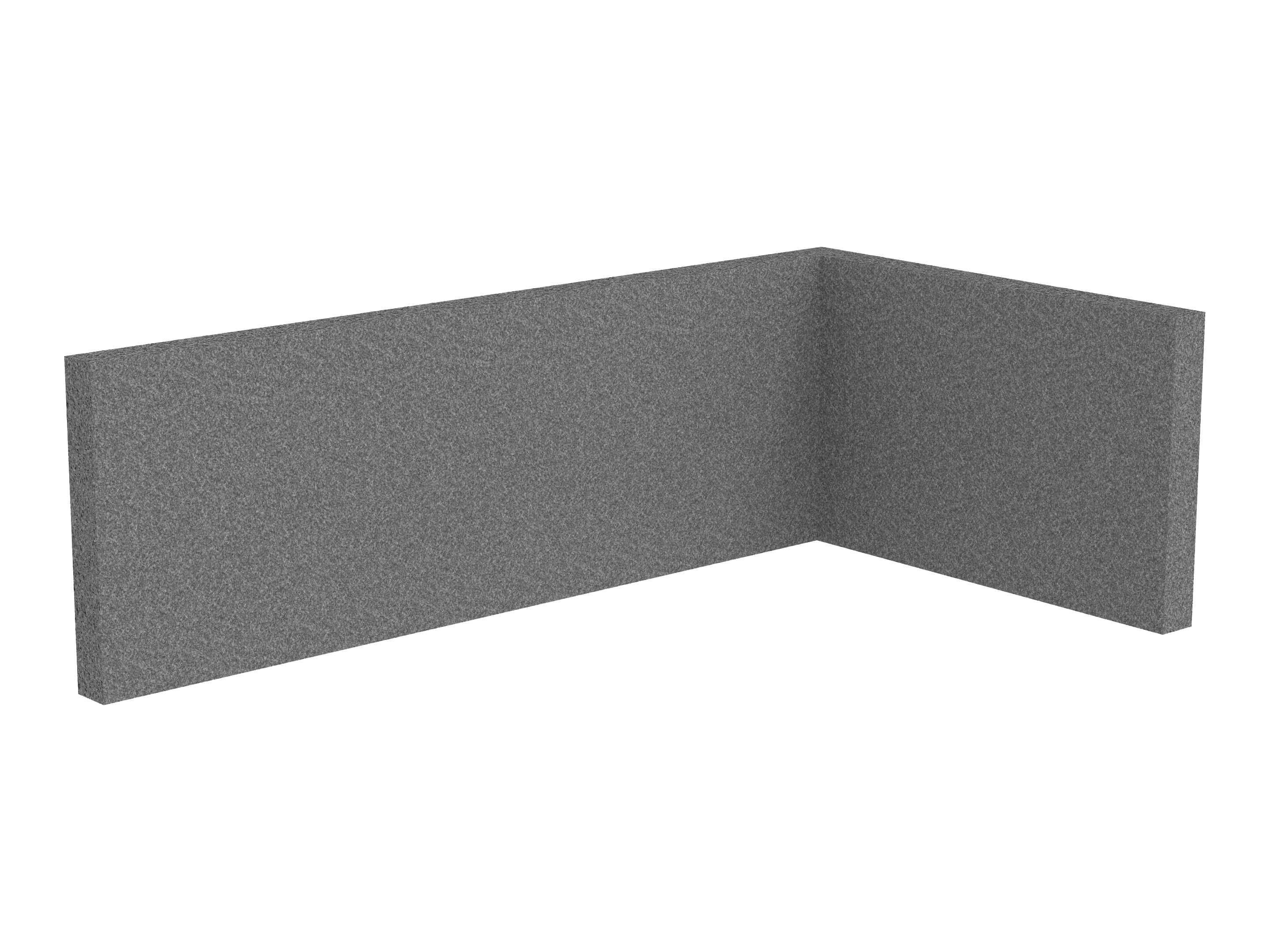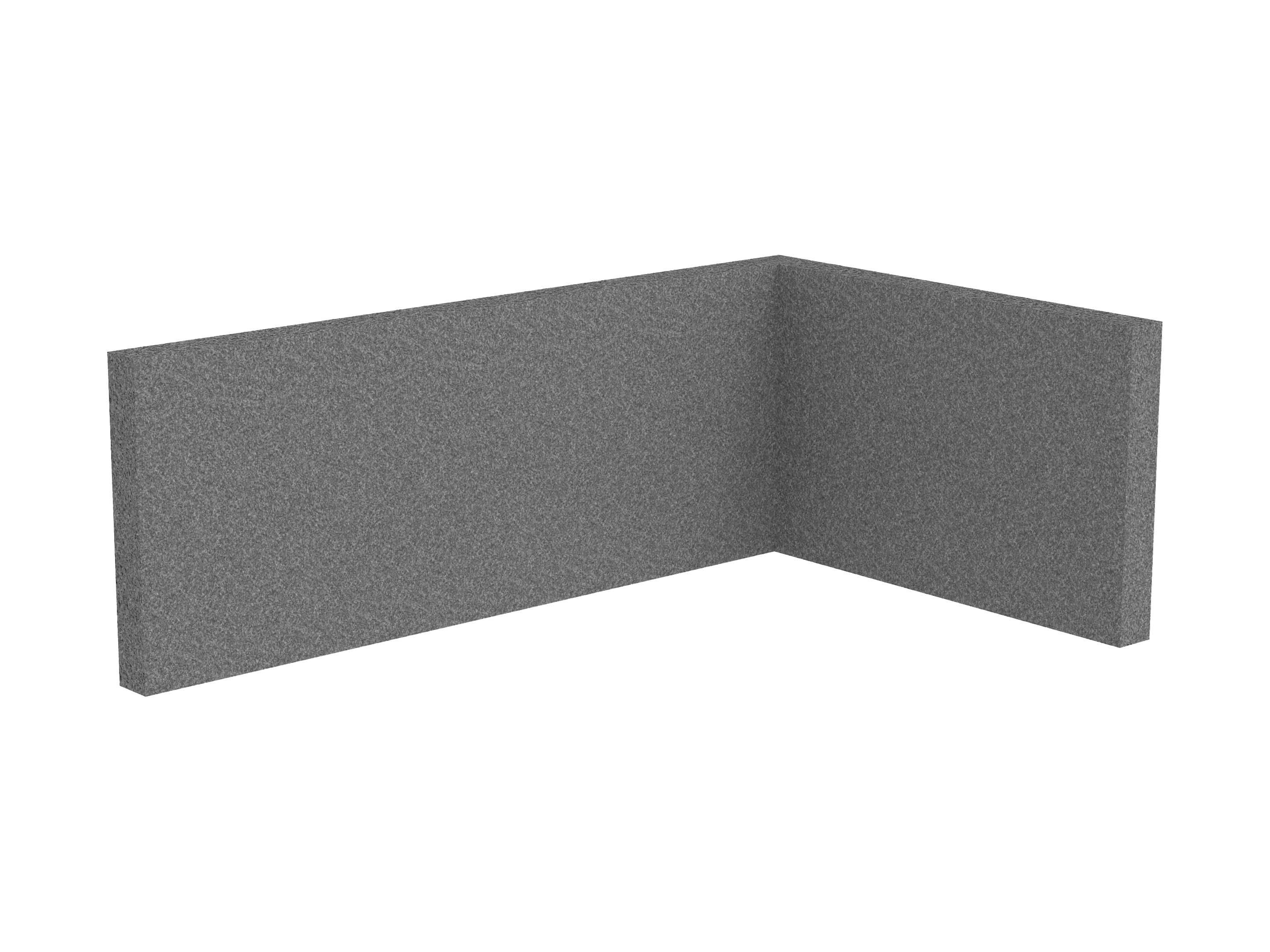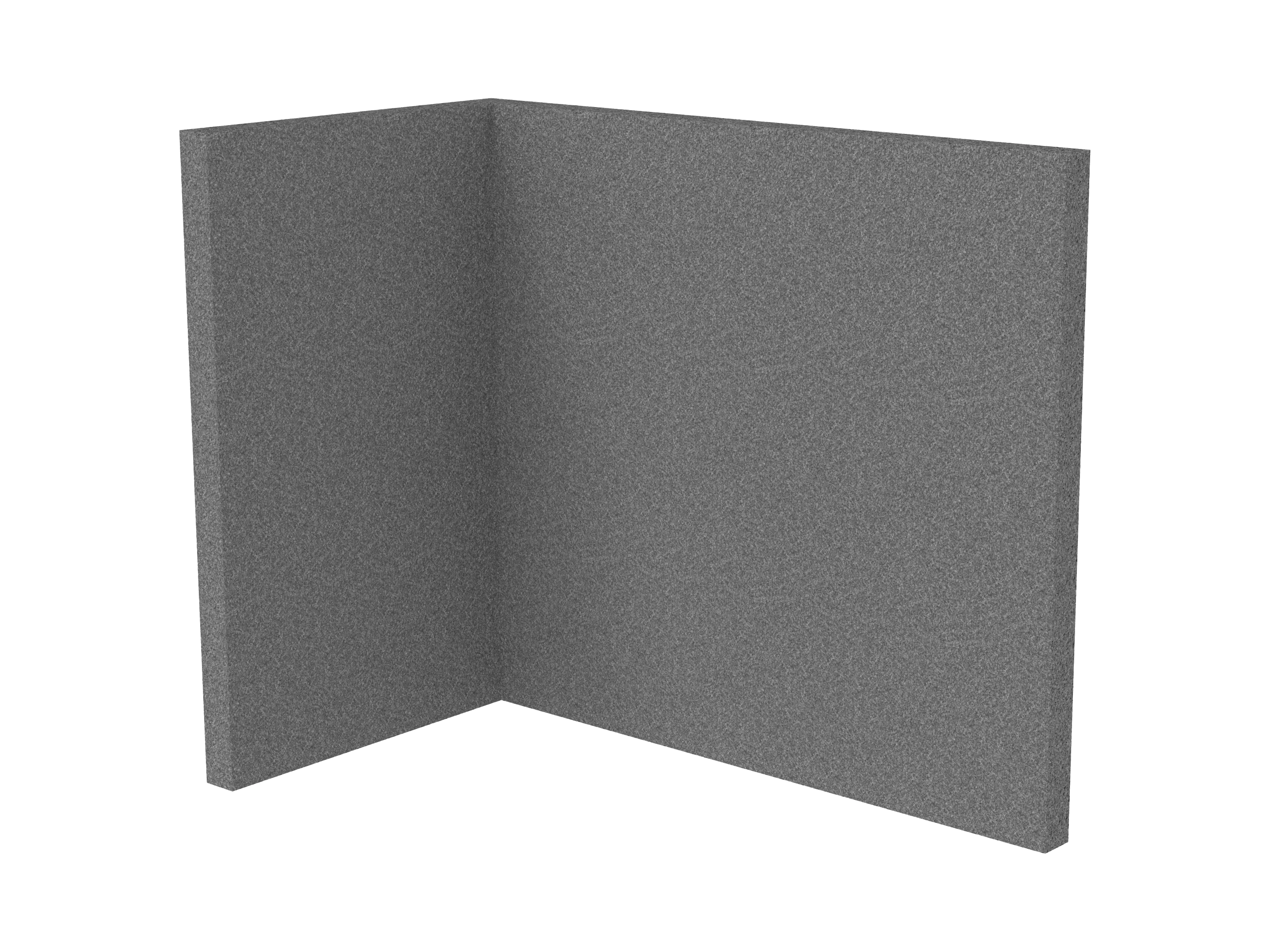 Bestaande uit 1 staand frontpaneel en 1 staand zijpaneel aan de rechterzijde. Panelen zijn opgebouwd uit een 40mm berken multiplex frame, gevuld met gerecycled katoen, absorbtieklasse A/NRC waarde 0,95. Gegeven maatvoering zijn de bureaumaten