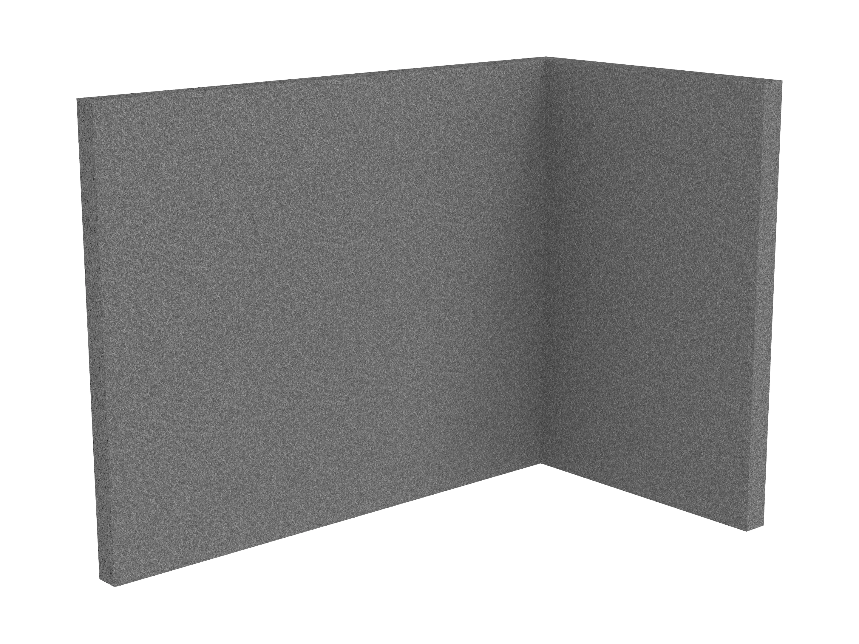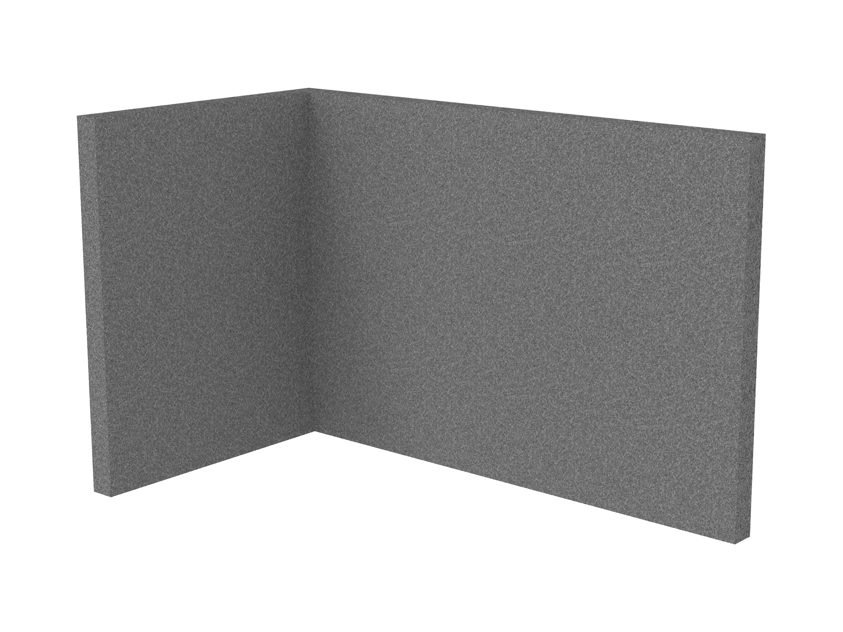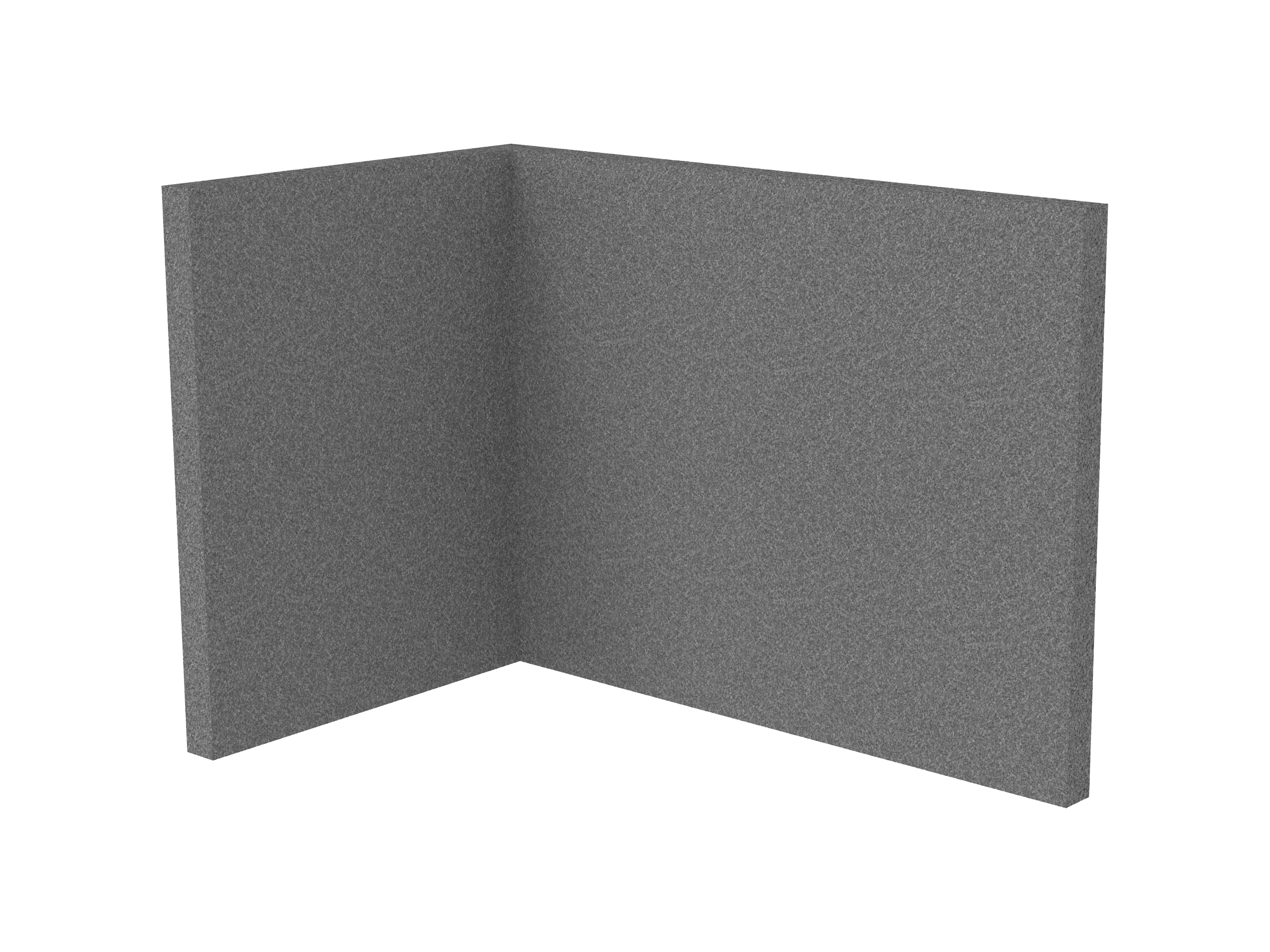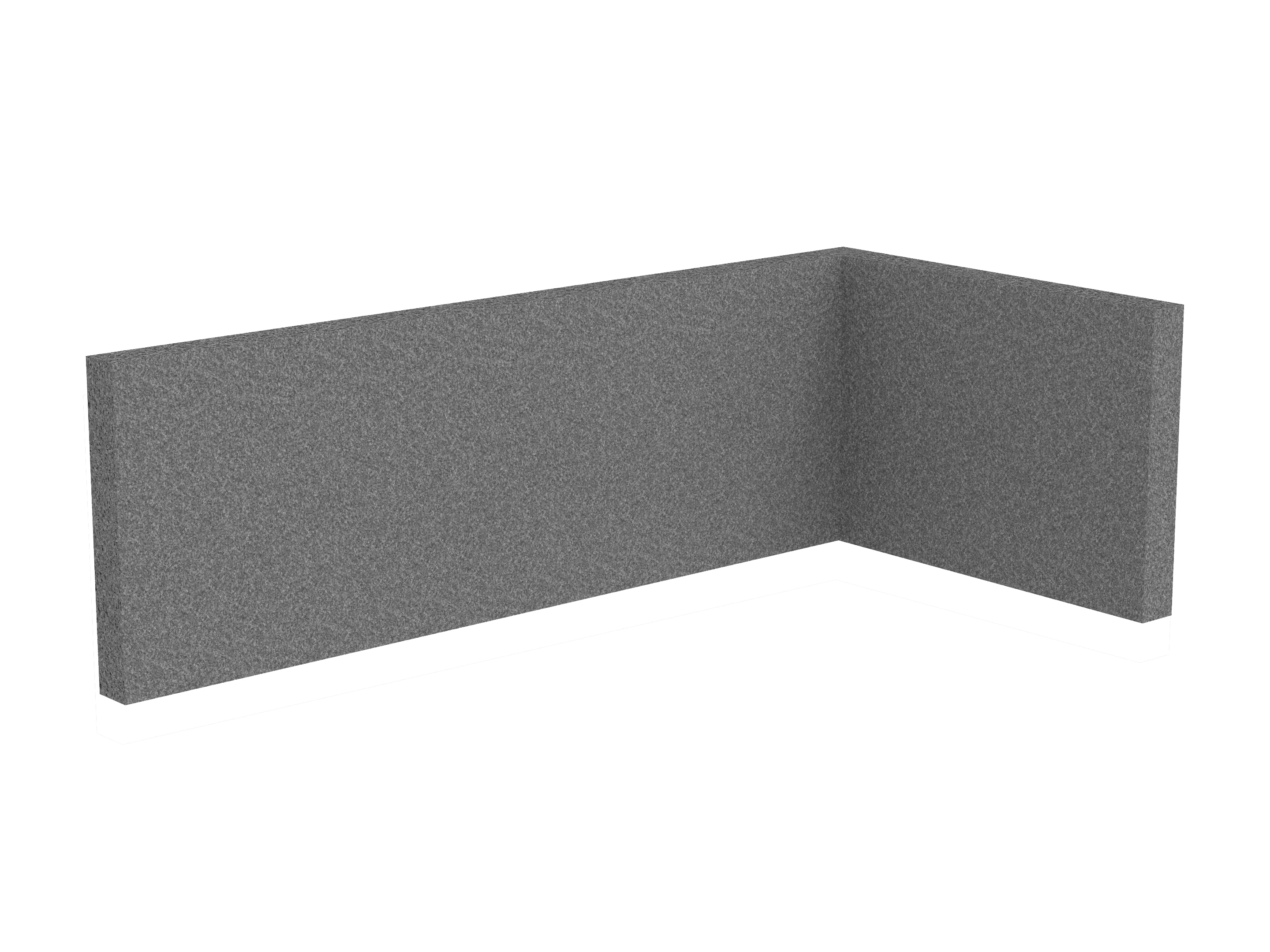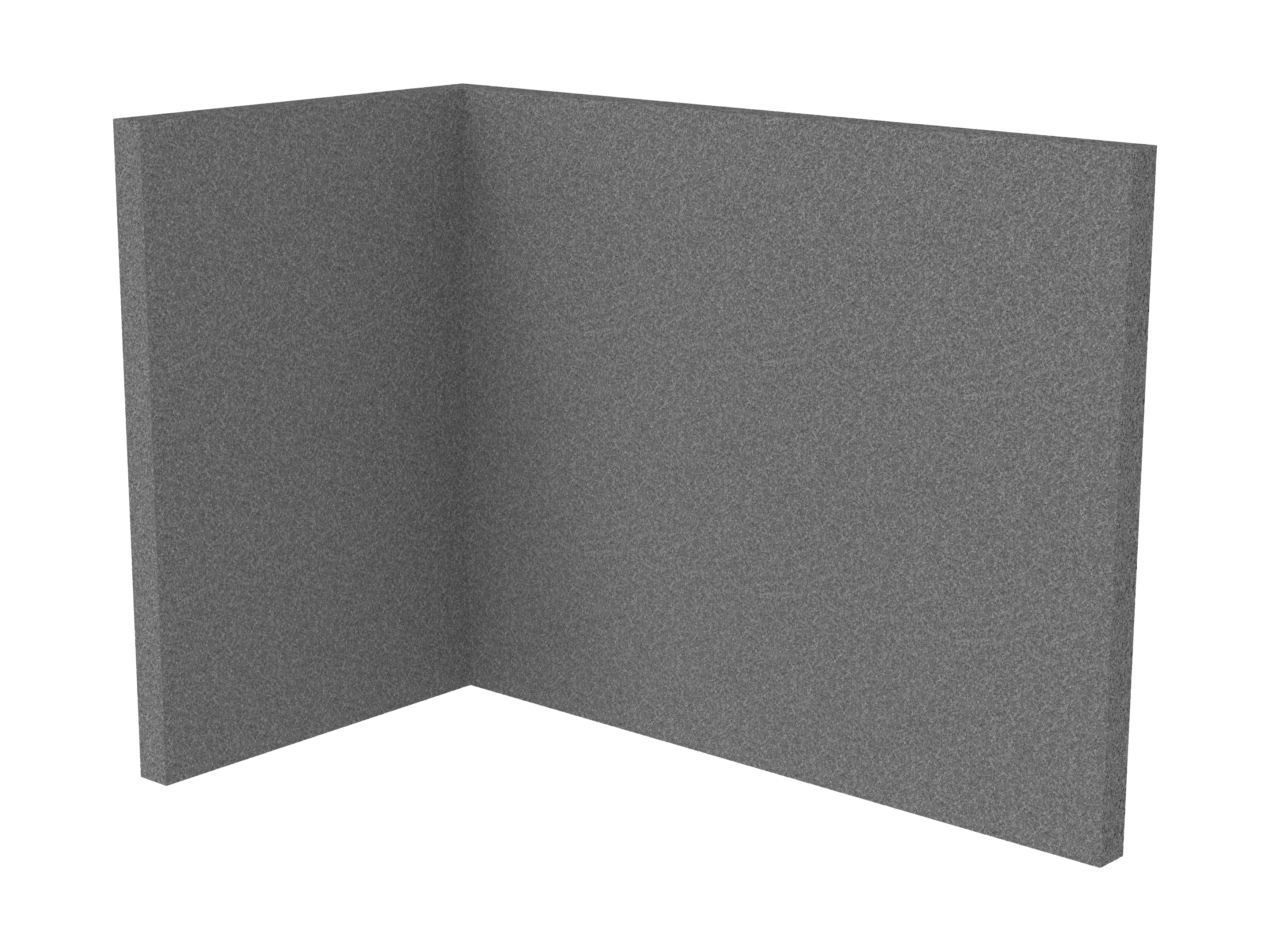 Bestaande uit 1 staand frontpaneel en 1 staand zijpaneel aan de rechterzijde. Panelen zijn opgebouwd uit een 40mm berken multiplex frame, gevuld met gerecycled katoen, absorbtieklasse A/NRC waarde 0,95. Gegeven maatvoering zijn de bureaumaten