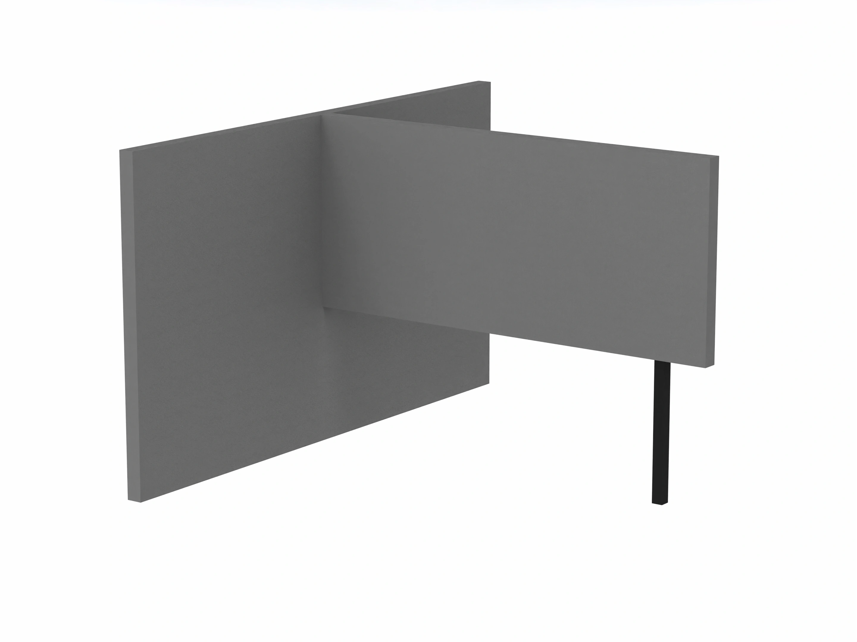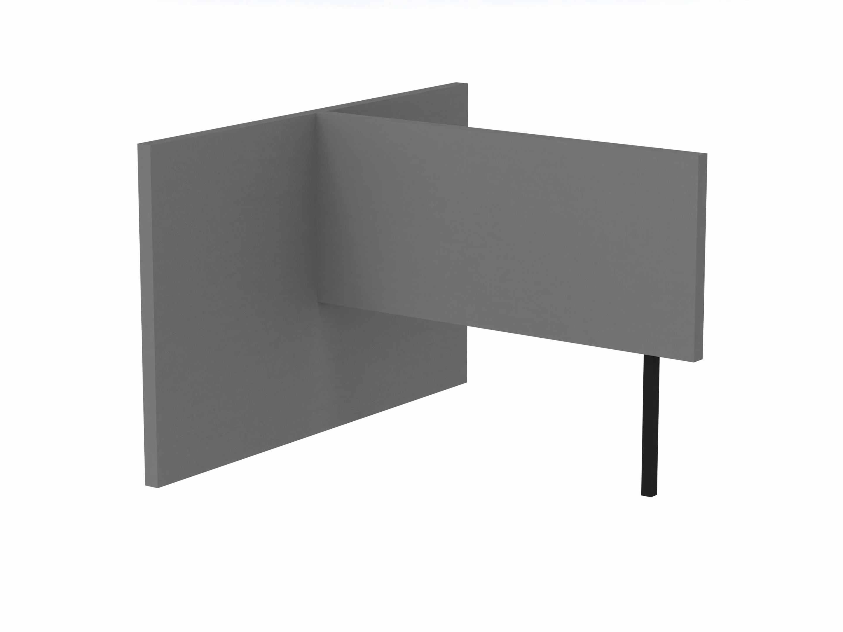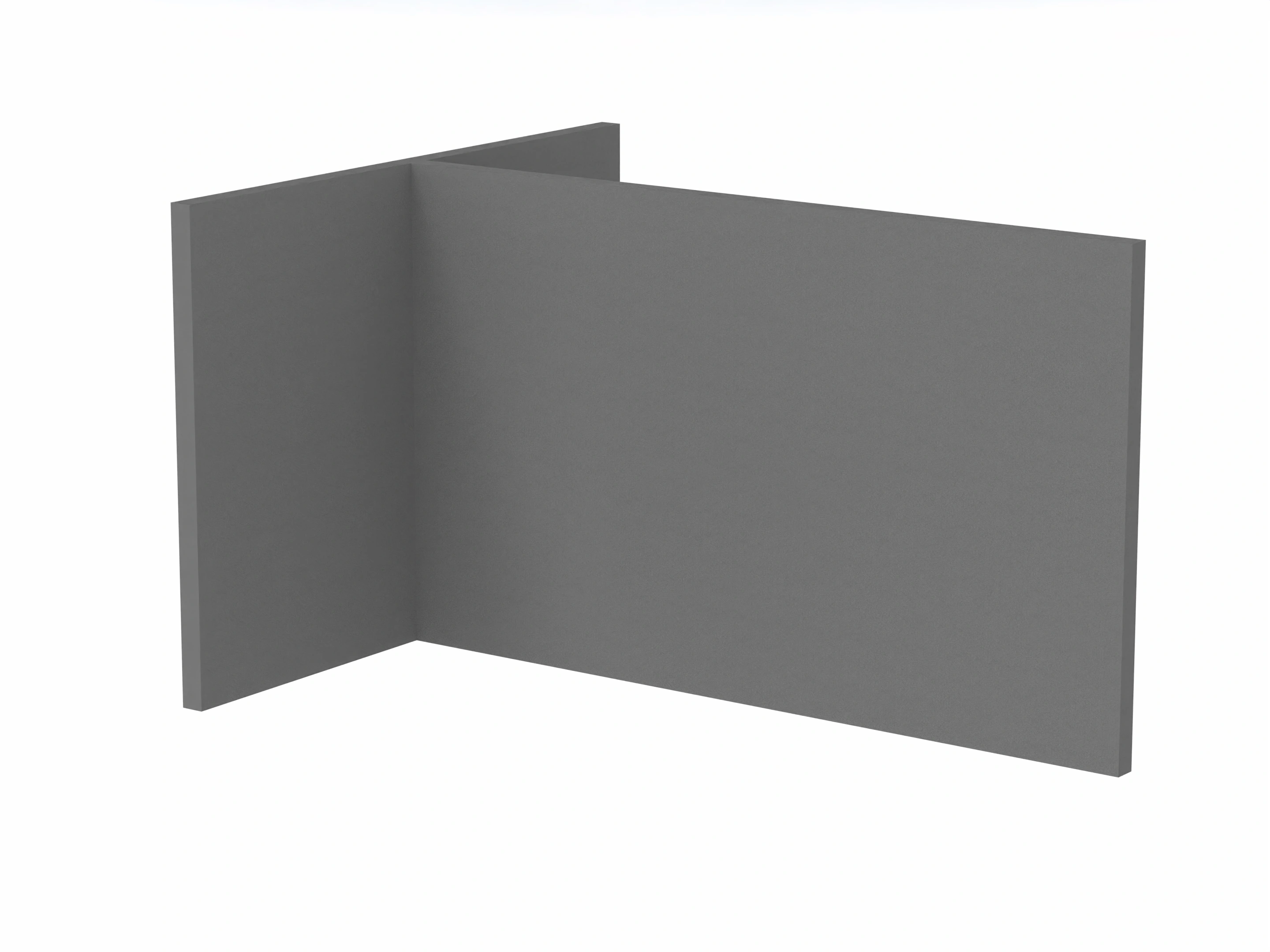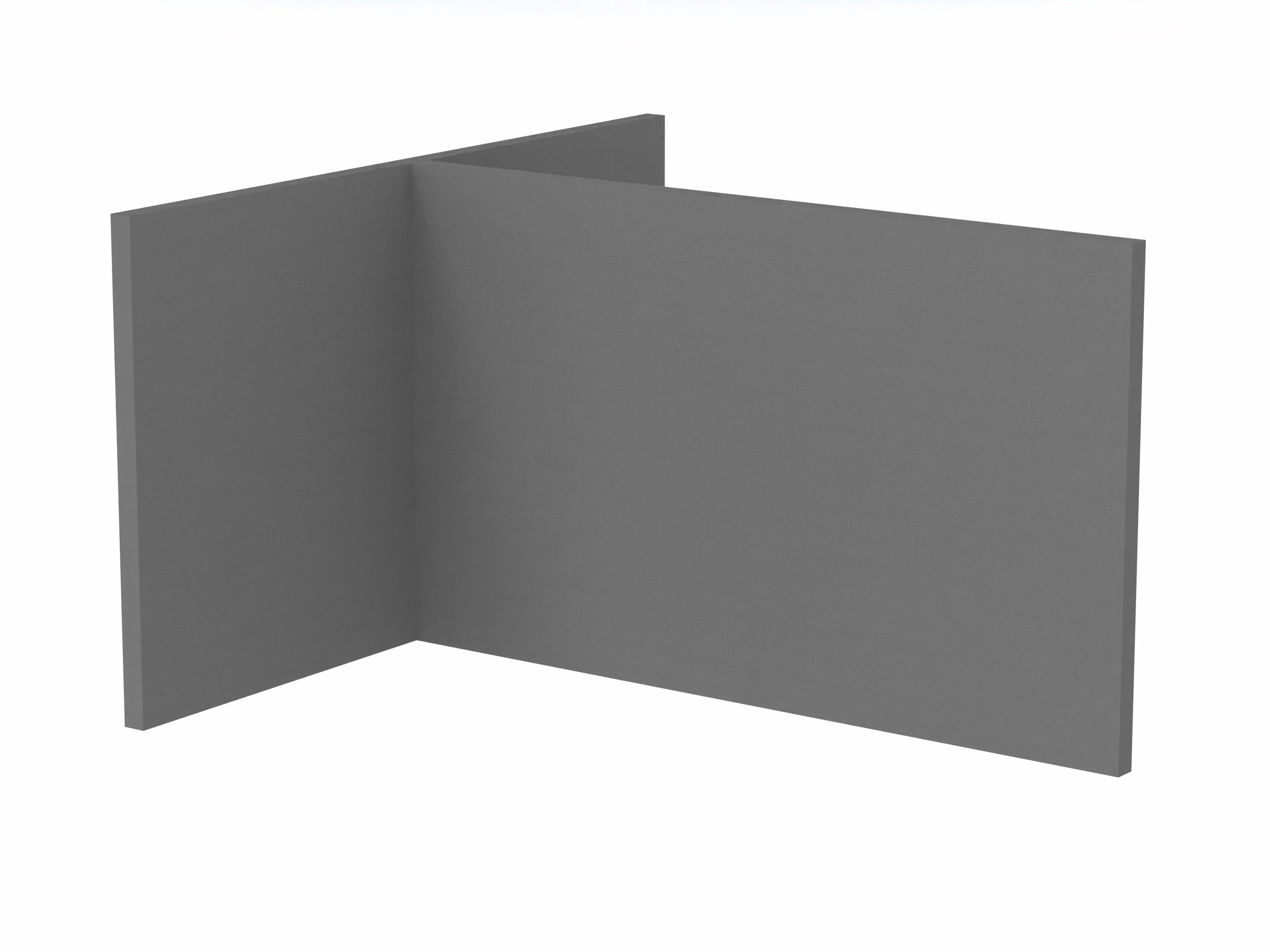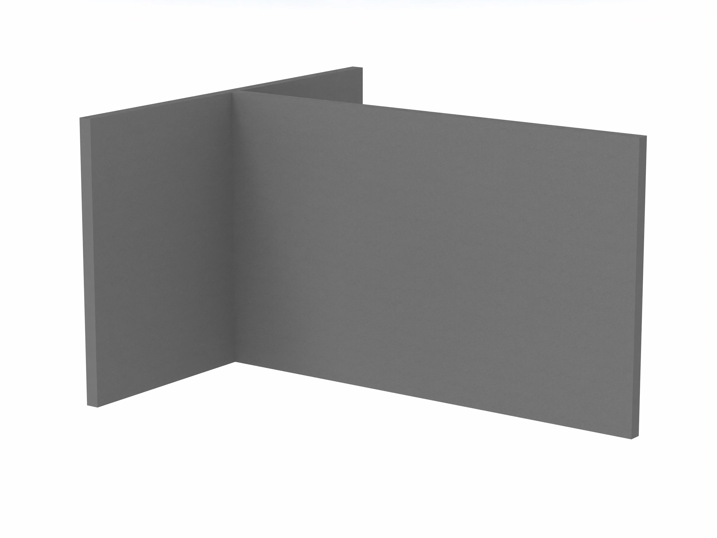 Bestaande uit 1 staand frontpaneel en 1 staand zijpaneel. Panelen zijn opgebouwd uit een 40mm berken multiplex frame, gevuld met gerecycled katoen, absorbtieklasse A/NRC waarde 0,95. Gegeven maatvoering zijn bureaumaten