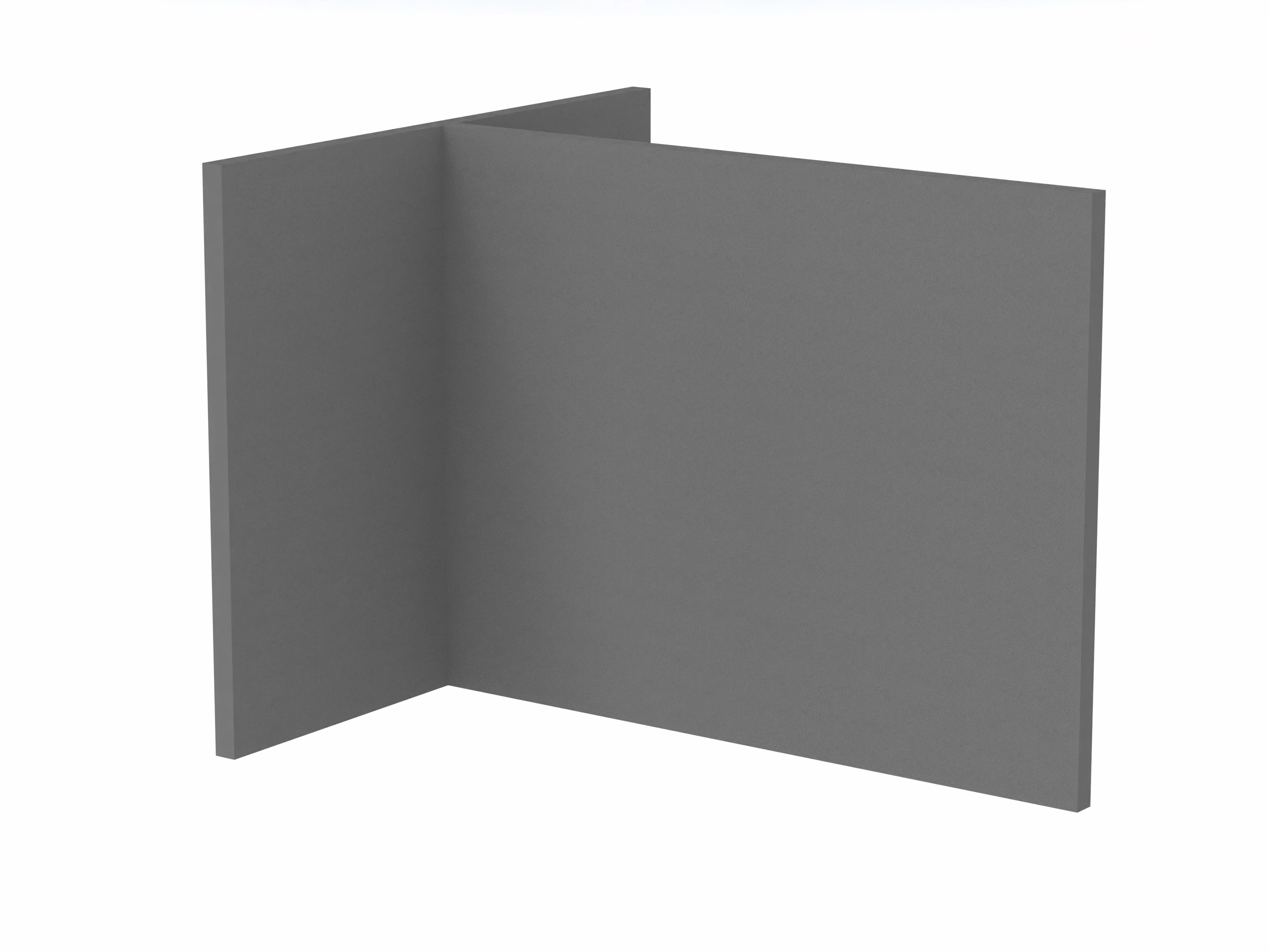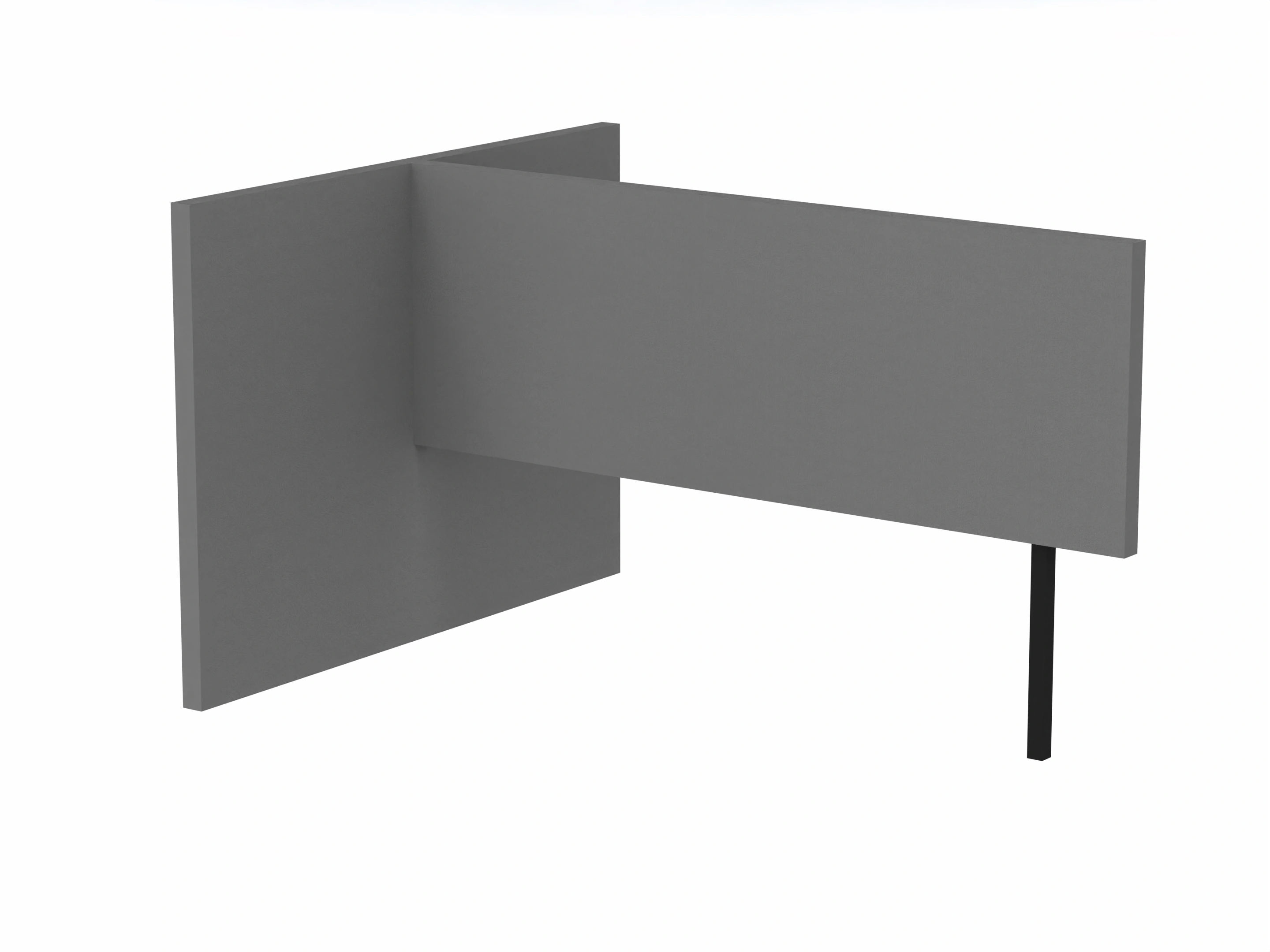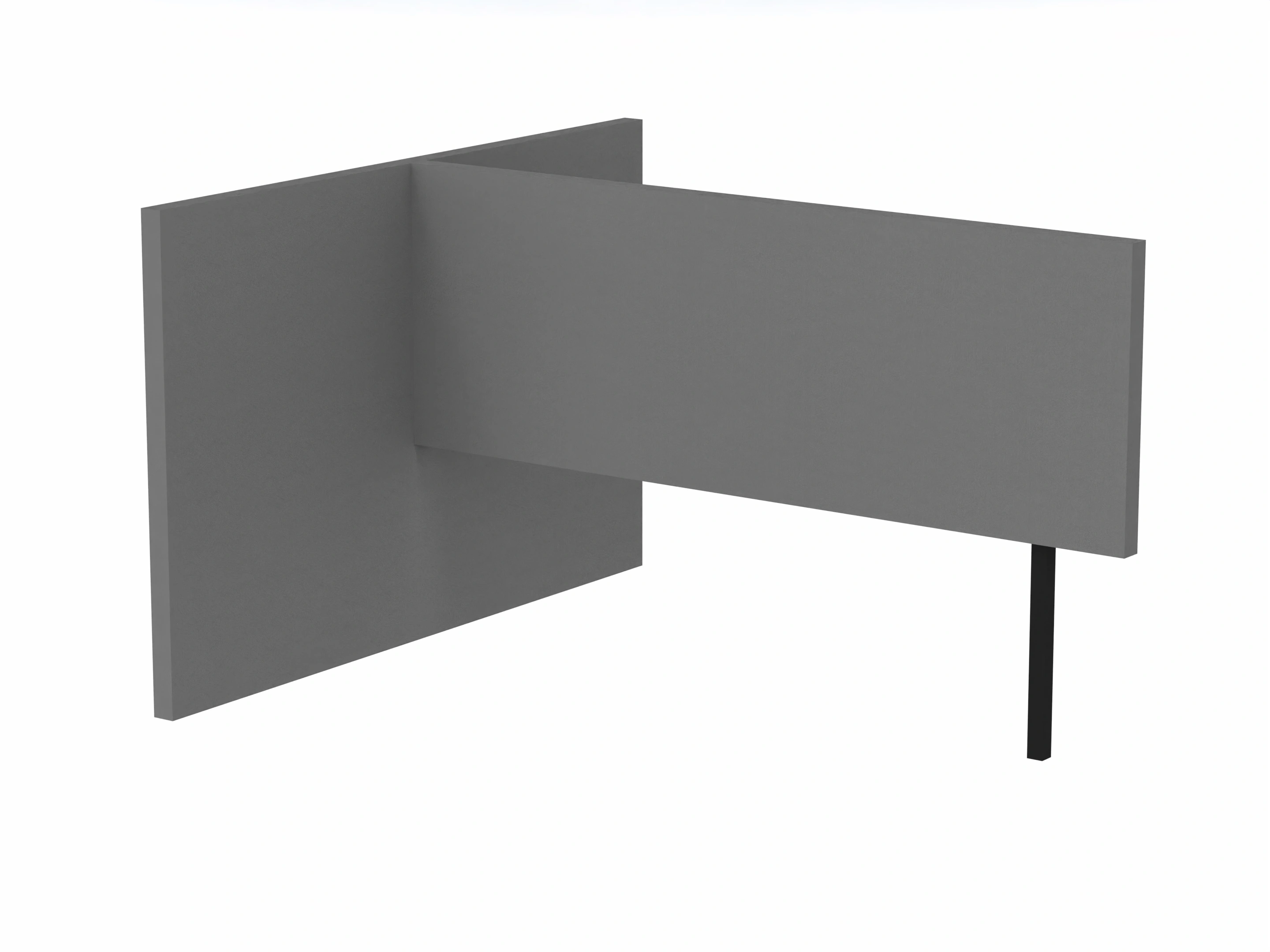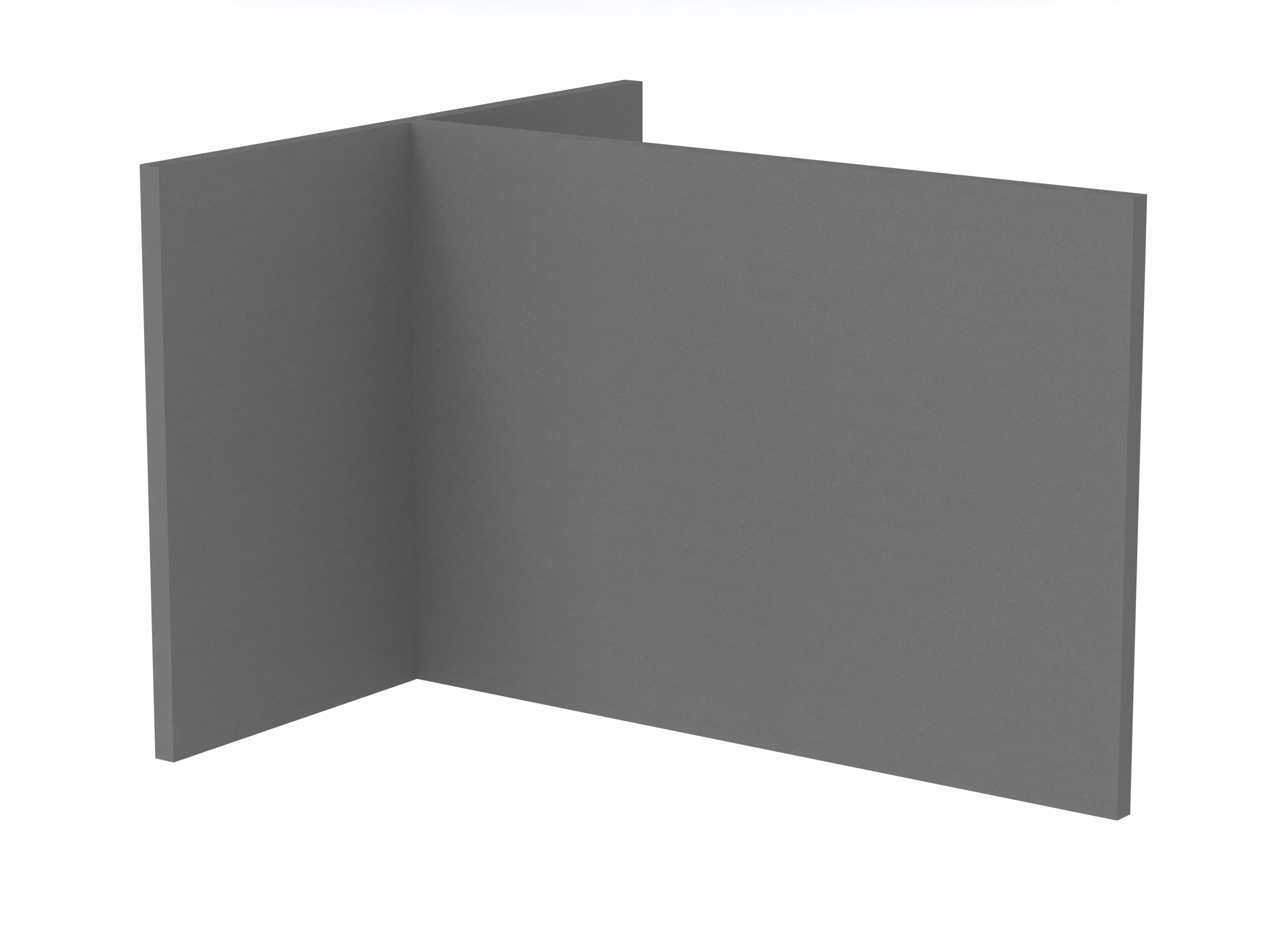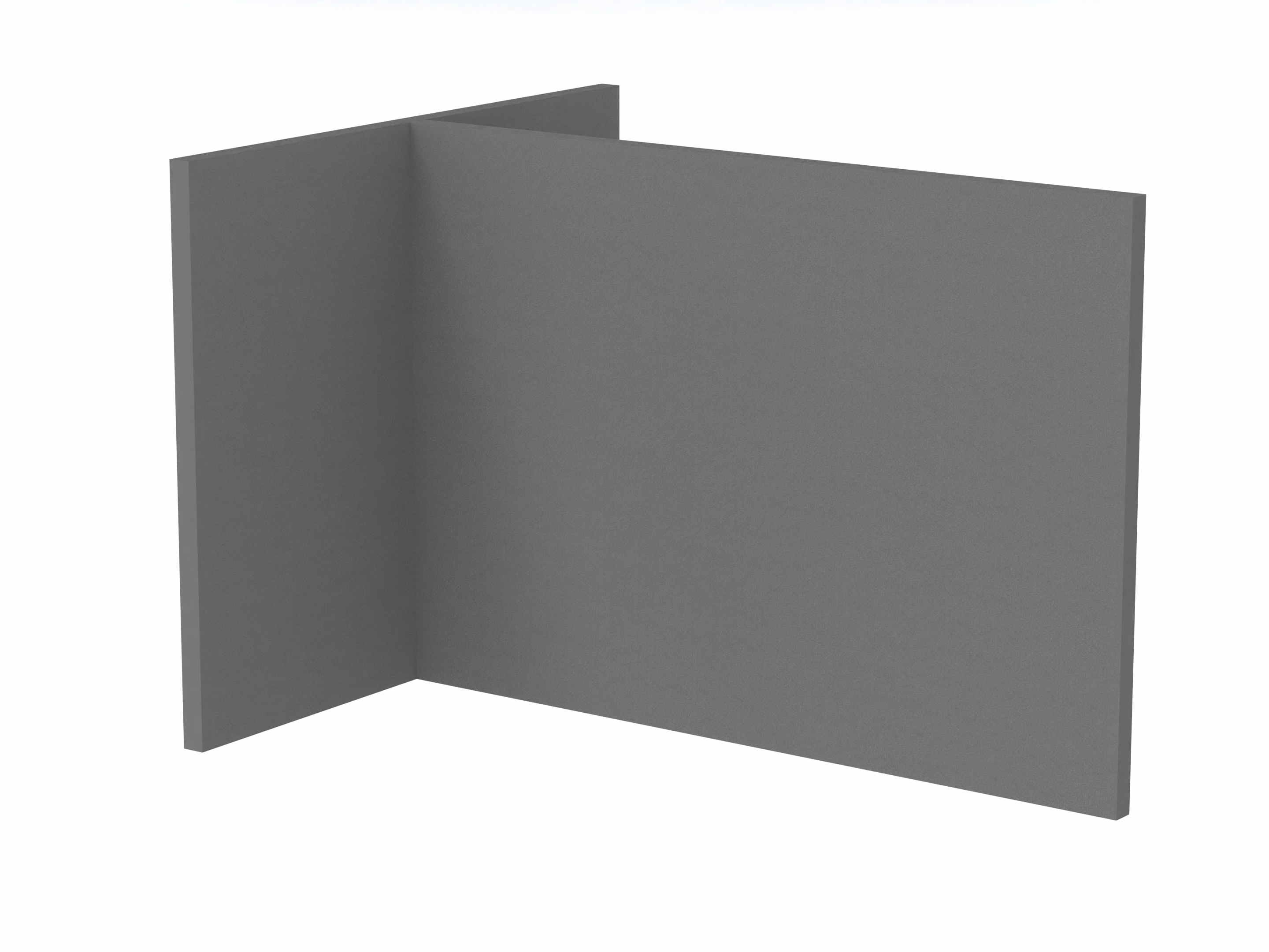 Bestaande uit 1 staand frontpaneel en 1 staand zijpaneel. Panelen zijn opgebouwd uit een 40mm berken multiplex frame, gevuld met gerecycled katoen, absorbtieklasse A/NRC waarde 0,95. Gegeven maatvoering zijn bureaumaten