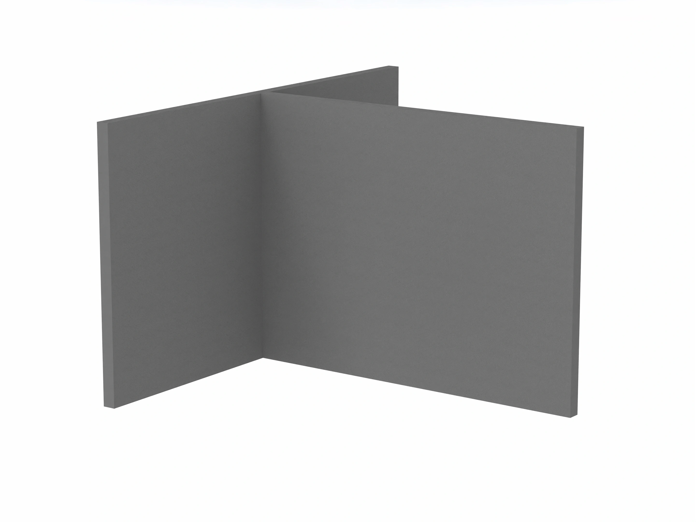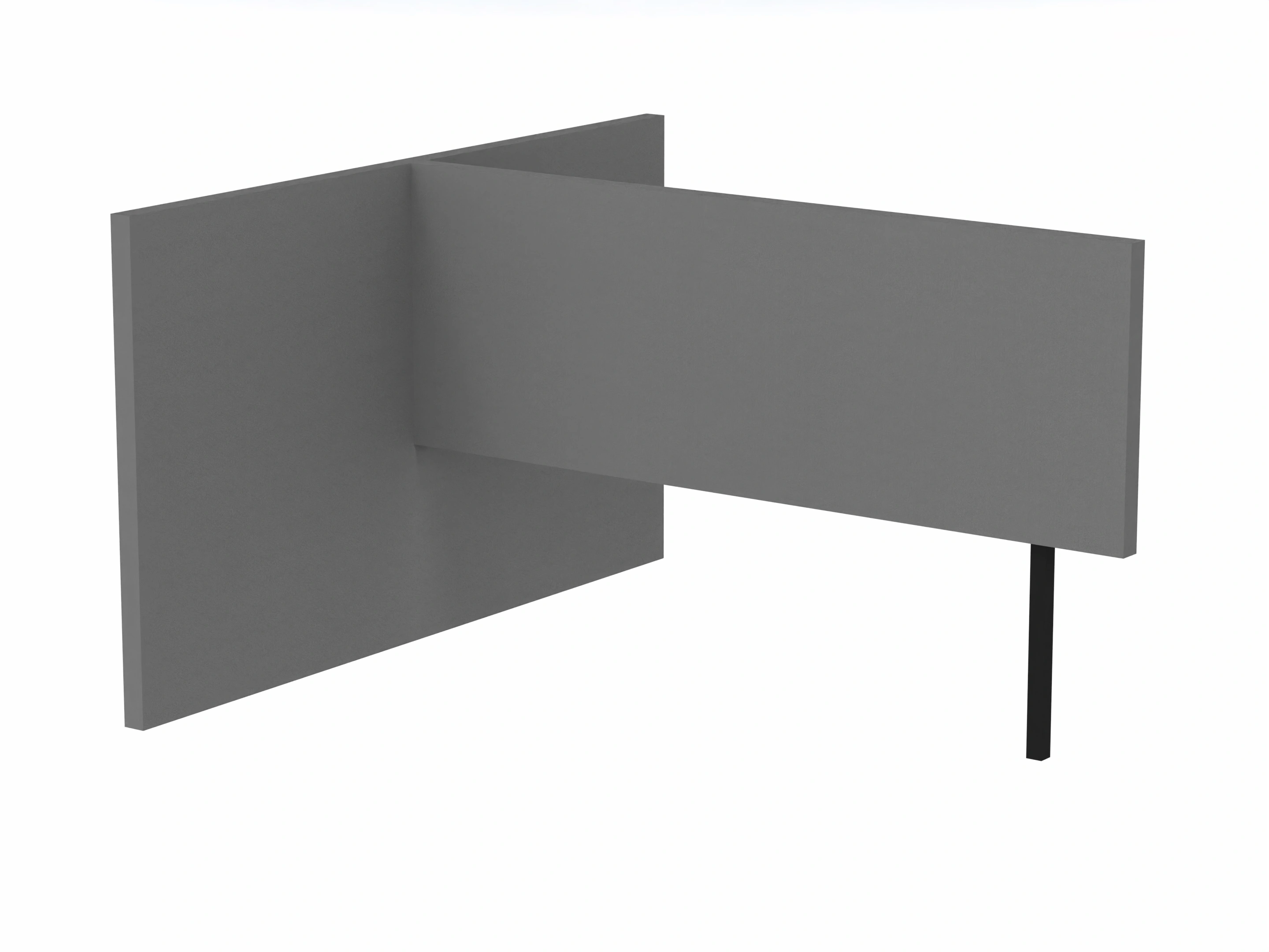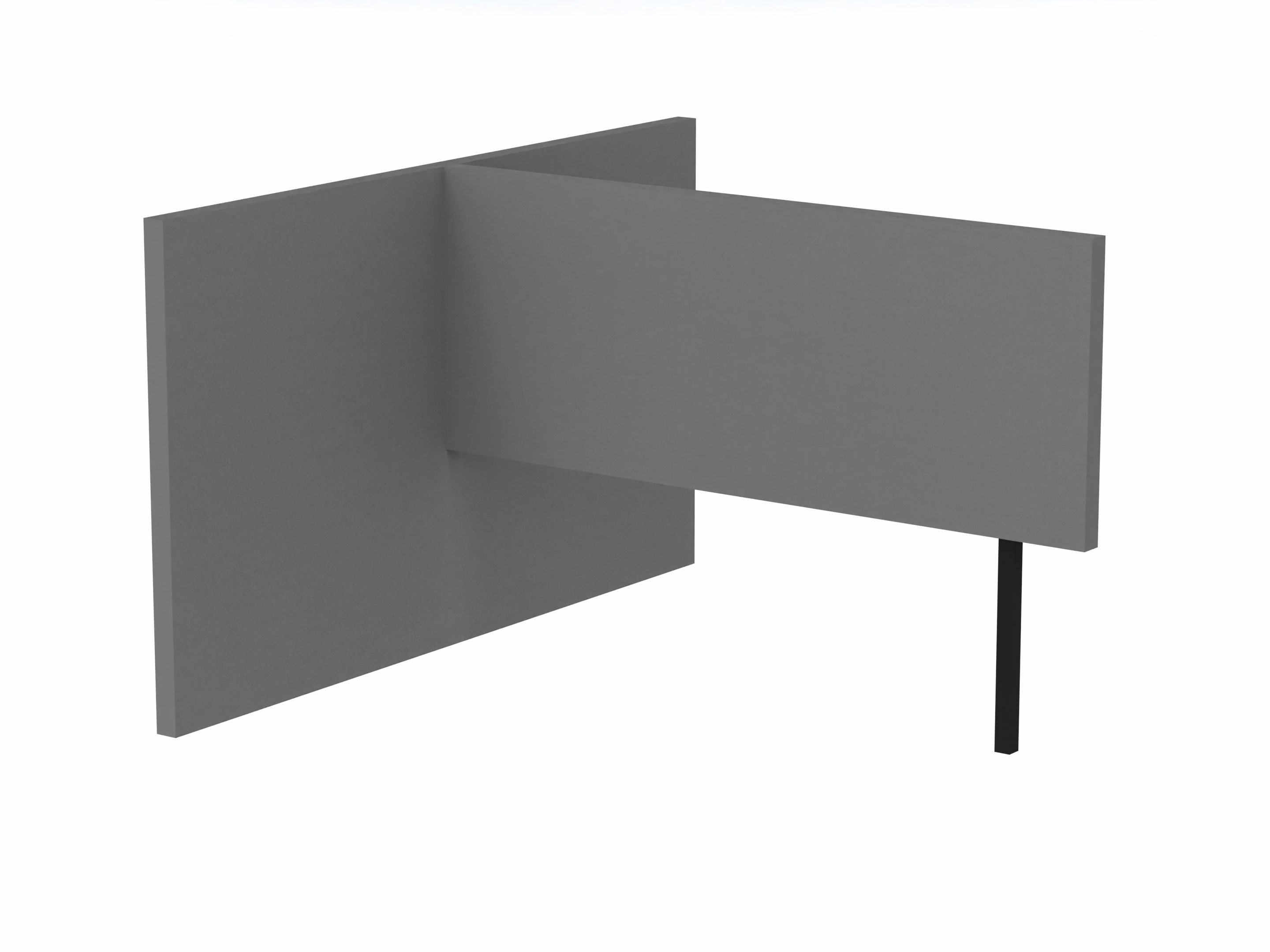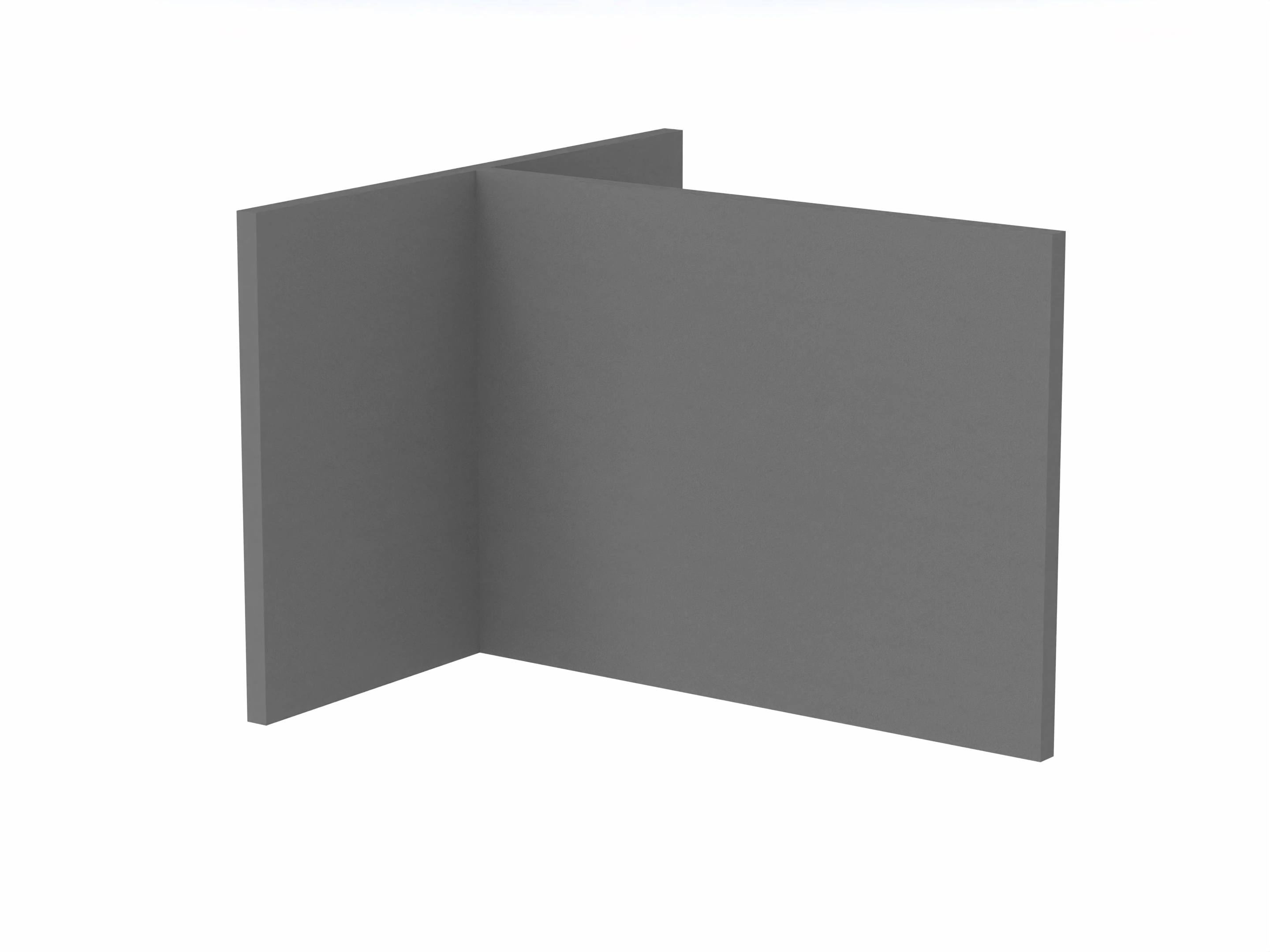 Bestaande uit 1 staand frontpaneel en 1 staand zijpaneel. Panelen zijn opgebouwd uit een 40mm berken multiplex frame, gevuld met gerecycled katoen, absorbtieklasse A/NRC waarde 0,95. Gegeven maatvoering zijn bureaumaten