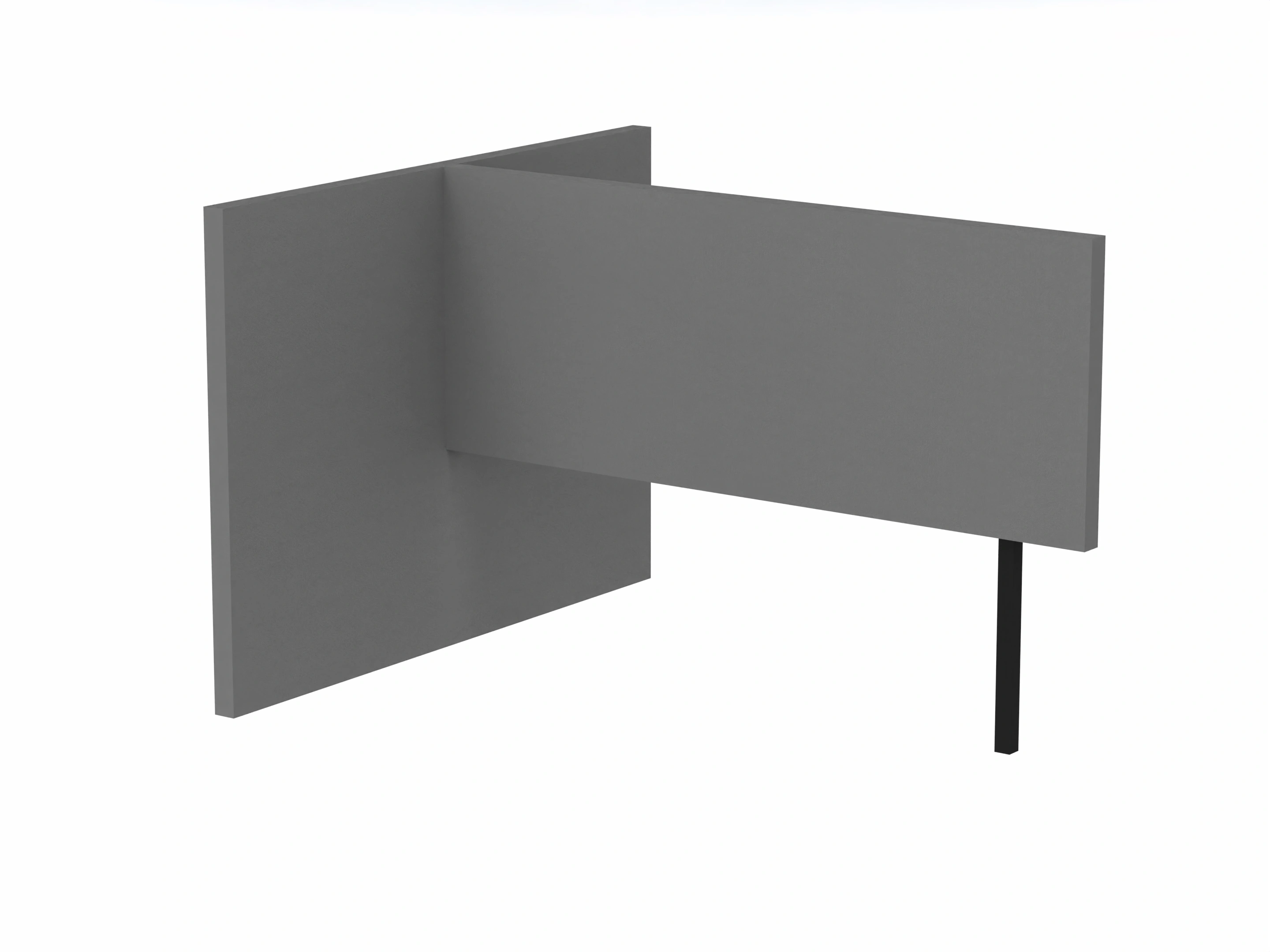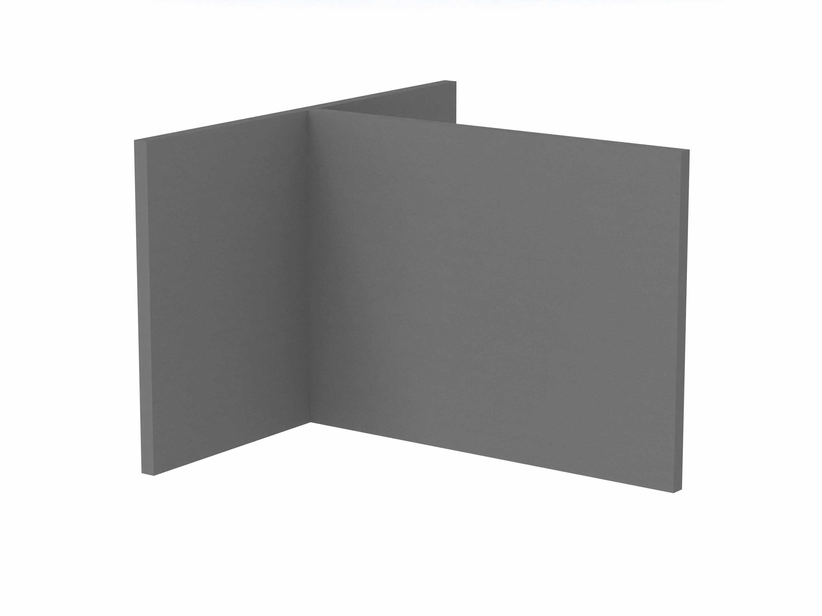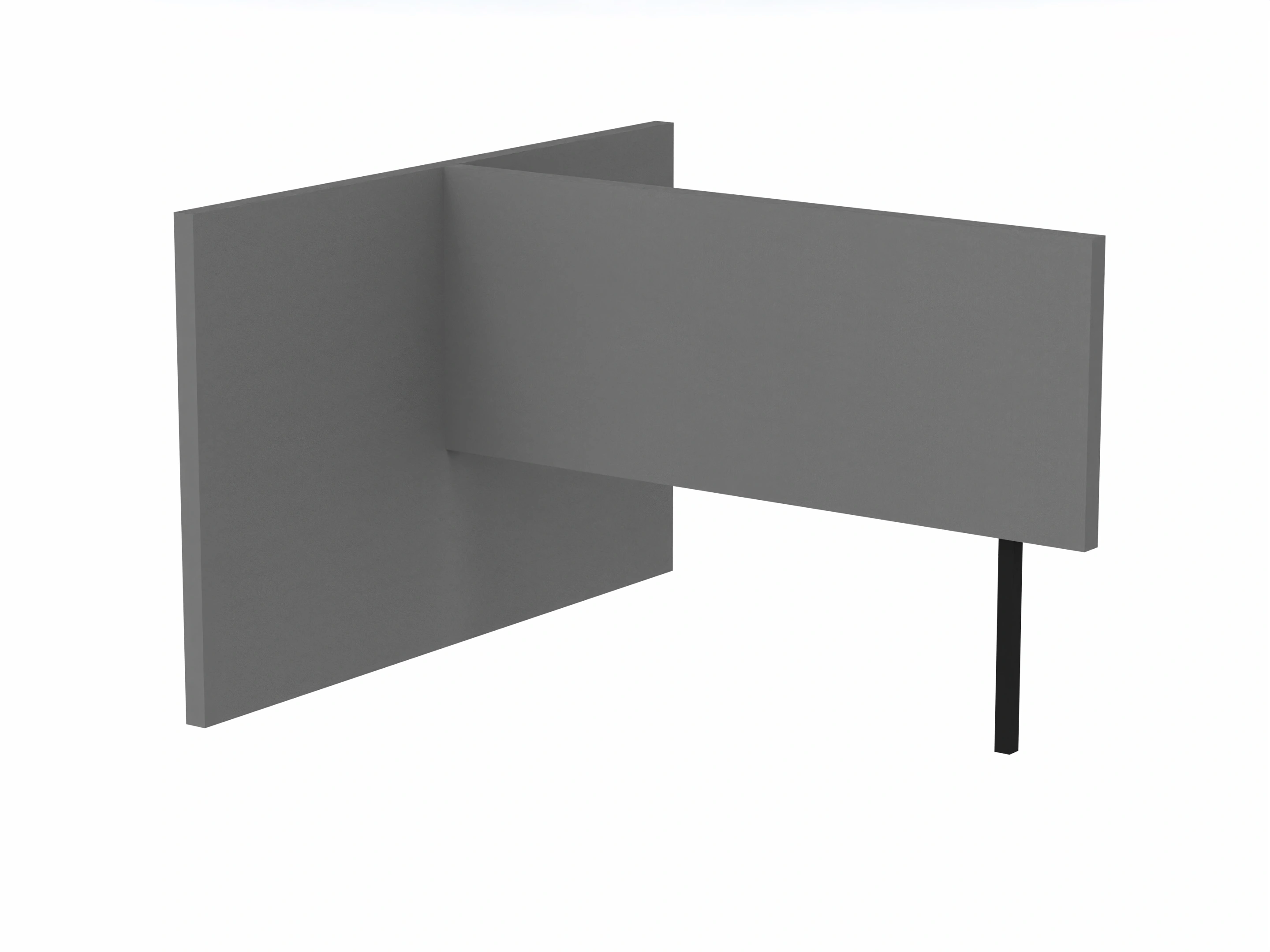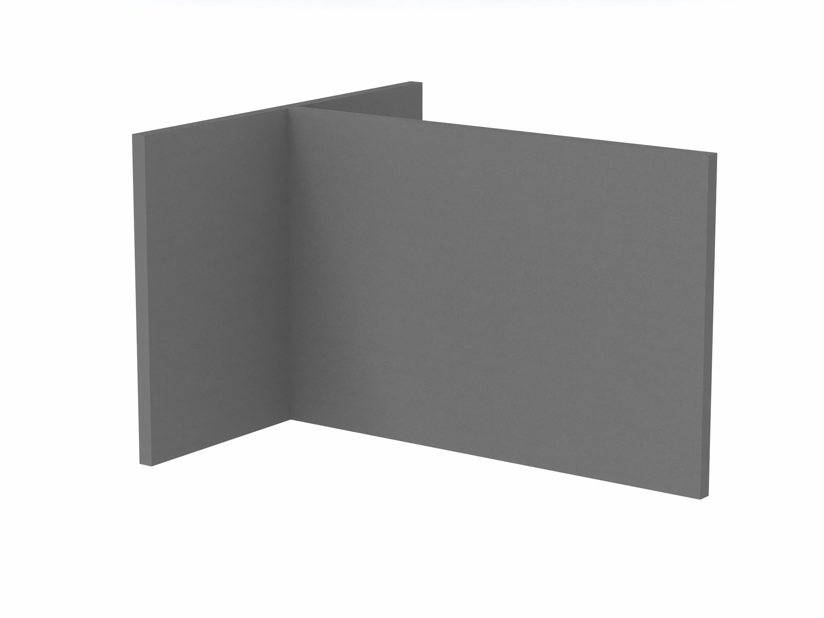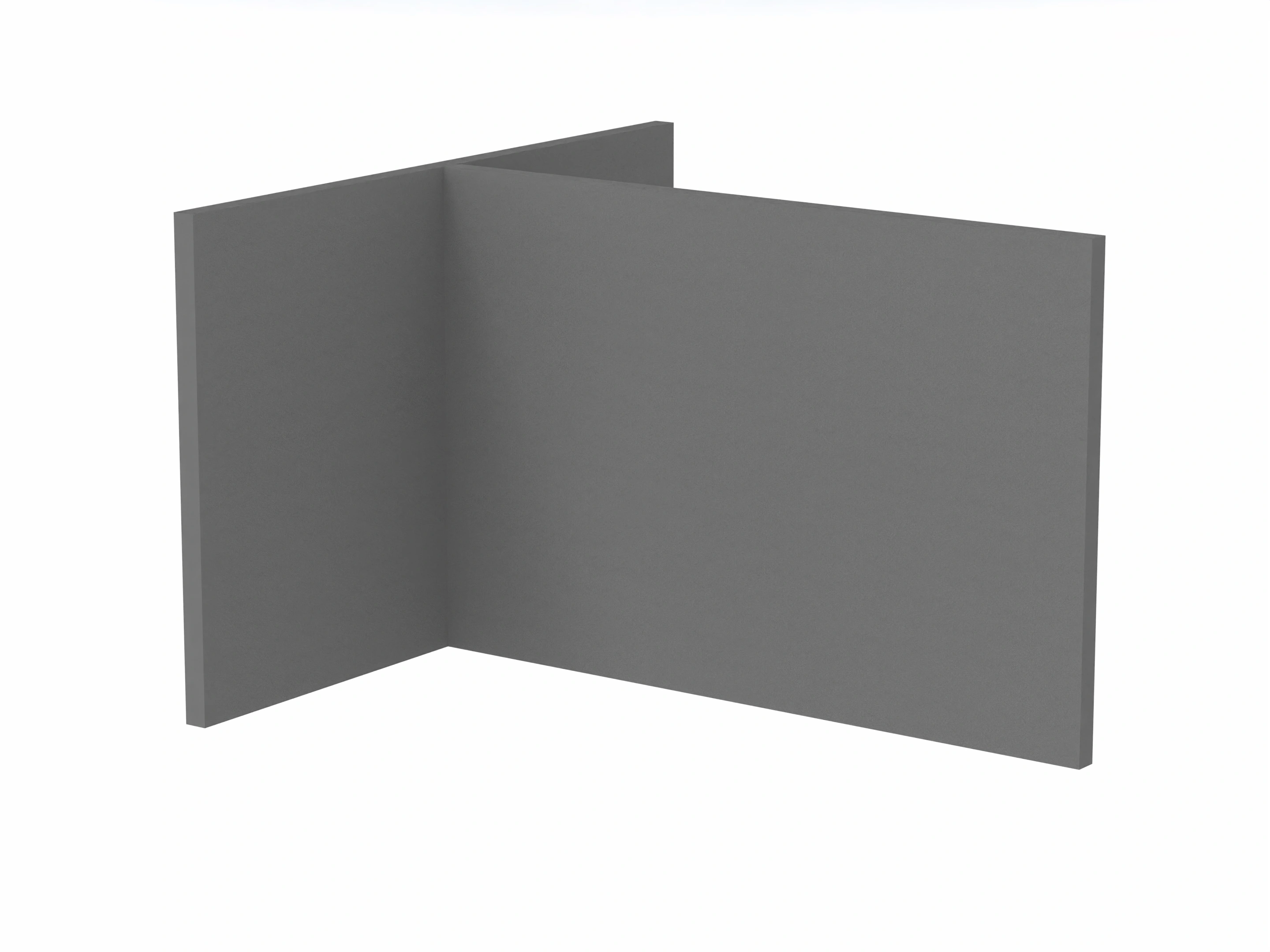 Bestaande uit 1 staand frontpaneel en 1 staand zijpaneel. Panelen zijn opgebouwd uit een 40mm berken multiplex frame, gevuld met gerecycled katoen, absorbtieklasse A/NRC waarde 0,95. Gegeven maatvoering zijn bureaumaten