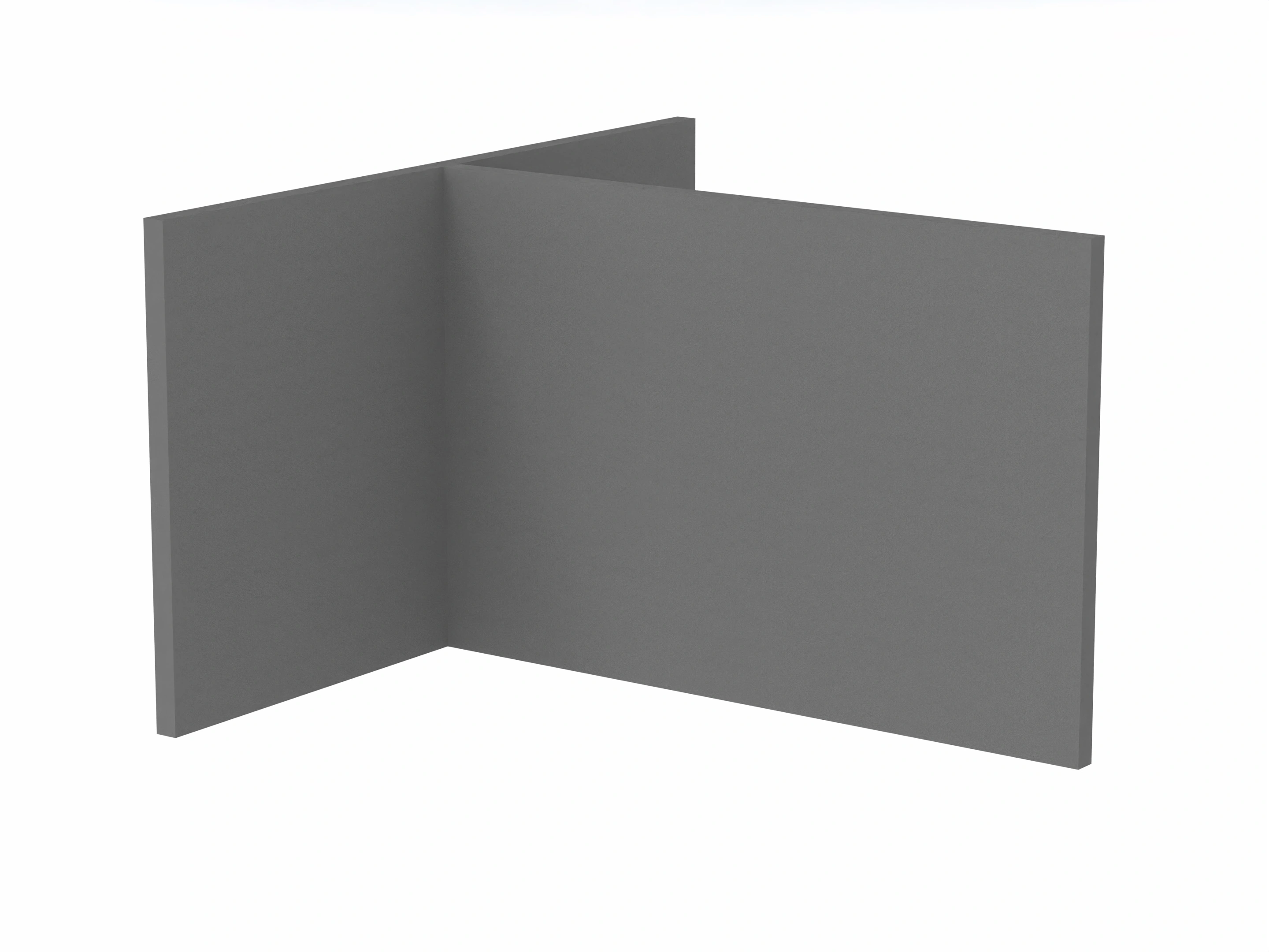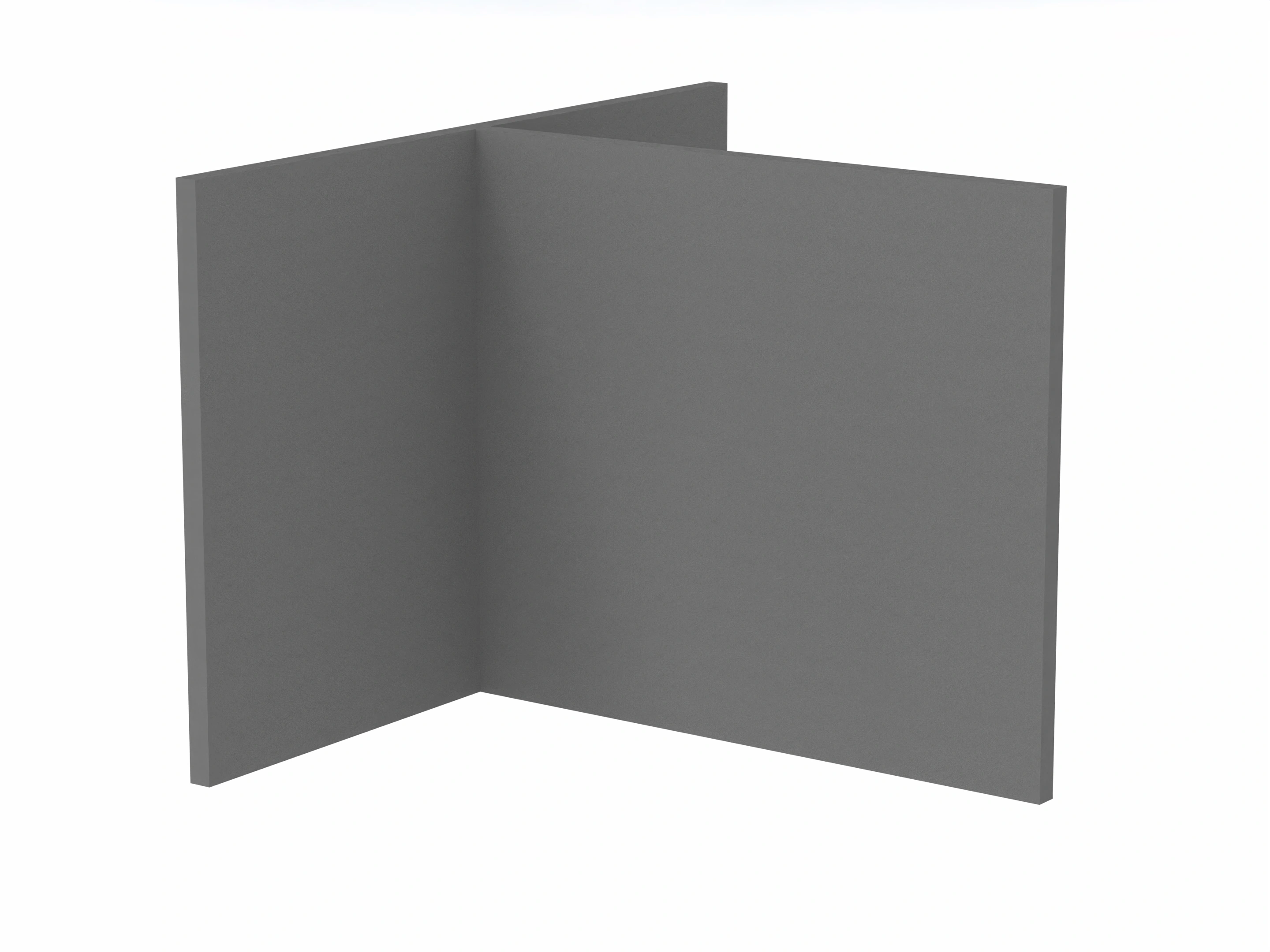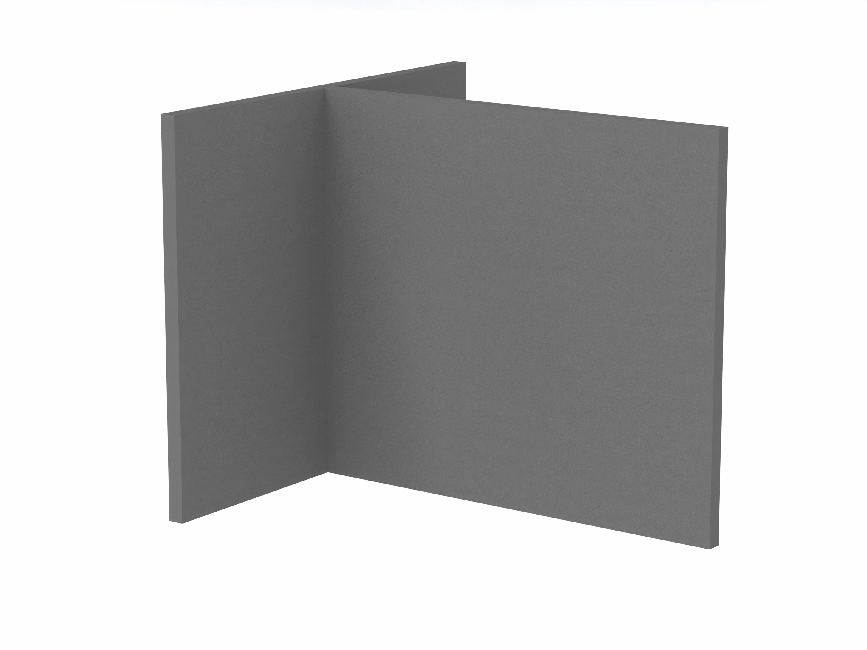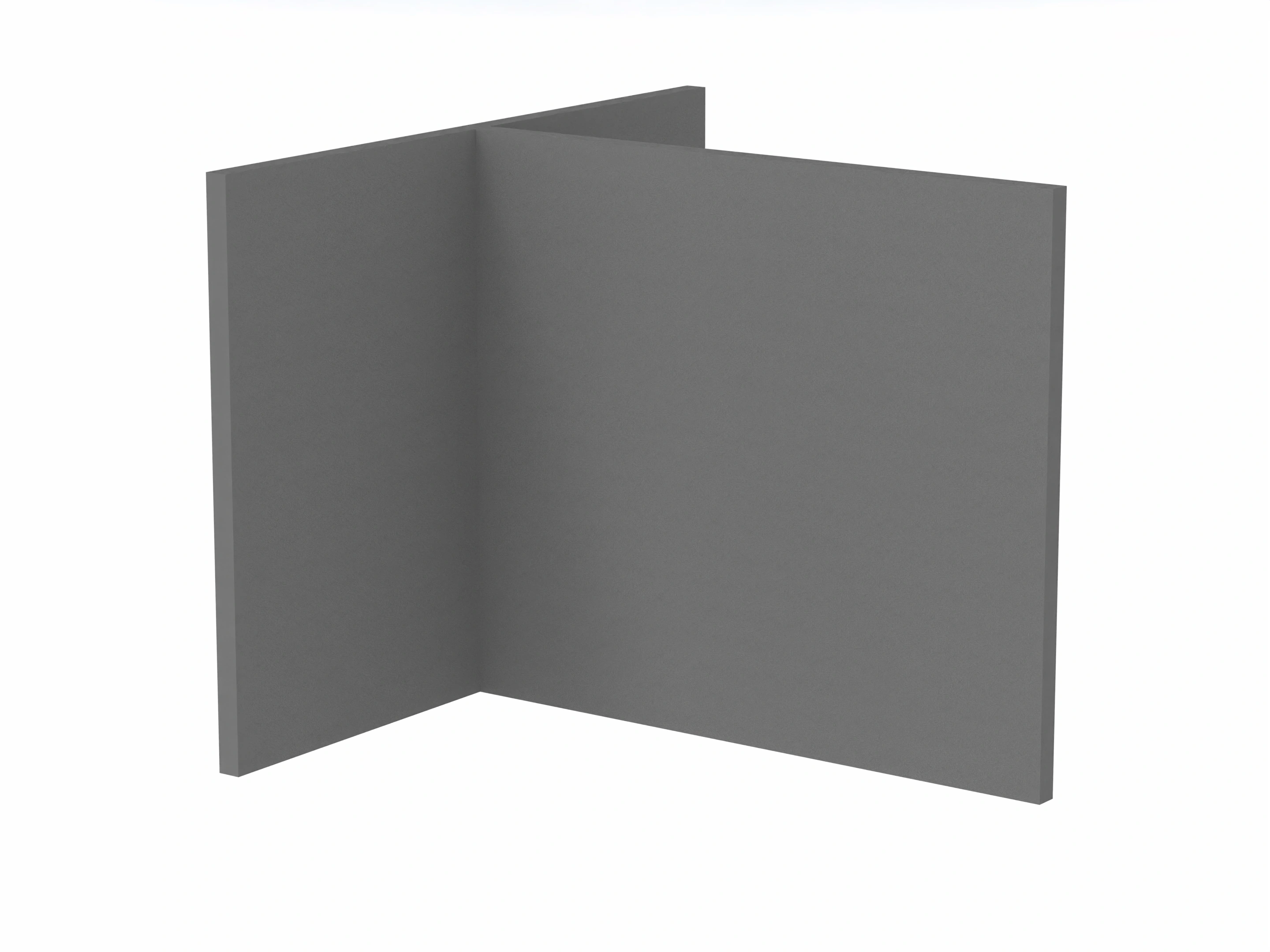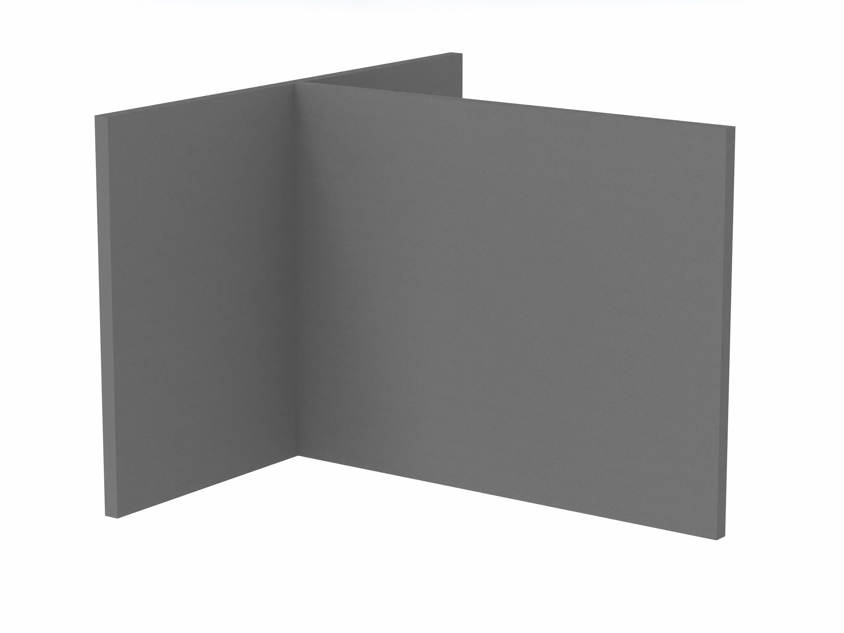 Bestaande uit 1 staand frontpaneel en 1 staand zijpaneel. Panelen zijn opgebouwd uit een 40mm berken multiplex frame, gevuld met gerecycled katoen, absorbtieklasse A/NRC waarde 0,95. Gegeven maatvoering zijn bureaumaten