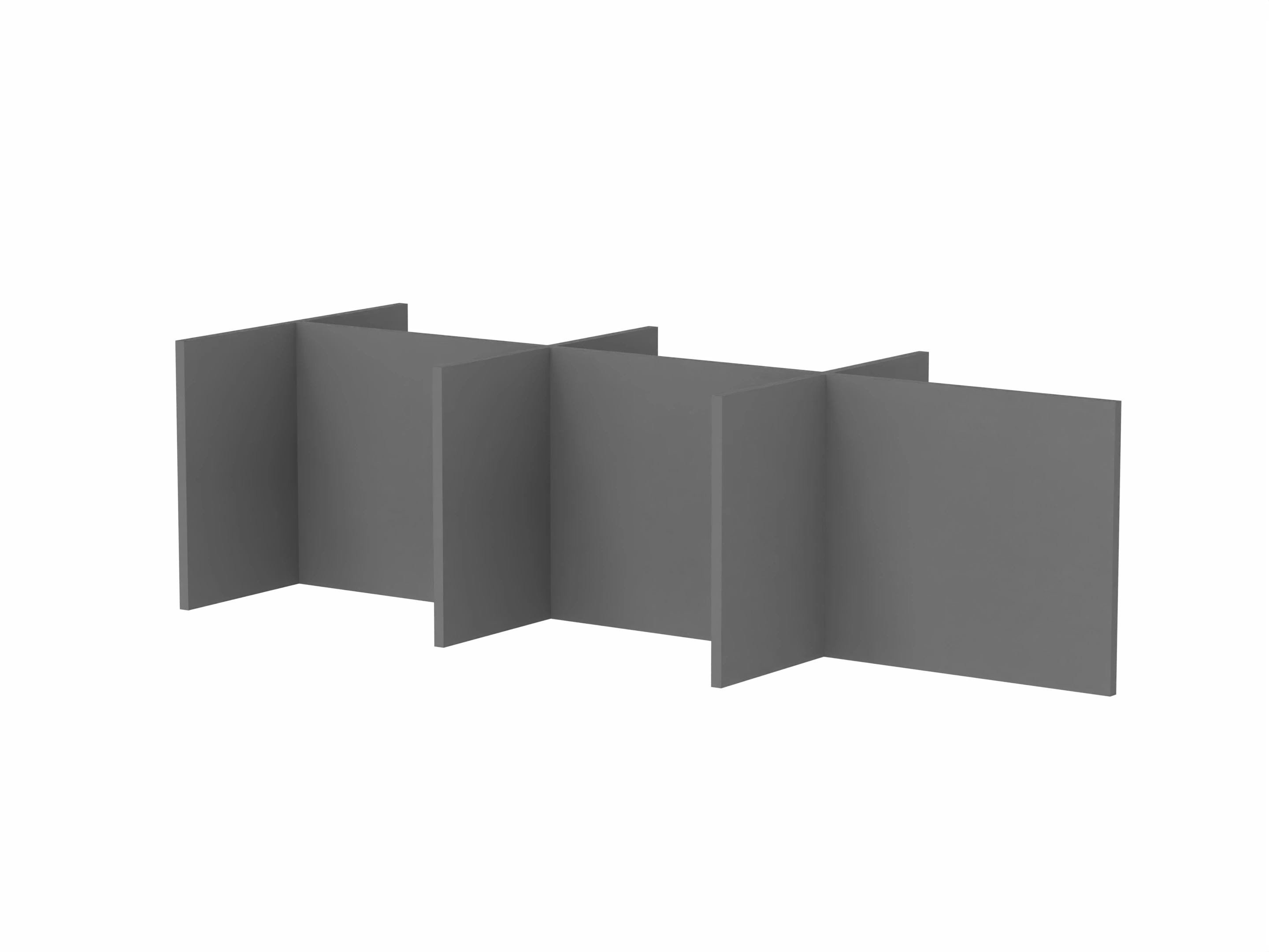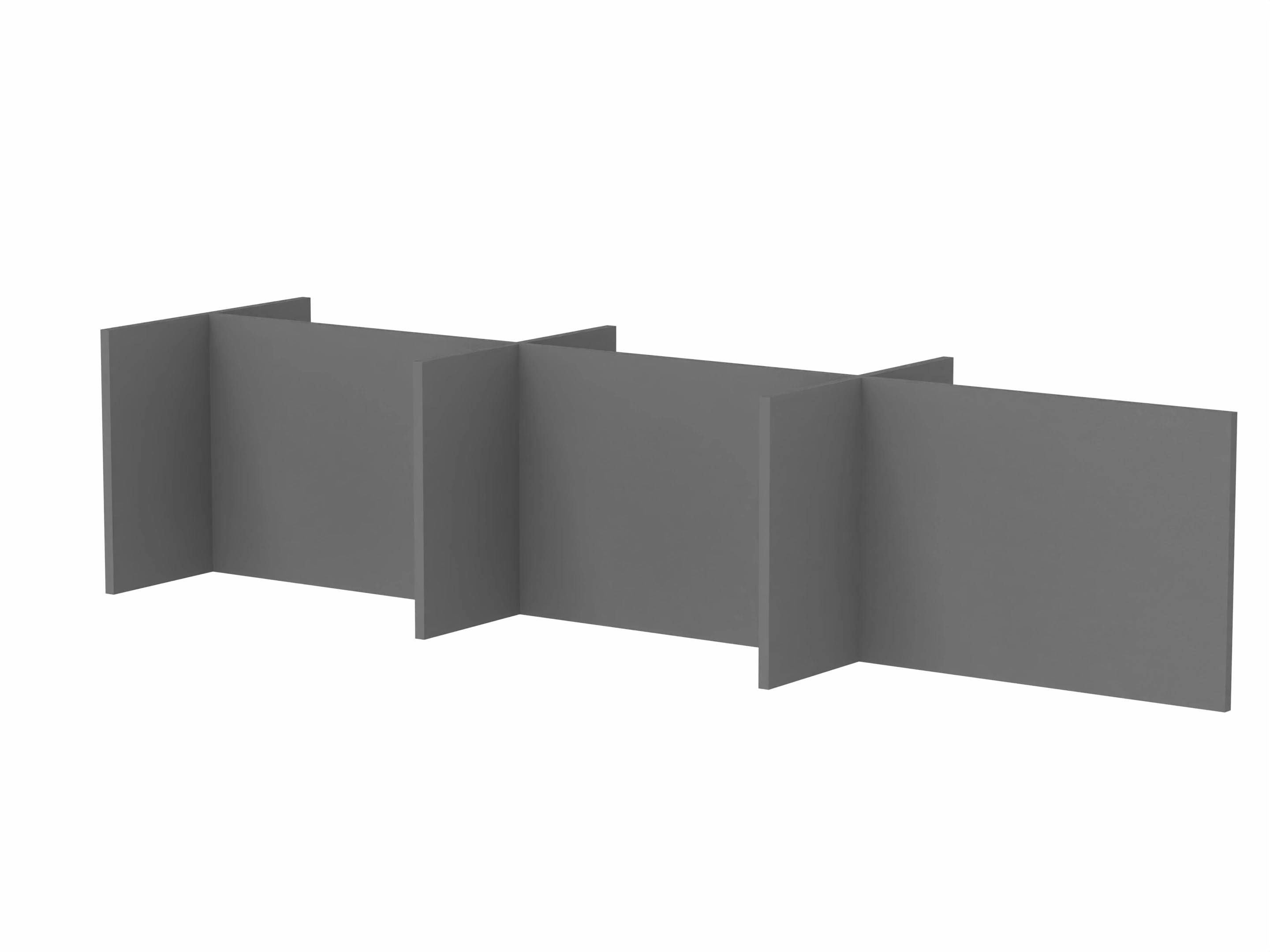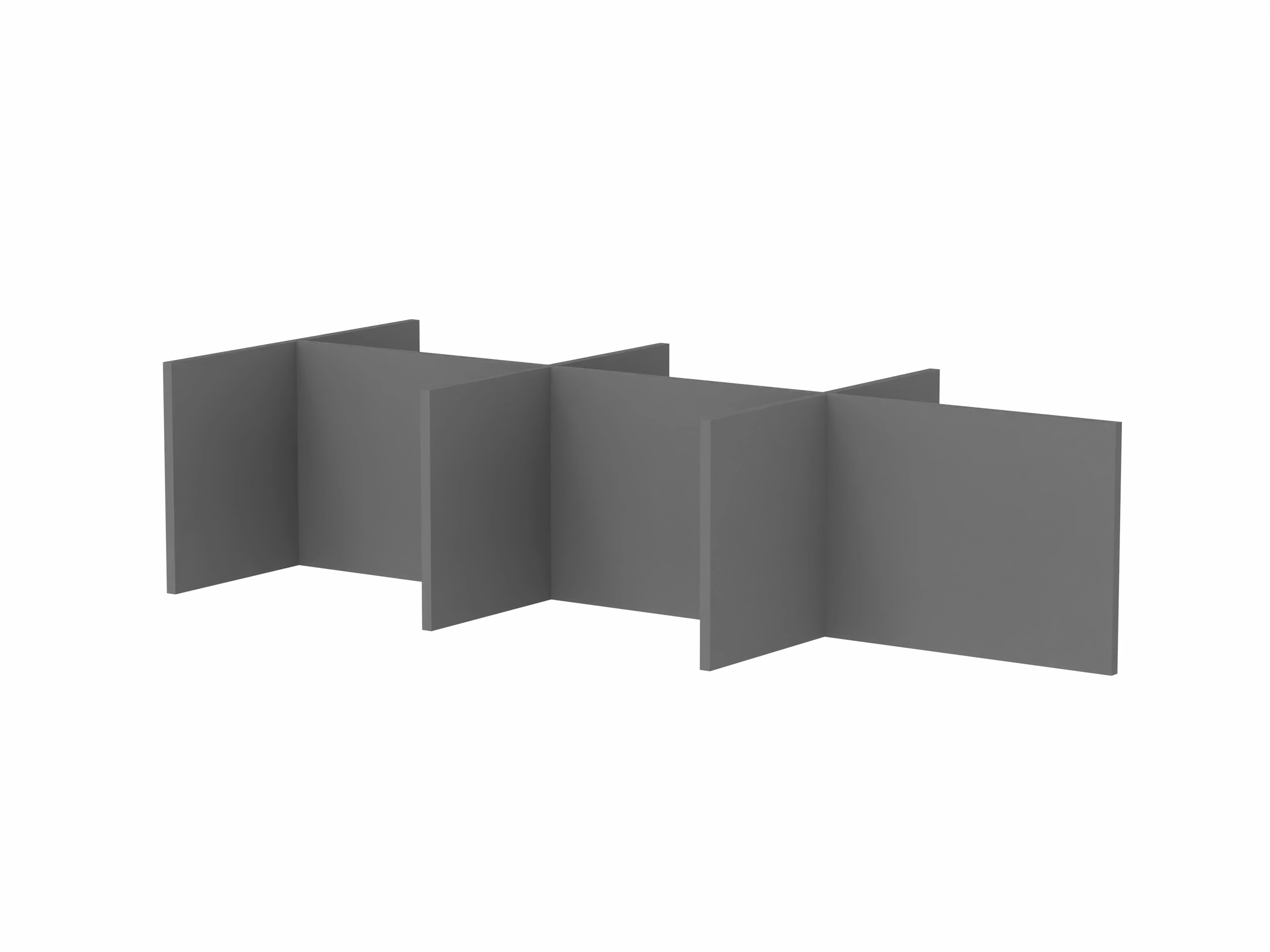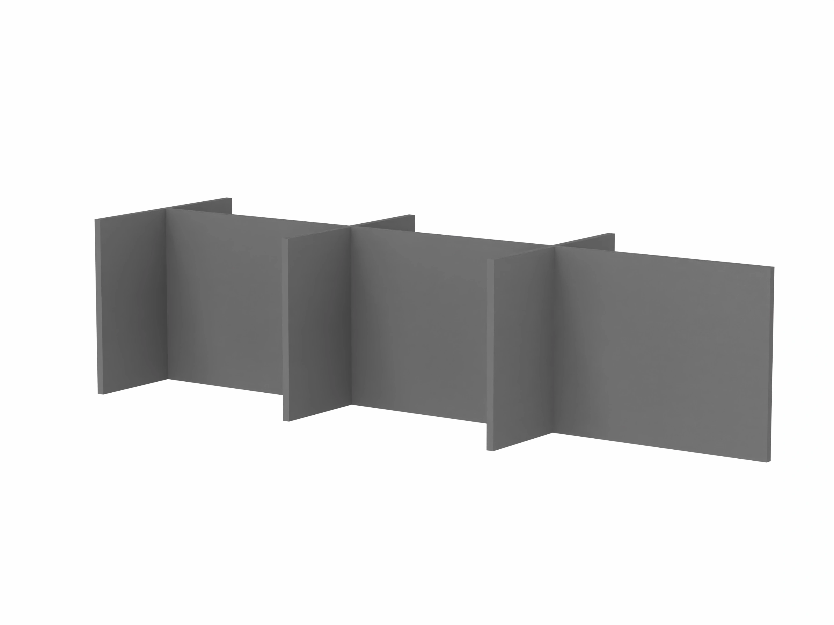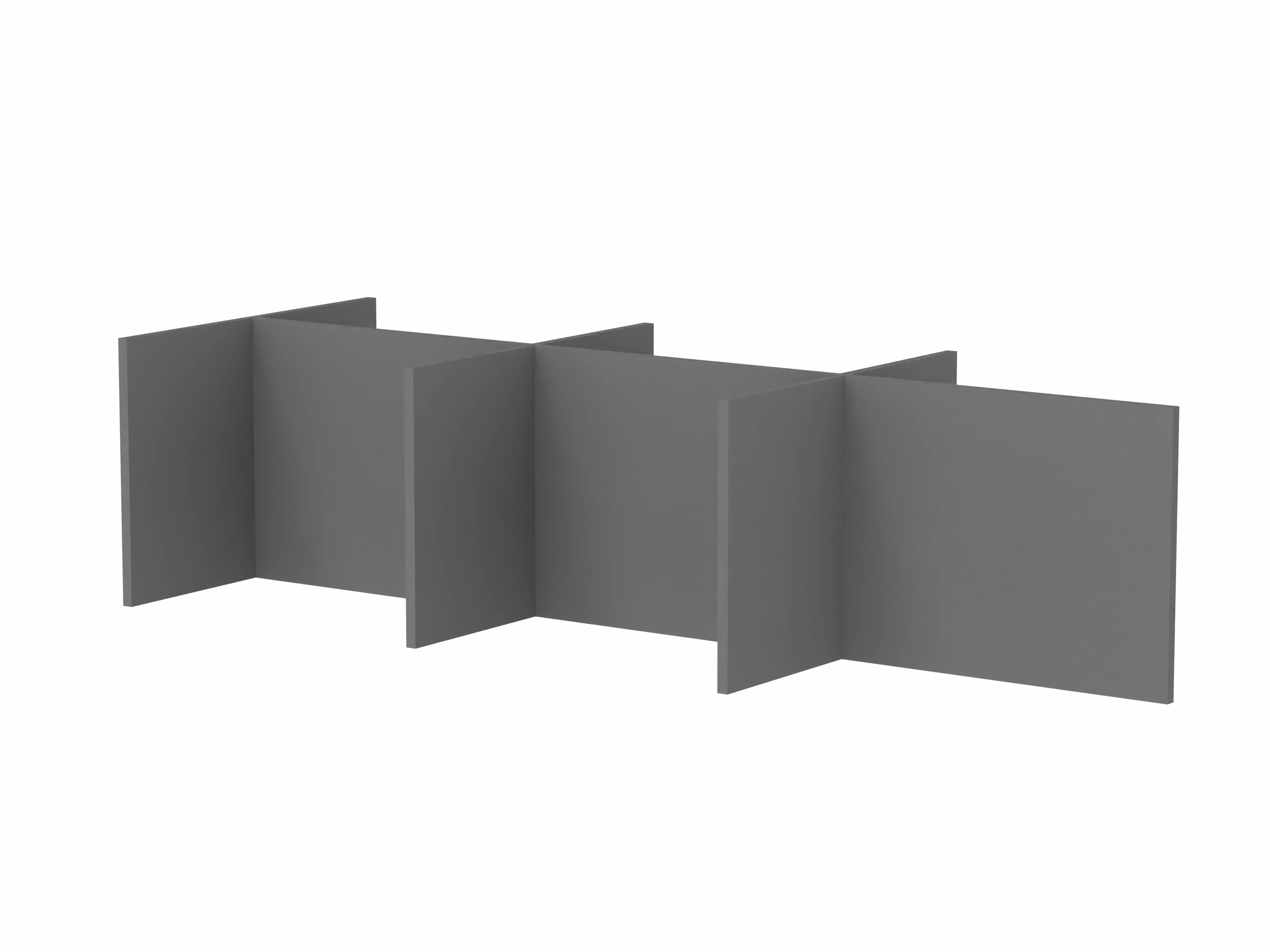 Bestaande uit 3 staande frontpanelen, 1 staand zijpaneel en 2 staande middenpanelen. Opgebouwd uit 40mm berken multiplex frame, gevuld met gerecycled katoen, absorbtieklasse A/NRC waarde 0,95. Gegeven maatvoering zijn bureaumaten
