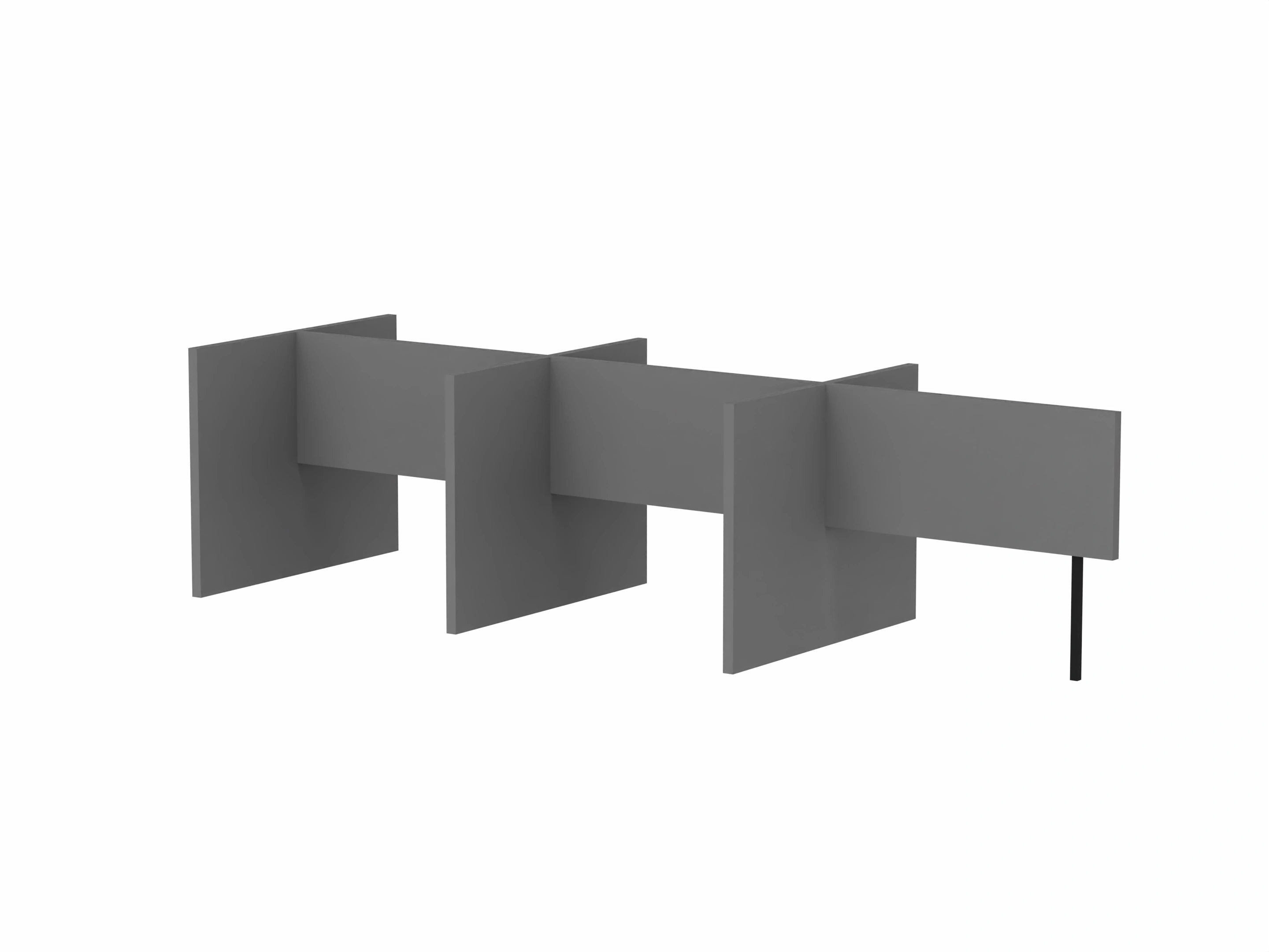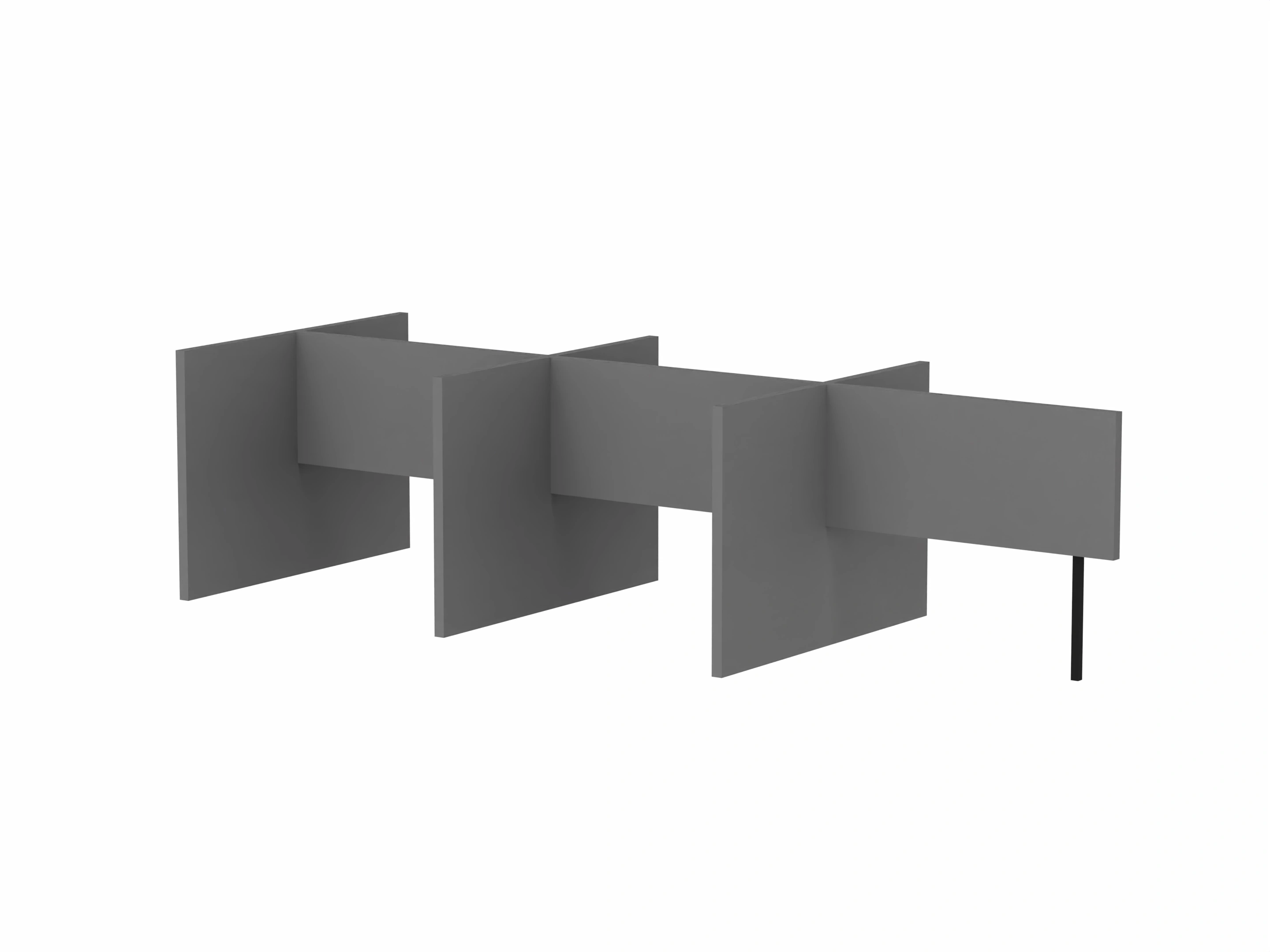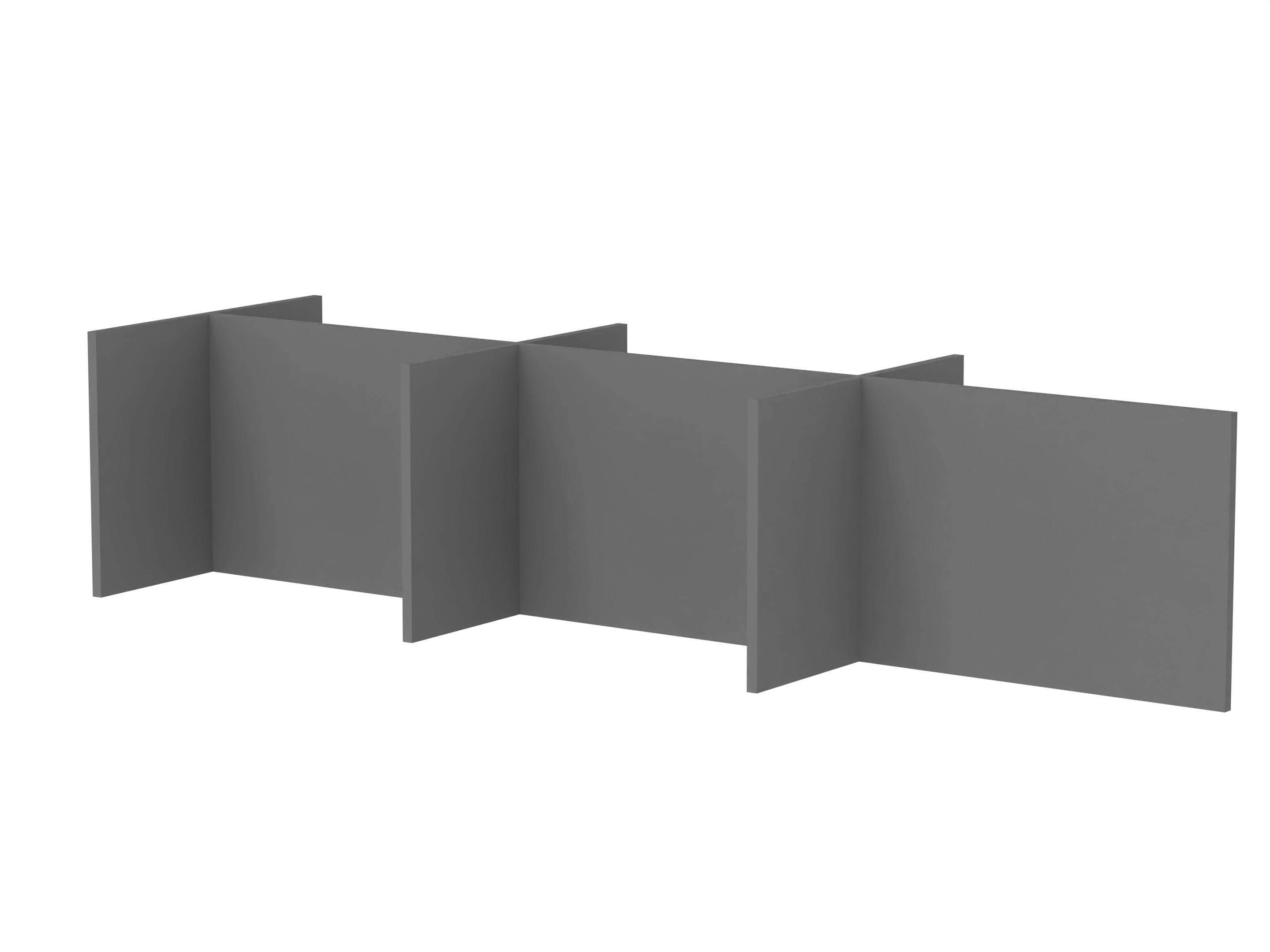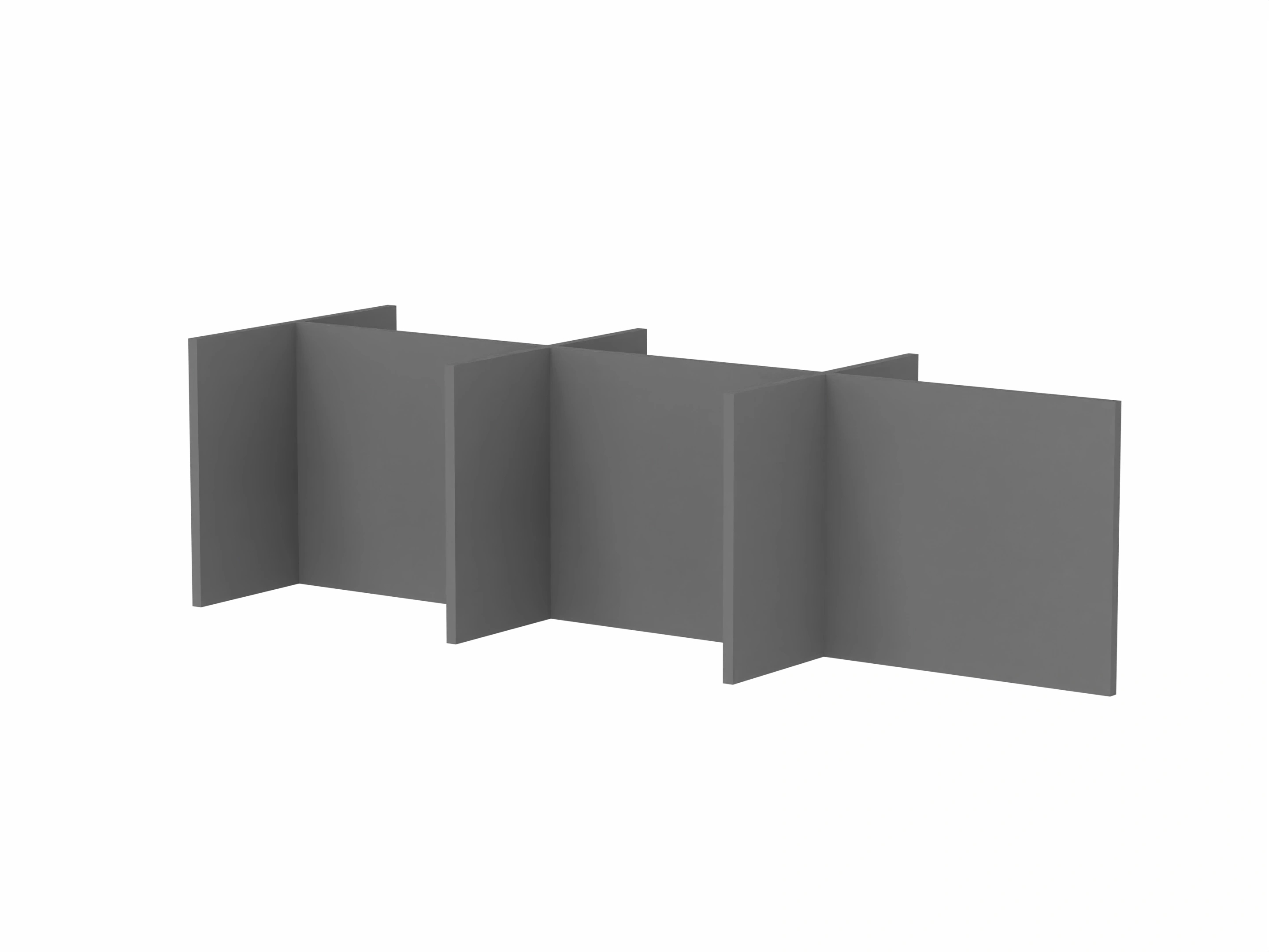 Bestaande uit 3 staande frontpanelen, 1 staand zijpaneel en 2 staande middenpanelen. Opgebouwd uit 40mm berken multiplex frame, gevuld met gerecycled katoen, absorbtieklasse A/NRC waarde 0,95. Gegeven maatvoering zijn bureaumaten