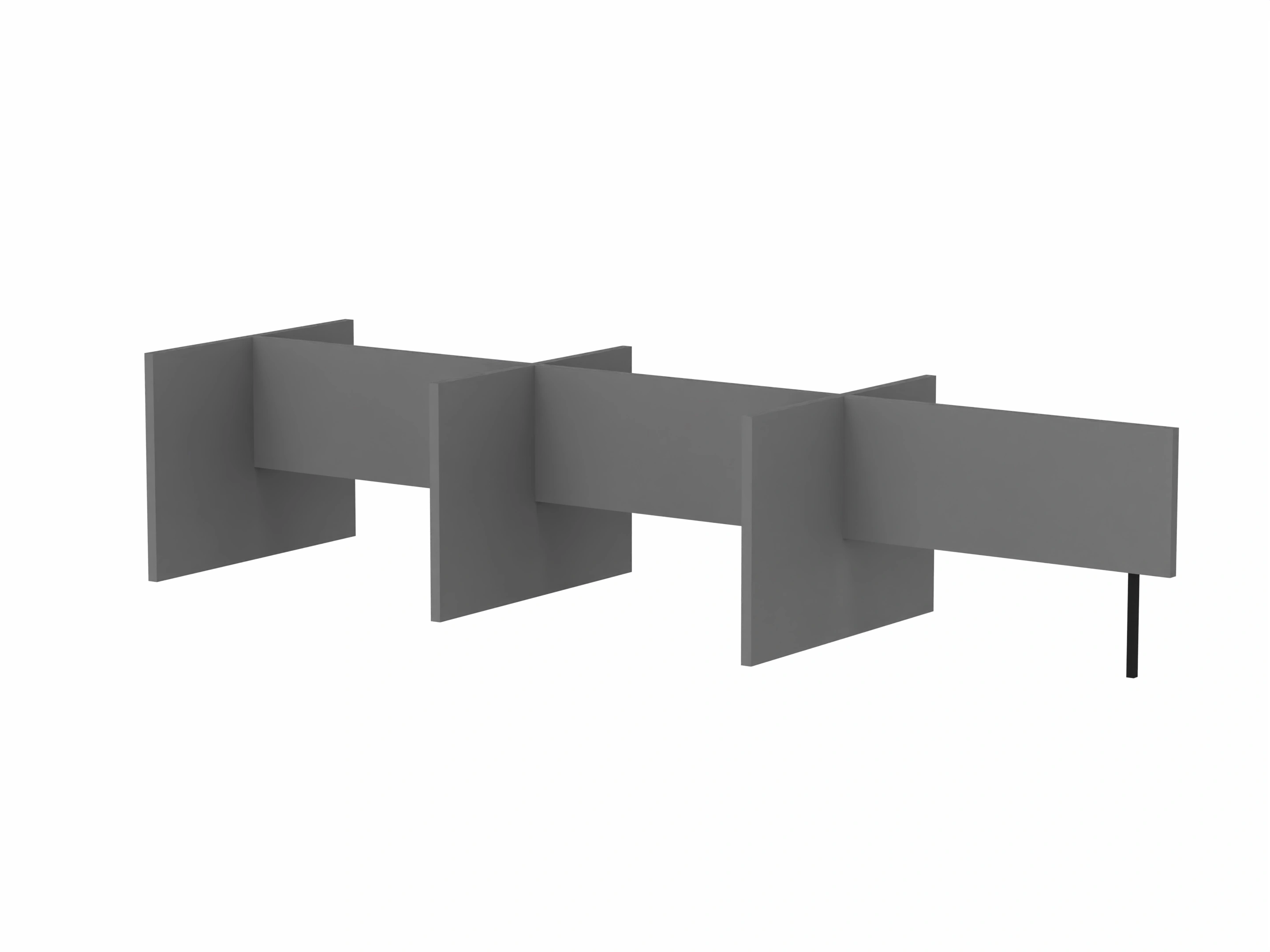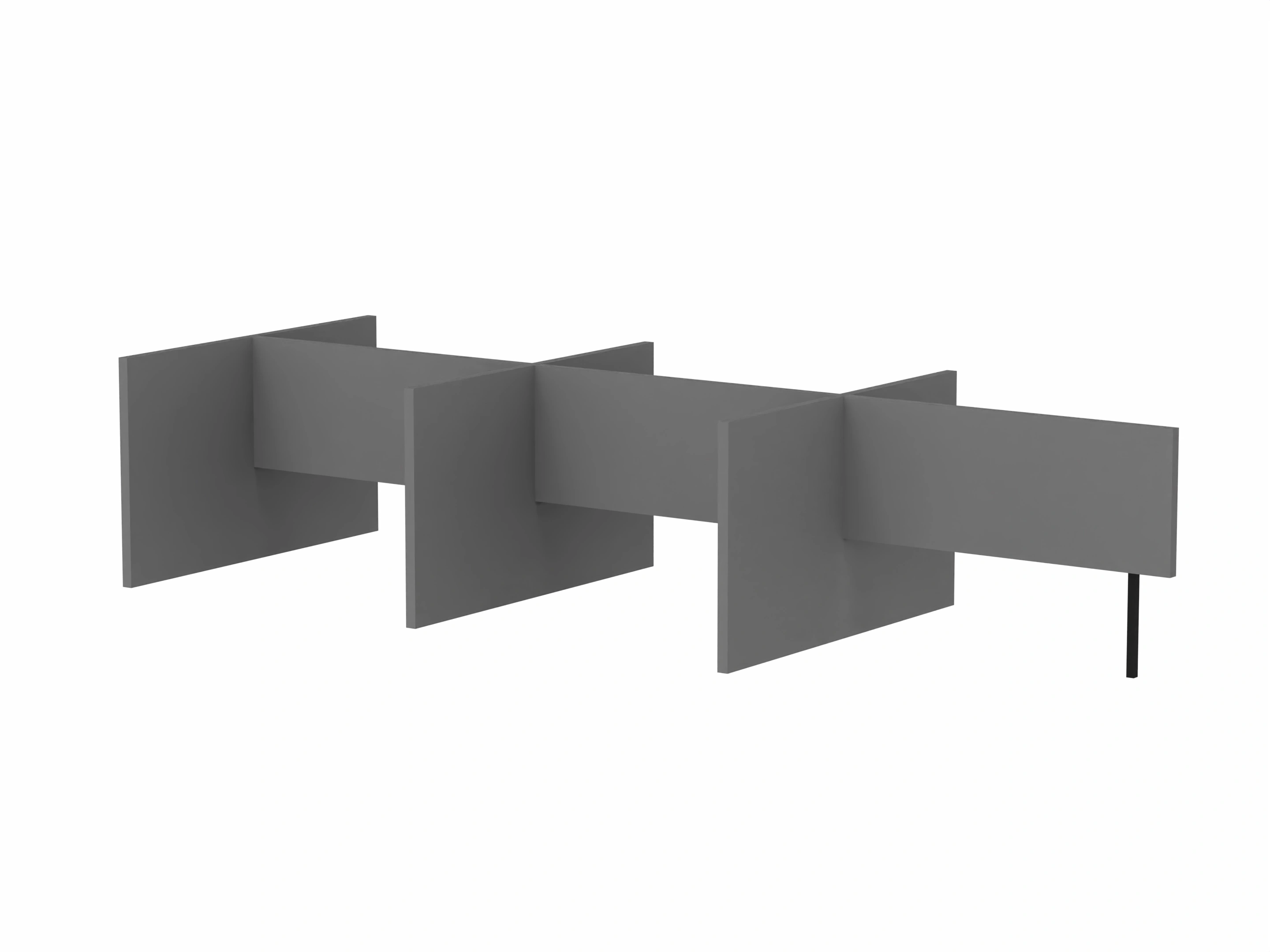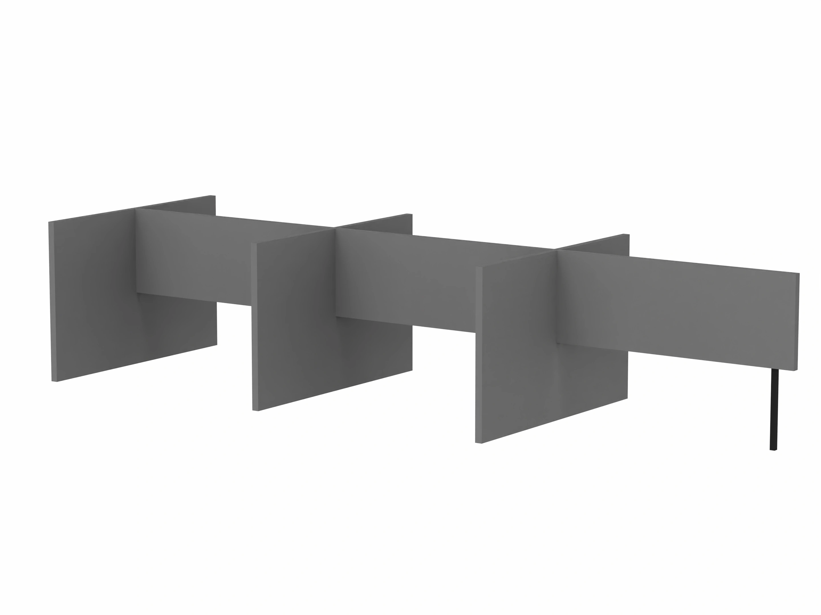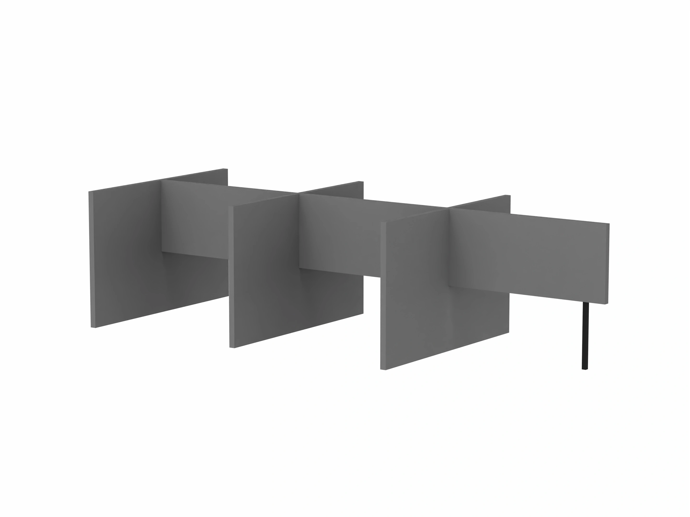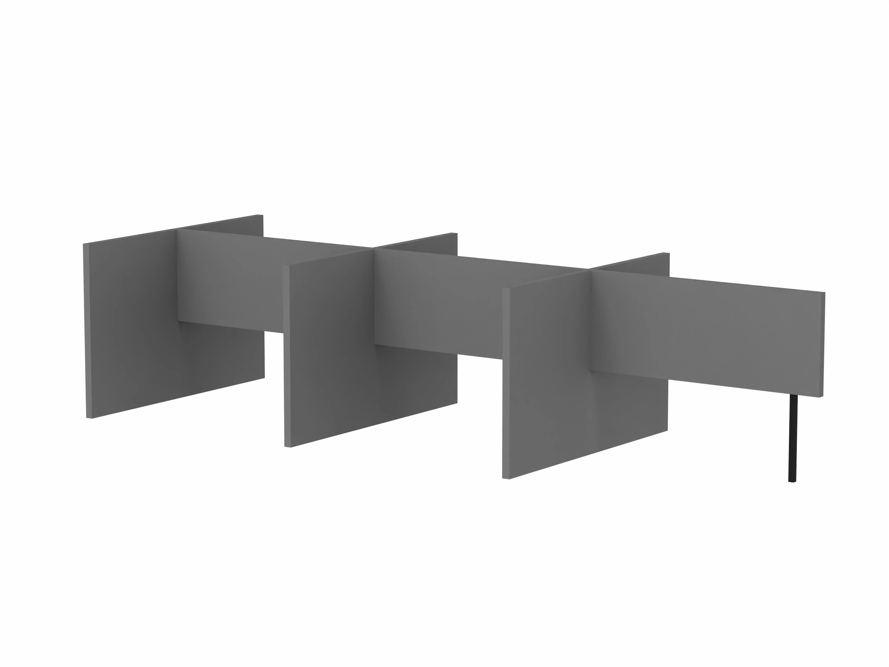 Bestaande uit 3 staande frontpanelen, 1 staand zijpaneel en 2 staande middenpanelen. Opgebouwd uit 40mm berken multiplex frame, gevuld met gerecycled katoen, absorbtieklasse A/NRC waarde 0,95. Gegeven maatvoering zijn bureaumaten