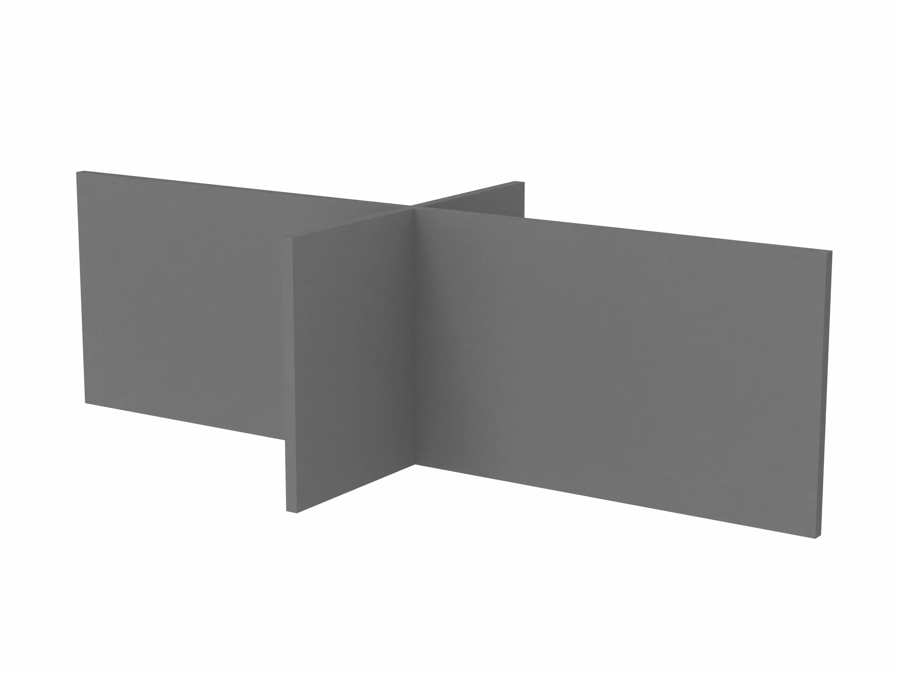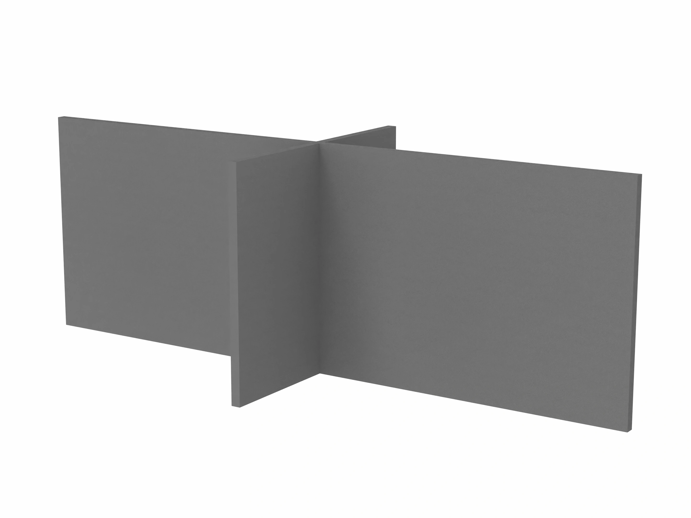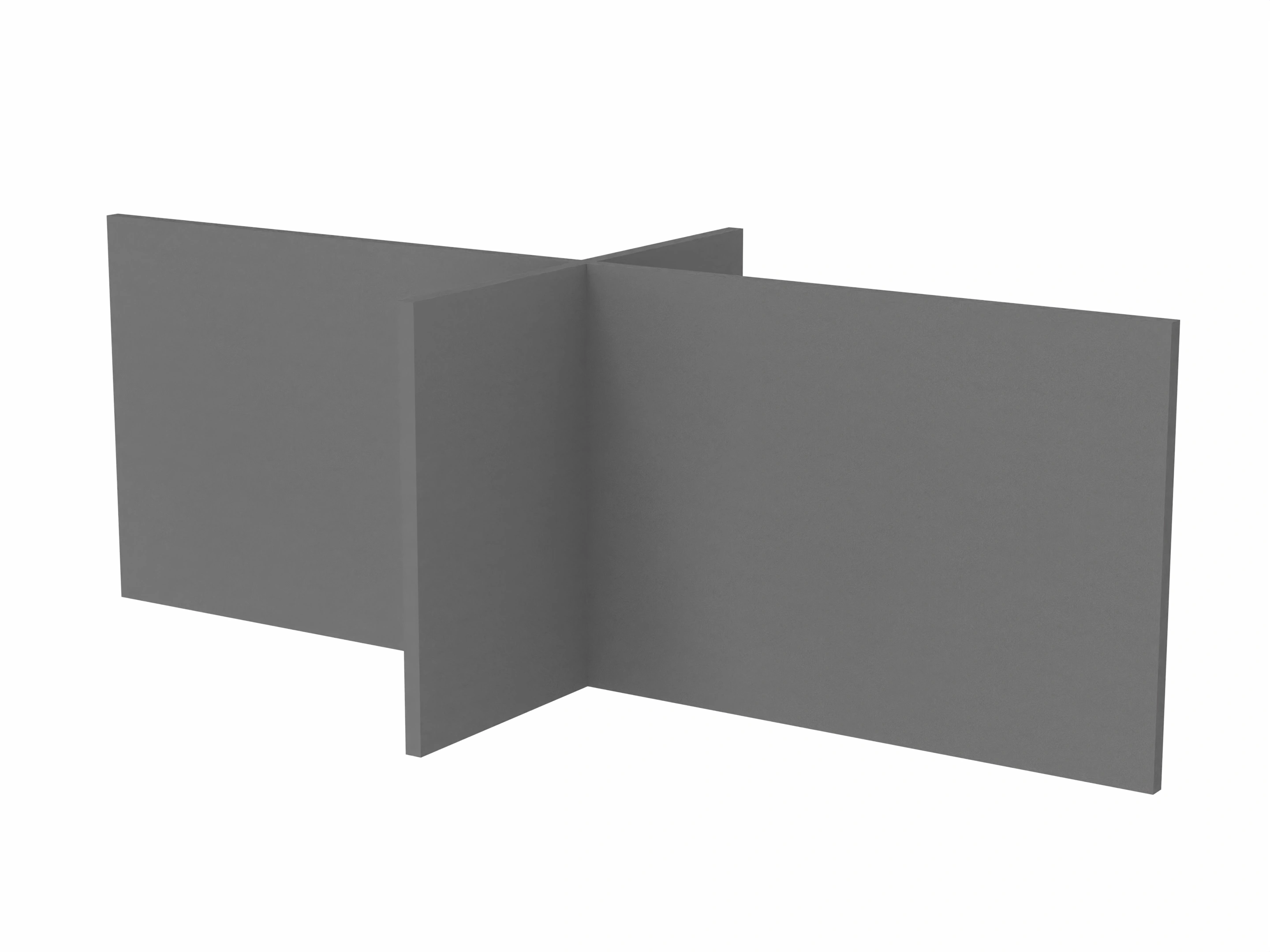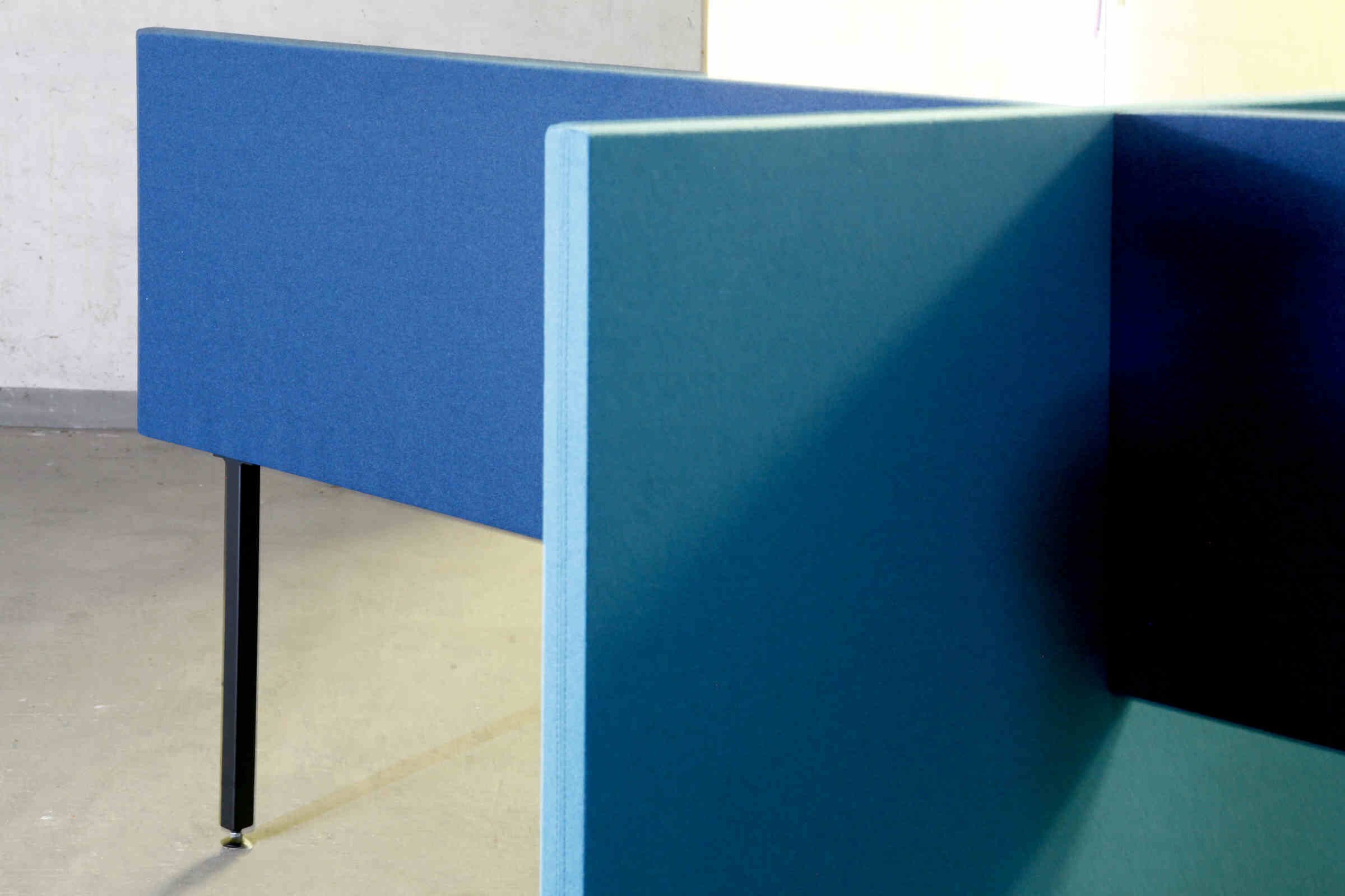 Bestaande uit 2 staande frontpanelen en 1 staand middenpaneel. Panelen zijn opgebouwd uit een 40mm berken multiplex frame, gevuld met gerecycled katoen, absorbtieklasse A/NRC waarde 0,95. Gegeven maatvoering zijn bureaumaten