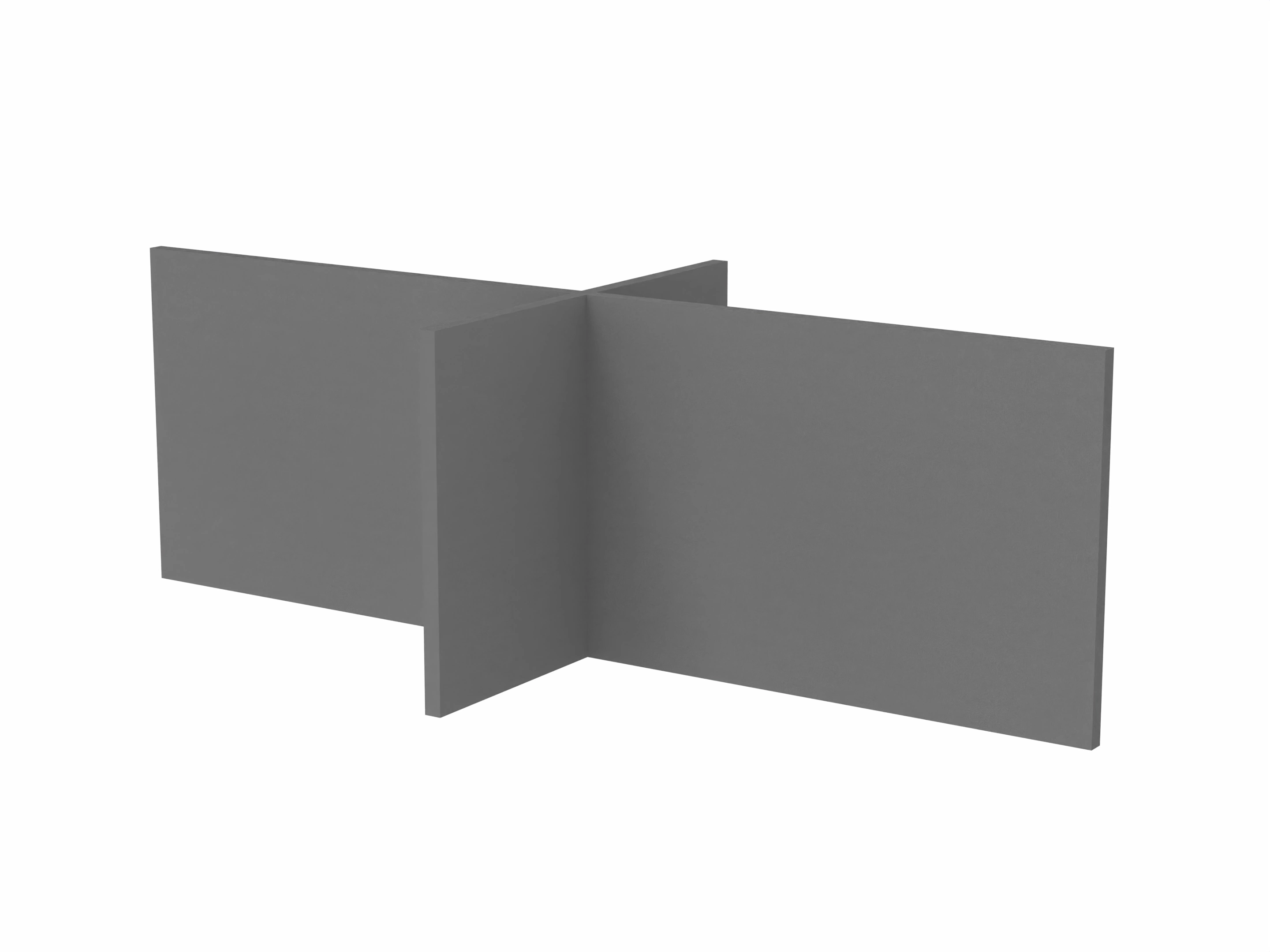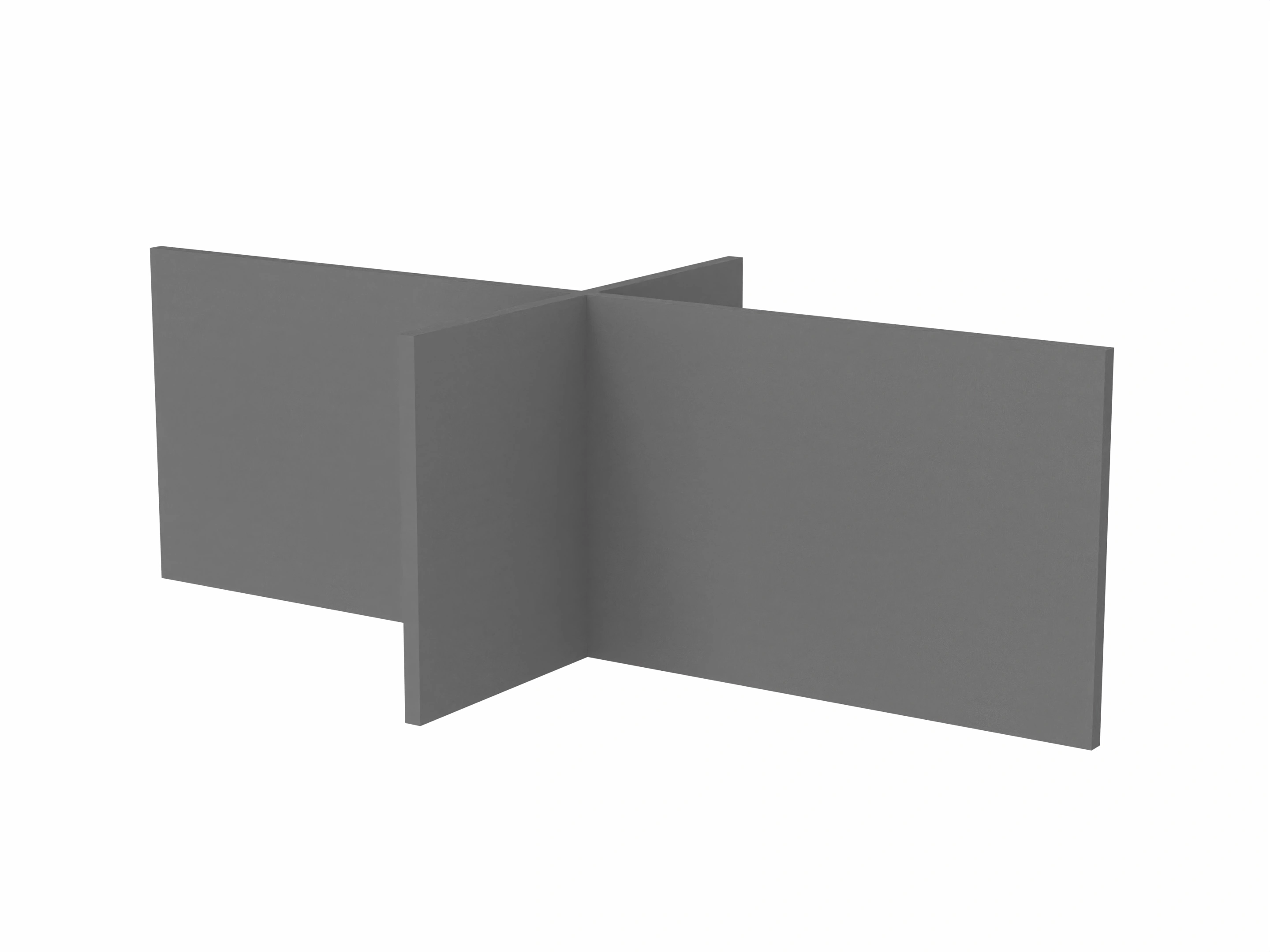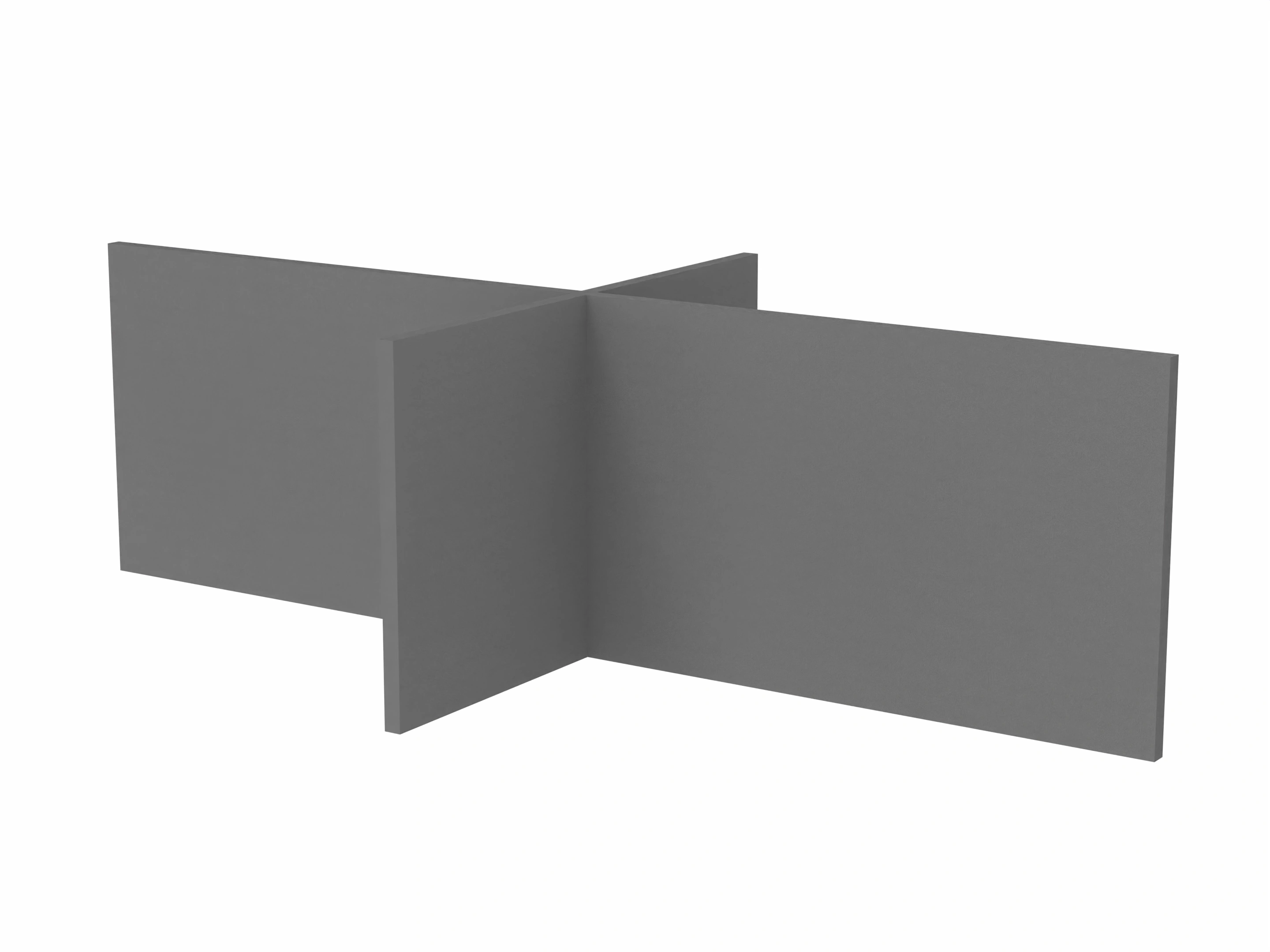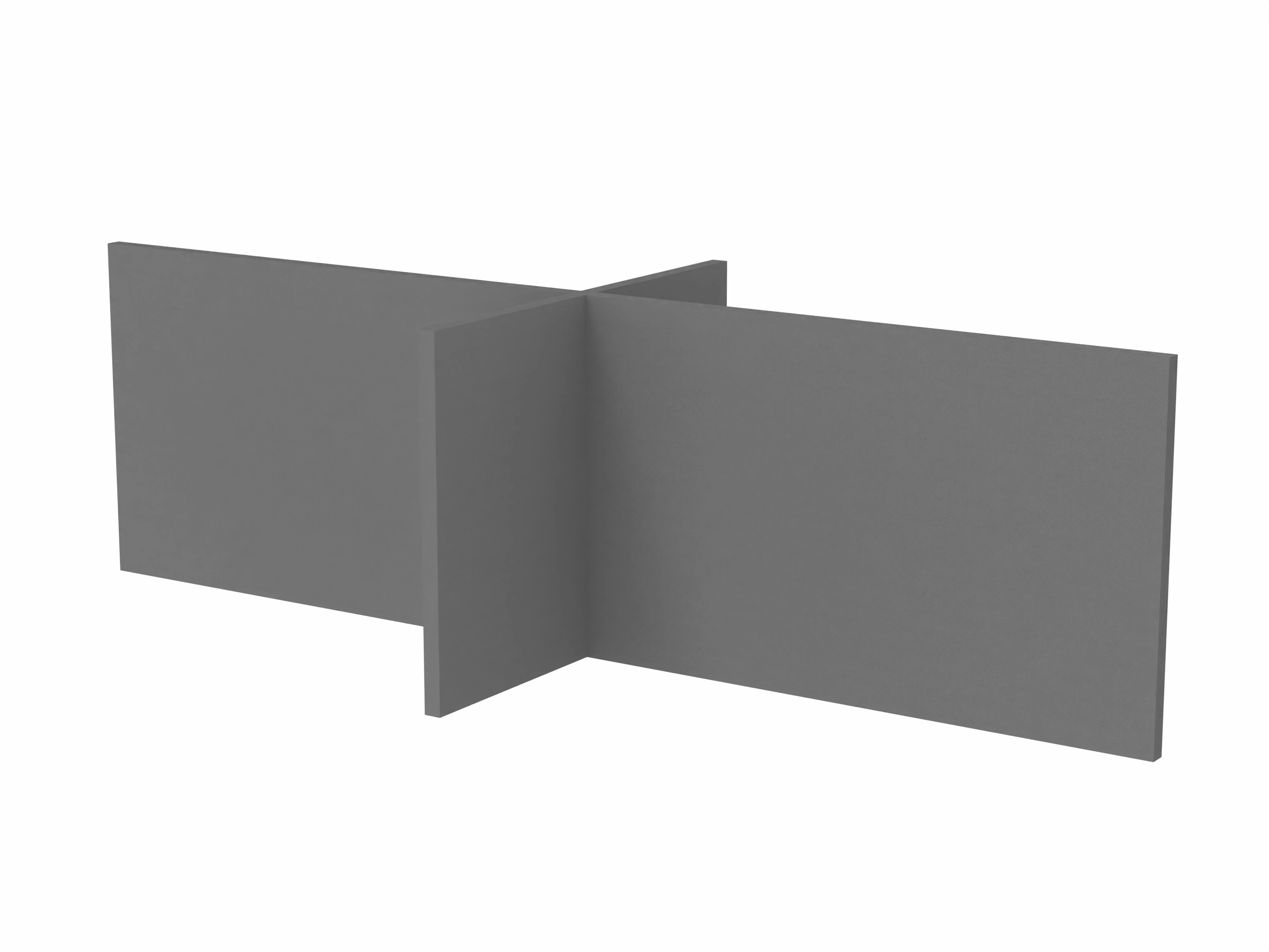 Bestaande uit 2 staande frontpanelen en 1 staand middenpaneel. Panelen zijn opgebouwd uit een 40mm berken multiplex frame, gevuld met gerecycled katoen, absorbtieklasse A/NRC waarde 0,95. Gegeven maatvoering zijn bureaumaten
