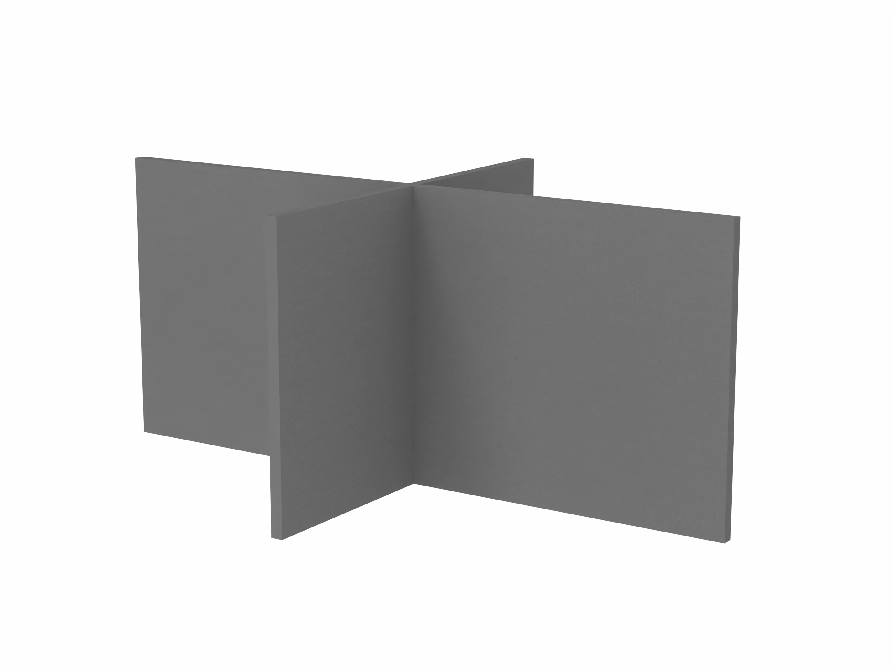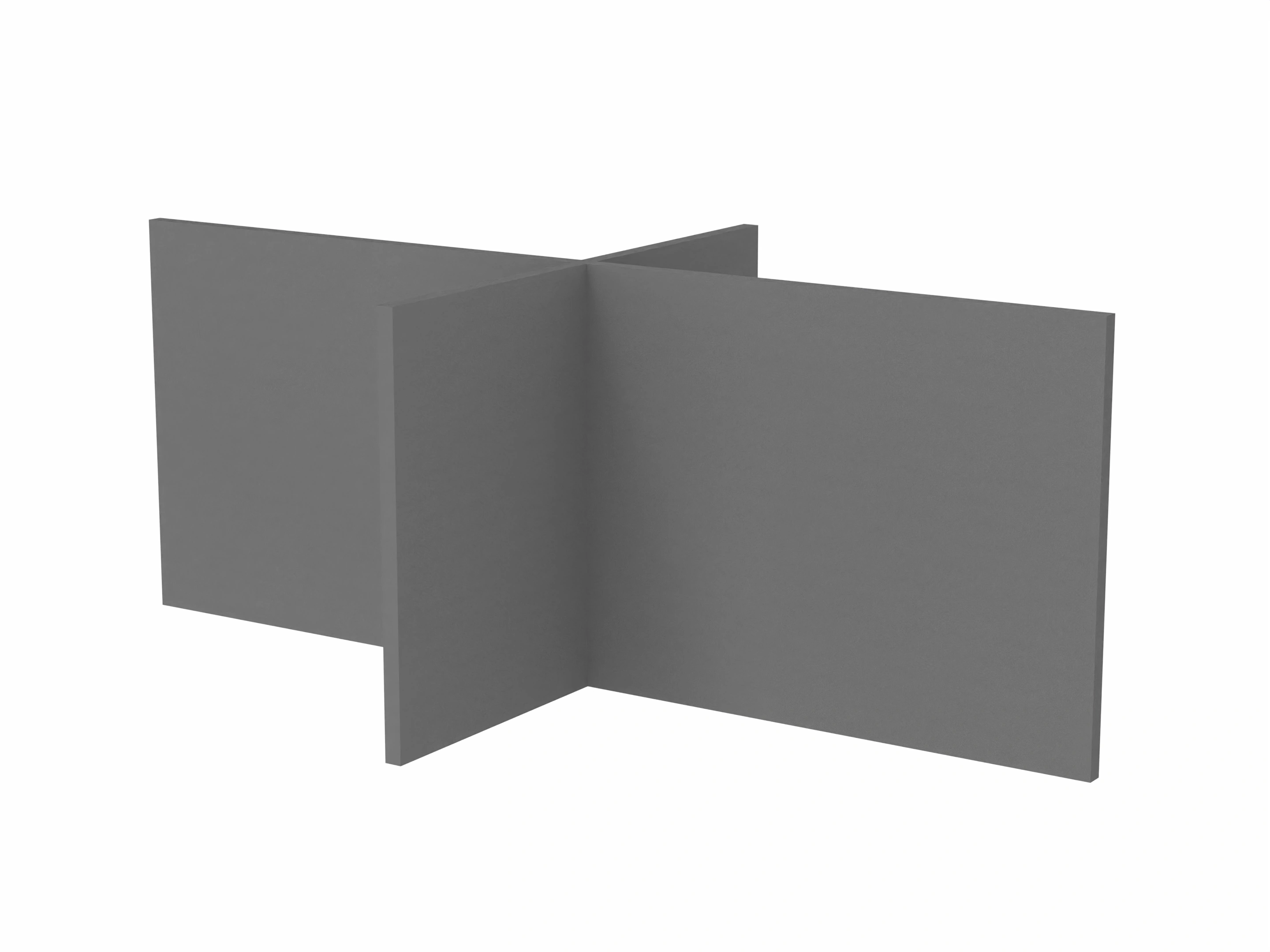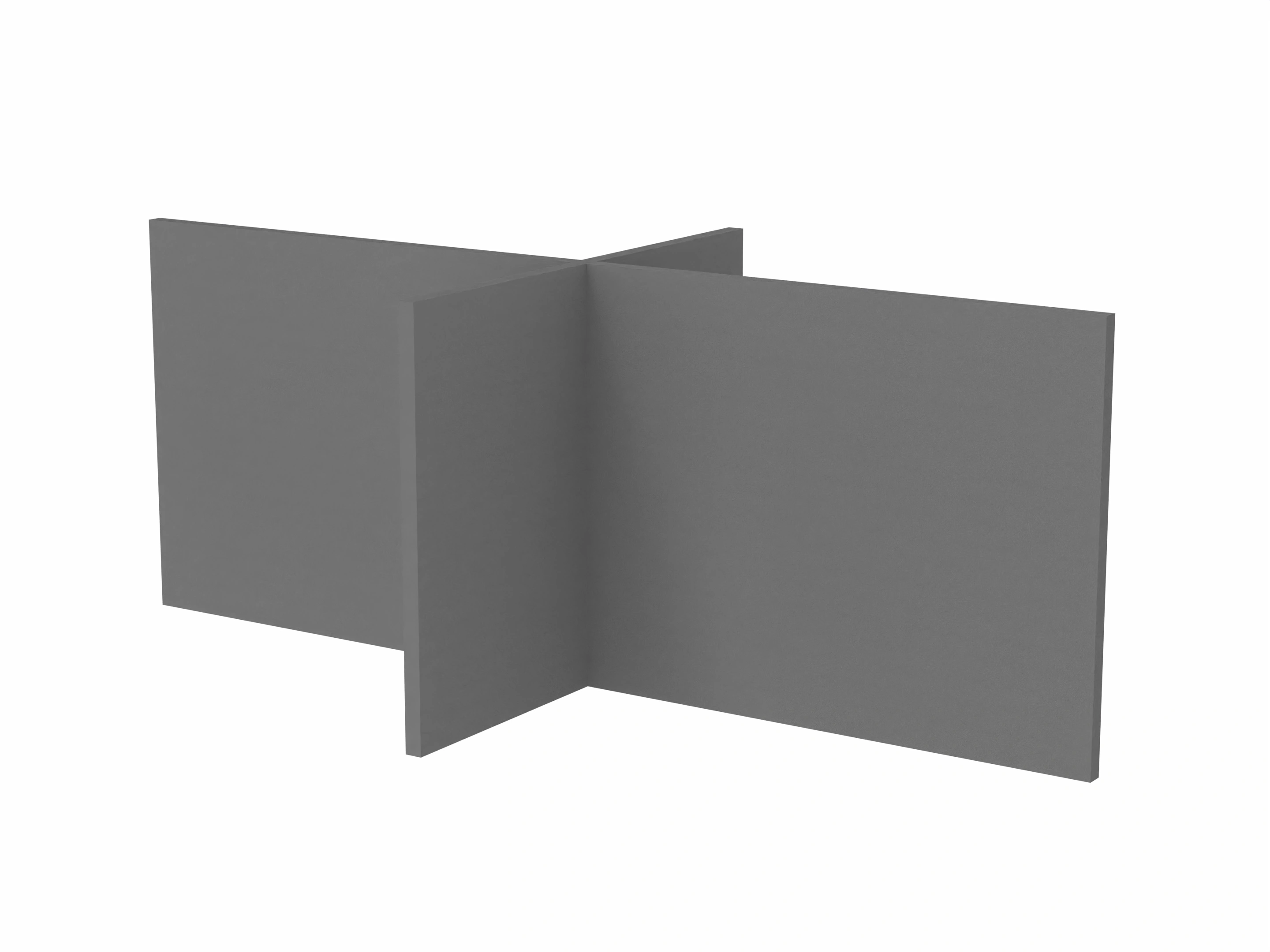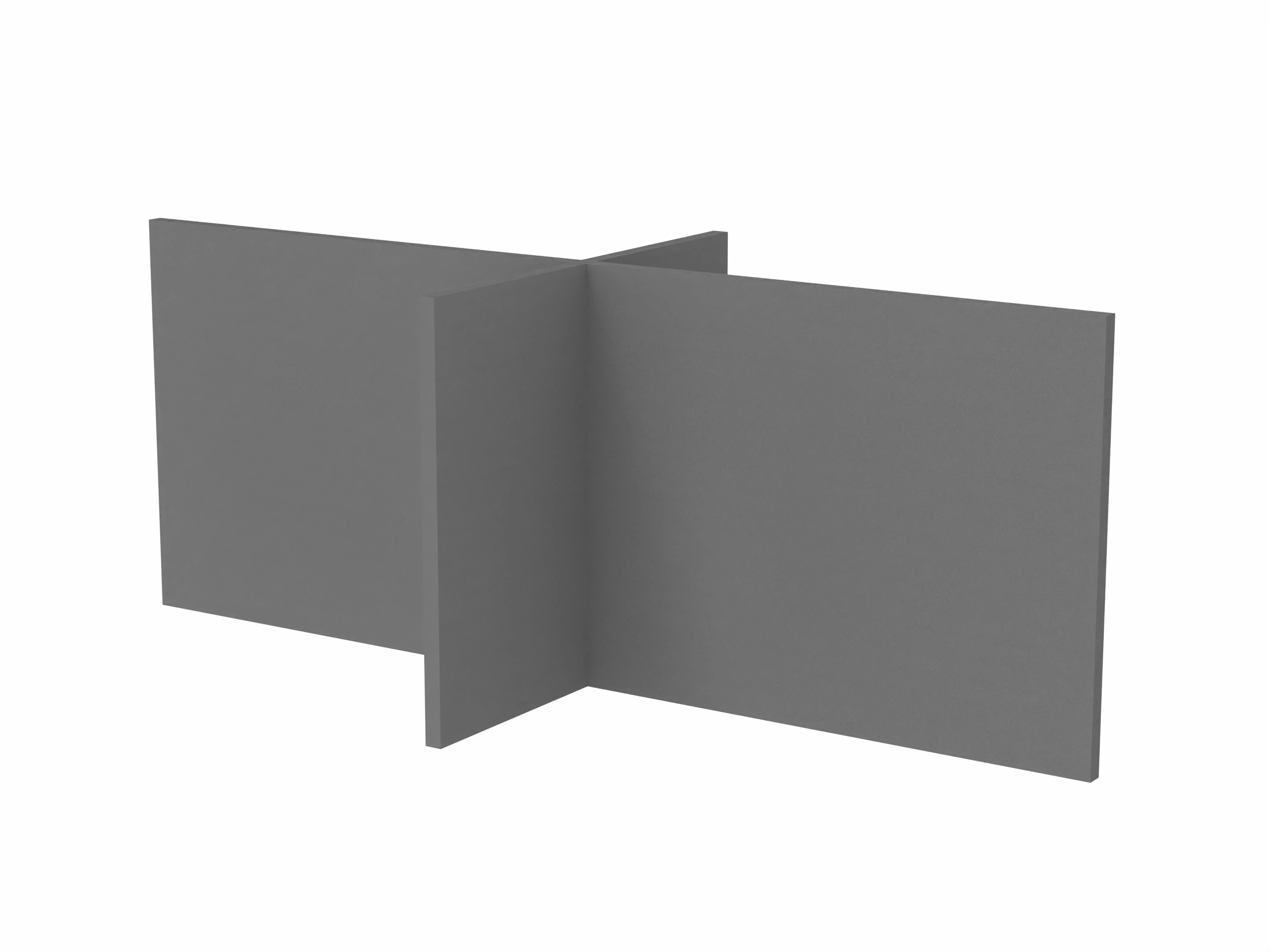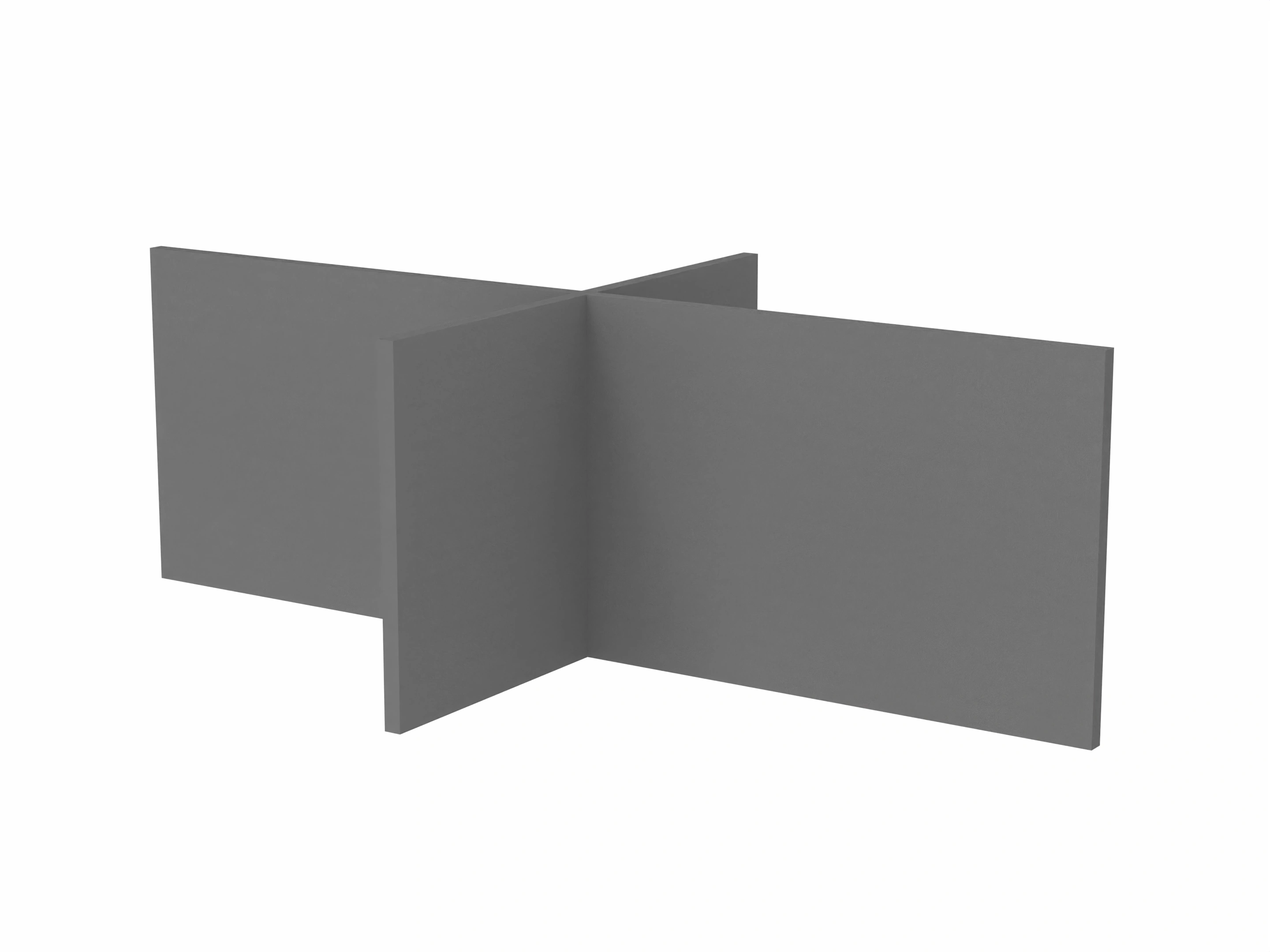 Bestaande uit 2 staande frontpanelen en 1 staand middenpaneel. Panelen zijn opgebouwd uit een 40mm berken multiplex frame, gevuld met gerecycled katoen, absorbtieklasse A/NRC waarde 0,95. Gegeven maatvoering zijn bureaumaten