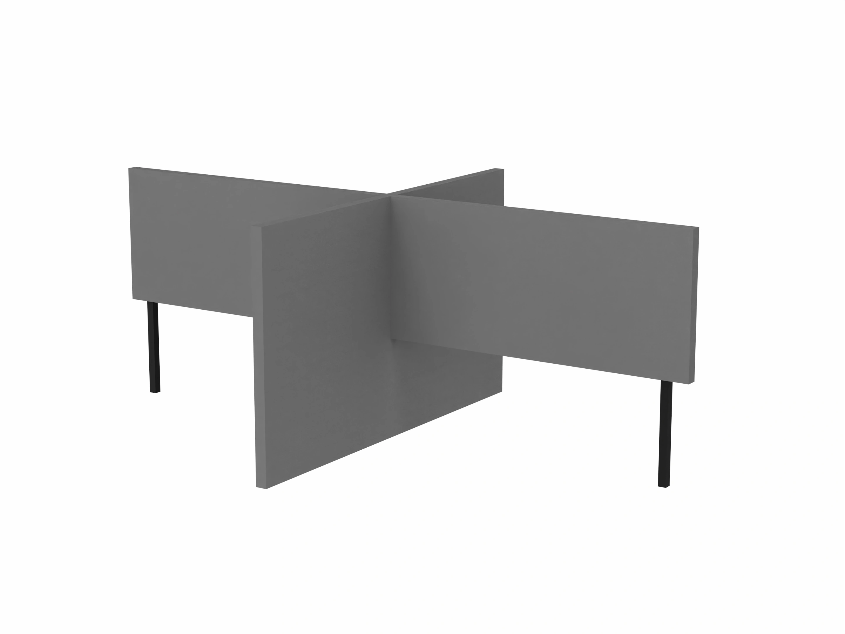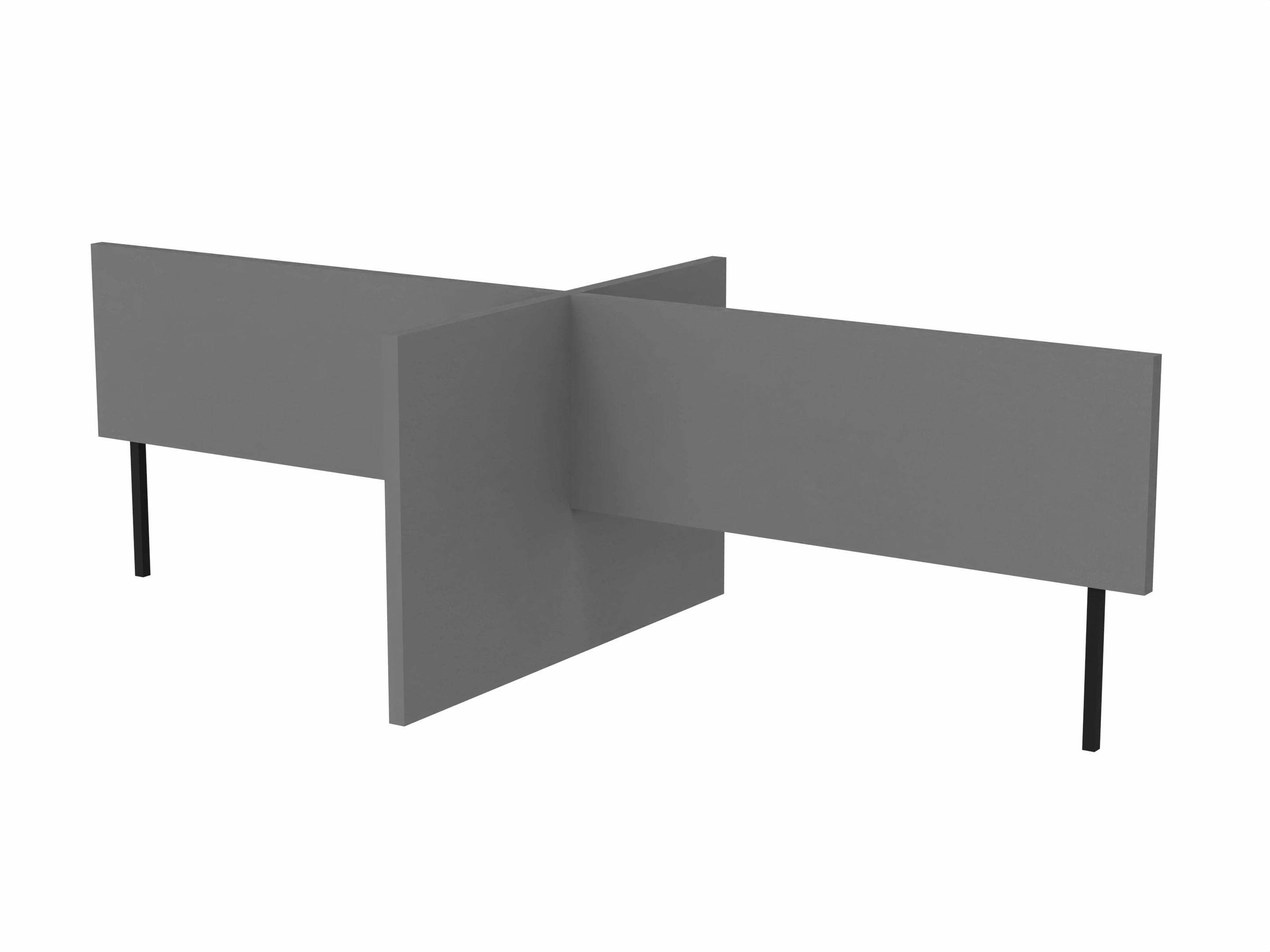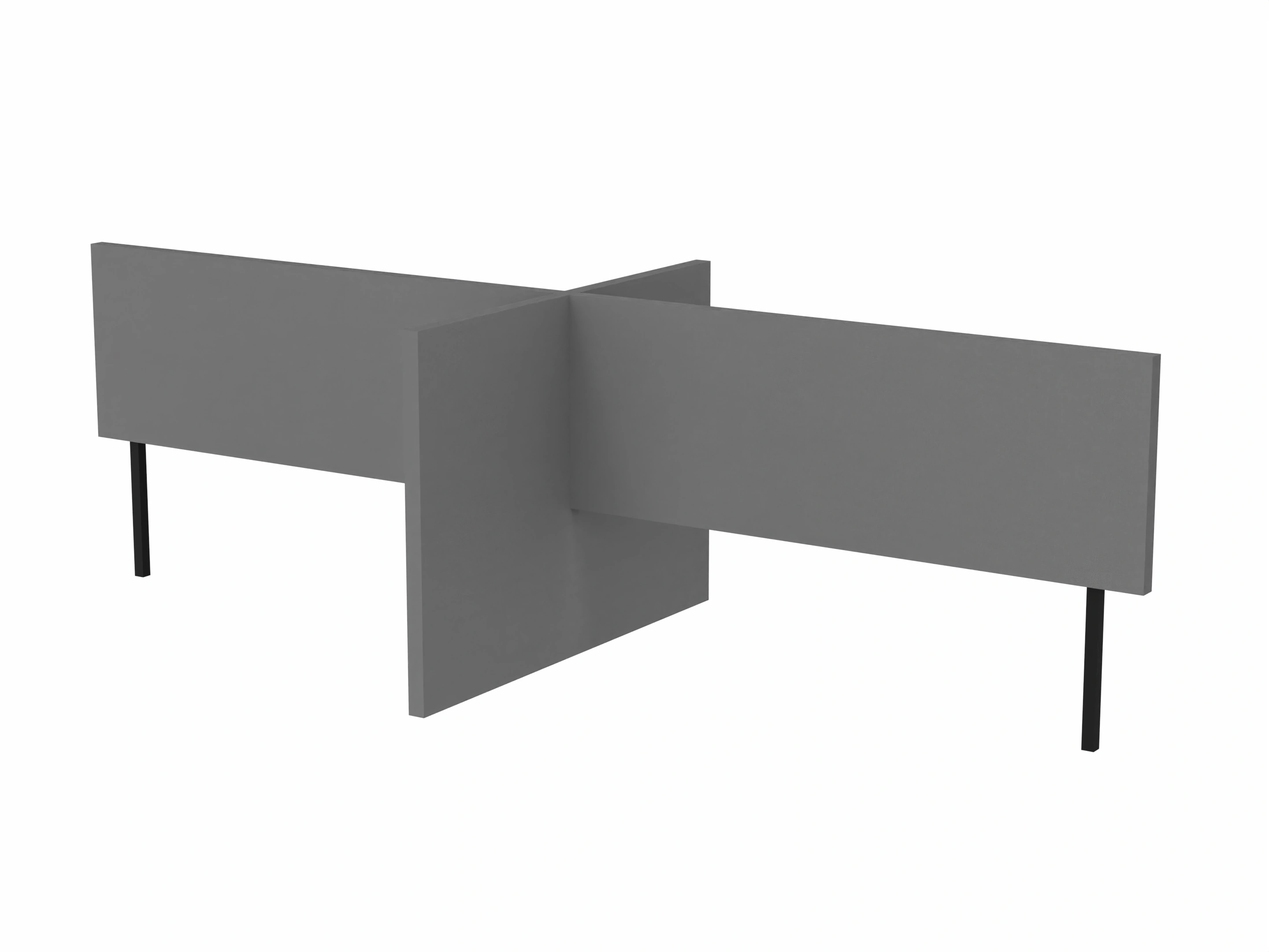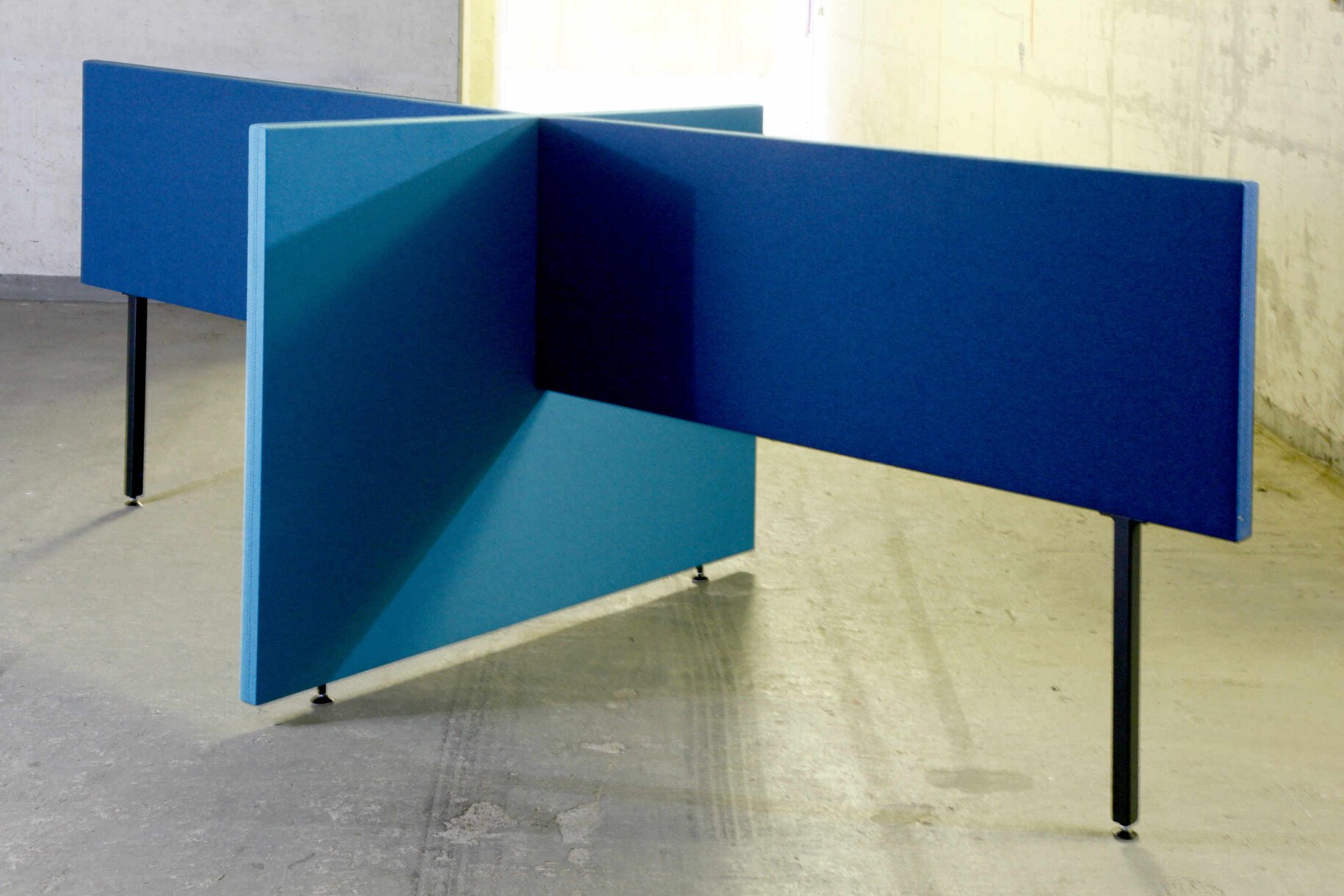 Bestaande uit 2 zwevende frontpanelen op 2 goalposten en 1 staand middenpaneel. Panelen zijn opgebouwd uit een 40mm berken multiplex frame, gevuld met gerecycled katoen, absorbtieklasse A/NRC waarde 0,95. Gegeven maatvoering zijn bureaumaten