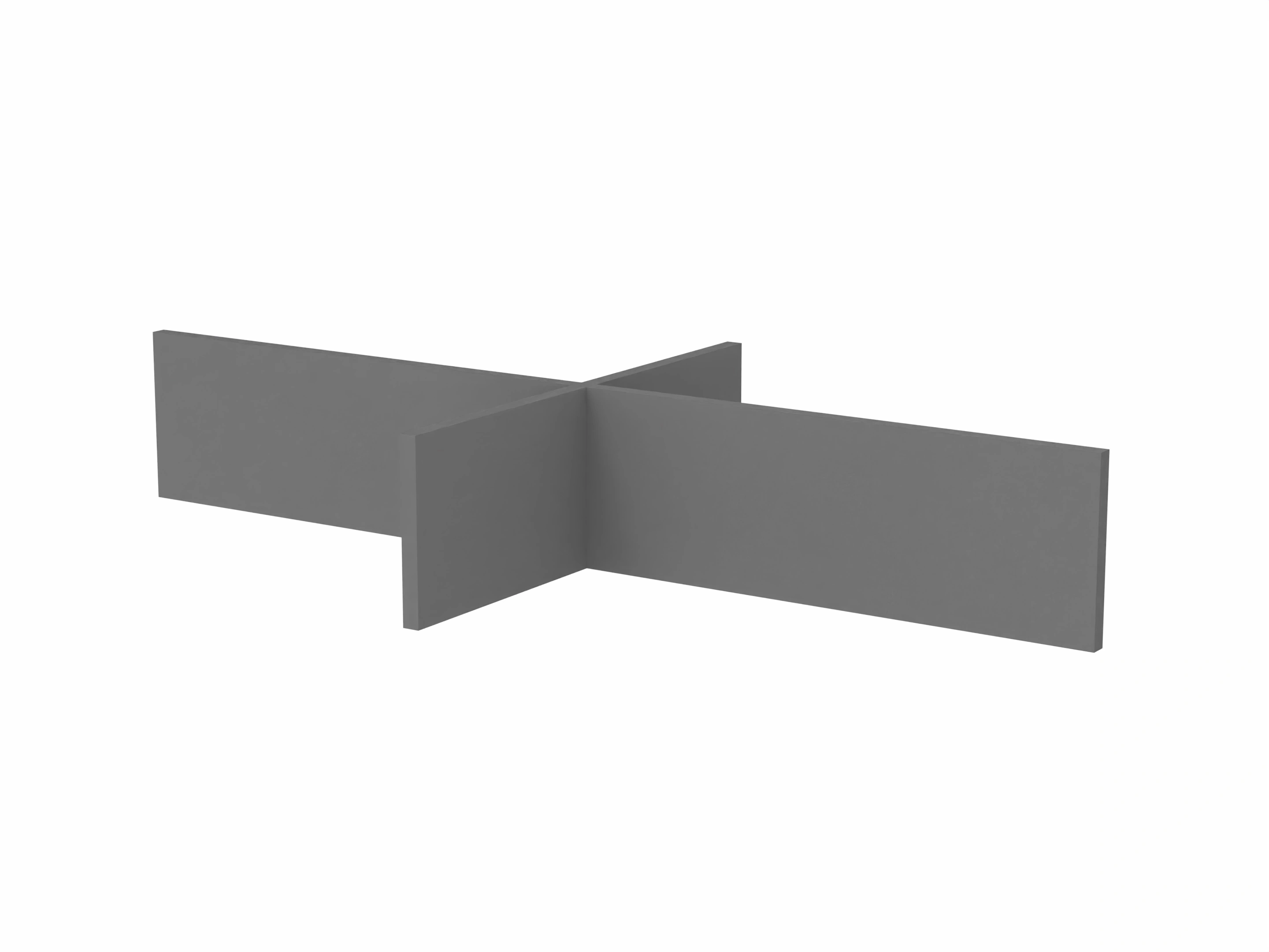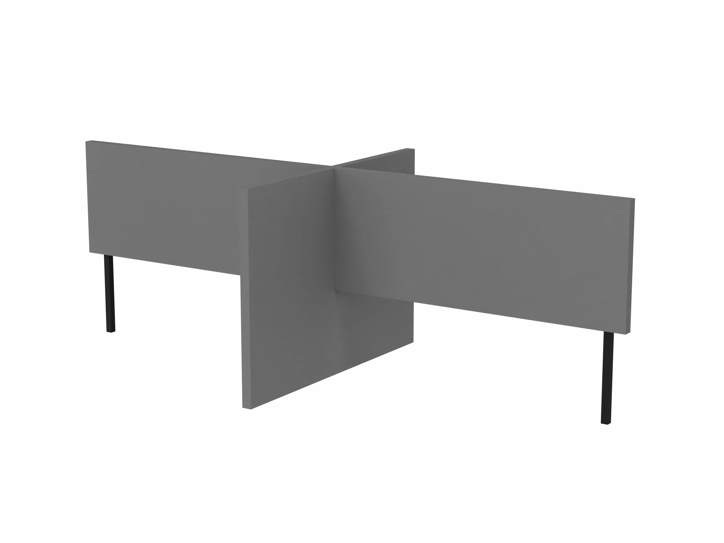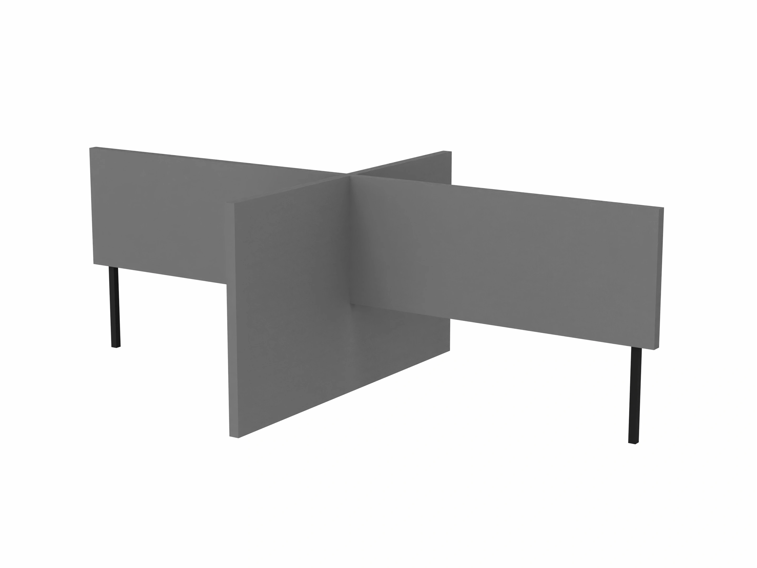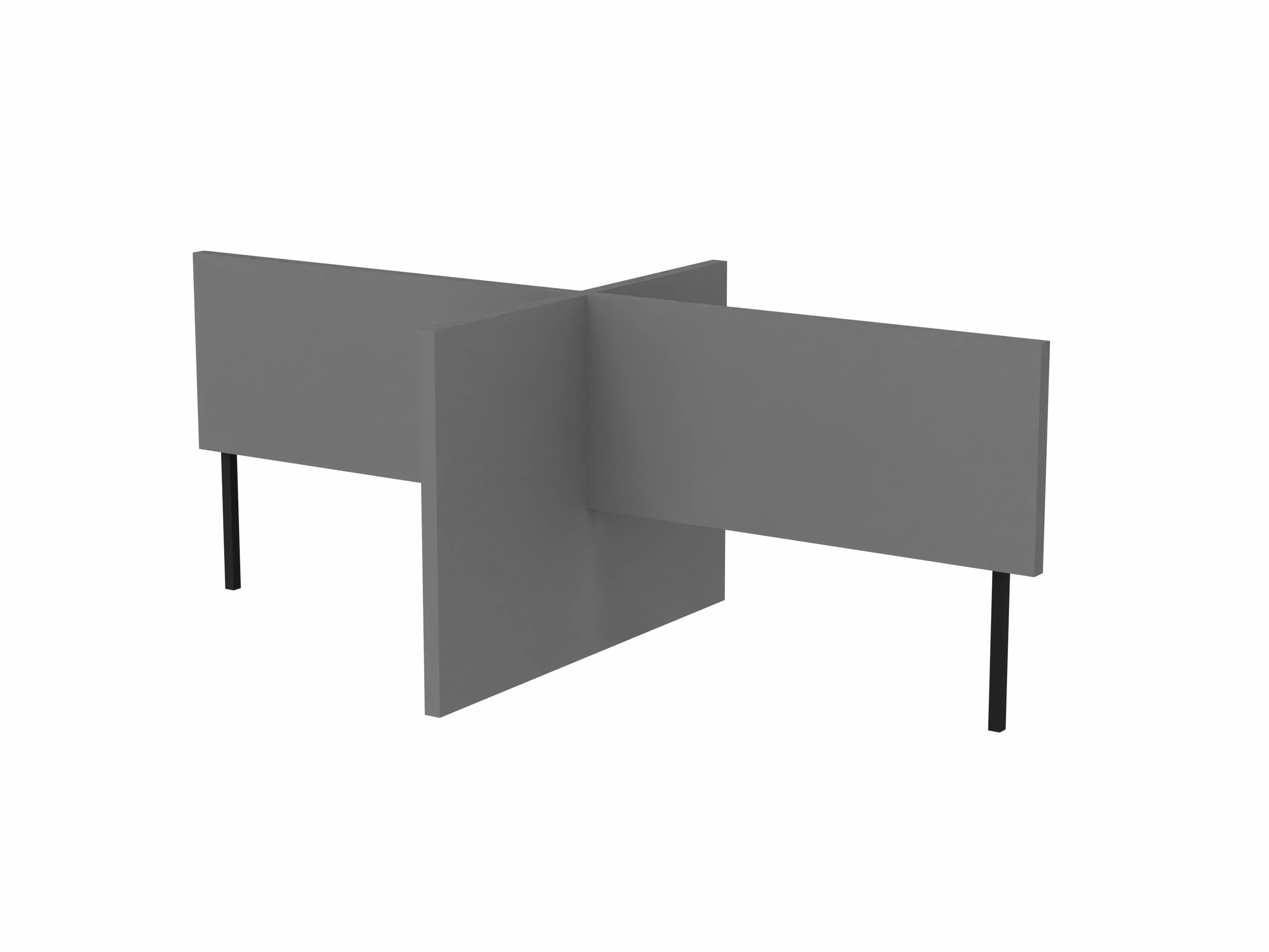 Bestaande uit 2 zwevende frontpanelen op 2 goalposten en 1 staand middenpaneel. Panelen zijn opgebouwd uit een 40mm berken multiplex frame, gevuld met gerecycled katoen, absorbtieklasse A/NRC waarde 0,95. Gegeven maatvoering zijn bureaumaten