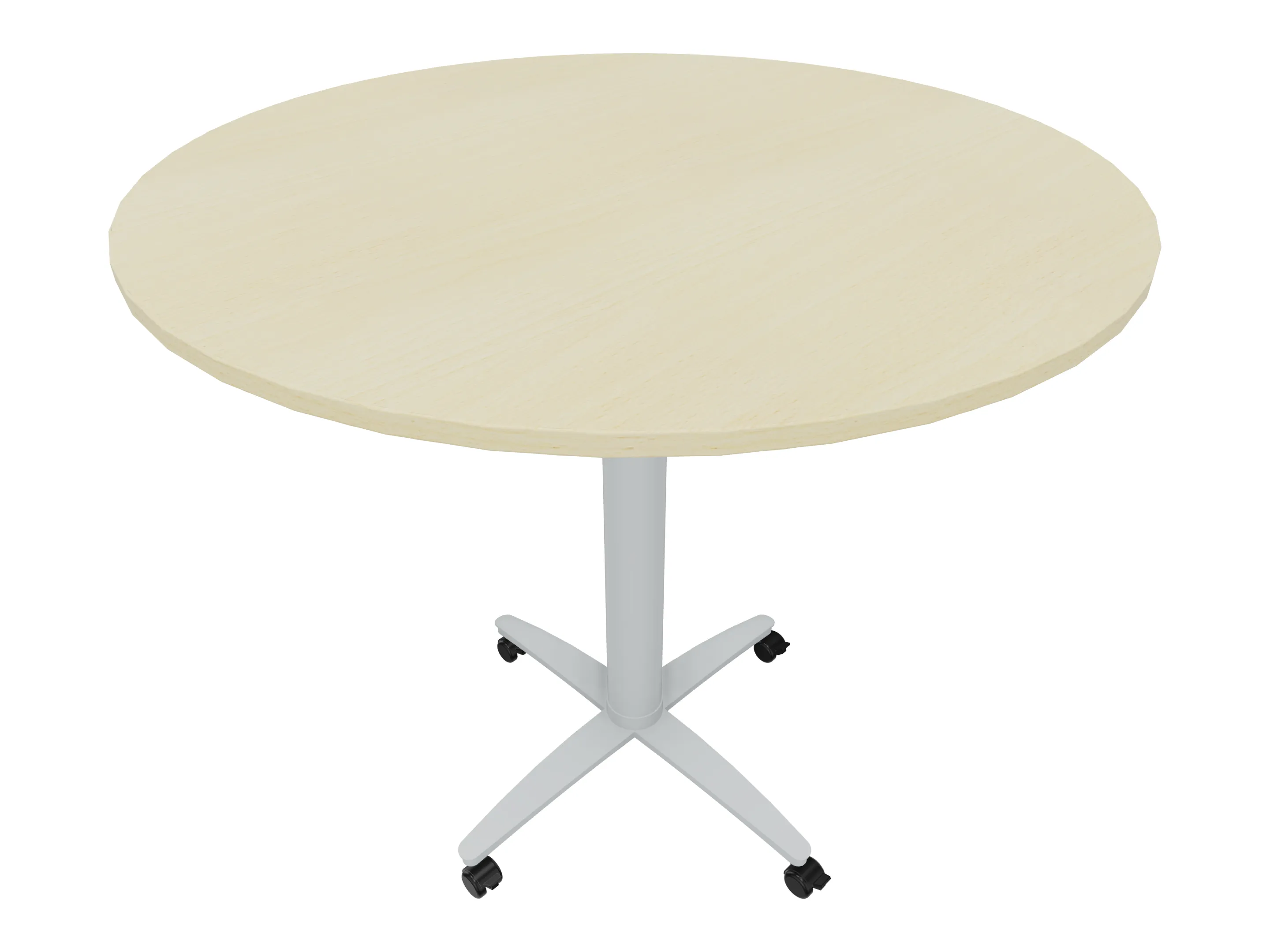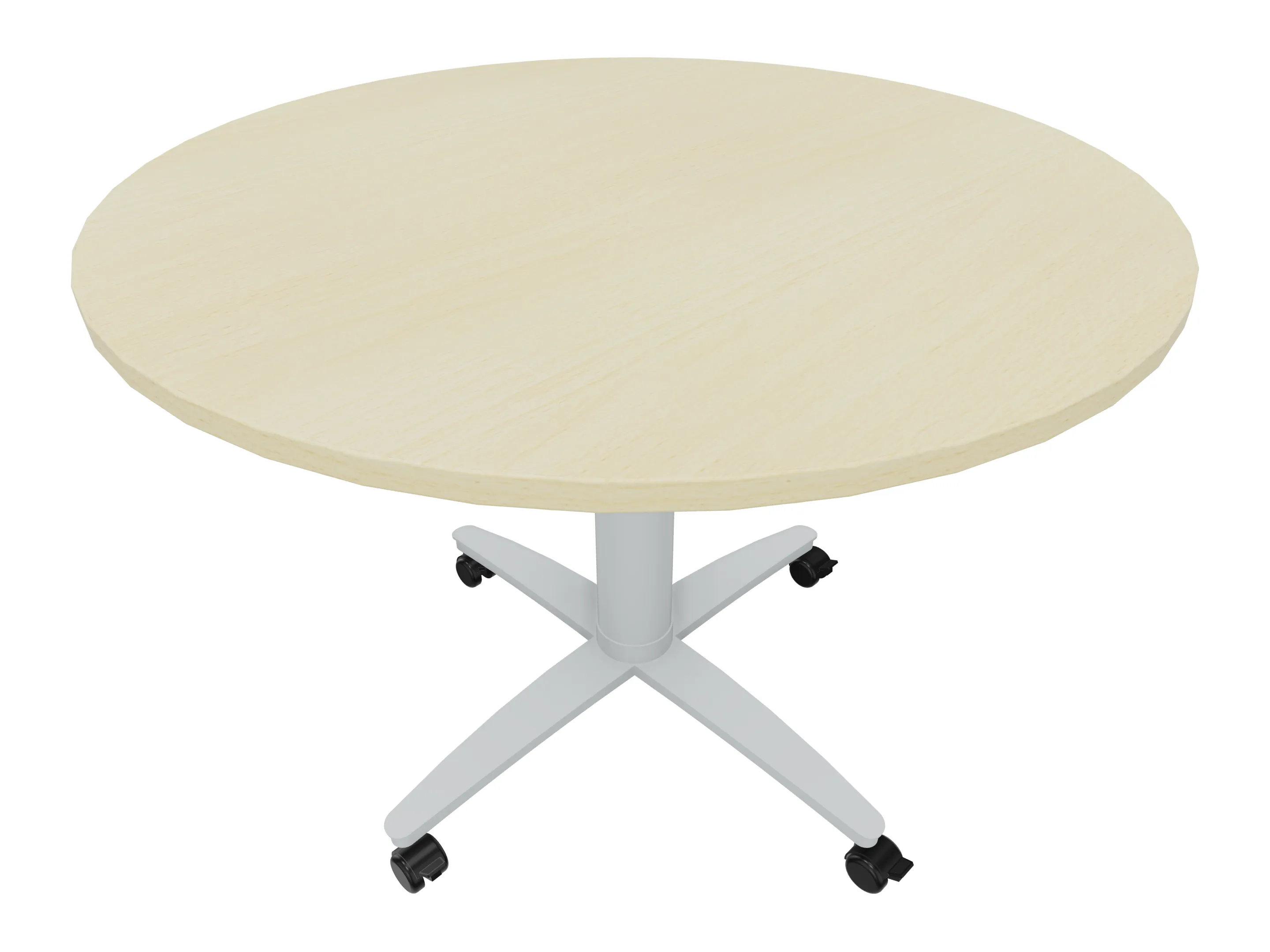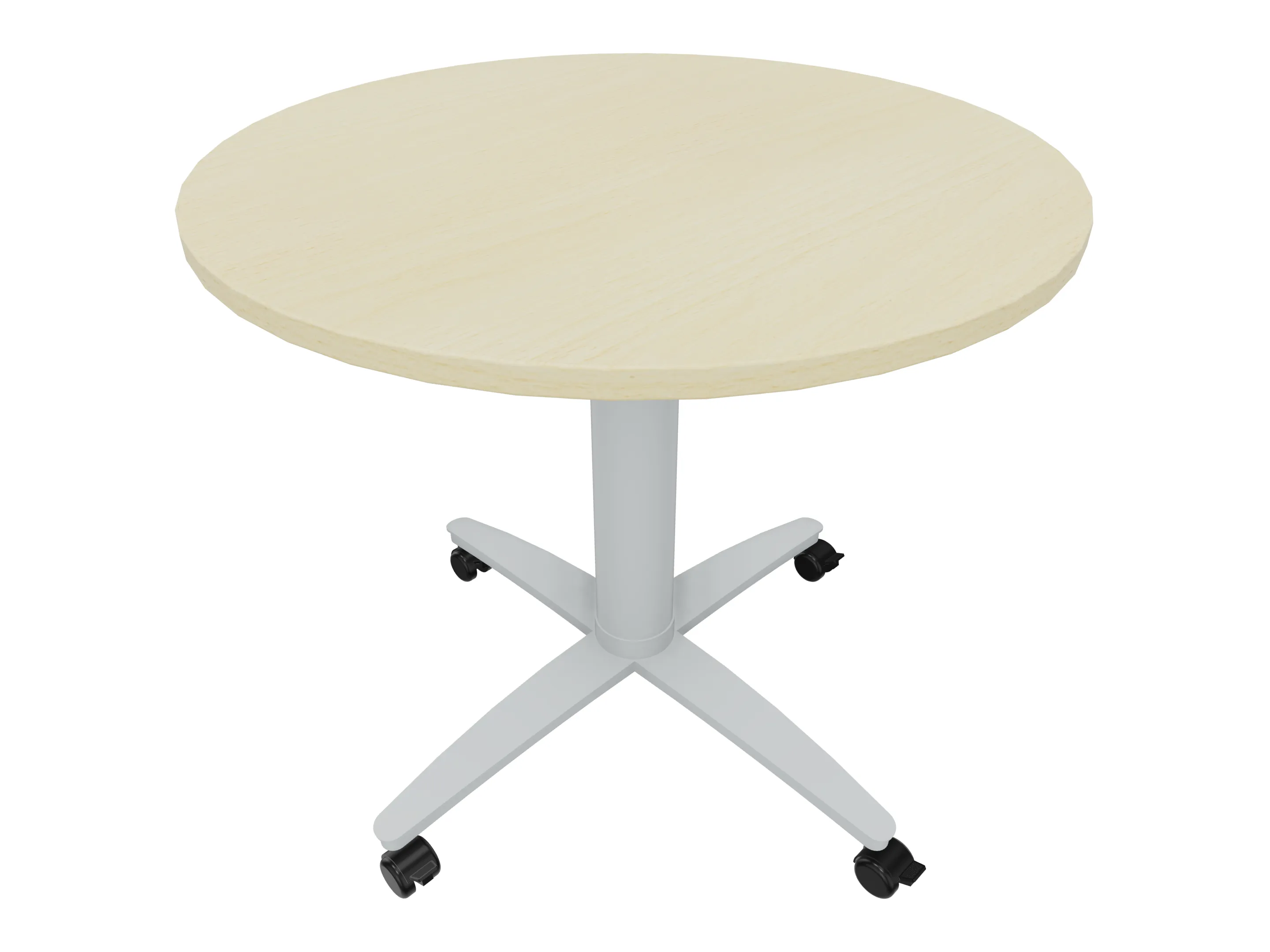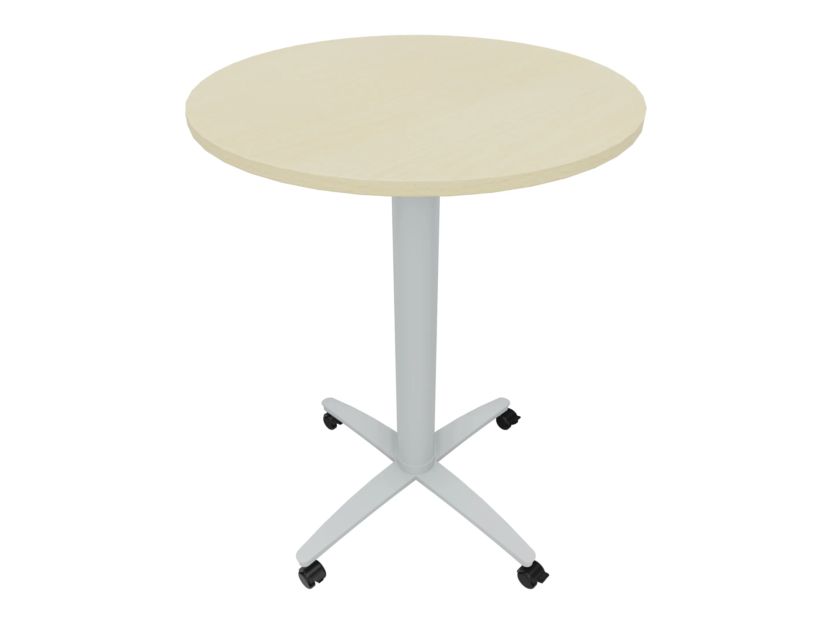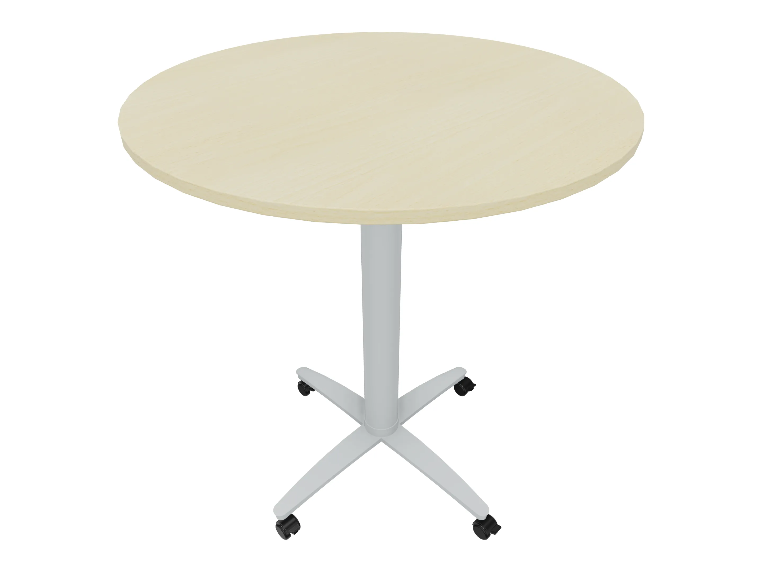 Bijzettafel met een kruisvoet op een kolom van Ø80mm, vierkant blad in de diameter Ø1200mm en een hoogte van 1050mm, verrijdbaar.