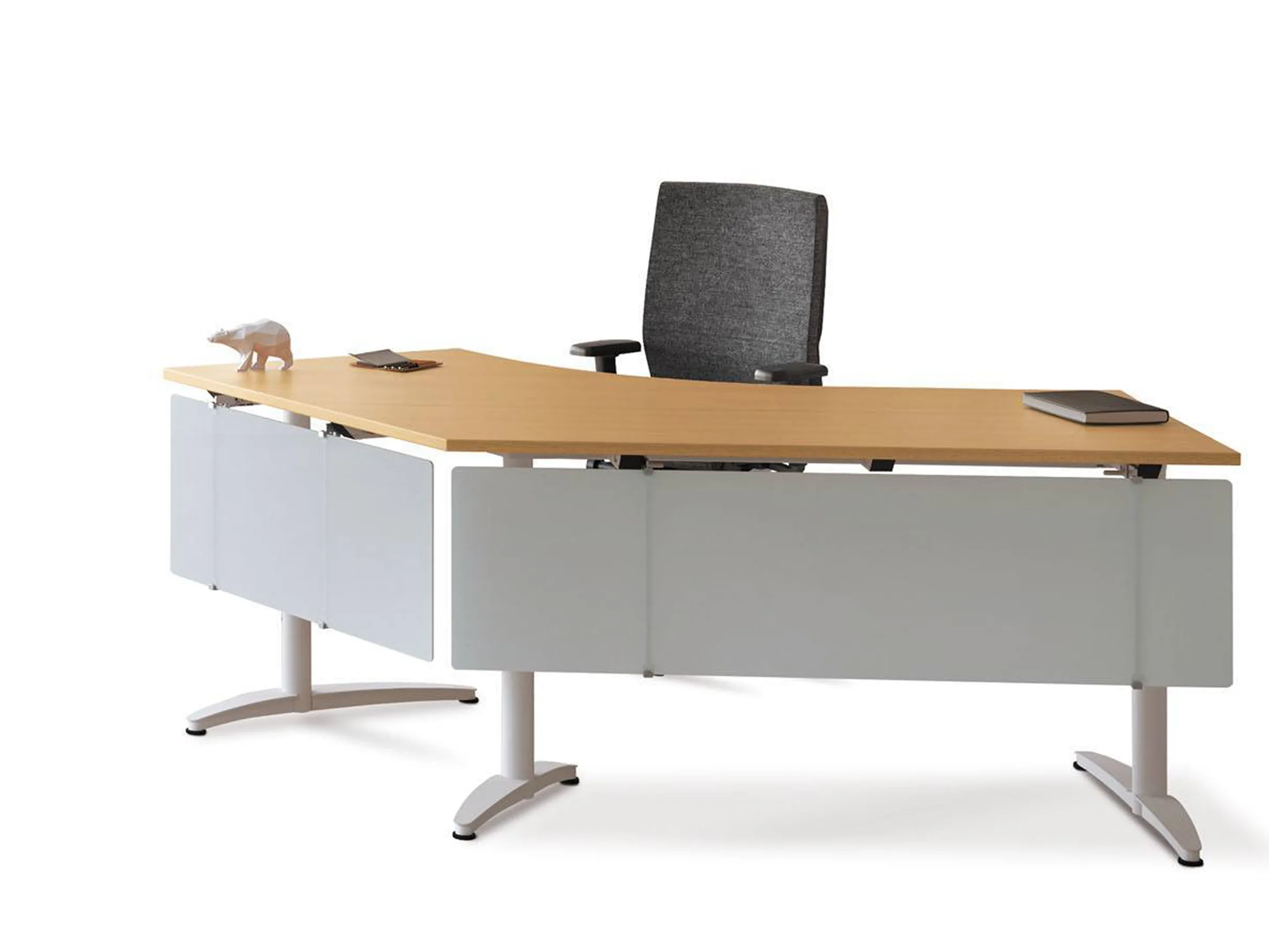 Hoekbureau met twee eindpoten (elektrisch "dubbel telescopisch" verstelbaar 650-1250mm d.m.v. bediening) en waarvan de hoek links is geplaatst. Pootdiepte rechts is 800mm, links 600mm. Totale afmeting: 2000 x 1600mm. Incl steunpoot in de hoek.