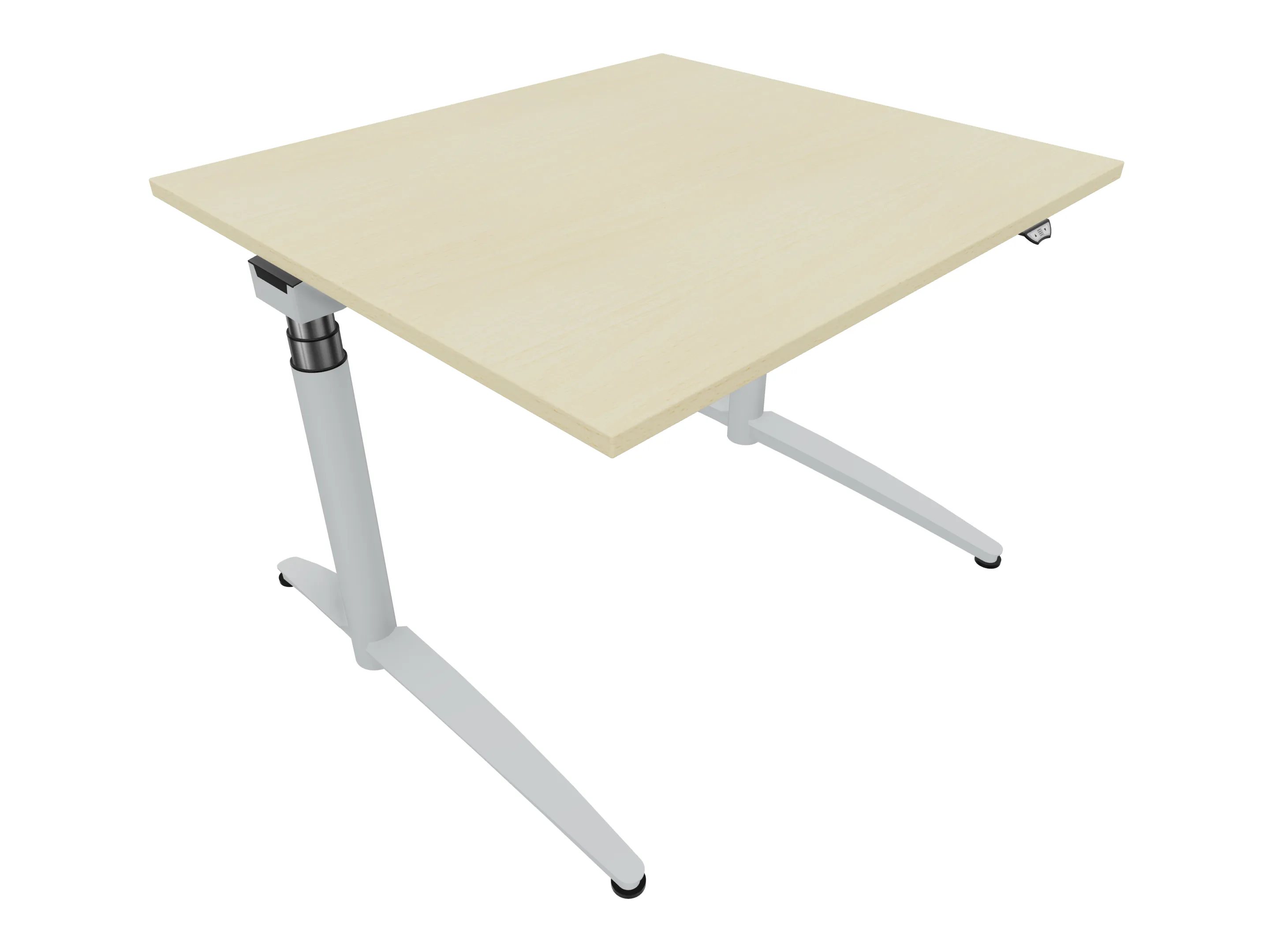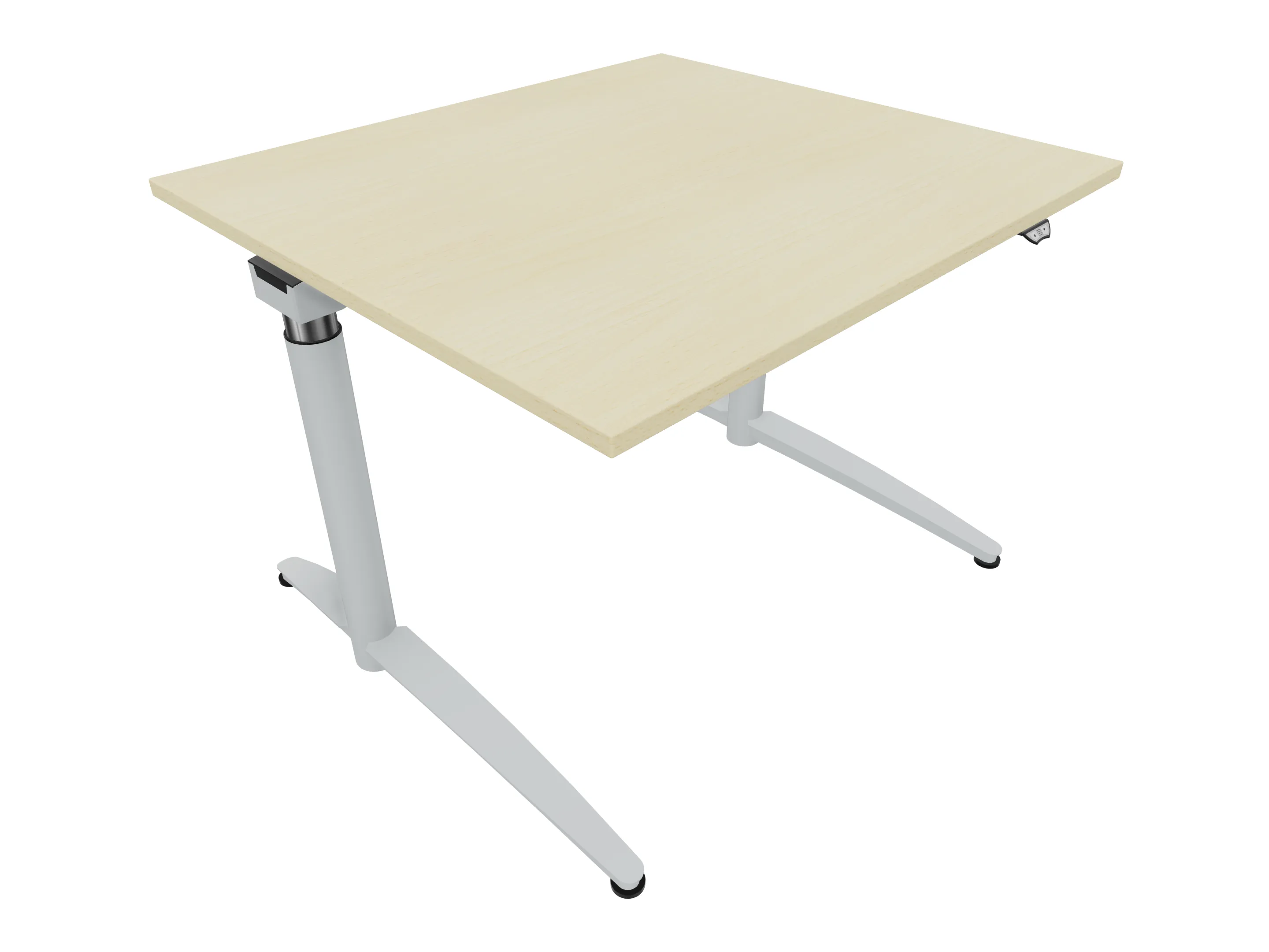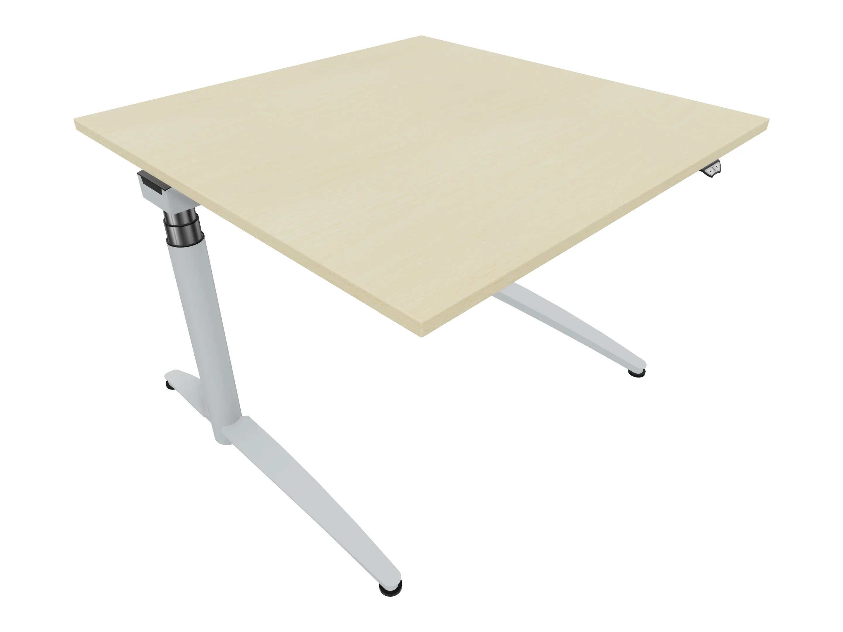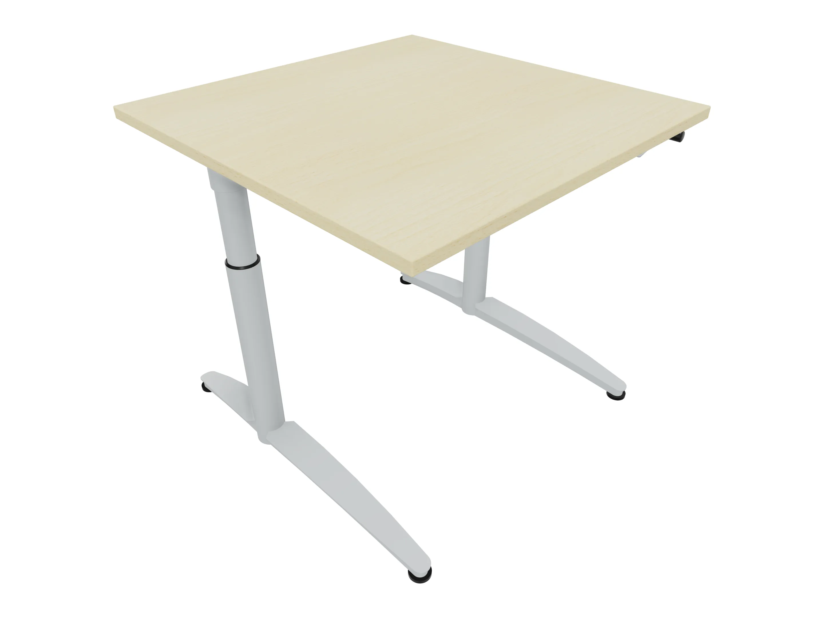 Bureau met 2 poten, waarvan de linker is teruggeplaatst en koppelbaar (T-poot, vaste hoogte 720mm) in de afmeting: 800 x 800mm (BxD)