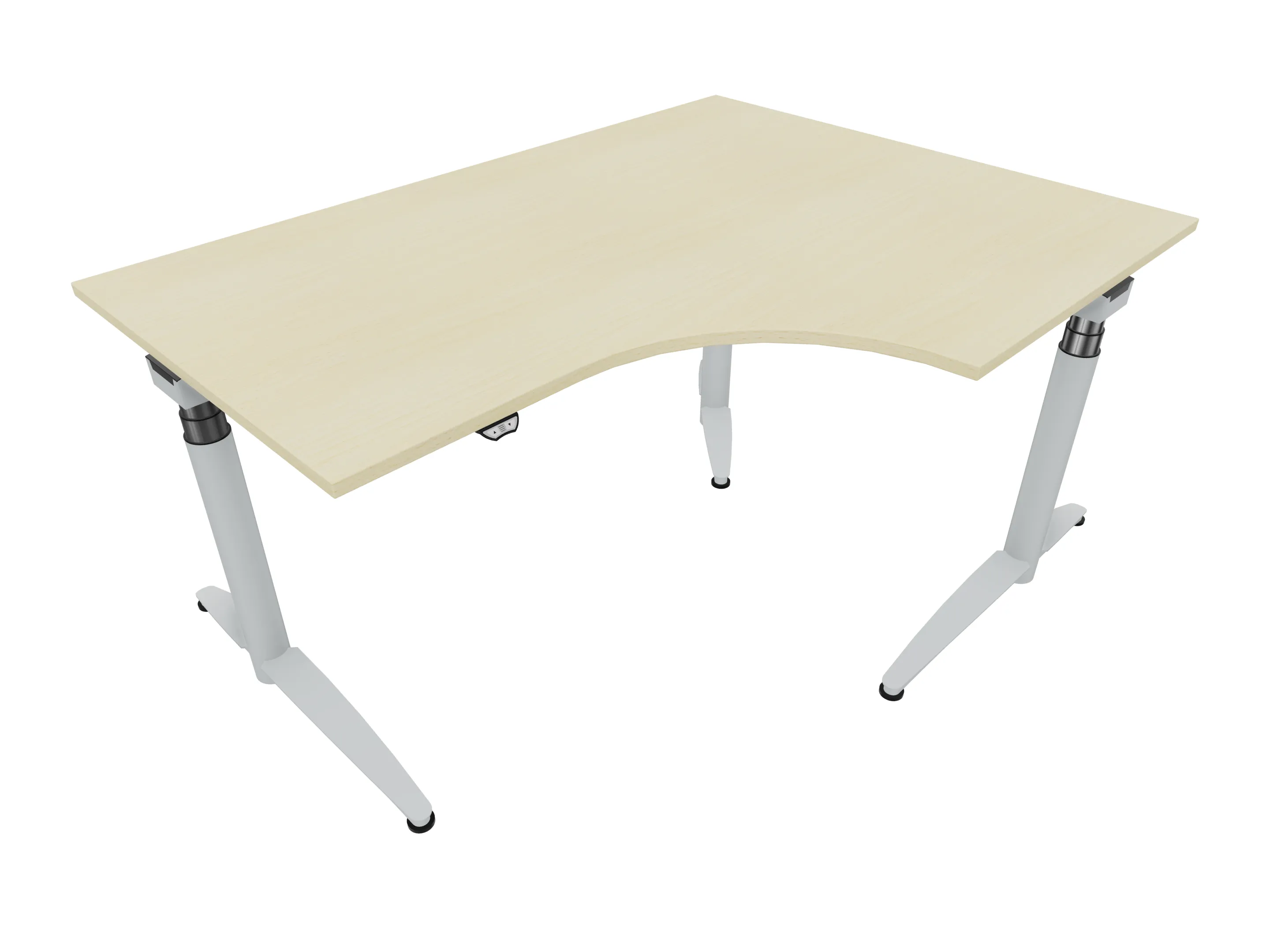 Hoekbureau met twee eindpoten (elektrisch "dubbel telescopisch" verstelbaar 650-1250mm d.m.v. bediening) en waarvan de hoek rechts is geplaatst. Pootdiepte links is 800mm, rechts 600mm. Totale afmeting: 1600 x 1400mm. Incl steunpoot in de hoek.