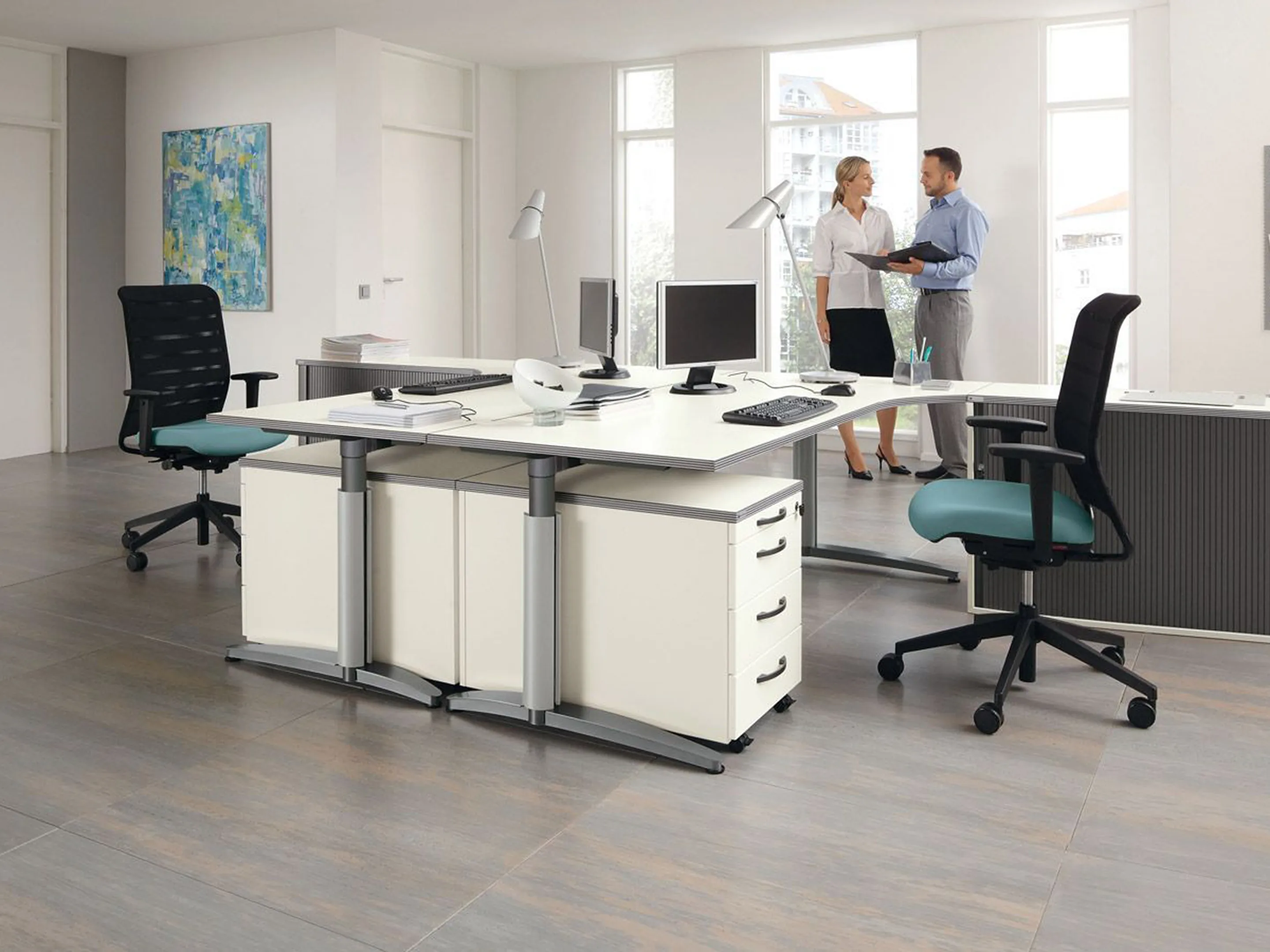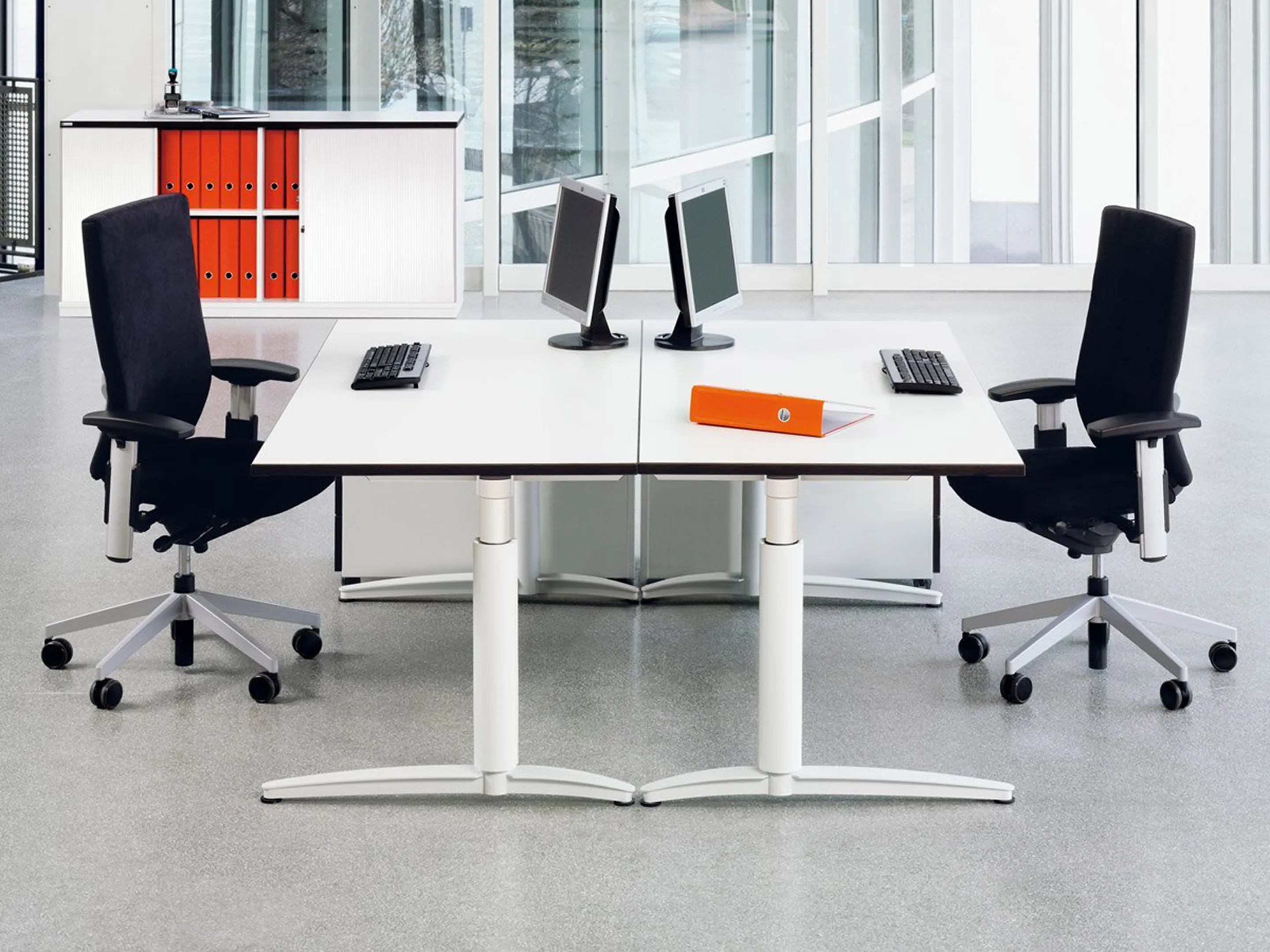 Bureau met 2 poten, waarvan de linker is teruggeplaatst en koppelbaar (T-poot, vaste hoogte 720mm) in de afmeting: 1000 x 900mm (BxD)