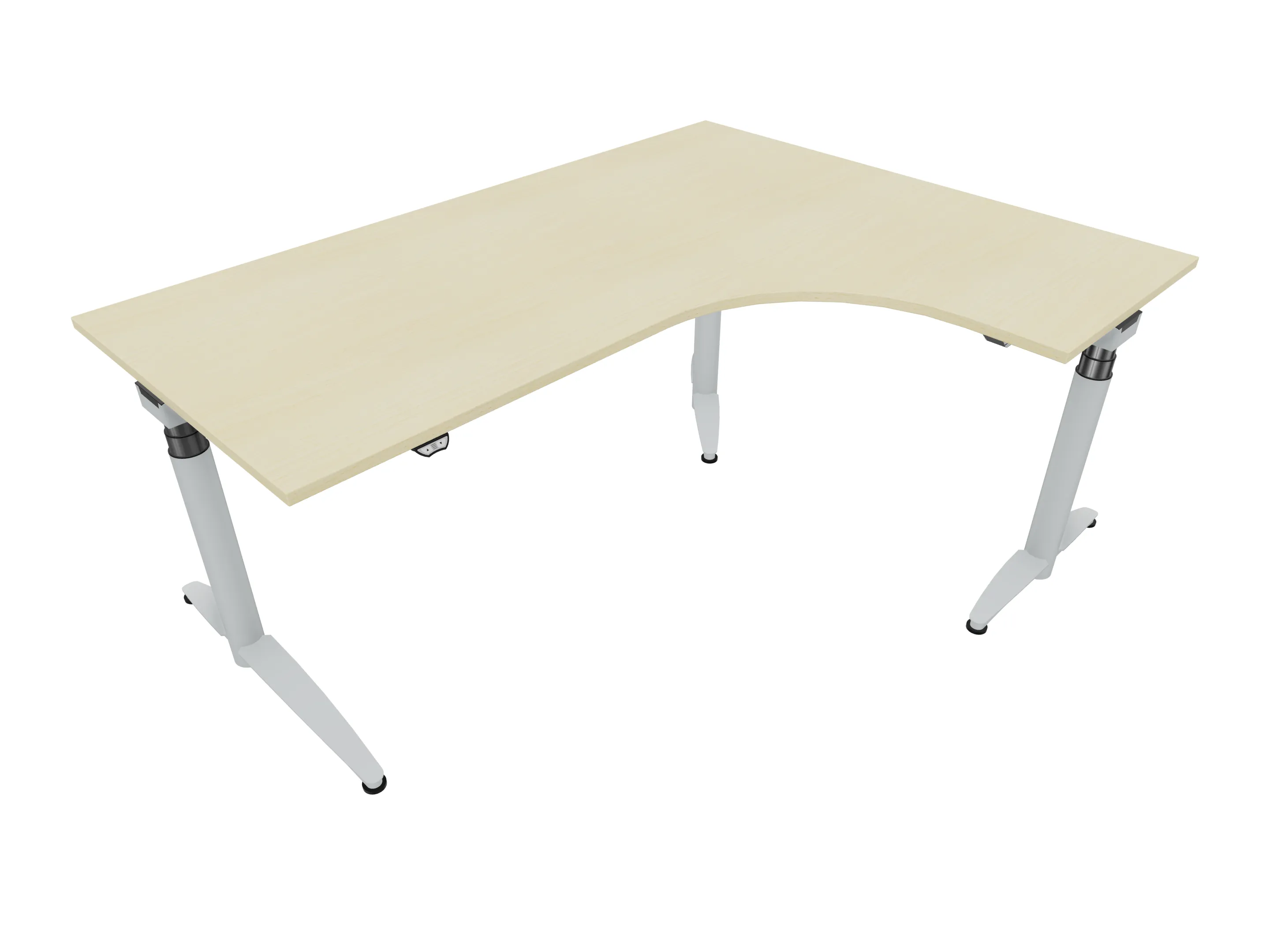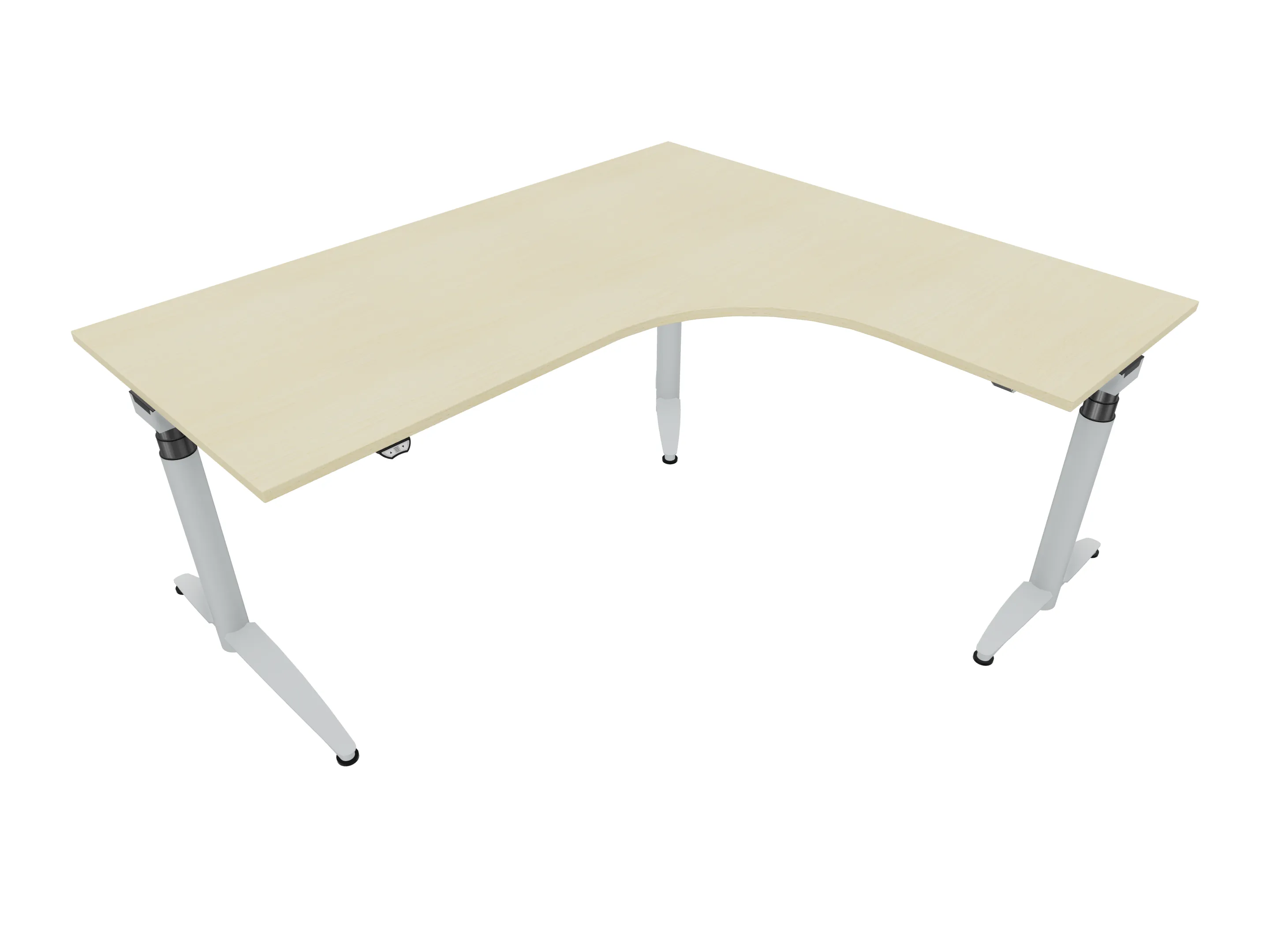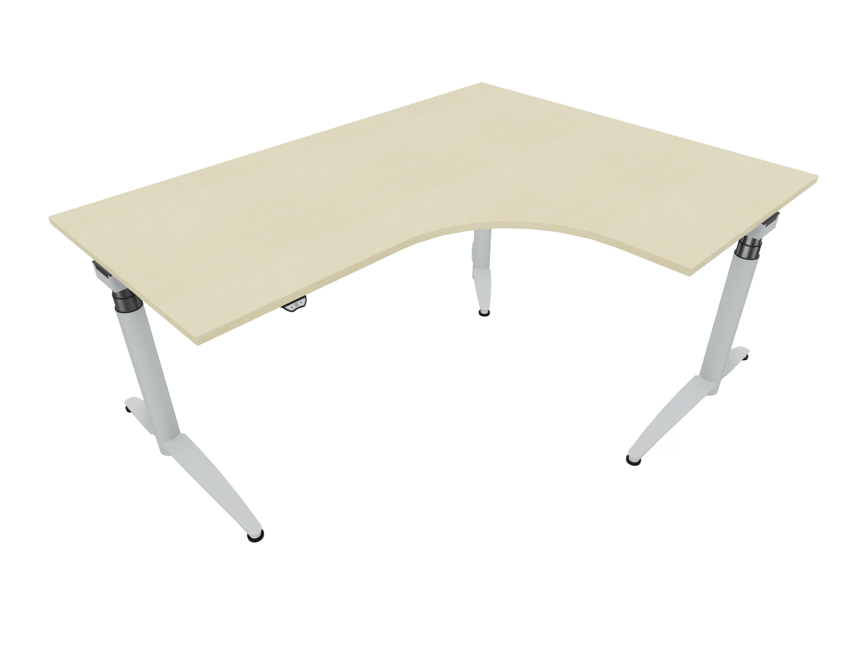Hoekbureau met twee eindpoten (elektrisch "dubbel telescopisch" verstelbaar 650-1250mm d.m.v. bediening) en waarvan de hoek rechts is geplaatst. Pootdiepte links is 800mm, rechts 800mm. Totale afmeting: 1600 x 1200mm. Incl steunpoot in de hoek.