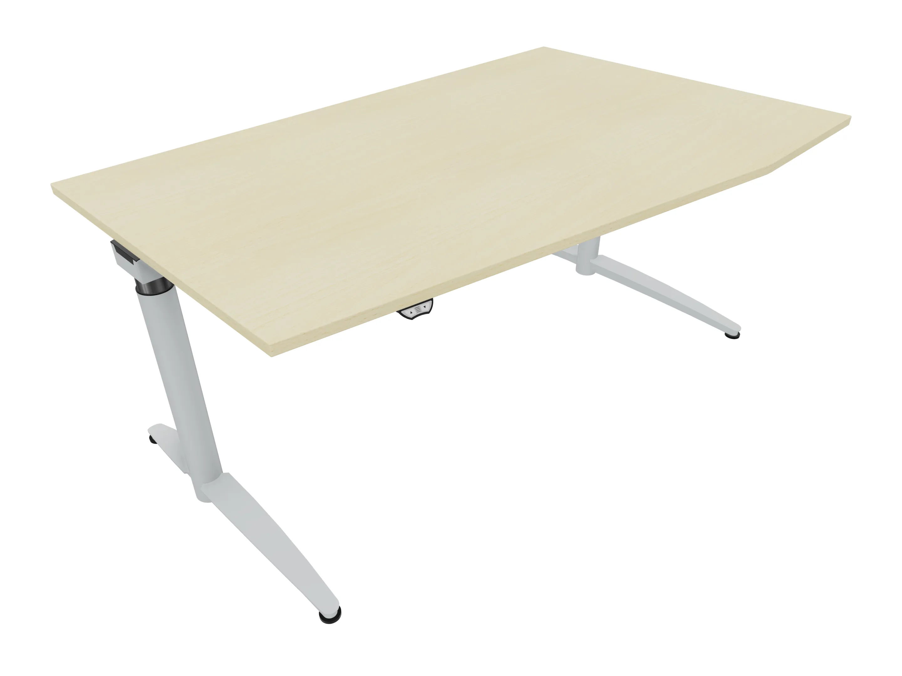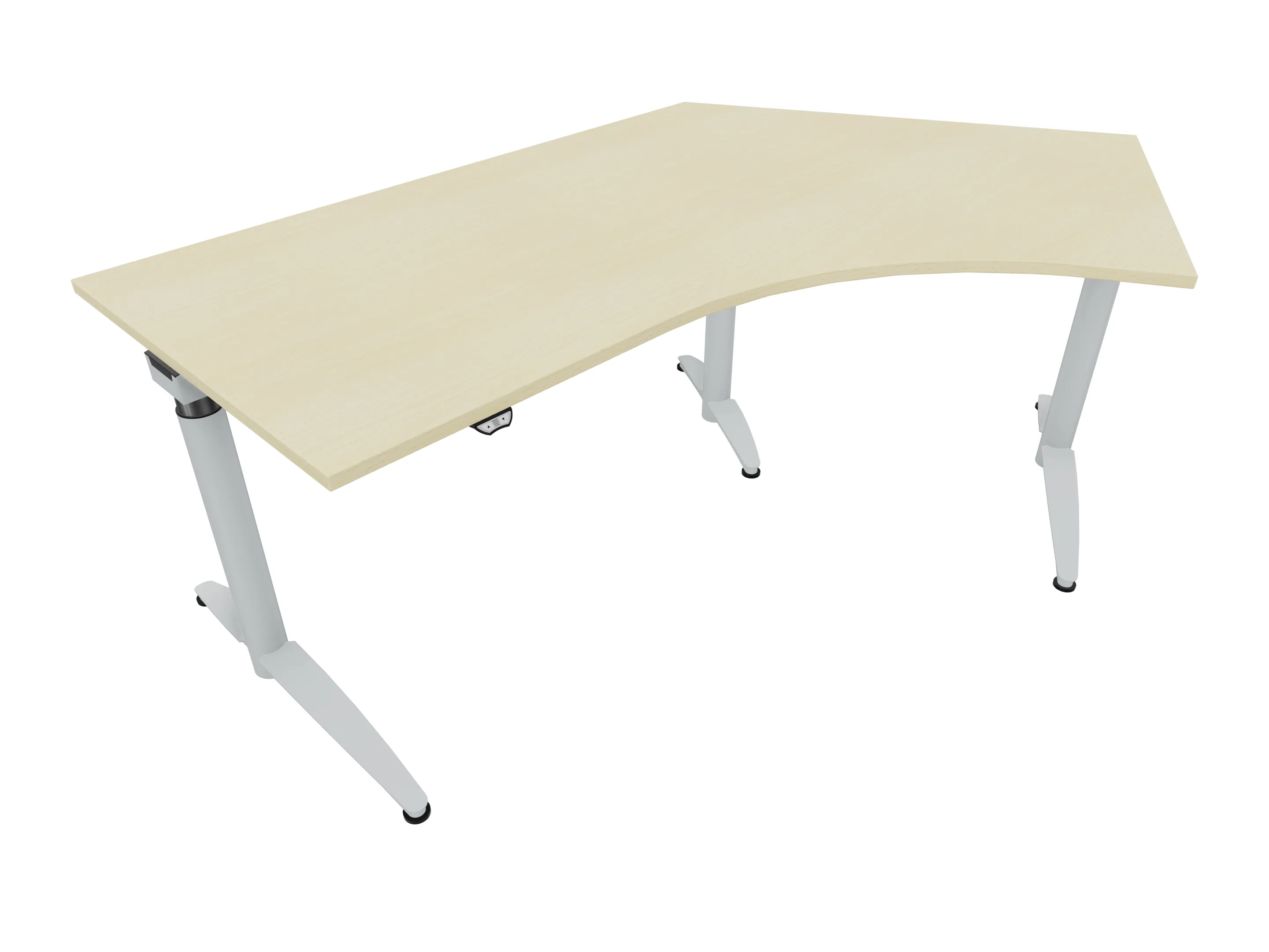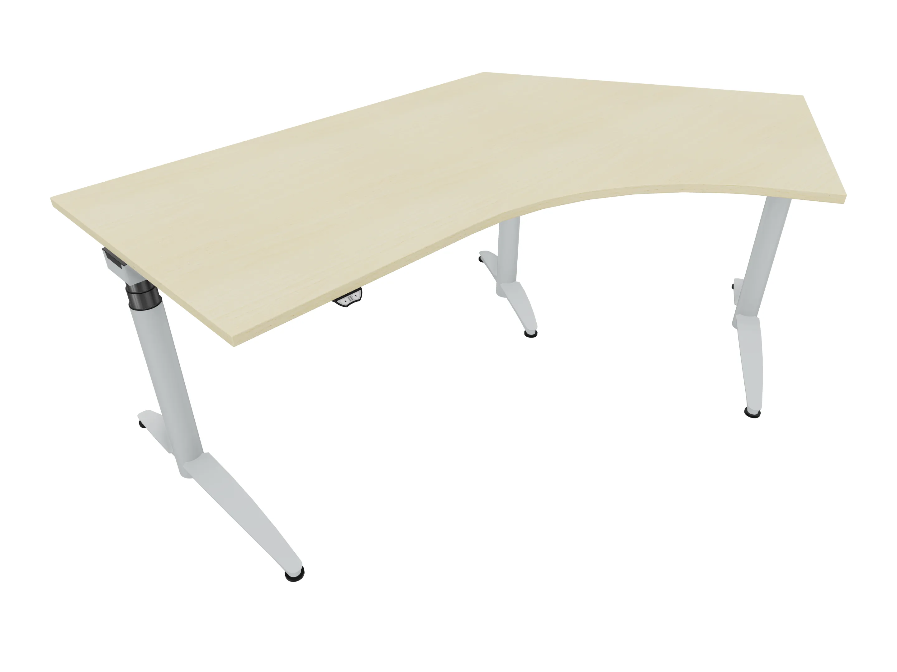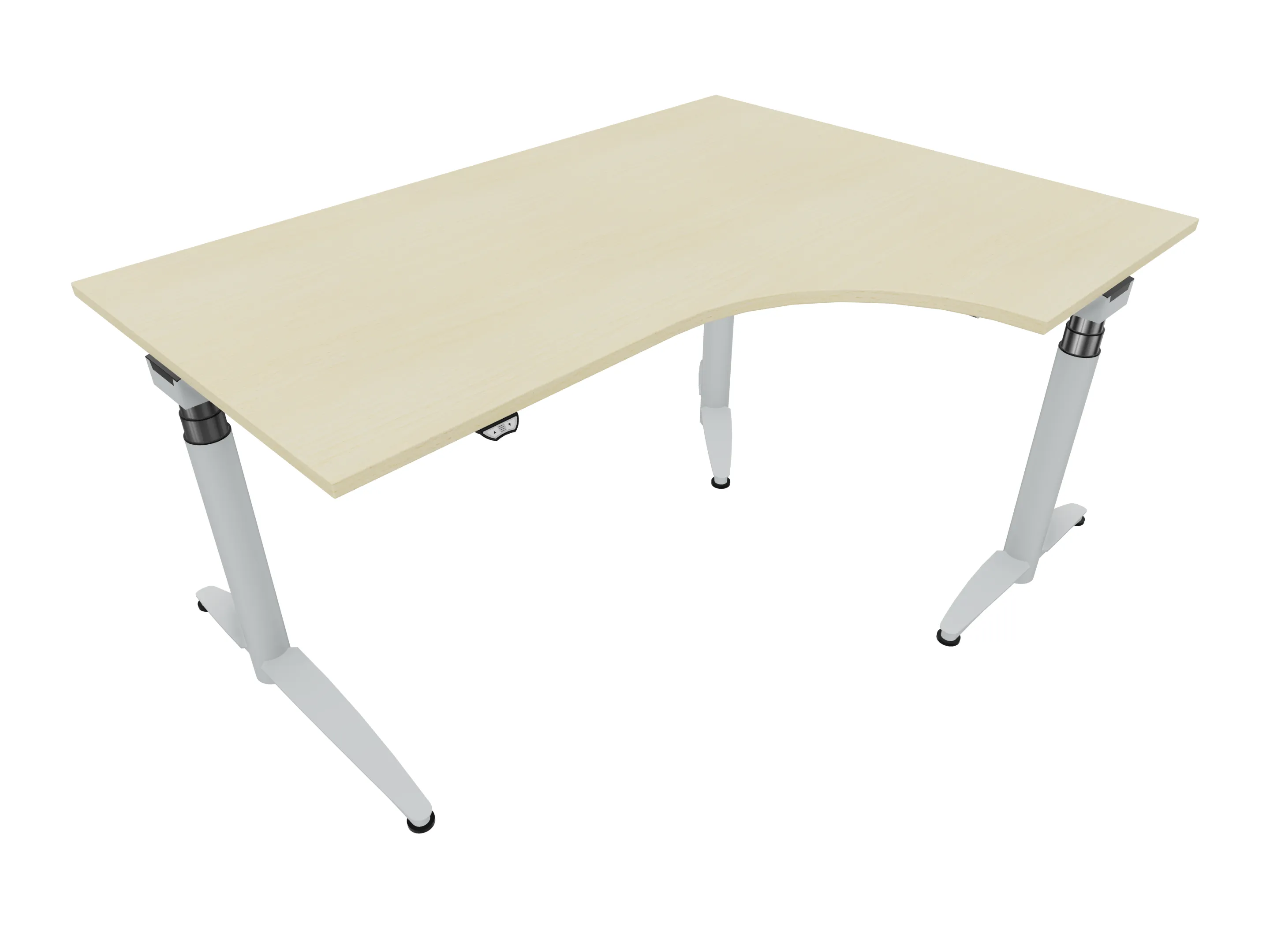 Hoekbureau met twee eindpoten (elektrisch "dubbel telescopisch" verstelbaar 650-1250mm d.m.v. bediening) en waarvan de hoek rechts is geplaatst. Pootdiepte links is 800mm, rechts 800mm. Totale afmeting: 1600 x 1200mm. Incl steunpoot in de hoek.