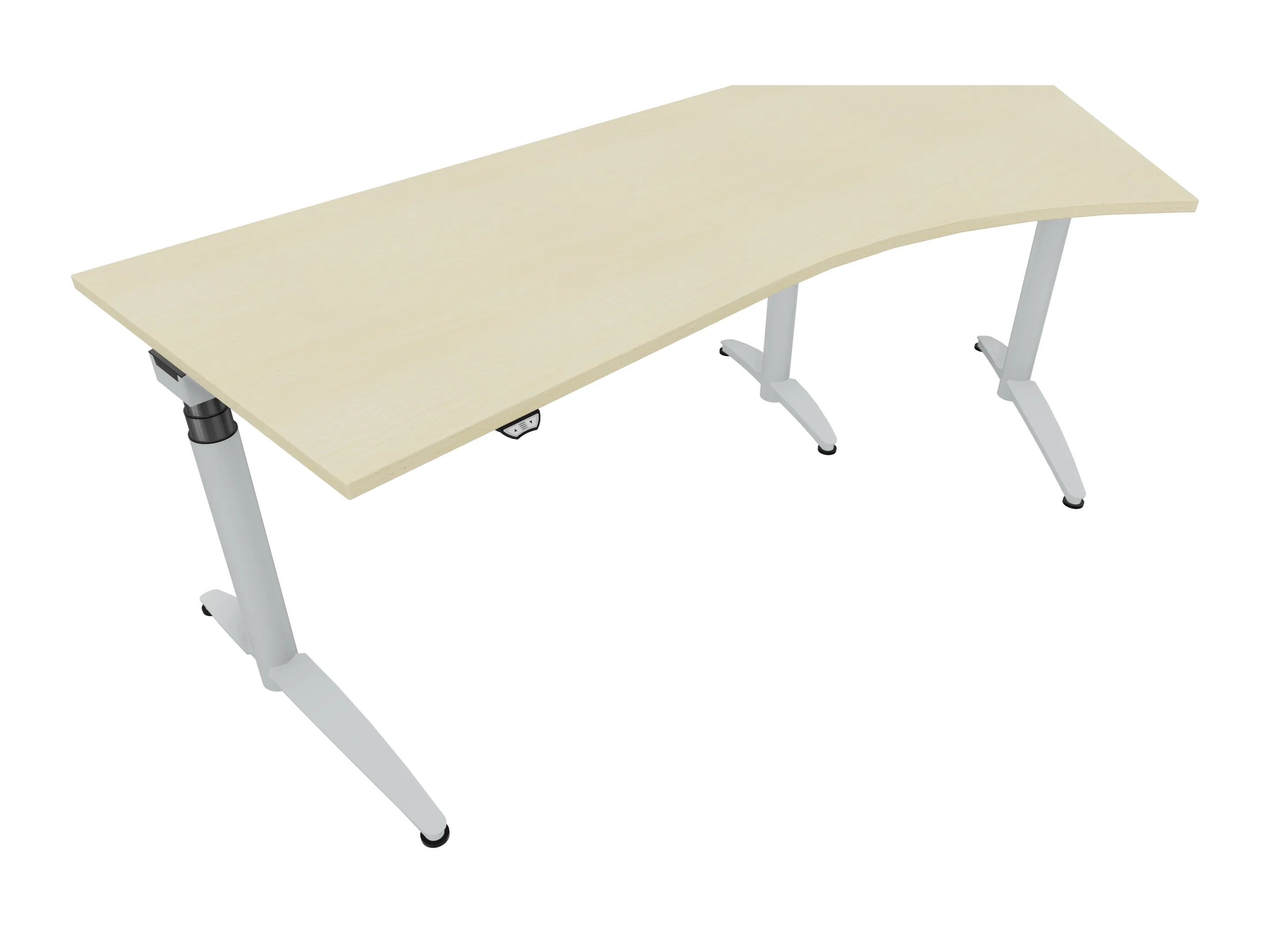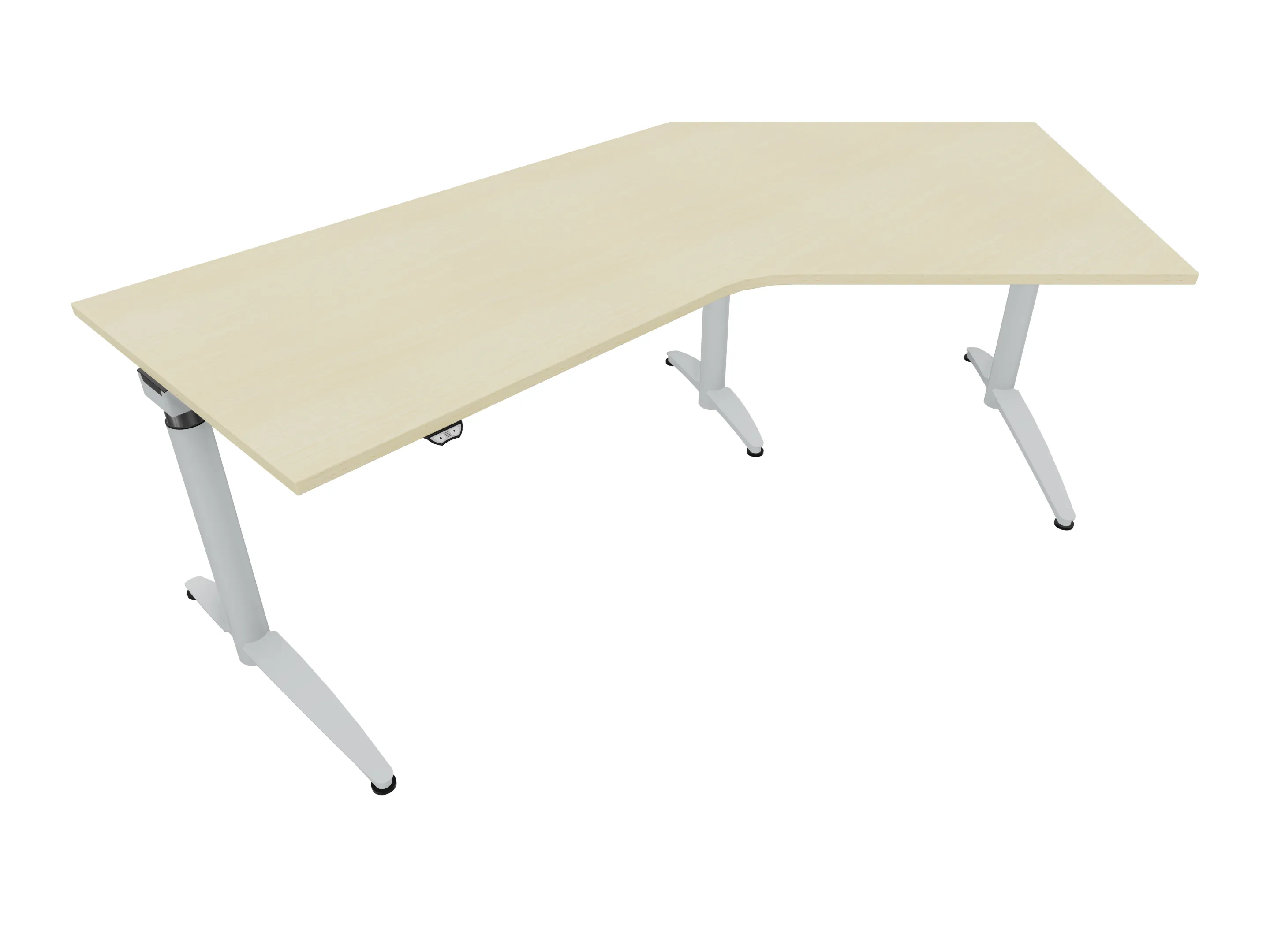 Hoekbureau met twee eindpoten (elektrisch "dubbel telescopisch" verstelbaar 650-1250mm d.m.v. bediening) en waarvan de hoek rechts is geplaatst. Pootdiepte links is 800mm, rechts 600mm. Totale afmeting: 2000 x 1200mm. Incl steunpoot in de hoek.