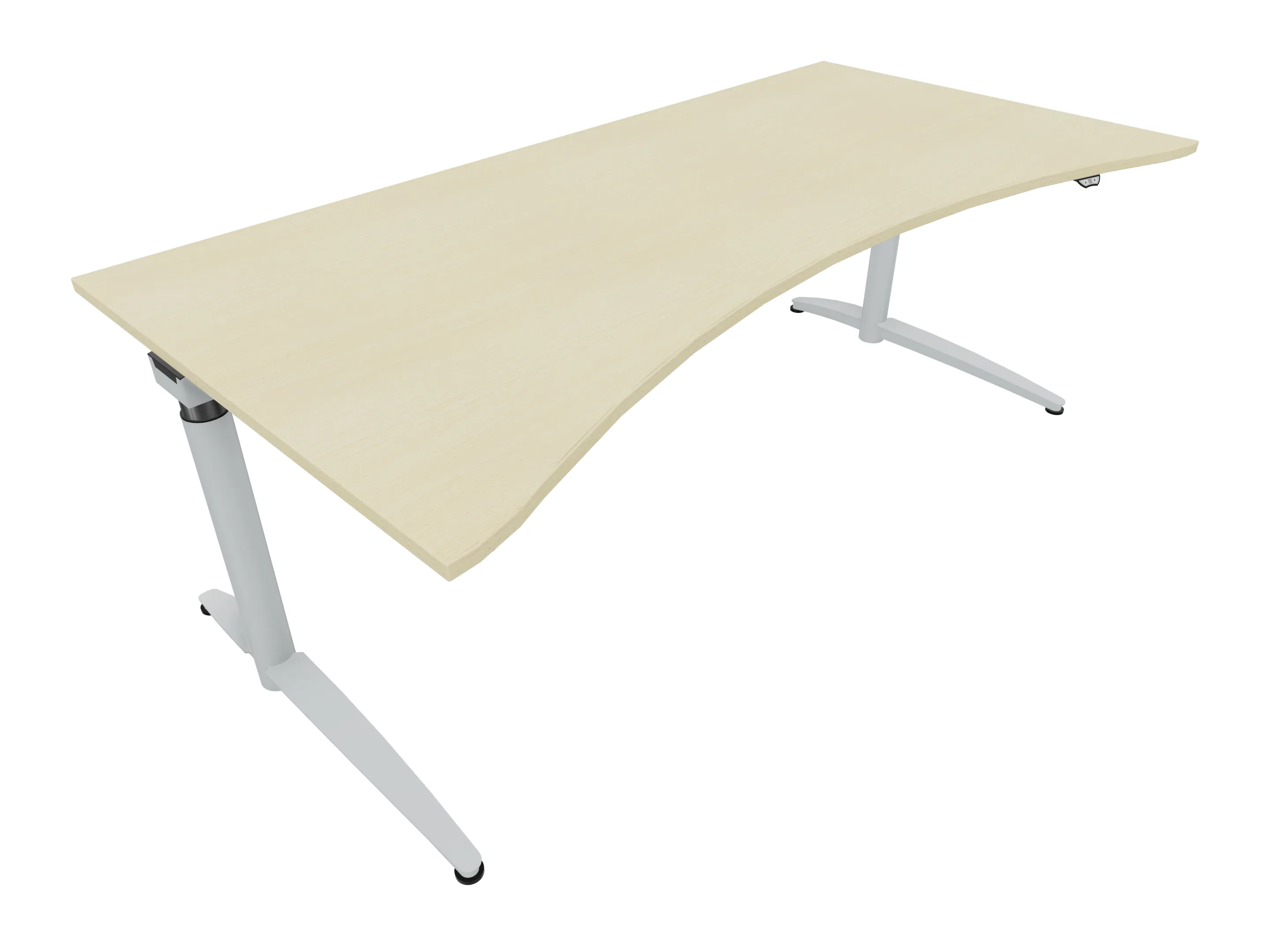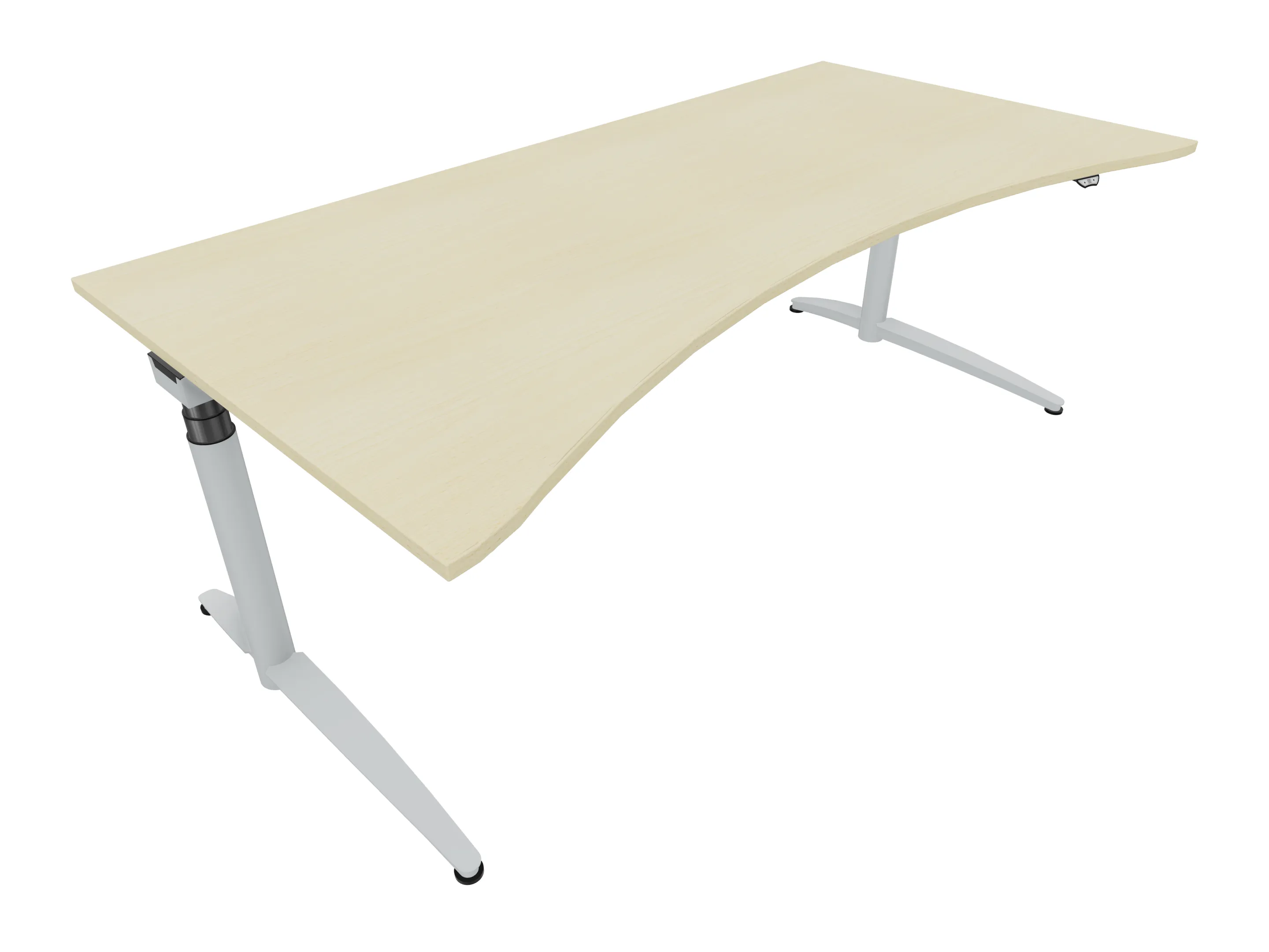Hoekbureau met twee eindpoten (elektrisch "dubbel telescopisch" verstelbaar 650-1250mm d.m.v. bediening) en waarvan de hoek rechts is geplaatst. Pootdiepte links is 800mm, rechts 800mm. Totale afmeting: 2000 x 1200mm. Incl steunpoot in de hoek.