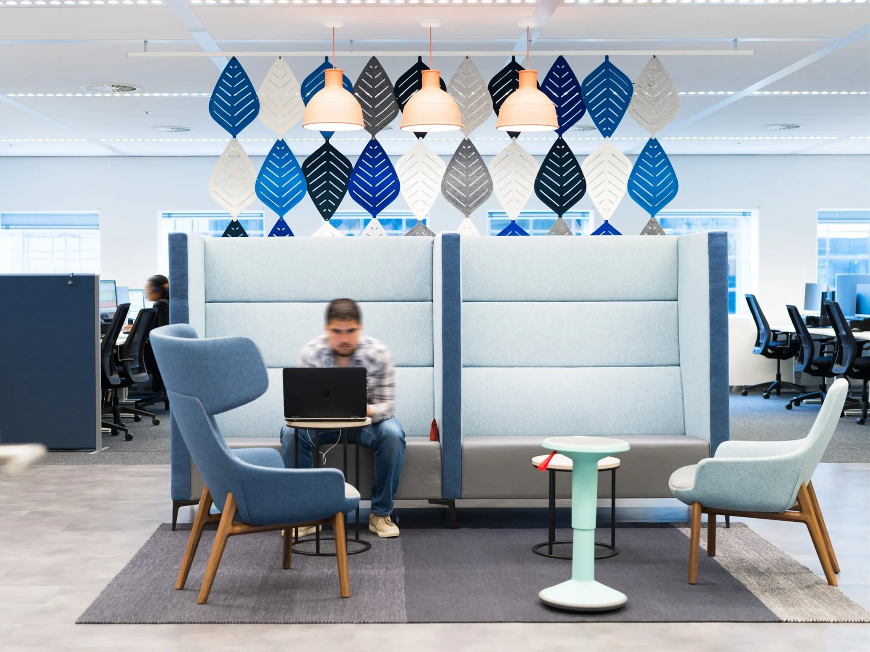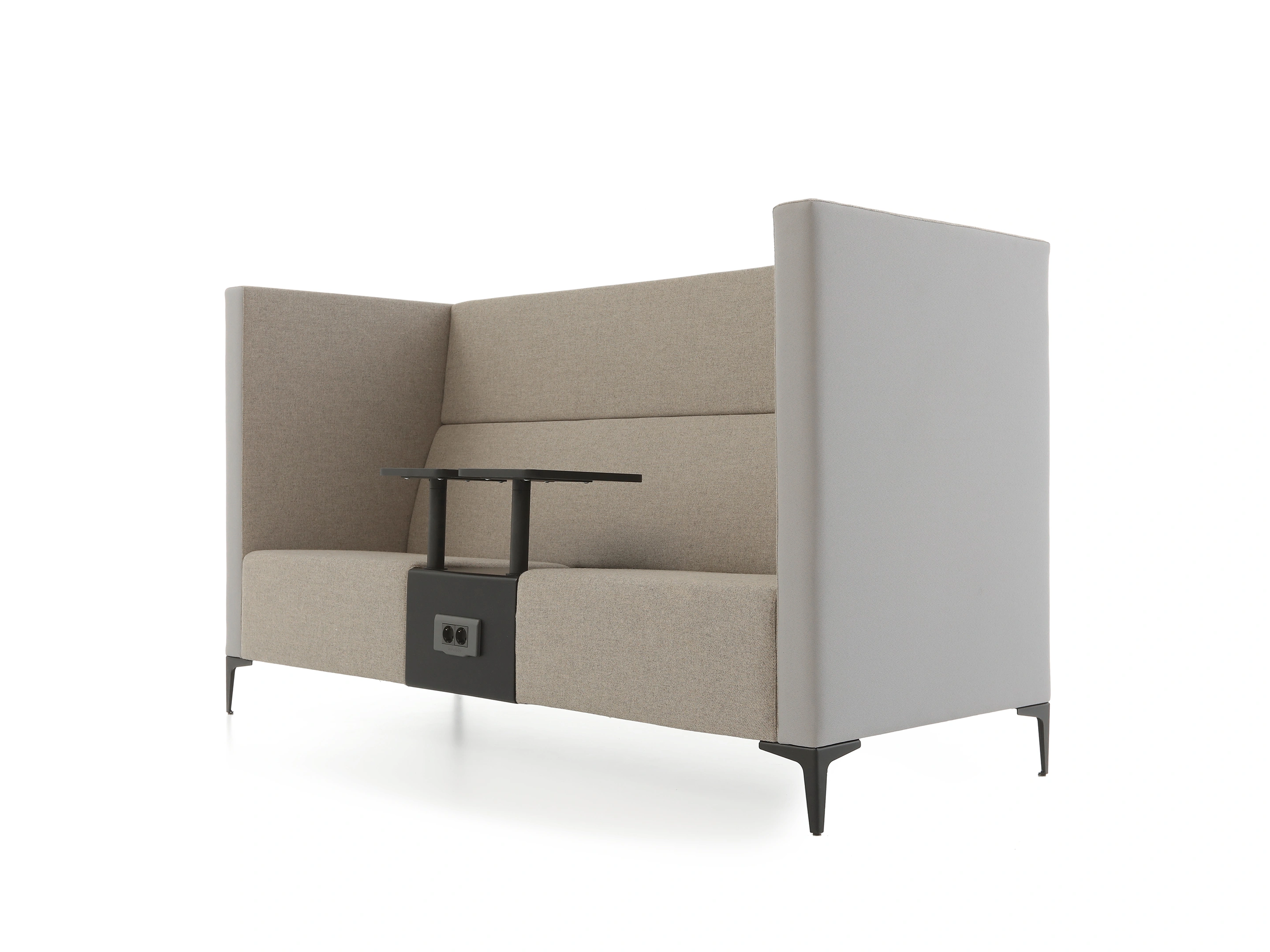 Volledig gestoffeerde bank met hoge rug en zijpanelen. Voorzien van twee draaiende laptop tafels. Afmeting: 200x83x150cm (BxDxH)