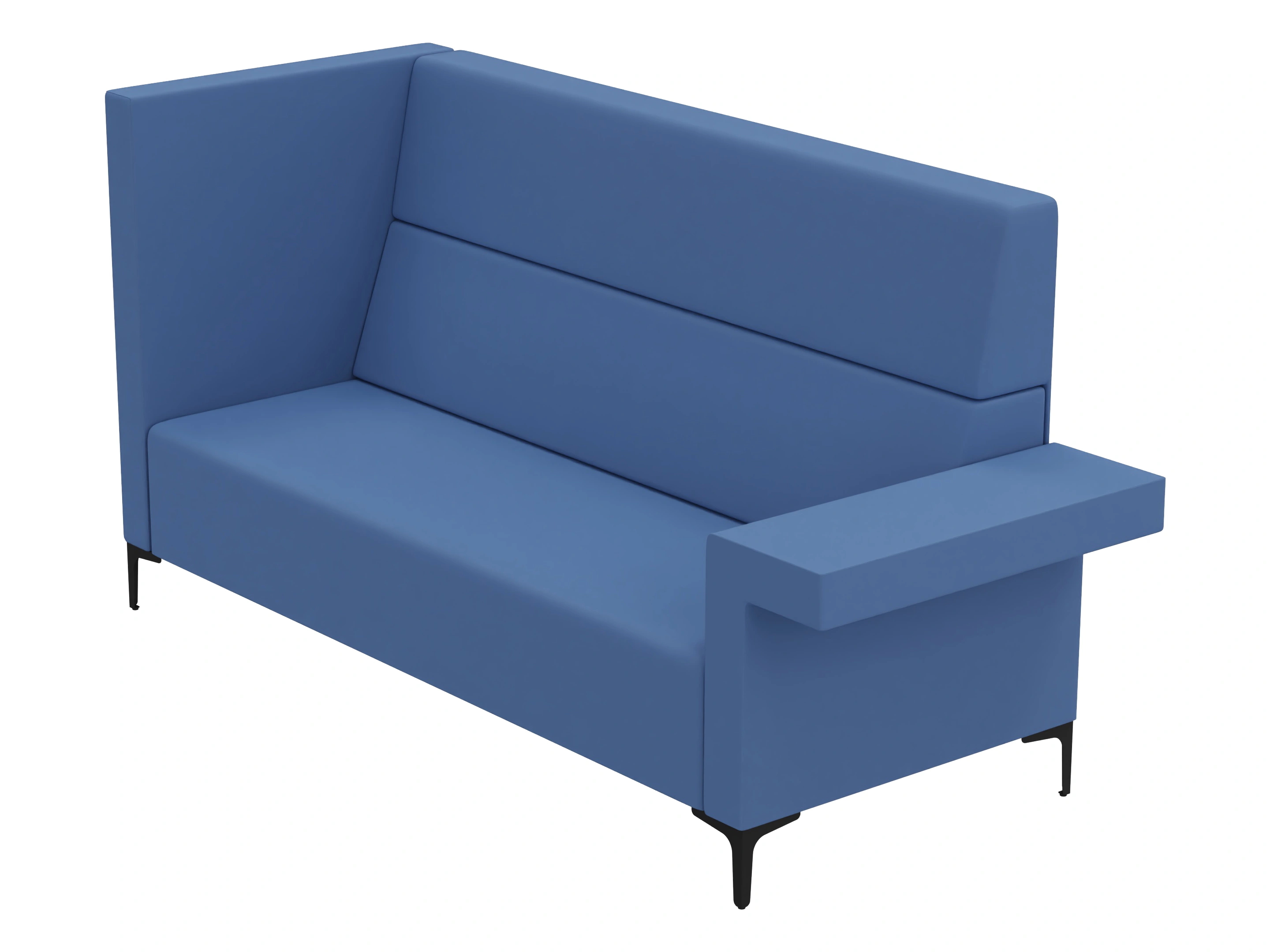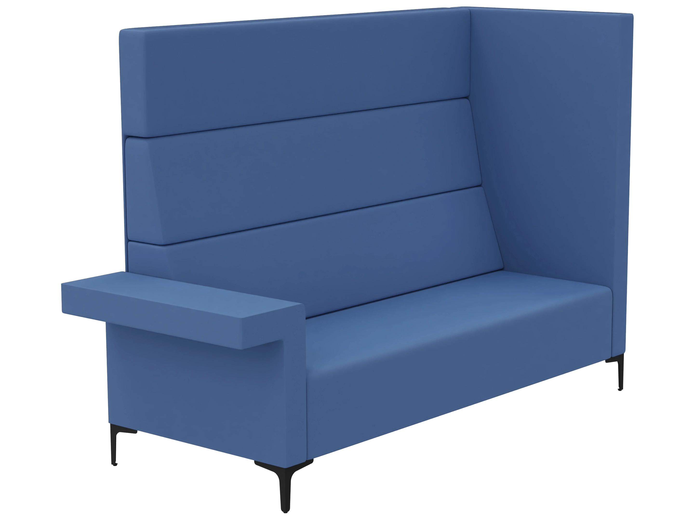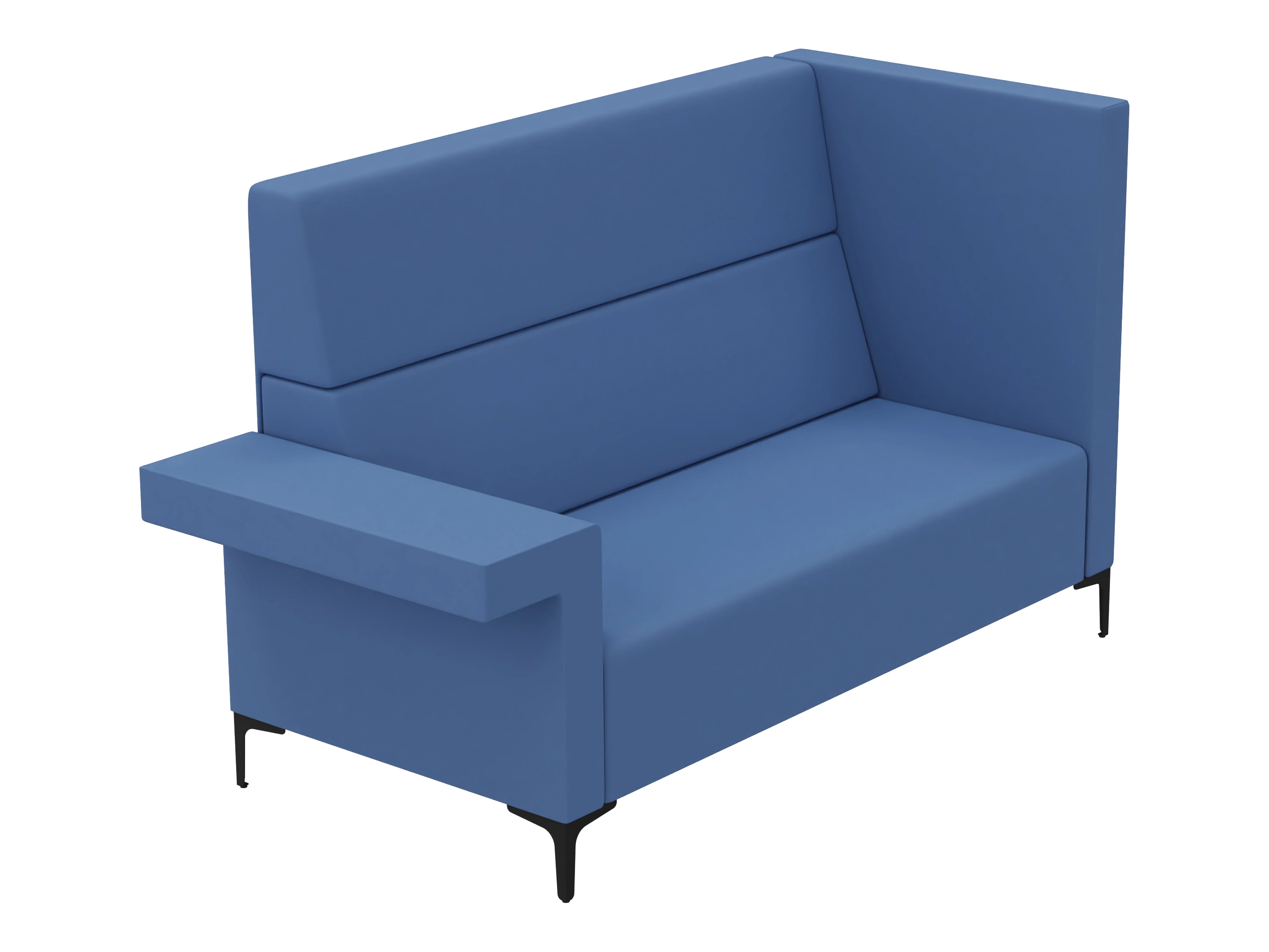 Volledig gestoffeerde 2-zits bank met hoge rug en één zijpaneel. Links voorzien van een laag deel/ armsteun (vanaf zittende positie). Afmeting: 160x83x150cm (BxDxH)