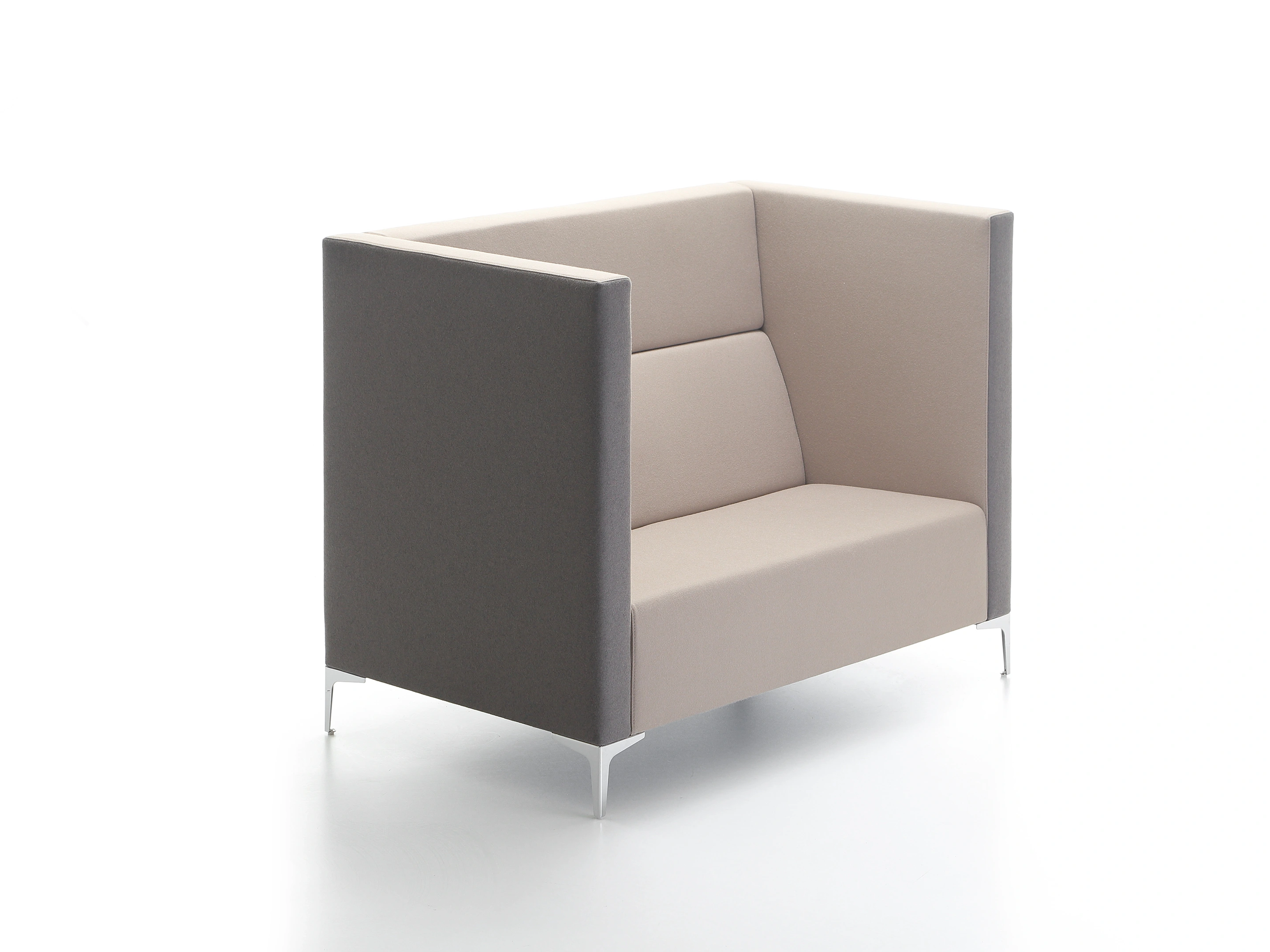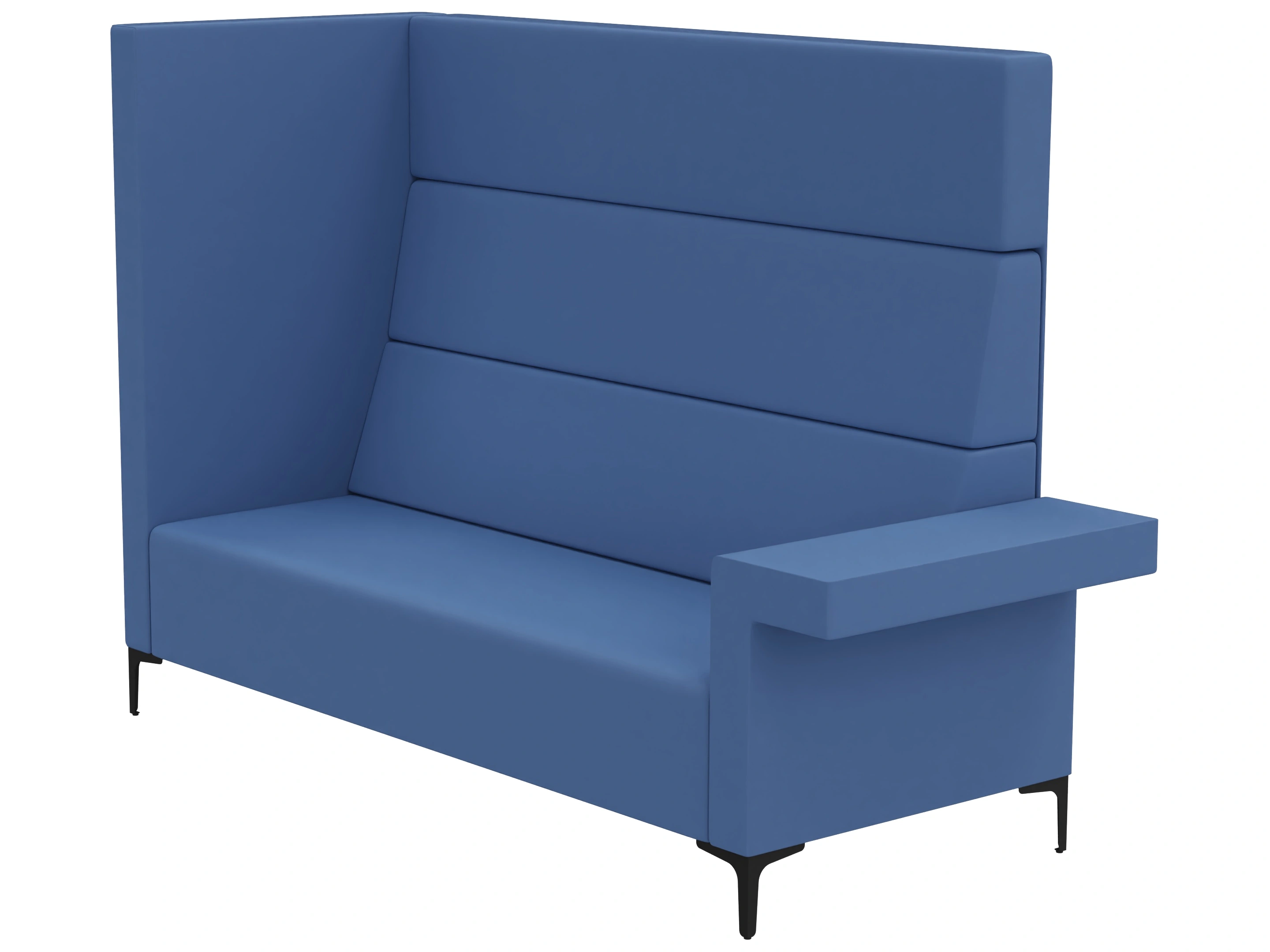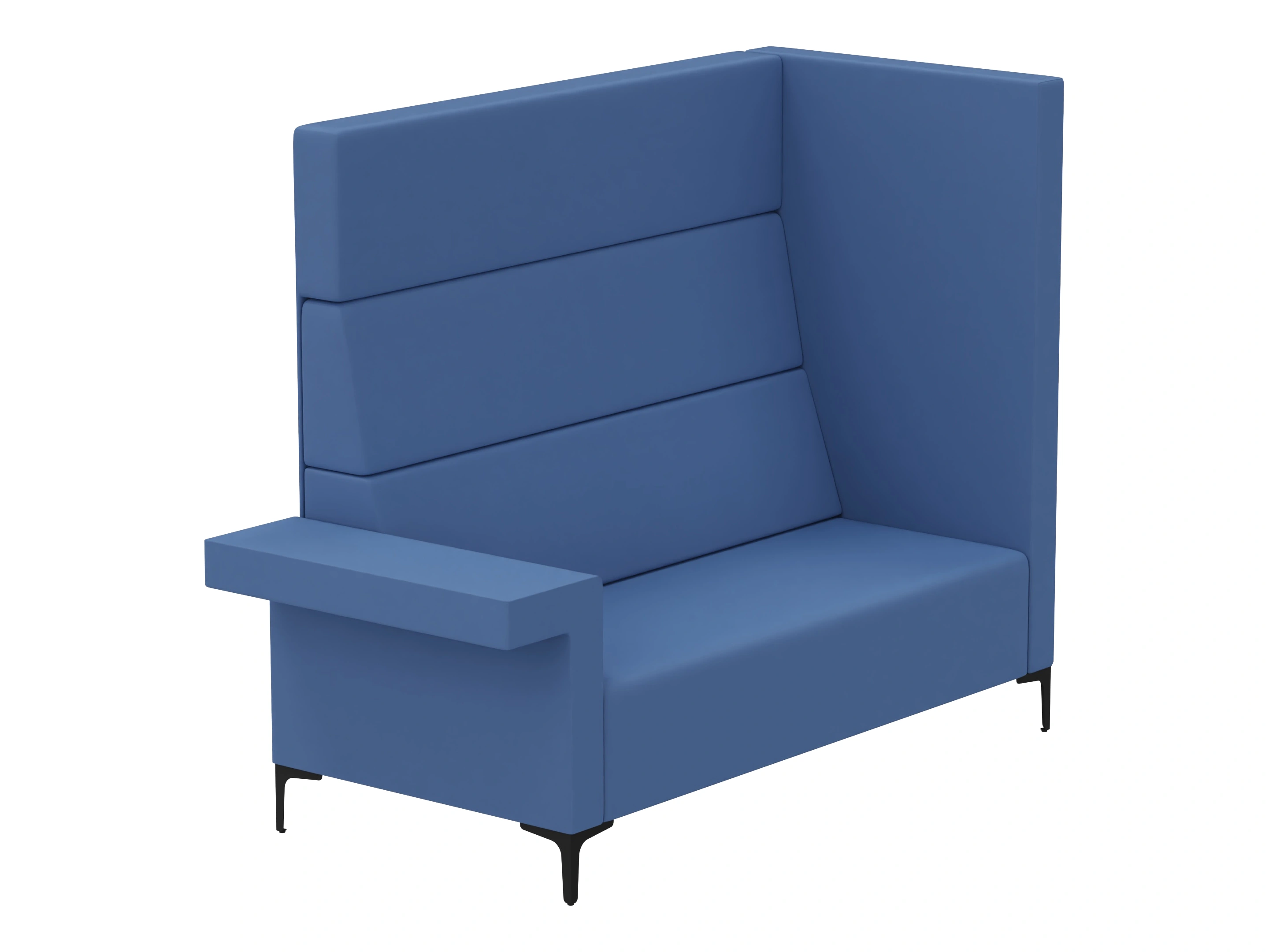 Volledig gestoffeerde 2-zits bank met hoge rug en één zijpaneel. Links voorzien van een laag deel/ armsteun (vanaf zittende positie). Afmeting: 160x83x150cm (BxDxH)