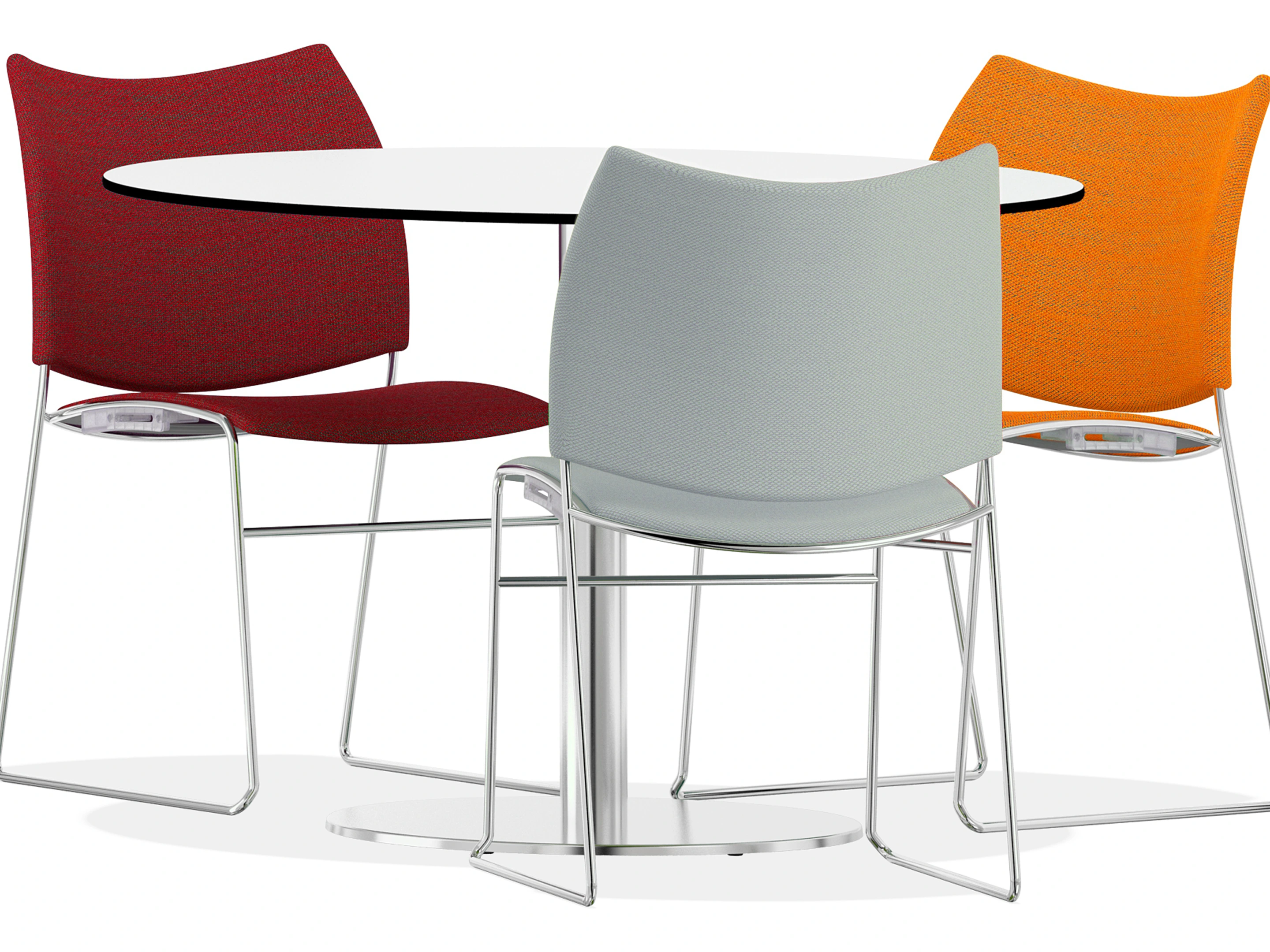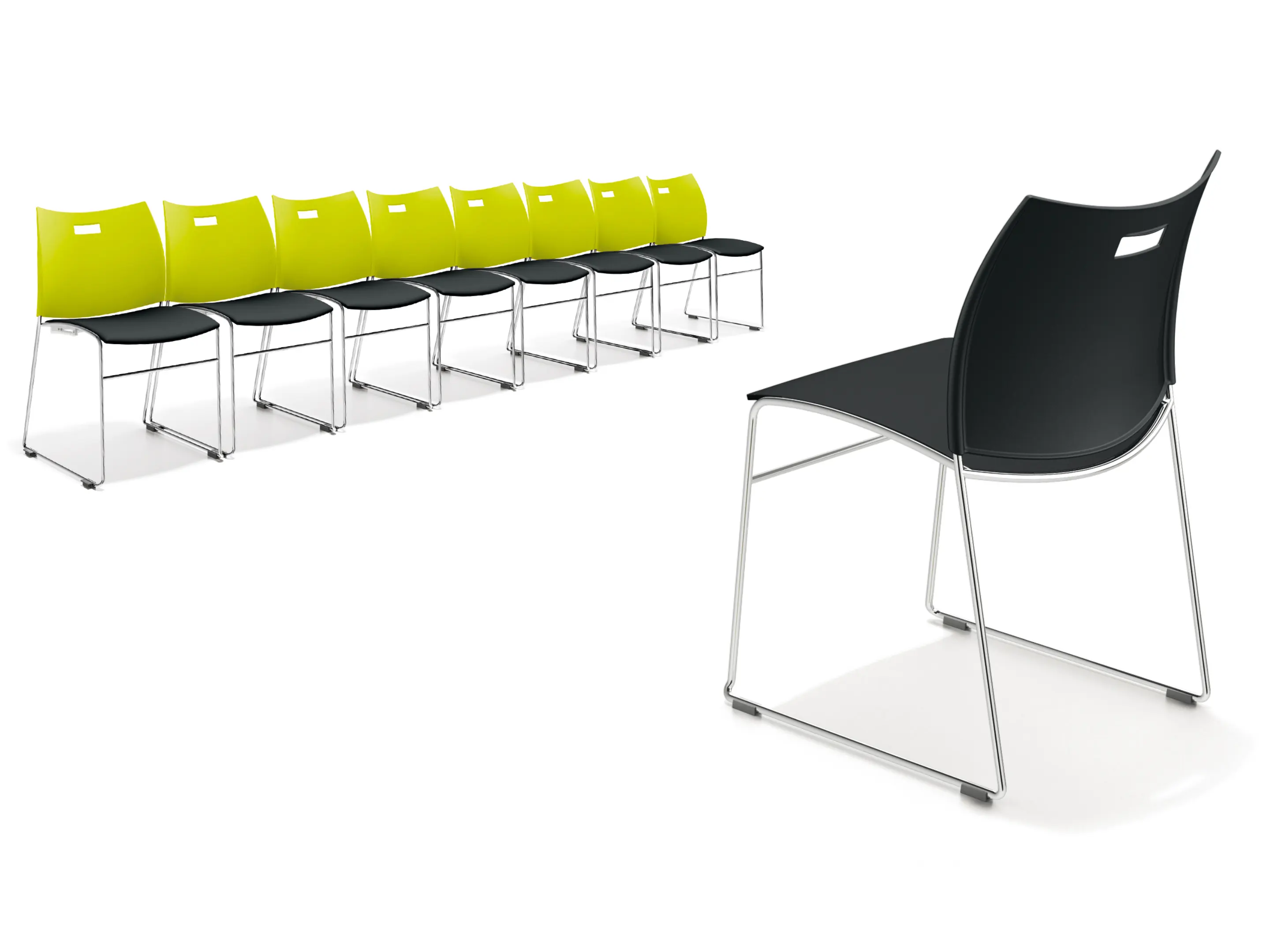 Sledeframe met een gestoffeerde rug en zitting. Stapelbaar tot 25 stoelen op transportwagen, 6 stuks vrijstaand.