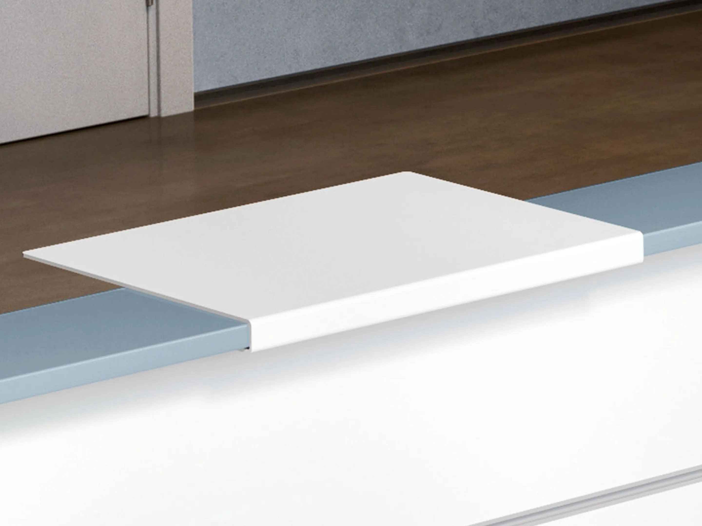 Zijpaneel met een afneembaar functiepaneel. Balie heeft links en rechts een 90º hoekverbinding (uitsluitend verbinding met frontpanelen) en de bruikbare breedte is 800mm. Afmeting: 956 x 1150 x 160mm (BxHxD)