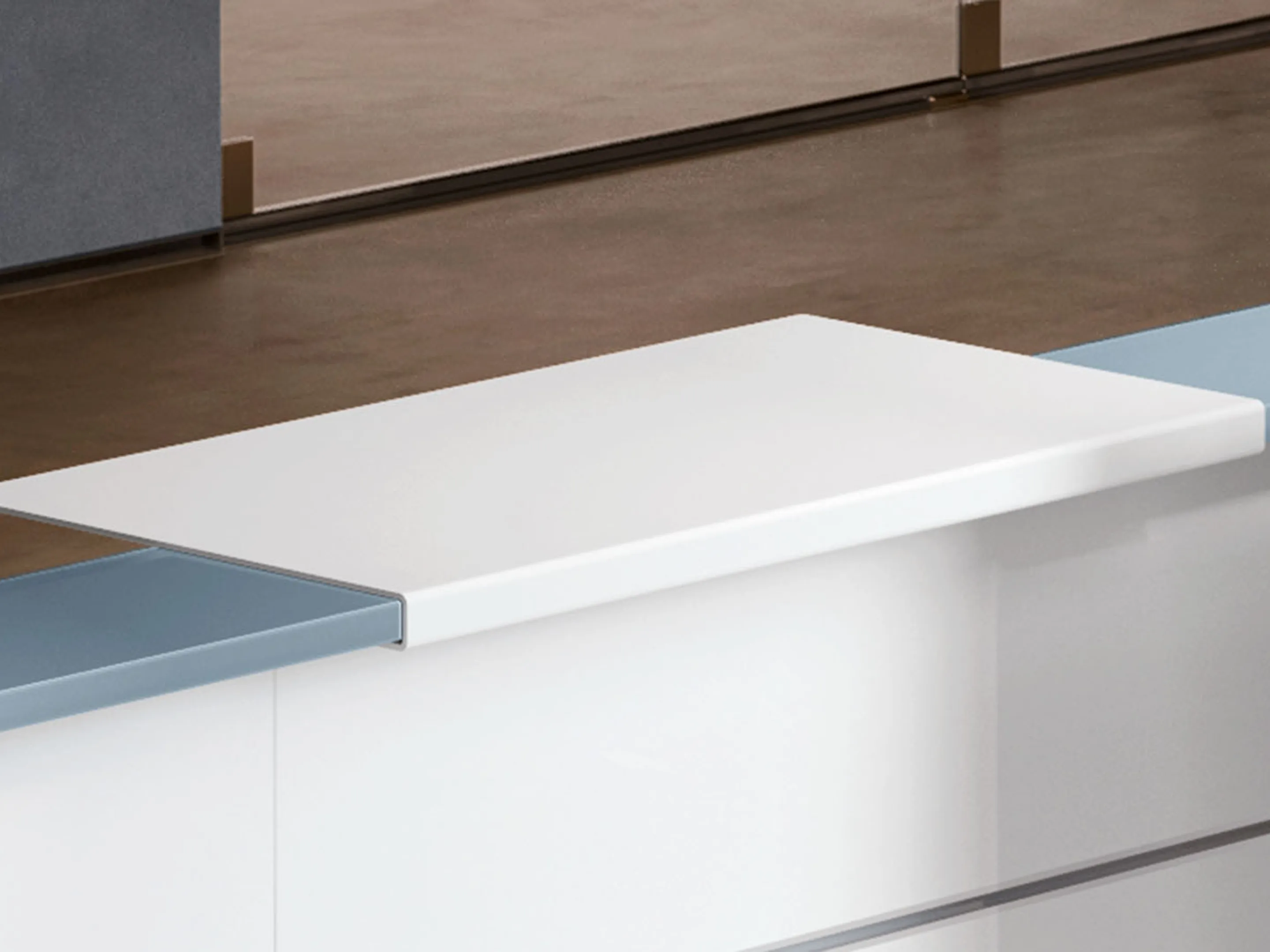 Zijpaneel met een afneembaar functiepaneel. Balie heeft links en rechts een 90º hoekverbinding (uitsluitend verbinding met frontpanelen) en de bruikbare breedte is 1800mm. Afmeting: 1956 x 1150 x 160mm (BxHxD)