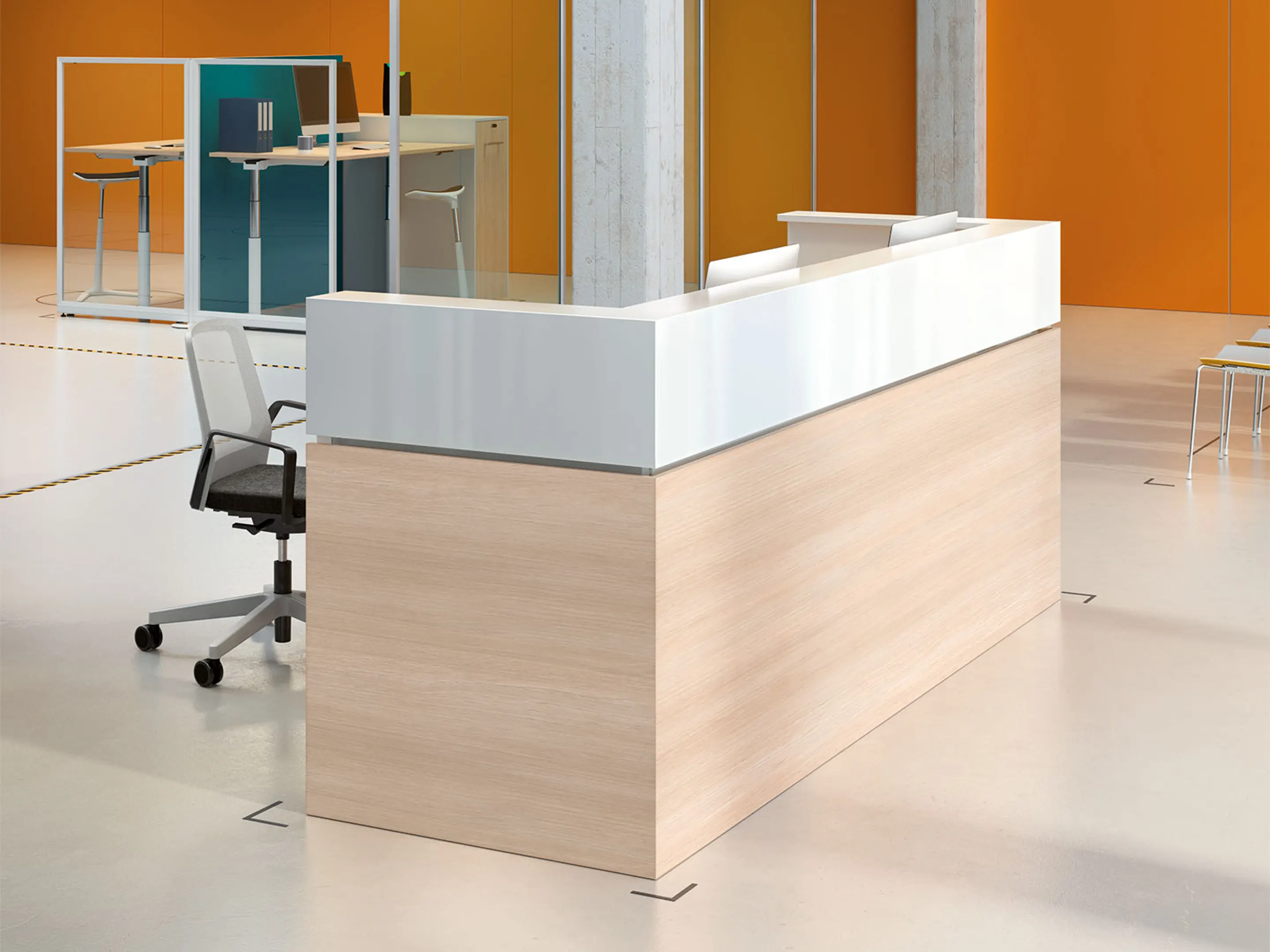 Frontpaneel met een afneembaar functiepaneel. Balie is links lineair koppelbaar met andere elementen, rechts gesloten en de bruikbare breedte is 1800mm. Afmeting: 1800 x 1150 x 160mm (BxHxD)
