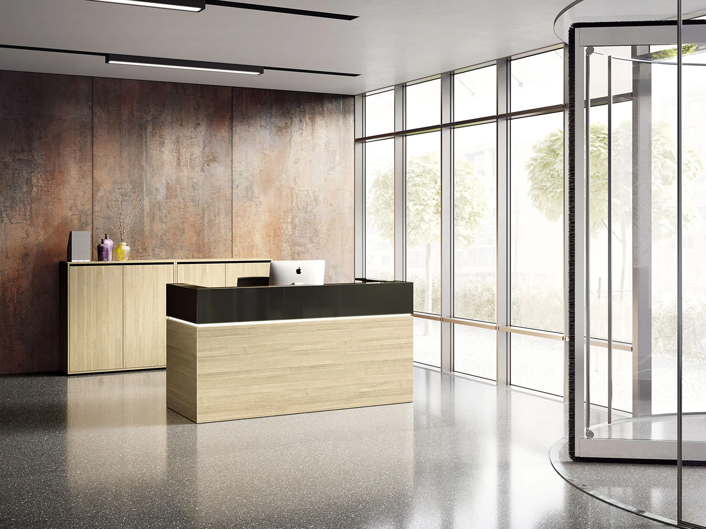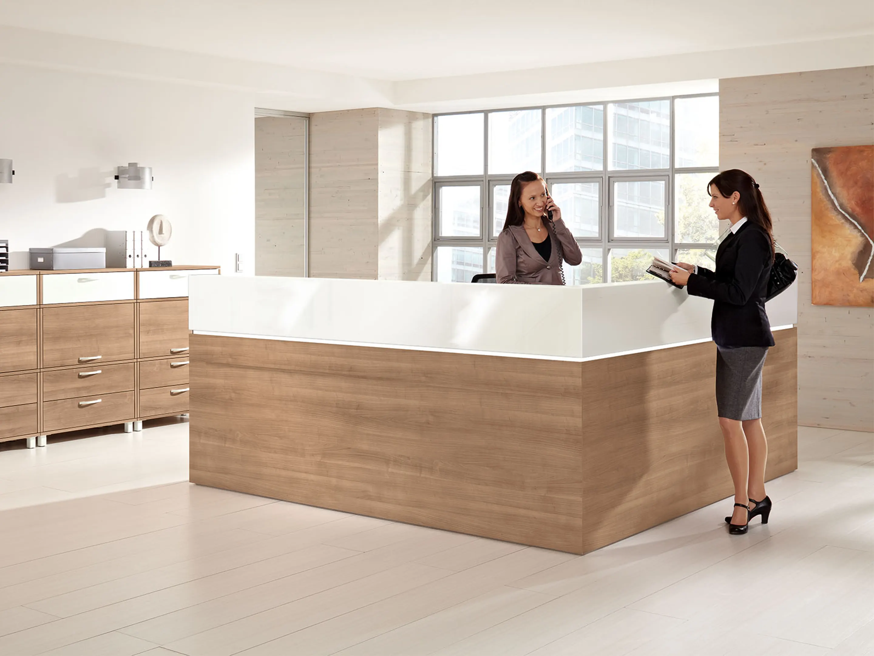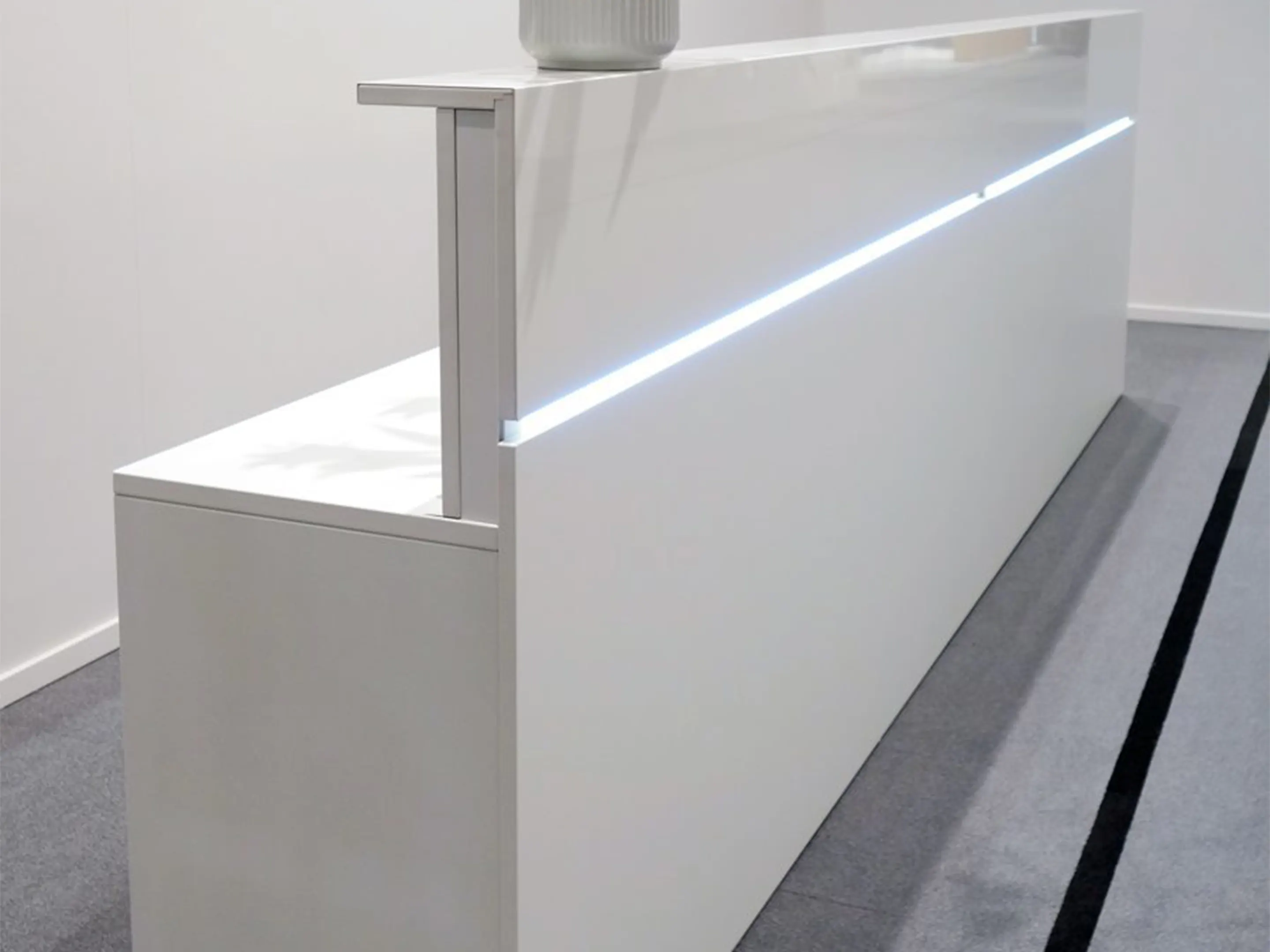 Frontpaneel met een afneembaar functiepaneel. Balie is links gesloten, rechts lineair koppelbaar met andere elementen en de bruikbare breedte is 2200mm. Afmeting: 2200 x 1150 x 160mm (BxHxD)