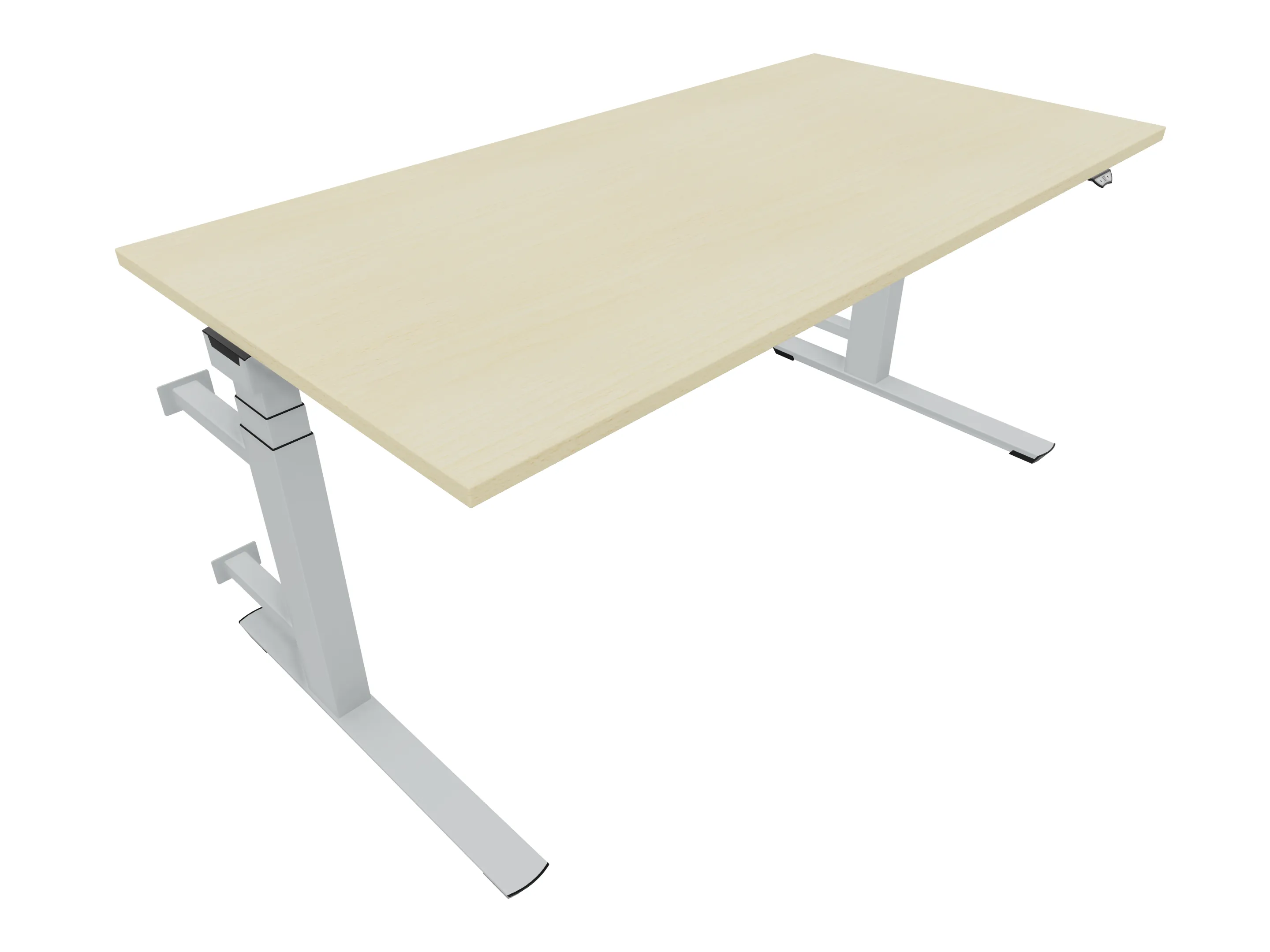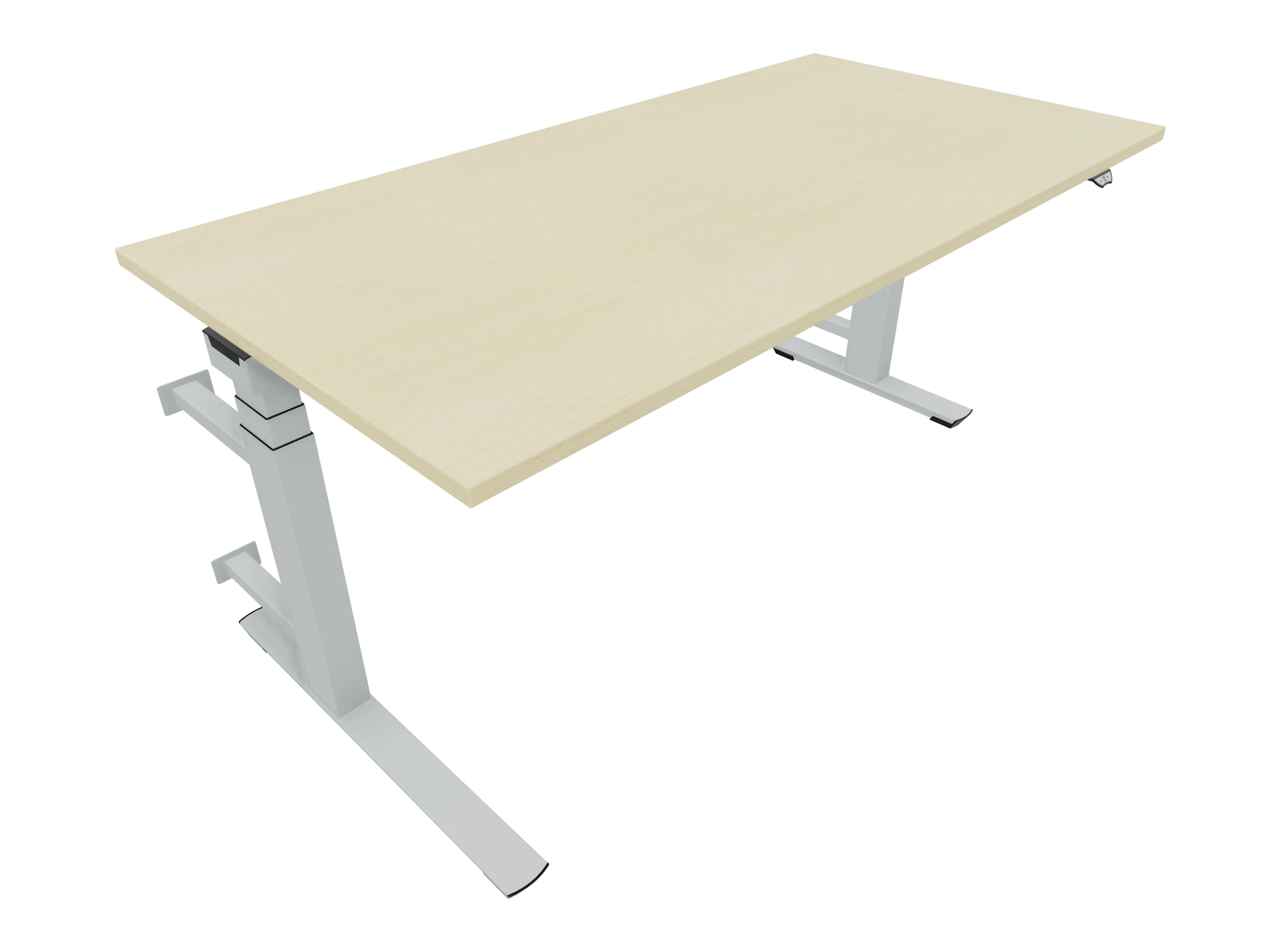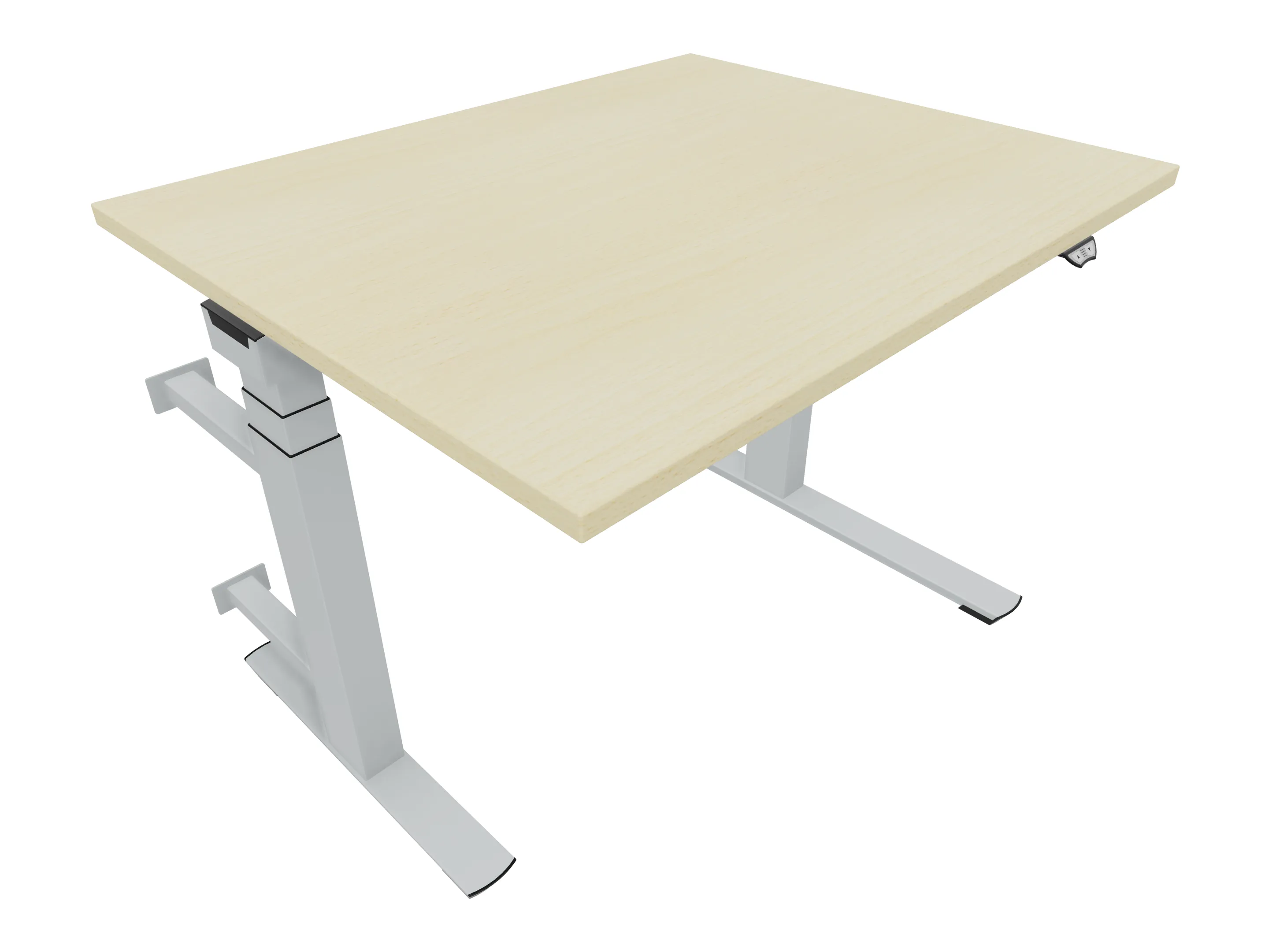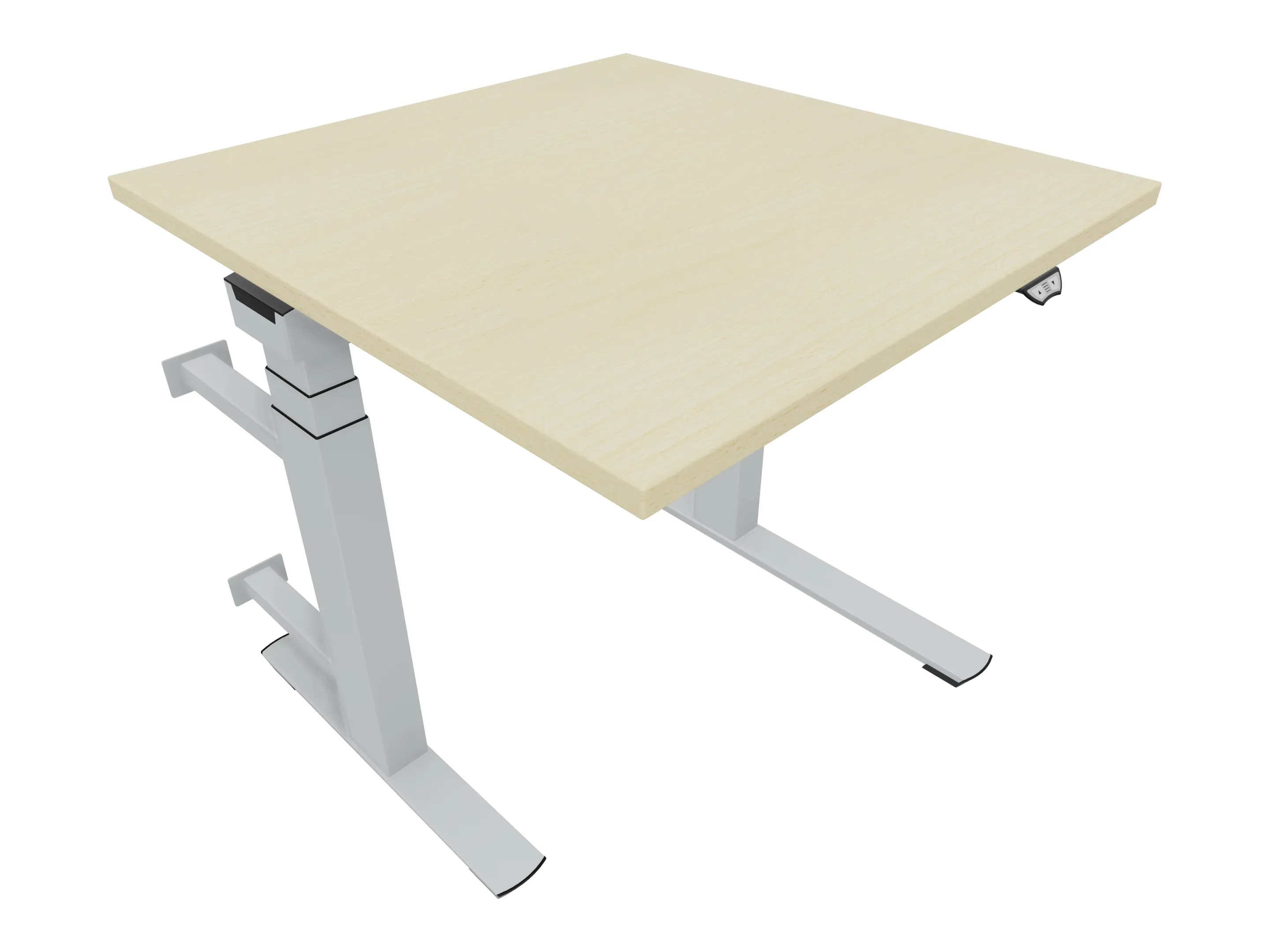 Crew bureau met twee poten (links korte teen) en 4 houders (25mm veiligheidsafstand). T-poot, elektrisch verstelbaar: 650-1100mm (begrenst). Inclusief bediening, kabelgoot, schuifbeslag, en Easy-Stop sensor. Afmeting: 750 x 720 x 775mm (BxHxD)