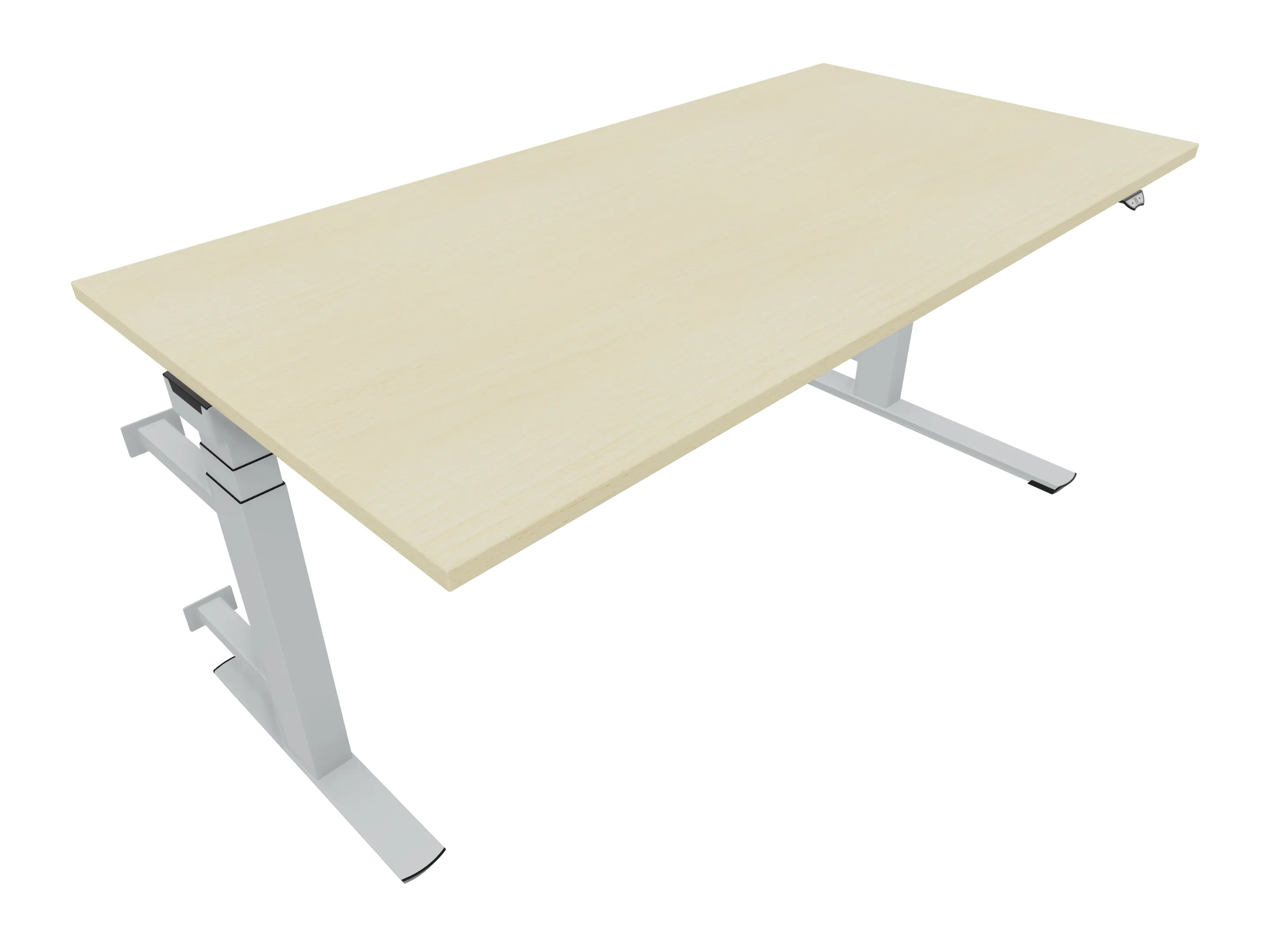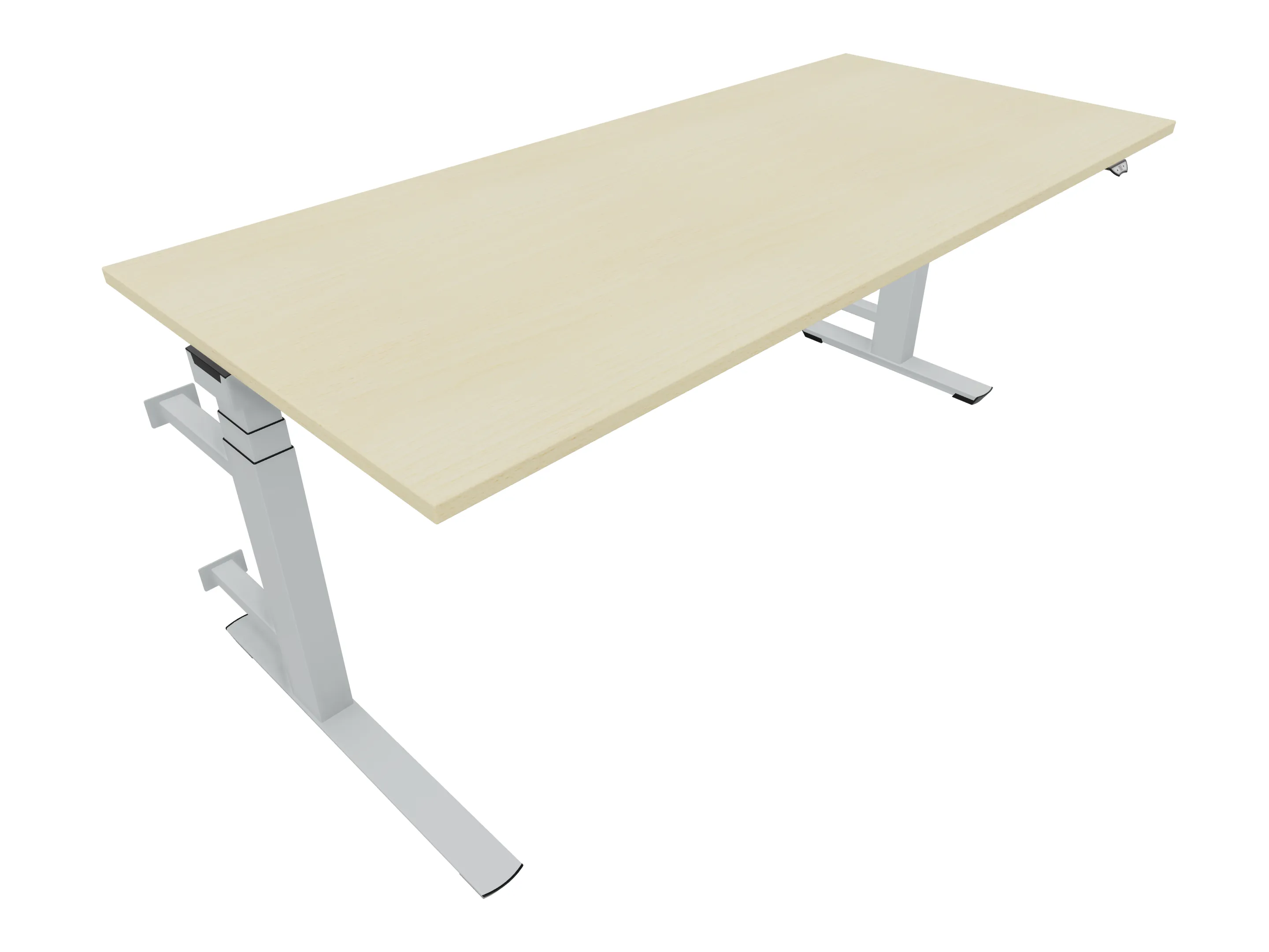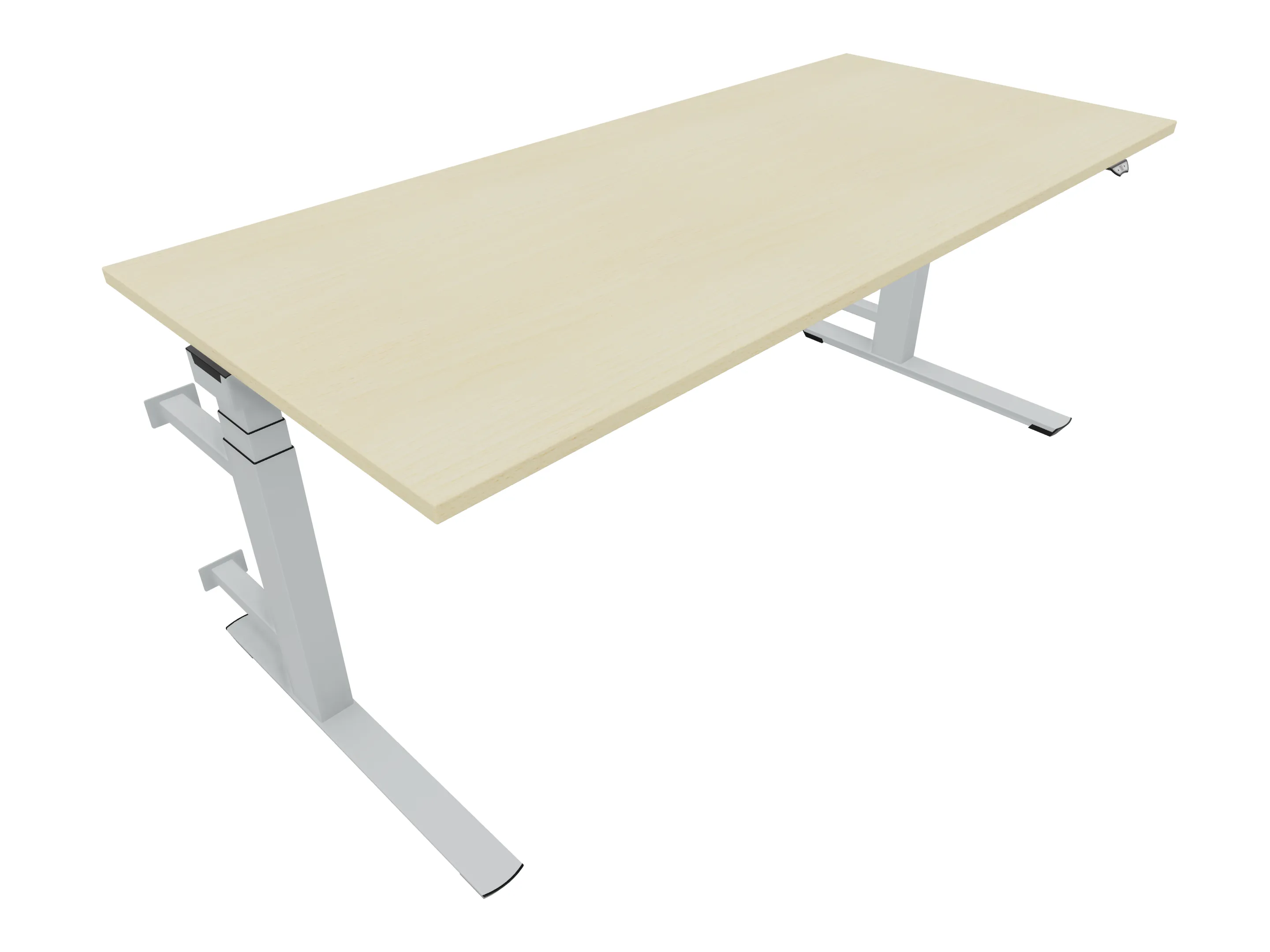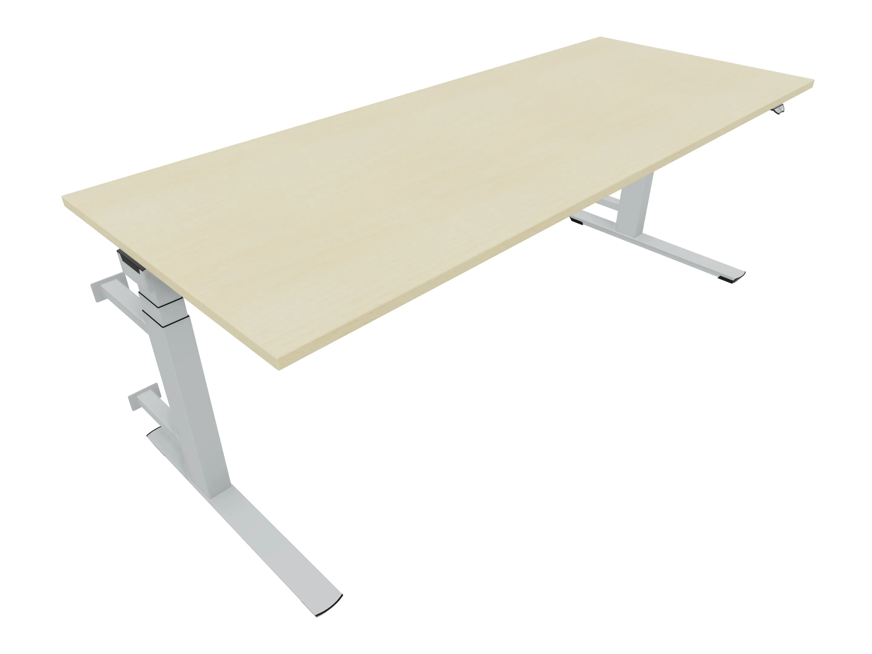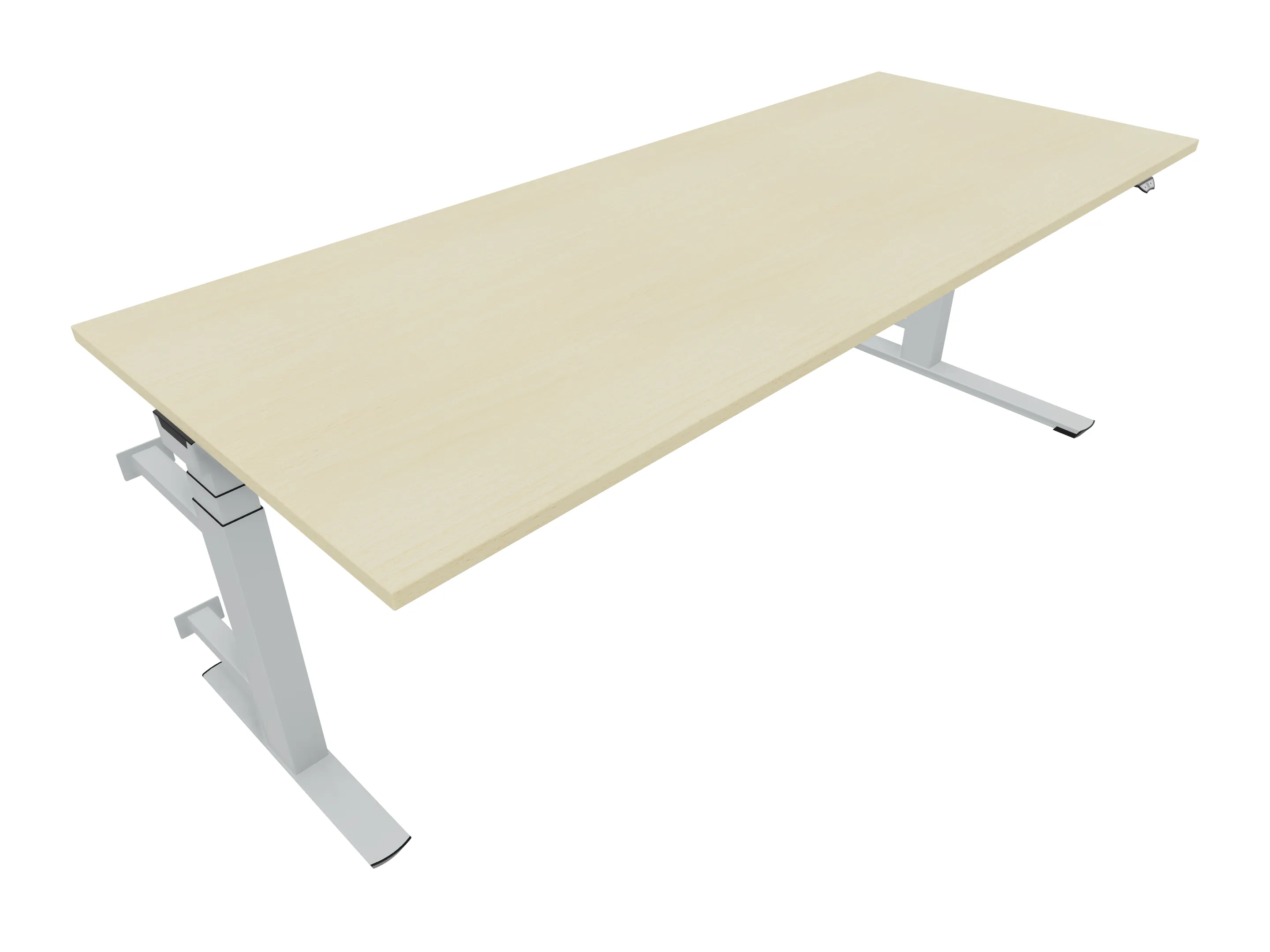 Crew bureau met twee poten (links korte teen) en 4 houders (25mm veiligheidsafstand). T-poot, elektrisch verstelbaar: 650-1100mm (begrenst). Inclusief bediening, kabelgoot, schuifbeslag, en Easy-Stop sensor. Afmeting: 1950 x 720 x 775mm (BxHxD)