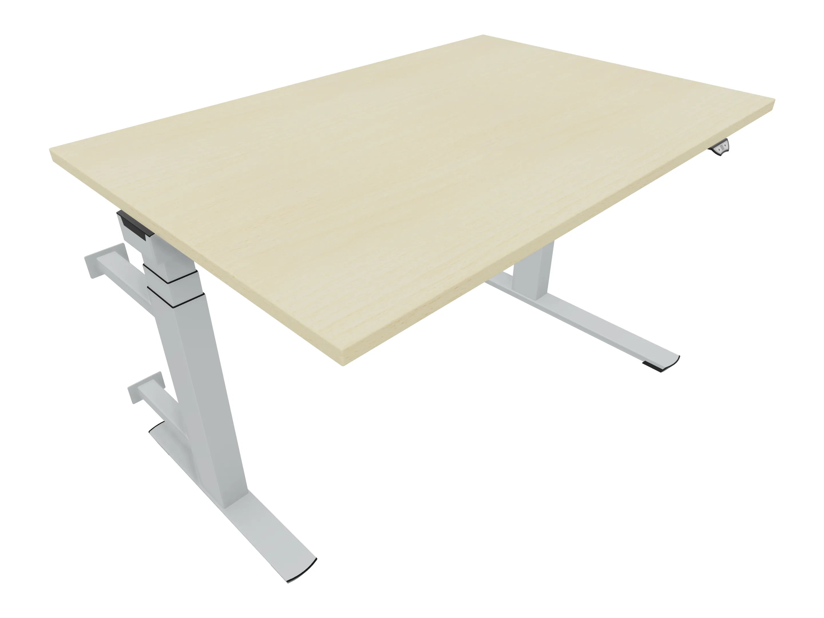 Crew bureau met twee poten (links korte teen) en 4 houders (25mm veiligheidsafstand). T-poot, elektrisch verstelbaar: 650-1100mm (begrenst). Inclusief bediening, kabelgoot, schuifbeslag, en Easy-Stop sensor. Afmeting: 1350 x 720 x 775mm (BxHxD)