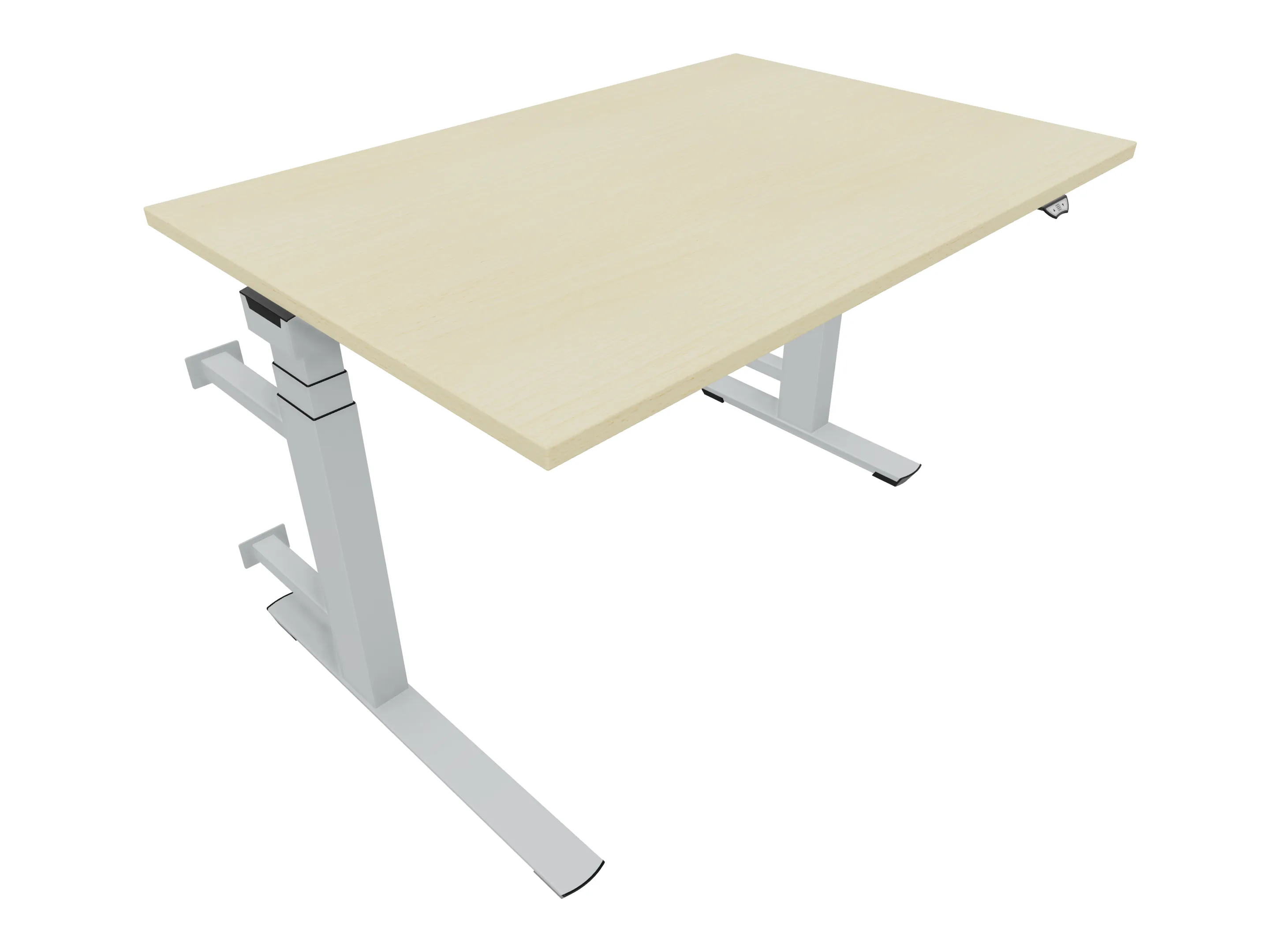 Crew bureau met twee poten (links korte teen) en 4 houders (25mm veiligheidsafstand). T-poot, elektrisch verstelbaar: 650-1100mm (begrenst). Inclusief bediening, kabelgoot, schuifbeslag, en Easy-Stop sensor. Afmeting: 1150 x 720 x 775mm (BxHxD)