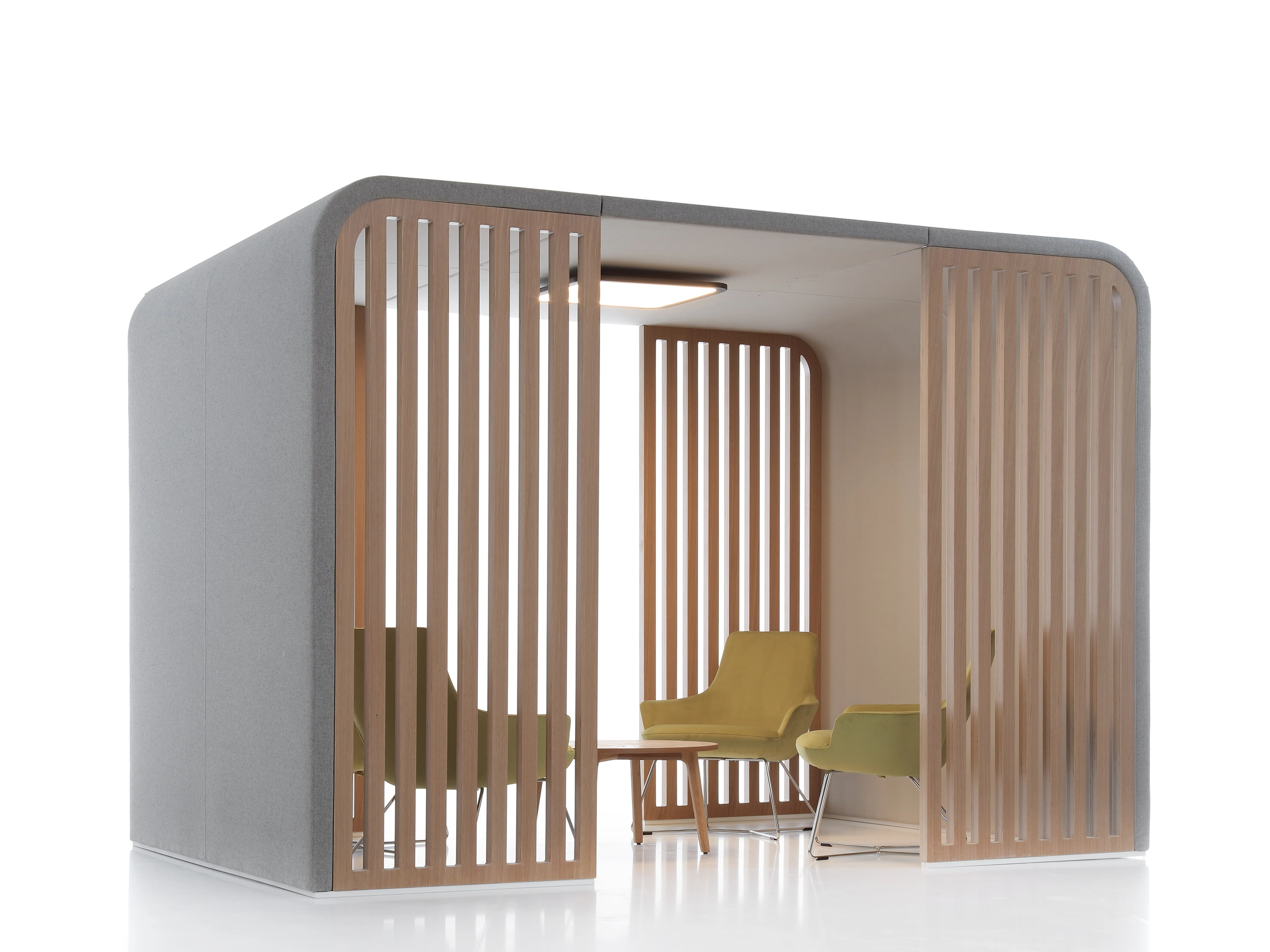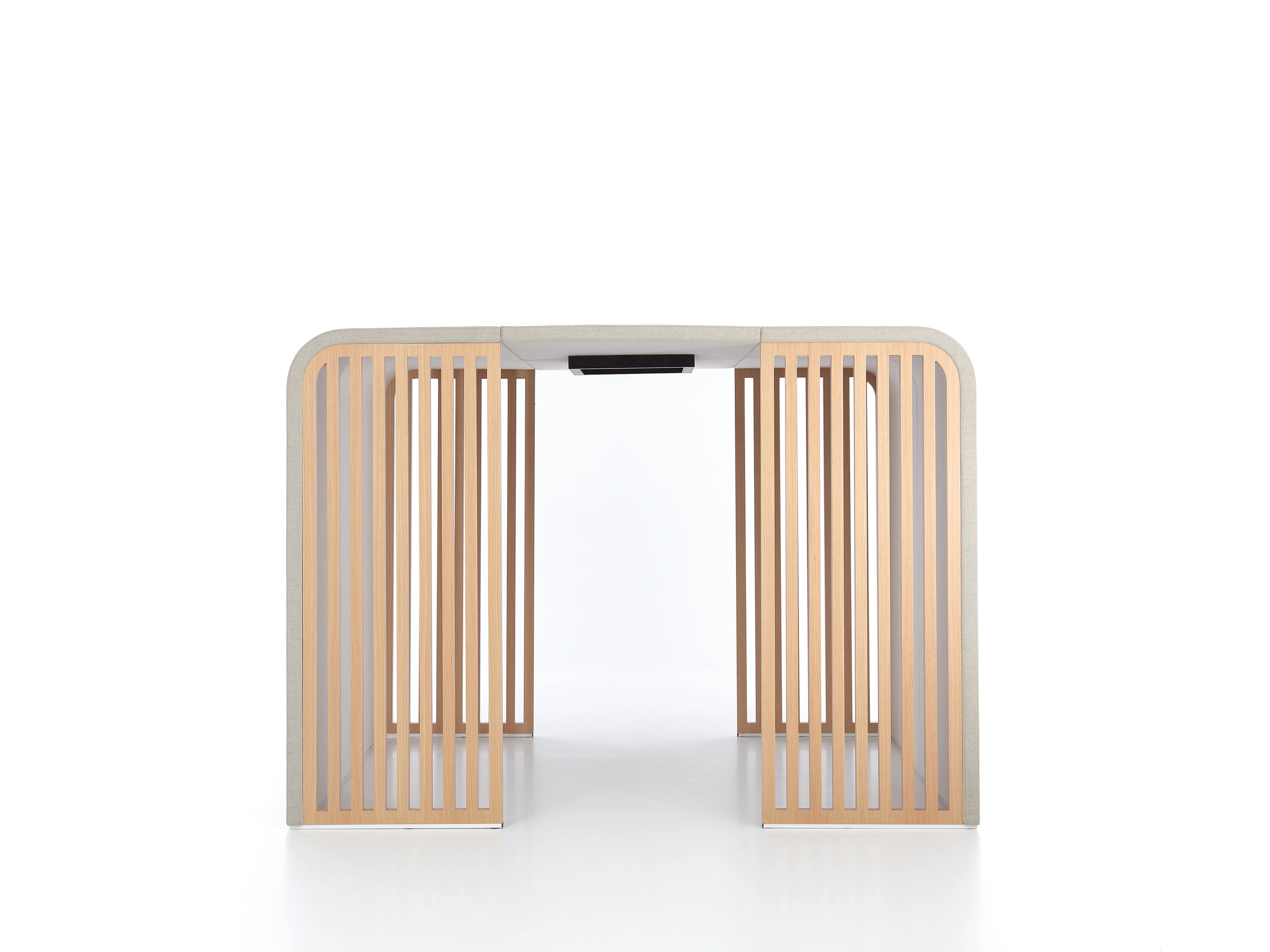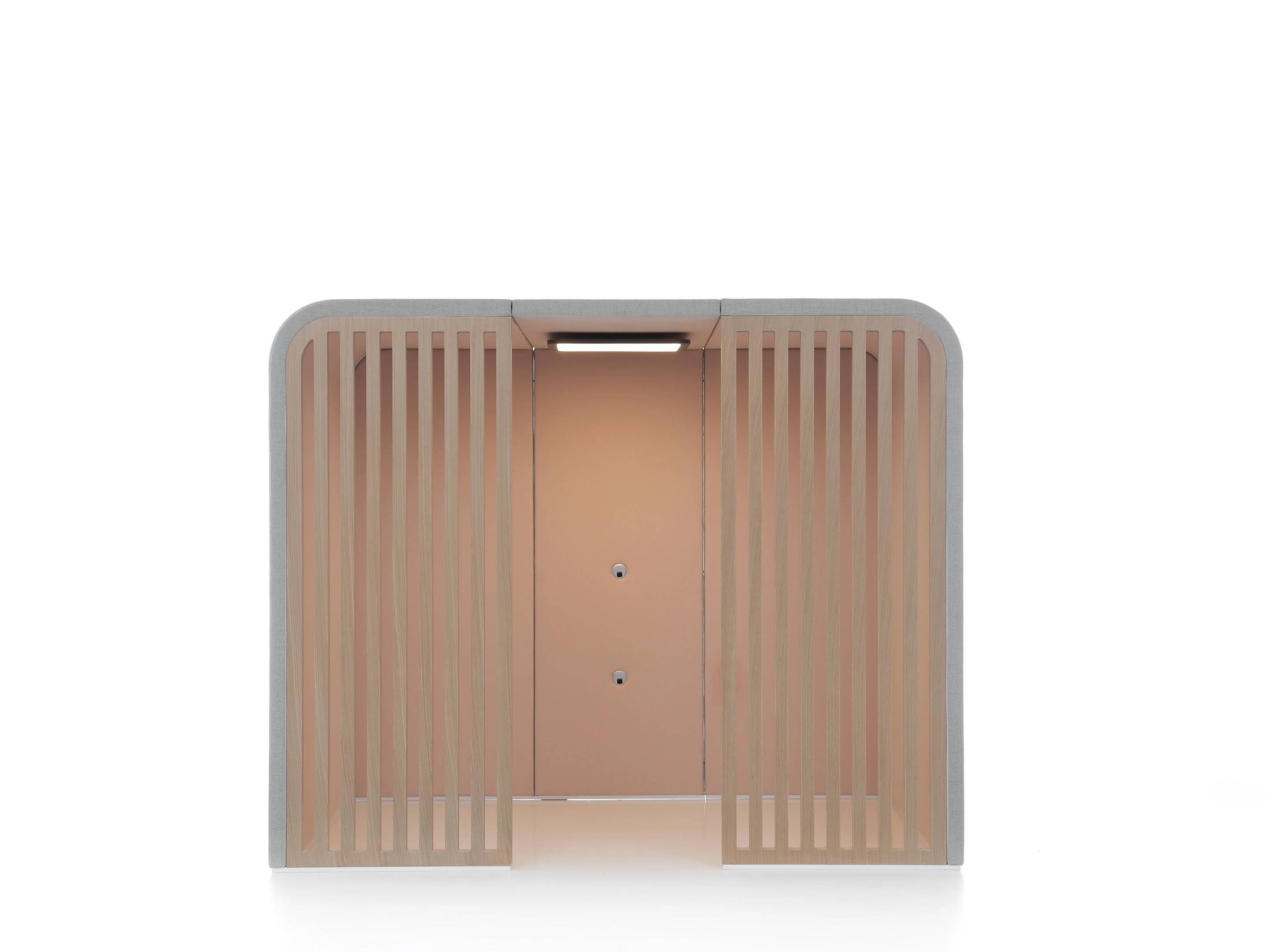 Gestoffeerde ombouw (de basis van chalet), incl. Rails voor te plaatsen inzetstukken. Afmeting: 267x220x220cm (BxDxH). Doorloop is 80cm wanneer inzetstukken zijn geplaatst.