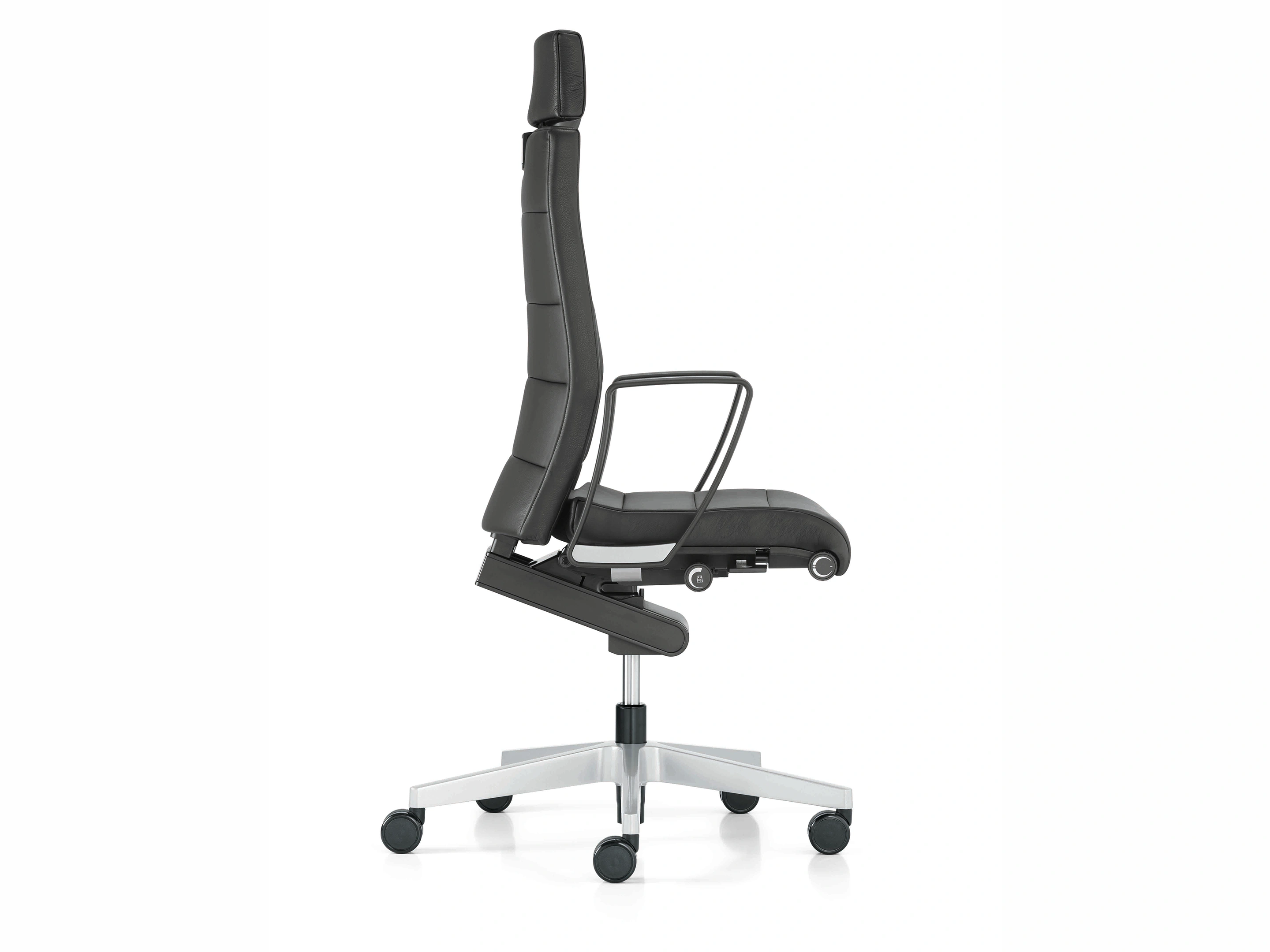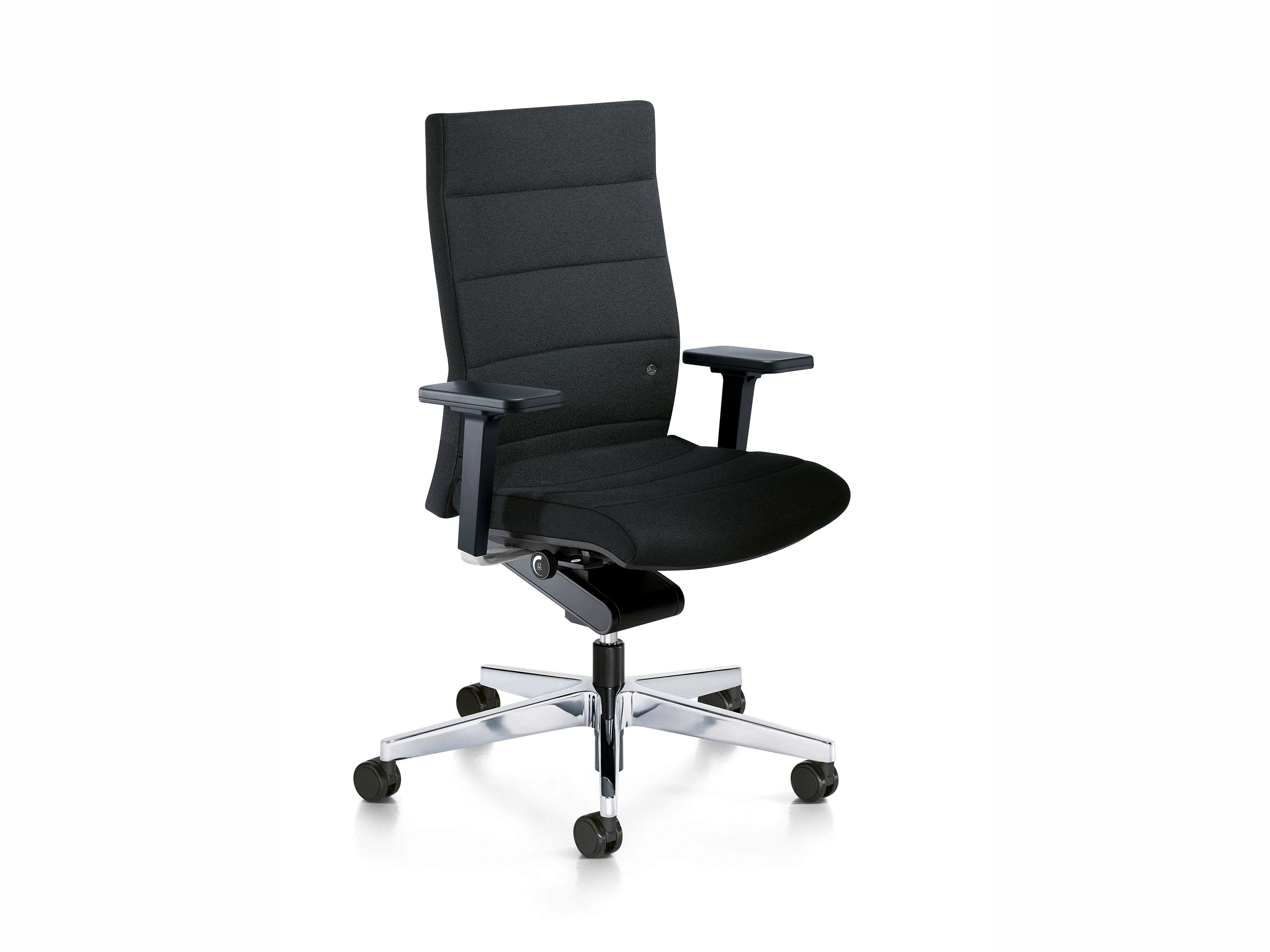 Bureaustoel met body-float synchroonmechaniek, gewichtsregeling traploosinstellbaar, zithoogte: 415-535mm, Rugleuning 6cm instelbaar, mechanische zitdieptevering, vaste hoofdsteun, standaard een kunststof voetkruis.