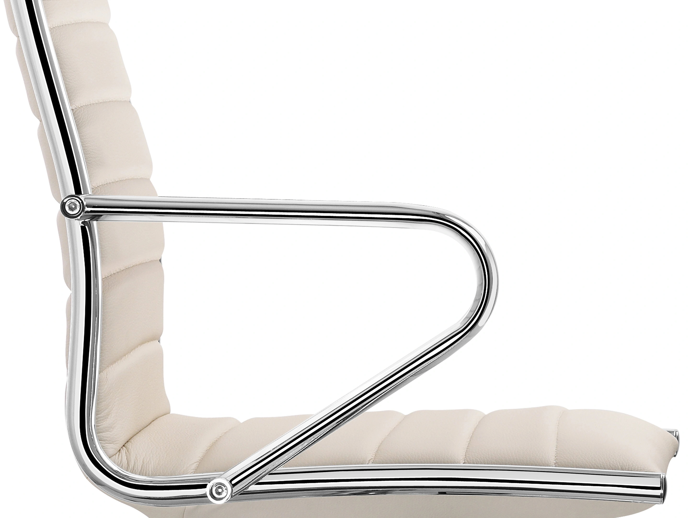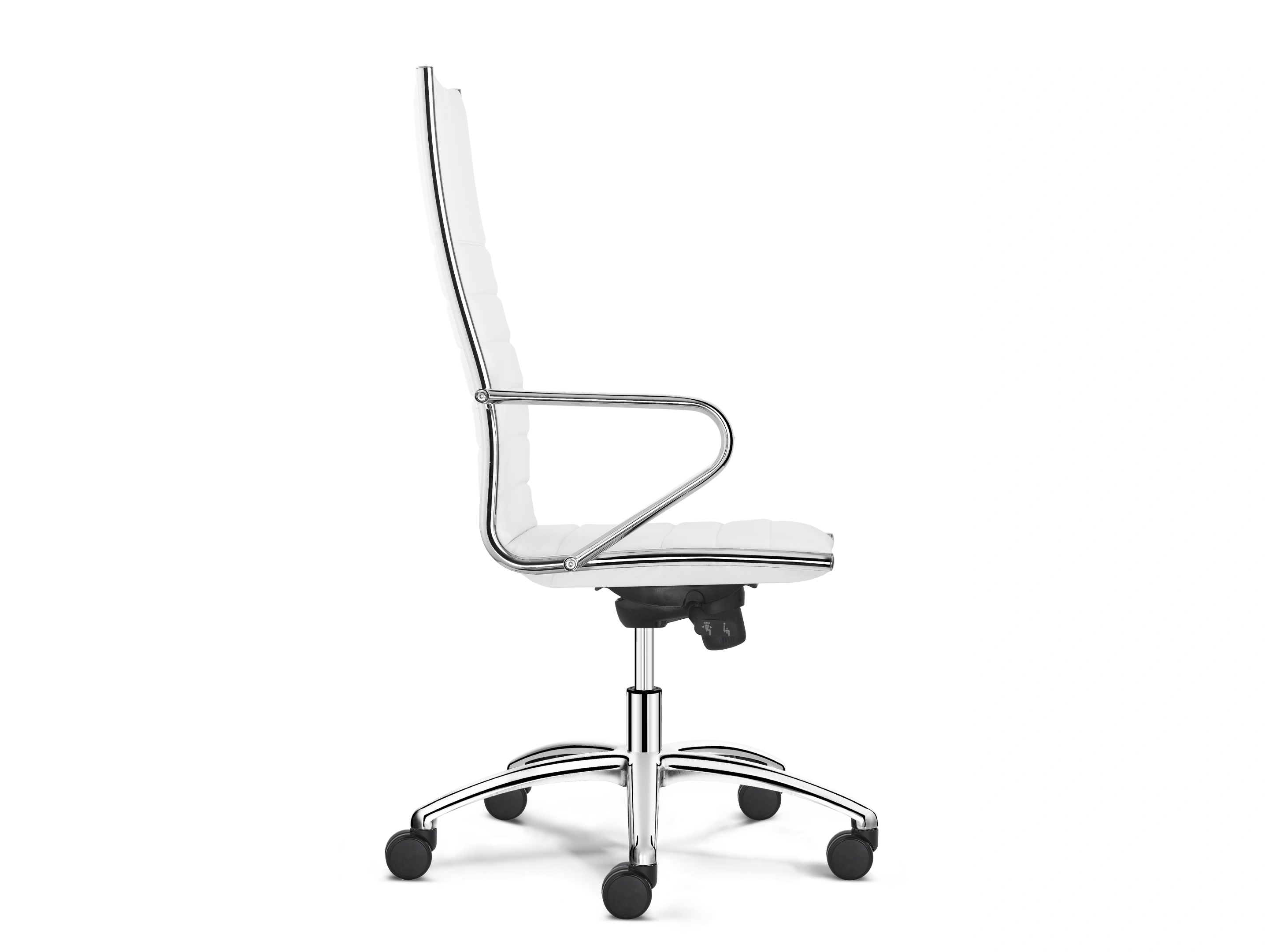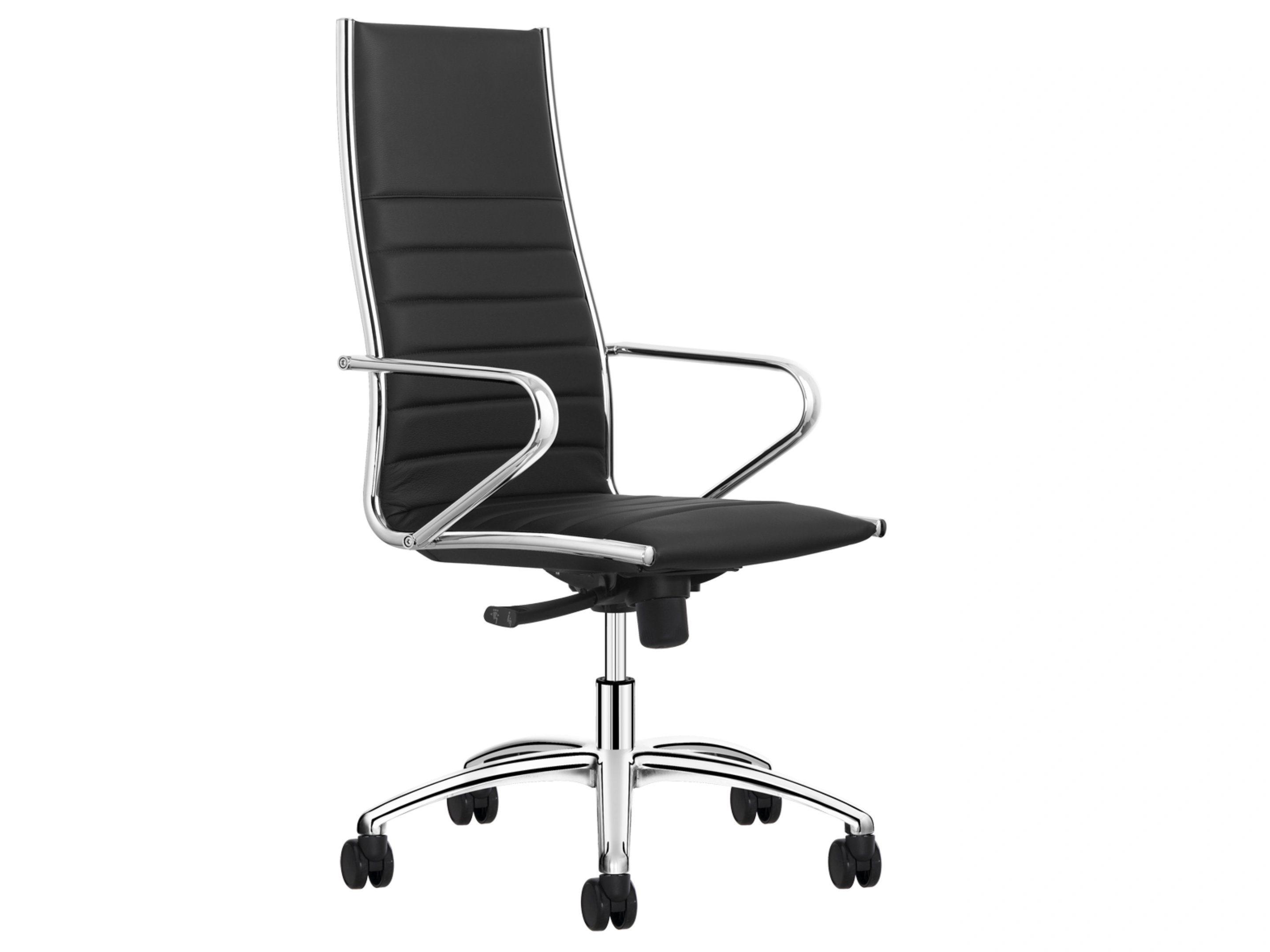 Een bureaustoel met neigmechanisme, anti-knee-tilting en een kuip met een hoge rugleuning voorzien van classic stiksel en anti-panic te fixeren in 5 posities, op 5-teens voetkruis voorzien van geremde wielen. Inclusief armleggers.