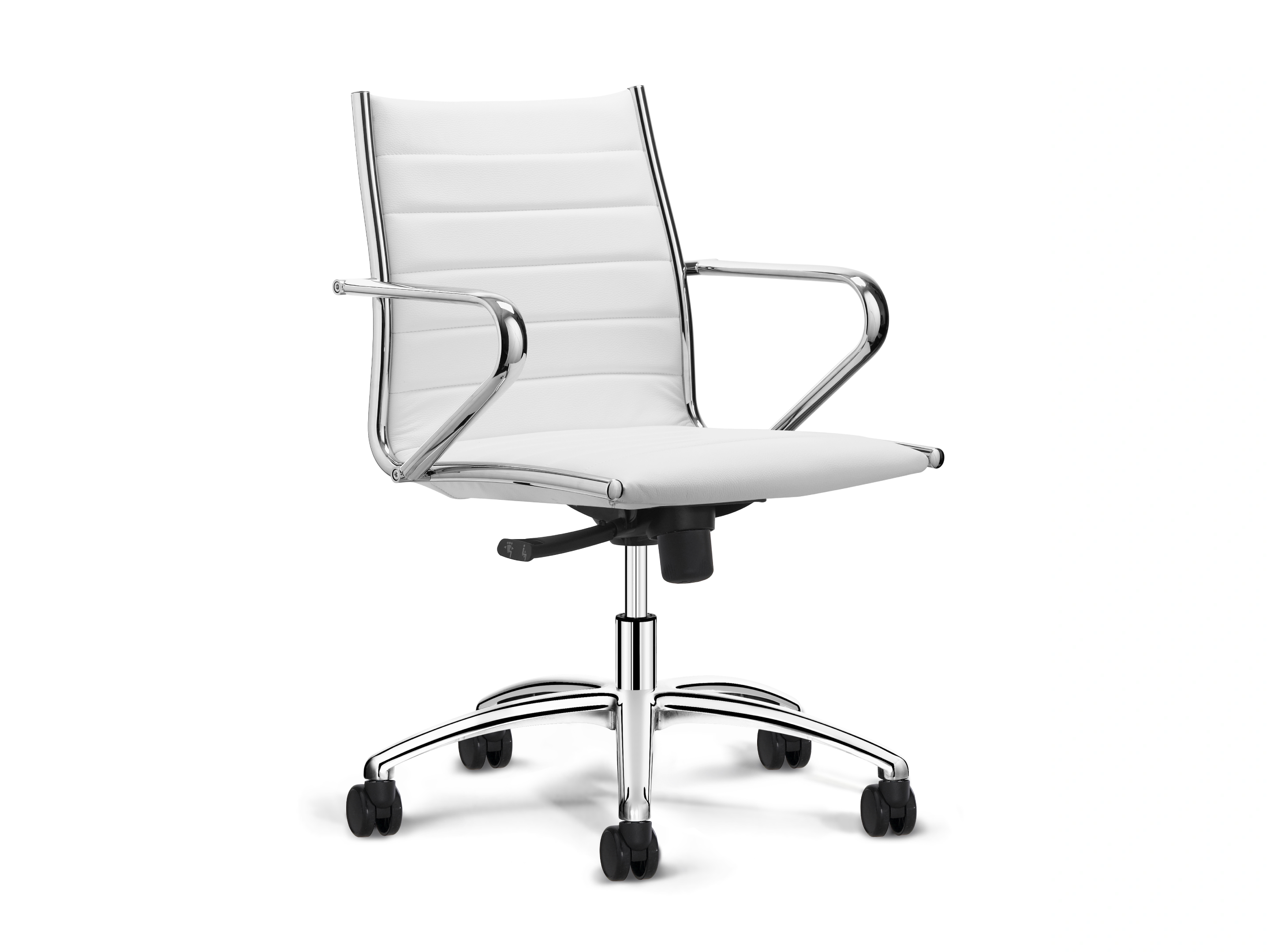 Vergaderstoel met self-return gaslift inclusief armleggers met een volledig gestoffeerde kuip voorzien van classic stiksel op 5-teens voetkruis voorzien van glijdoppen.