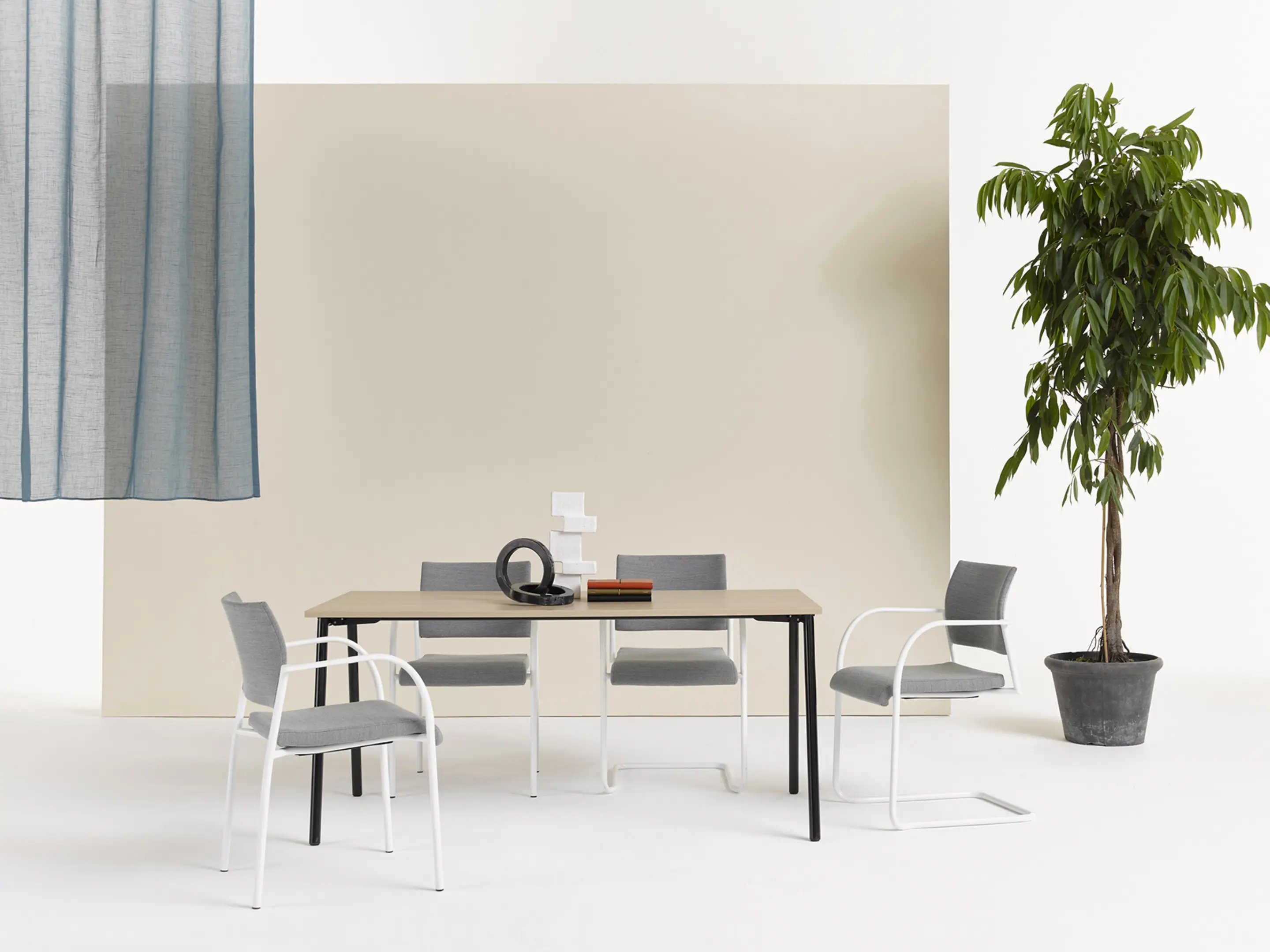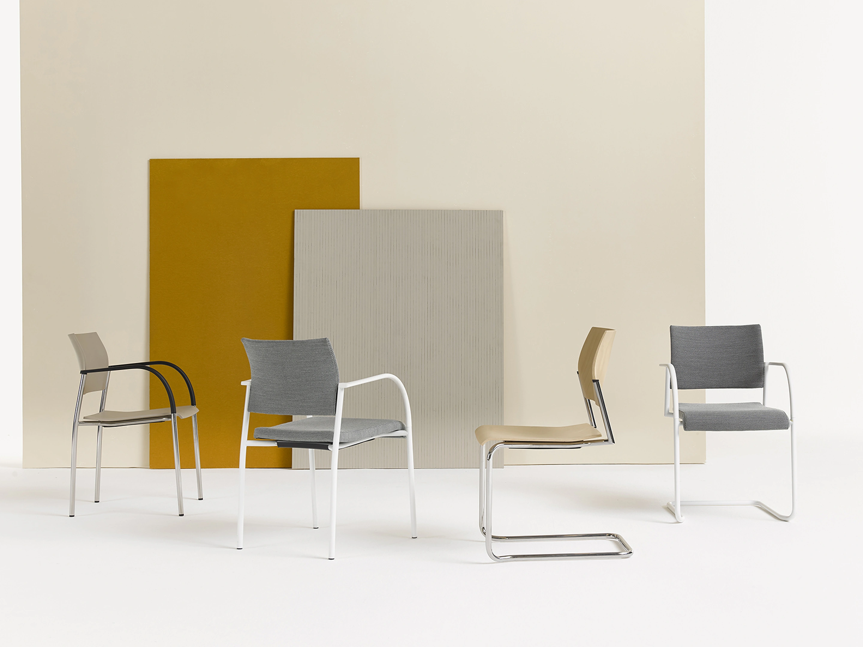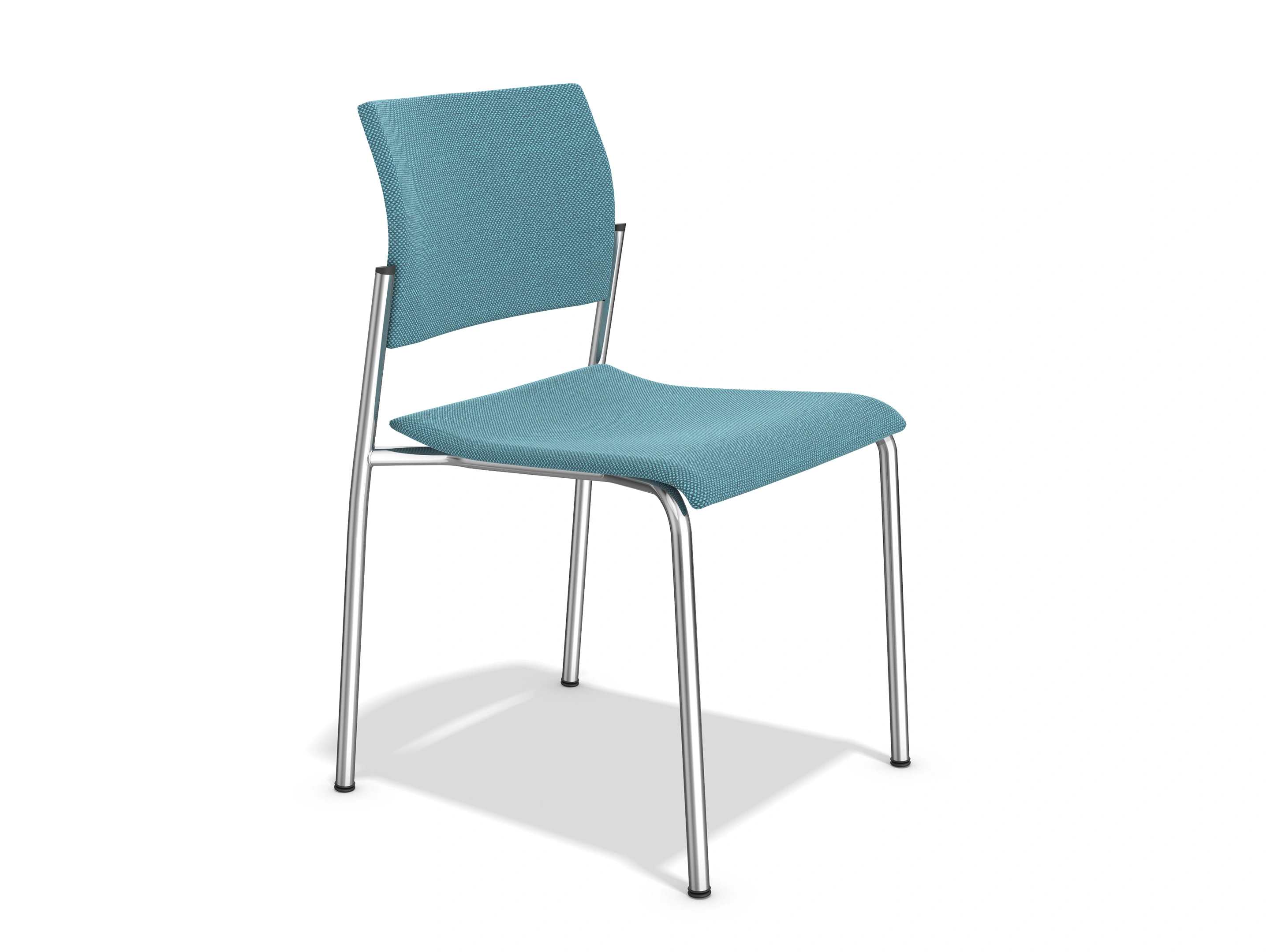 4-poots frame op kunststof glijders, met een volledig gestoffeerde zitting en rug. Exclusief armleggers. Stapelbaar tot 12 stuks op transportwagen en 8 stuks vrijstaand.